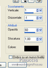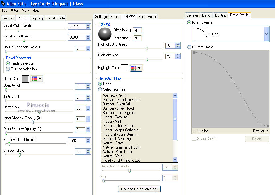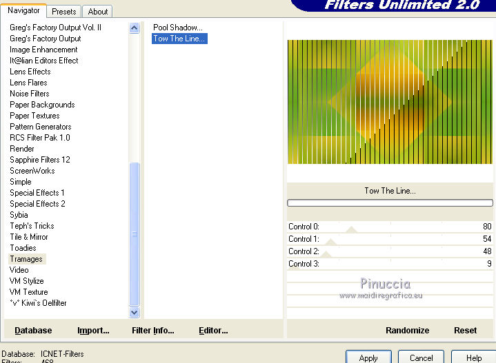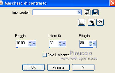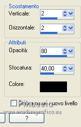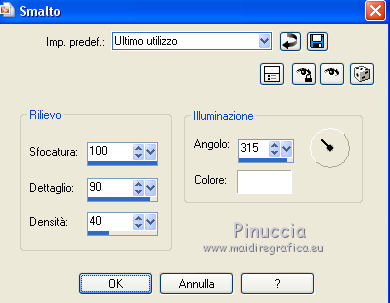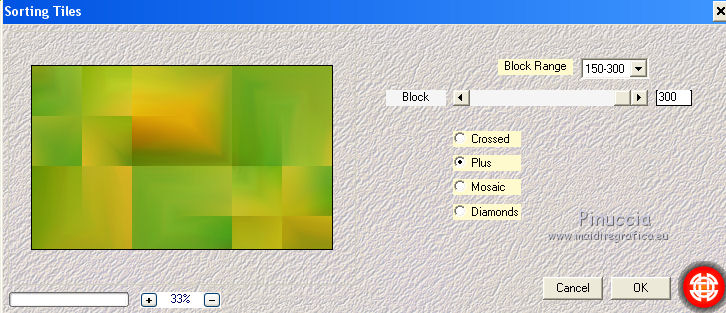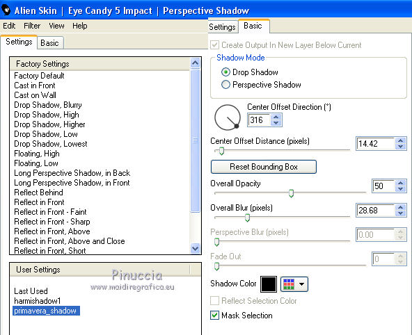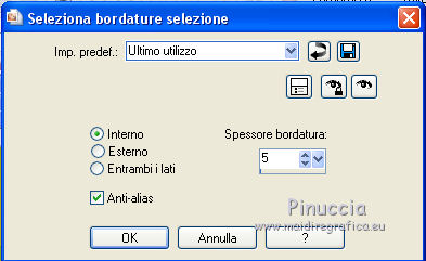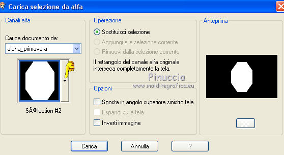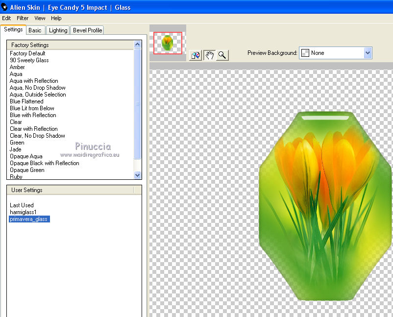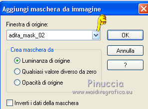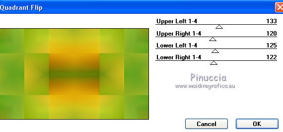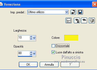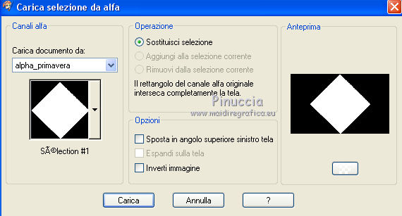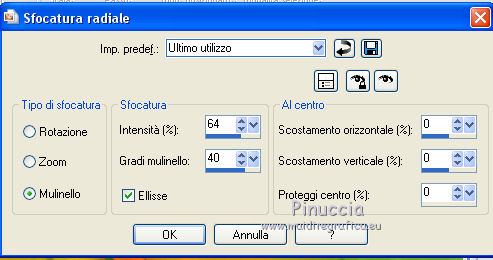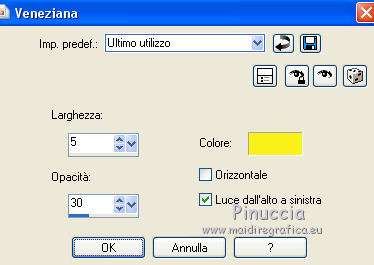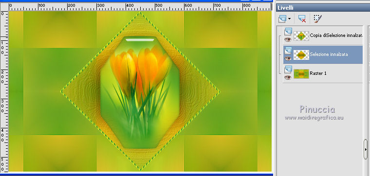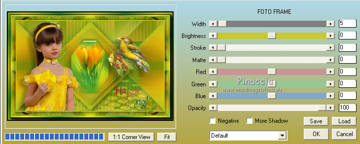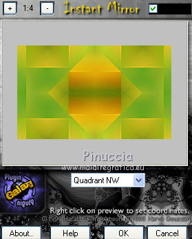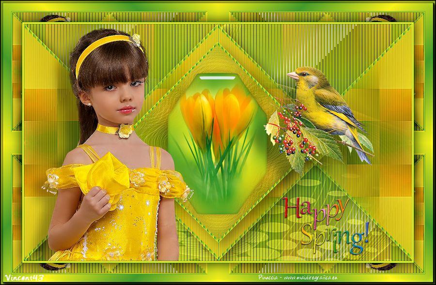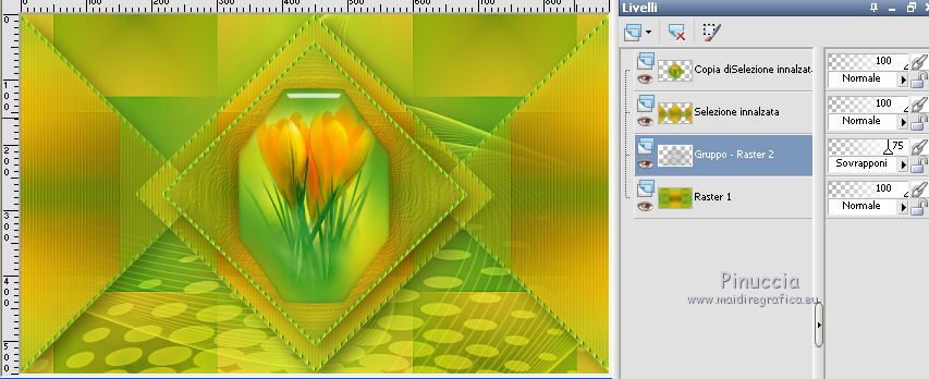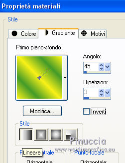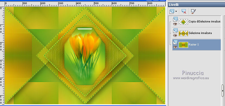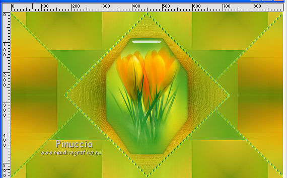 qui puoi trovare qualche risposta ai tuoi dubbi. Se l'argomento che ti interessa non è presente, ti prego di segnalarmelo. Questo tutorial è una creazione di Saturnella e non può essere copiato su altri siti nè essere offerto per il download. Lo stesso vale per la mia traduzione. E' anche proibito togliere il watermark dal materiale; rispettiamo il lavoro dei creatori di tubes, senza i quali non potremmo creare tutorials. Per tradurre questo tutorial, creato con PSP15, ho usato CorelX, ma può essere eseguito anche con le altre versioni di PSP. Dalla versione X4, il comando Immagine>Rifletti è stato sostituito con Immagine>Capovolgi in orizzontale, e il comando Immagine>Capovolgi con Immagine>Capovolgi in verticale. Nelle versioni X5 e X6, le funzioni sono state migliorate rendendo disponibile il menu Oggetti. Nel nuovo X7 sono tornati i comandi Immagine>Rifletti e Immagine>Capovolgi, ma con nuove funzioni. Vedi la scheda sull'argomento qui Occorrente: Materiale qui Grazie: per i tubes Mina, Logane, AB e Yoka per la maschera Adita, Il resto del materiale è di Saturnella. (in questa pagina trovi i links ai loro siti). Filtri in caso di dubbi, ricorda di consultare la mia sezione filtri qui Filters Unlimited 2.0 qui Mehdi - Sorting Tiles qui Mirror Rave - Quadrant Flip qui Simple - Blintz qui Plugin Galaxy qui Alien Skin Eye Candy 5 Impact - Perspective Shadow, Glass qui AAA Frames - Foto Frame qui Tramages - Tow The Line qui Graphics Plus - Quick Tile I qui I filtri Mirror Rave, Simple, Tramages e Graphics Plus si possono usare da soli o importati in Filters Unlimited (come fare vedi qui) Se un filtro fornito appare con questa icona ![]() non esitare a cambiare modalità di miscelatura e opacità secondo i colori utilizzati. Nelle ultime versioni di PSP non c'è il gradiente di primo piano/sfondo (Corel_06_029) Puoi usare i gradienti delle versioni precedenti. Trovi qui i gradienti Corel X. Metti i presets Cliccando sul file una o due volte (a seconda delle tue impostazioni), automaticamente il preset si installerà nella cartella corretta. perchè uno o due clic vedi qui Apri la maschera in PSP e minimizzala con il resto del materiale. Colori utilizzati ![]() 1. Imposta il colore di primo piano con il colore chiaro #f9f118, e il colore di sfondo con il colore scuro #439b2a. ![]() Passa il colore di primo piano a Gradiente di primo piano/sfondo, stile Lineare. ![]() Apri alpha_primavera. Finestra>Duplica o sulla tastiera maiuscola+D per fare una copia. ![]() Chiudi l'originale. La copia, che sarà la base del tuo lavoro, non è vuota, ma contiene le selezioni salvate sul canale alfa. Riempi l'immagine trasparente con il gradiente.2. Regola>Sfocatura>Sfocatura gaussiana - raggio 25. ![]() 3. Livelli>Nuovo livello raster. Selezione>Seleziona tutto. Apri il tube del fiore di Logane e vai a Modifica>Copia. Torna al tuo lavoro e vai a Modifica>Incolla nella selezione. Selezione>Deseleziona. 4. Effetti>Effetti di immagine>Motivo unico. ![]() 5. Regola>Sfocatura>Sfocatura radiale. ![]() Effetti>Effetti di bordo>Aumenta. Livelli>Unisci>Unisci giù. 6. Effetti>Plugins>Mehdi - Sorting Tiles. ![]() Effetti>Effetti di bordo>Aumenta. 7. Effetti>Plugins>Mirror Rave - Quadrant Flip, con i settaggi standard. ![]() Effetti>Plugins>Simple - Blintz. 8. Effetti>Plugins>Plugin Galaxy - Instant Mirror. ![]() 9. Selezione>Carica/Salva selezione>Carica selezione da canale alpha. La selezione sélection#1 è subito disponibile. Devi soltanto cliccare Carica. ![]() Selezione>Innalza selezione a livello. 10. Selezione>Modifica>Seleziona bordature selezione. ![]() Modalità di corrispondenza dello strumento Riempimento Nessuno ![]() Riempi la selezione con il colore scuro di sfondo.11. Effetti>Effetti di trama>Veneziana, con il tuo colore chiaro. ![]() Effetti>Effetti di bordo>Aumenta. Selezione>Deseleziona. 12. Livelli>Duplica. Selezione>Seleziona tutto. Selezione>Mobile. Selezione>Immobilizza. Selezione>Modifica>Contrai - 5 pixels. ![]() Effetti>Effetti artistici>Smalto. ![]() Selezione>Deseleziona. 13. Selezione>Carica/Salva selezione>Carica selezione da canale alpha. Apri il menu delle selezioni e carica la selezione sélection#2. ![]() Livelli>Nuovo livello raster. Riempi la selezione con il gradiente.Regola>Sfocatura>Sfocatura gaussiana, con i settaggi precedenti. ![]() 14. Modifica>Incolla nella selezione (il tube del fiore di Logane è ancora in memoria). Regola>Messa a fuoco>Metti a fuoco. Selezione>Deseleziona. 15. Effetti>Plugins>Alien Skin Eye Candy 5 Impact - Glass. seleziona il preset primavera_glass e ok. ![]() Questi i settaggi, in caso di problemi con il preset. ![]() 16. Effetti>Effetti 3D>Sfalsa ombra, colore nero. ![]() Livelli>Unisci>Unisci giù. 17. Attiva il livello sottostante. ![]() Effetti>Effetti di immagine>Motivo unico. ![]() ![]() 18. Effetti>Effetti di trama>Veneziana. ![]() 19. Effetti>Plugins>Alien Skin Eye Candy 5 Impact - Perspective Shadow. seleziona il preset primavera shadow e ok. ![]() 20. Attiva il livello superiore. Immagine>Ridimensiona, all'85%, tutti i livelli non selezionato. Effetti>Plugins>Alien Skin Eye Candy 5 Impact - Perspective Shadow, con i settaggi precedenti. 21. Attiva il livello di sfondo. ![]() Imposta il colore di sfondo con il colore bianco. ![]() Livelli>Nuovo livello raster. Riempi il livello con il colore bianco.Livelli>Nuovo livello maschera>Da immagine. Apri il menu sotto la finestra di origine e vedrai la lista dei files aperti. Seleziona la maschera adita_mask_02. ![]() Effetti>Effetti di bordo>Aumenta. Livelli>Unisci>Unisci gruppo. Immagine>Rifletti. 22. Effetti>Effetti 3D>Sfalsa ombra, con il tuo colore scuro. ![]() Cambia la modalità di miscelatura di questo livello in Sovrapponi, o altro, e abbassa l'opacità al 75%. ![]() 23. Attiva il livello di sfondo. Effetti>Plugins>Tramages - Tow the line, con i settaggi standard. ![]() 24. Attiva il livello superiore. Apri il tube della bambina di Mina e vai a Modifica>Copia. Torna al tuo lavoro e v