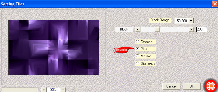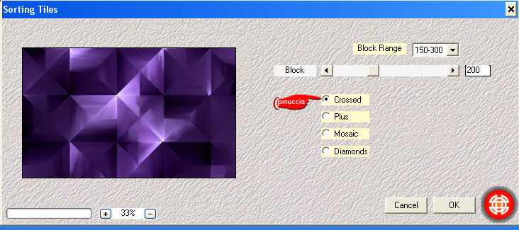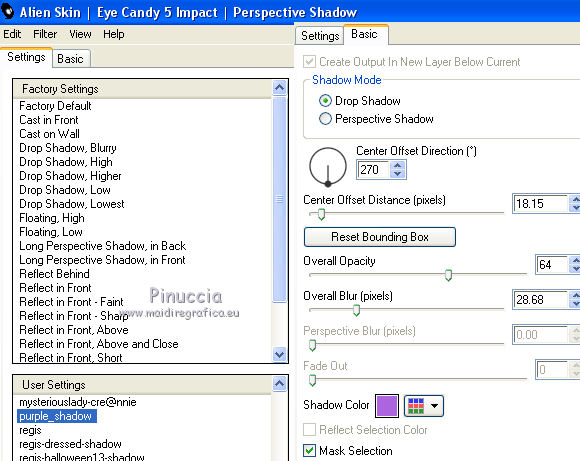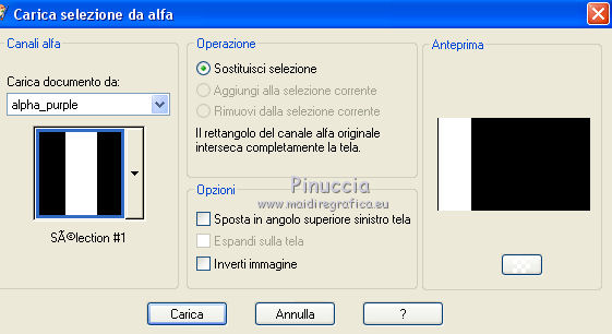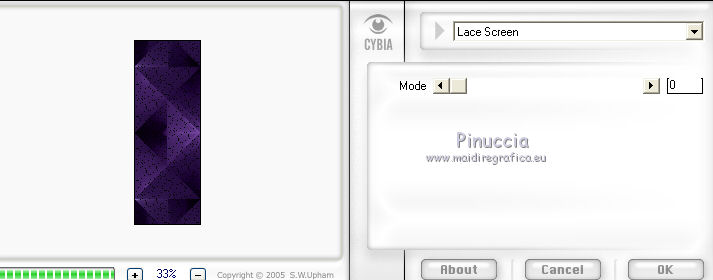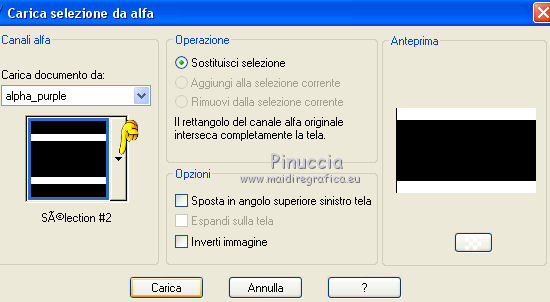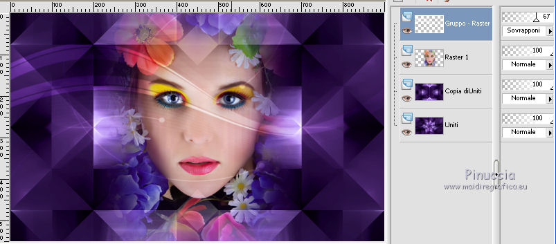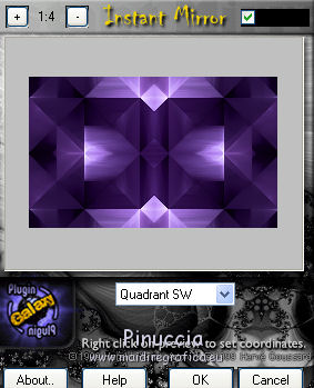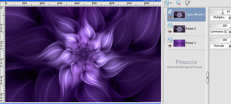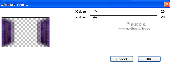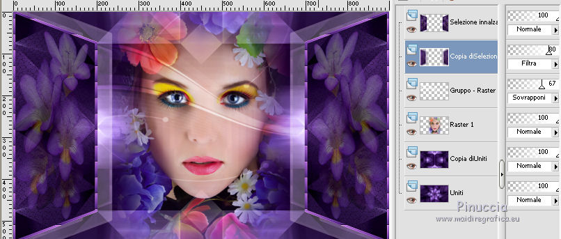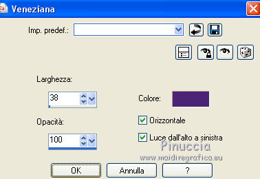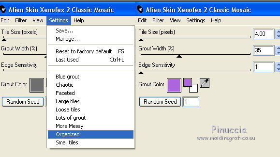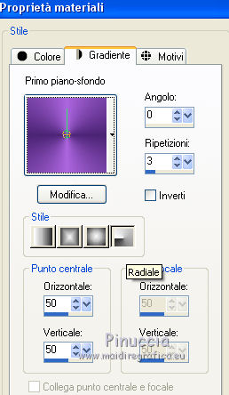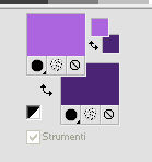 qui puoi trovare qualche risposta ai tuoi dubbi. Se l'argomento che ti interessa non è presente, ti prego di segnalarmelo. Questo tutorial è una creazione di Saturnella e non può essere copiato su altri siti nè essere offerto per il download. Lo stesso vale per la mia traduzione. E' anche proibito togliere il watermark dal materiale; rispettiamo il lavoro dei creatori di tubes, senza i quali non potremmo creare tutorials. Per tradurre questo tutorial, creato con PSP2018, ho usato CorelX, ma può essere eseguito anche con le altre versioni di PSP. Dalla versione X4, il comando Immagine>Rifletti è stato sostituito con Immagine>Capovolgi in orizzontale, e il comando Immagine>Capovolgi con Immagine>Capovolgi in verticale. Nelle versioni X5 e X6, le funzioni sono state migliorate rendendo disponibile il menu Oggetti. Nel nuovo X7 sono tornati i comandi Immagine>Rifletti e Immagine>Capovolgi, ma con nuove funzioni. Vedi la scheda sull'argomento qui Occorrente: Materiale qui Per i tubes grazie Luz Cristina (tube donna) e Mina (tube diore). Per la maschera grazie Ildiko. (in questa pagina trovi i links ai loro siti). Filtri in caso di dubbi, ricorda di consultare la mia sezione filtri qui Filters Unlimited 2.0 qui Mehdi - Sorting Tiles qui Plugin Galaxy - Instant Mirror qui Cybia - Screenworks qui Alien Skin Xenofex 2 - Classic Mosaic qui Alien Skin Eye Candy 5 Impact - Perspective Shadow qui Toadies - What are you qui I filtri Cybia e Toadies si possono usare da soli o importati in Filters Unlimited (come fare vedi qui) Se un filtro fornito appare con questa icona ![]() non esitare a cambiare modalità di miscelatura e opacità secondo i colori utilizzati. Nelle ultime versioni di PSP non c'è il gradiente di primo piano/sfondo (Corel_06_029) Puoi usare i gradienti delle versioni precedenti. Trovi qui i gradienti Corel X. Metti il preset Cliccando sul file una o due volte (a seconda delle tue impostazioni), automaticamente il preset si installerà nella cartella corretta. perchè uno o due clic vedi qui Se preferisci, puoi importare direttamente il preset nel corso del tutorial Come fare vedi la scheda del filtro Eye Candy qui Apri la maschera in PSP e minimizzala con il resto del materiale. Colori utilizzati ![]() 1. Imposta il colore di primo piano con il colore chiaro #ac65de, e il colore di sfondo con il colore scuro #4c2475. ![]() Passa il colore di primo piano a Gradiente di primo piano/sfondo, stile Radiale. ![]() 2. Apri alpha_purple. Finestra>Duplica (o sulla tastiera maiuscola+D) per fare una copia. ![]() Chiudi l'originale. La copia, che sarà la base del tuo lavoro, non è vuota, ma contiene le selezioni salvate sul canale alfa. Riempi l'immagine trasparente con il gradiente.3. Regola>Sfocatura>Sfocatura gaussiana - raggio 50. ![]() 4. Livelli>Nuovo livello raster. Selezione>seleziona tutto. Apri l'immagine fractale, e vai a Modifica>Copia. Torna al tuo lavoro e vai a Modifica>Incolla nella selezione. Selezione>Deseleziona. Cambia la modalità di miscelatura di questo livello in Luminanza (esistente). 5. Livelli>Duplica. Cambia la modalità di miscelatura di questo livello in Moltiplica, e abbassa l'opacità al 60%. ![]() Livelli>Unisci>Unisci visibile. 6. Livelli>Duplica. Effetti>Plugins>Mehdi - Sorting Tiles. ![]() 7. Effetti>Plugins>Mehdi - Sorting Tiles. ![]() 8. Effetti>Plugins>Plugin Galaxy - Instant Mirror. ![]() 9. Apri il tube del viso di Luz Cristina e vai a Modifica>Copia. Torna al tuo lavoro e vai a Modifica>Incolla come nuovo livello. Non spostarlo. E' al suo posto. 10. Imposta il colore di primo piano con il colore bianco. Riempi il livello con il colore bianco.Livelli>Nuovo livello maschera>Da immagine. Apri il menu sotto la finestra di origine e vedrai la lista dei files aperti. Seleziona la maschera di Ildiko ![]() Livelli>Unisci>Unisci gruppo. 11. Immagine>Rifletti. Immagine>Capovolgi. Cambia la modalità di miscelatura di questo livello in Sovrapponi, o altro, e abbassa l'opacità al 67%. ![]() 12. Attiva il livello copia di Uniti (il secondo livello dal basso). Selezione>Carica/Salva selezione>Carica selezione da canale alfa. La selezione sélection#1 è subito disponibile. Devi soltanto cliccare Carica. Selezione>Innalza selezione a livello. Livelli>Disponi>Porta in alto. 13. Effetti>Plugins>Cybia - Screenworks ![]() 14. Livelli>Nuovo livello raster. Apri il tube del fiore di Mina e vai a Modifica>Copia. Torna al tuo lavoro e vai a Modifica>Incolla nella selezione. Abbassa l'opacità di questo livello più o meno al 36%. Livelli>Unisci>Unisci giù. 15. Effetti>Effetti geometrici>Prospettiva orizzontale. ![]() 16. Selezione>Inverti. Premi sulla tastiera il tasto CANC ![]() 17. Di nuovo Selezione>Inverti. 18. Selezione>Modifica>Seleziona bordature selezione. ![]() 19. Riporta il colore di primo piano al colore chiaro iniziale #ac65de. Riempi la selezione con il colore chiaro di primo piano.Effetti>Effetti di trama>Veneziana, con il colore scuro. ![]() Effetti>Effetti di bordo>Aumenta. Selezione>Deseleziona. 20. Livelli>Duplica. Immagine>Rifletti. Livelli>Unisci>Unisci giù. 21. Livelli>Duplica. Effetti>Plugins>Toadies - What are you, con i settaggi standard. ![]() 22. Livelli>Disponi>Sposta giù. Cambia la modalità di miscelatura di questo livello in Filtra, o altro, e abbassa l'opacità all'80%. ![]() 23. Selezione>Carica/Salva selezione>Carica selezione da canale alfa. Apri il menu delle selezioni e carica sélection#2. ![]() Premi sulla tastiera il tasto CANC ![]() Selezione>Deseleziona. 24. Attiva il livello superiore. Effetti>Plugins>Alien Skin Eye Candy 5 Impact - Perspective Shadow. Seleziona il preset purple_shadow e ok Questi i settaggi, in caso di problemi con il preset; se stai usando altri colori sotto Basic imposta il tuo colore chiaro. ![]() 25. Apri il file di testo "texte" e vai a Modifica>Copia. Torna al tuo lavoro e vai a Modifica>Incolla come nuovo livello. Posiziona correttamente il tube.26. Effetti>Effetti 3D>Sfalsa ombra. ![]() 27. Atti