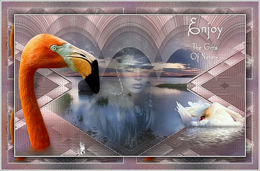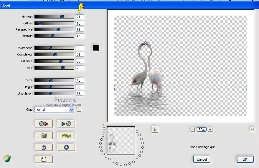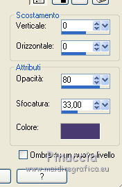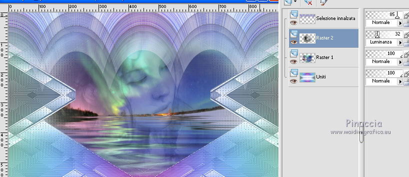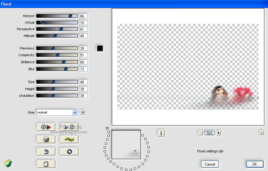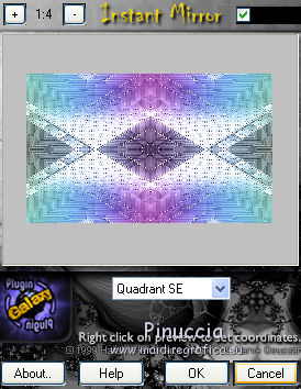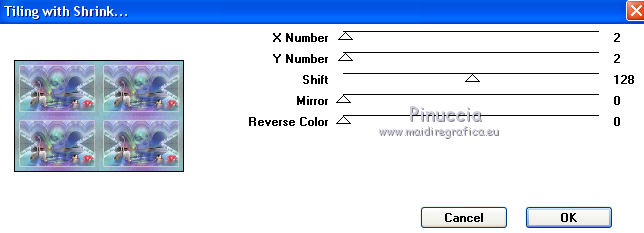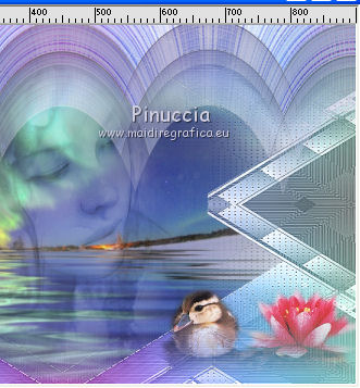 qui puoi trovare qualche risposta ai tuoi dubbi. Se l'argomento che ti interessa non è presente, ti prego di segnalarmelo. Questo tutorial è una creazione di Saturnella e non può essere copiato su altri siti nè essere offerto per il download. Lo stesso vale per la mia traduzione. E' anche proibito togliere il watermark dal materiale; rispettiamo il lavoro dei creatori di tubes, senza i quali non potremmo creare tutorials. Per tradurre questo tutorial, creato con PSP17, ho usato CorelX, ma può essere eseguito anche con le altre versioni di PSP. Dalla versione X4, il comando Immagine>Rifletti è stato sostituito con Immagine>Capovolgi in orizzontale, e il comando Immagine>Capovolgi con Immagine>Capovolgi in verticale. Nelle versioni X5 e X6, le funzioni sono state migliorate rendendo disponibile il menu Oggetti. Nel nuovo X7 sono tornati i comandi Immagine>Rifletti e Immagine>Capovolgi, ma con nuove funzioni. Vedi la scheda sull'argomento qui Occorrente: Materiale qui Per i tube grazie Syl, CibiBijoux, Nikita e Yoka. (in questa pagina trovi i links ai loro siti). Filtri in caso di dubbi, ricorda di consultare la mia sezione filtri qui Filters Unlimited 2.0 qui Plugin Galaxy - Instant Mirror qui VanDerLee - Unplugged-x qui Flaming Pear - Flood qui Toadies - What are you qui Mura's Seamless - Emboss at alpha, Tiling with shring qui I filtri Toadies e Mura Seamless si possono usare da soli o importati in Filters Unlimited (come fare vedi qui) Se un filtro fornito appare con questa icona ![]() non esitare a cambiare modalità di miscelatura e opacità secondo i colori utilizzati. Apri la maschera in PSP e minimizzala con il resto del materiale. 1. Imposta il colore di primo piano con il colore #4a3a72, e il colore di sfondo con il colore bianco #ffffff. ![]() 2. Apri alpha_quietude. Finestra>Duplica, o sulla tastiera maiuscola+D, per fare una copia. ![]() Chiudi l'originale. La copia, che sarà la base del tuo lavoro, non è vuota, ma contiene le selezioni salvate sul canale alfa. 2. Selezione>Seleziona tutto. Apri l'immagine di sfondo fond_quietude, e vai a Modifica>Copia. Torna al tuo lavoro e vai a Modifica>Incolla nella selezione. Selezione>Deseleziona. 3. Regola>Sfocatura>Sfocatura gaussiana - raggio 100. ![]() 4. Livelli>Nuovo livello raster. Riempi con il colore bianco.Livelli>Nuovo livello maschera>Da immagine. Apri il menu sotto la finestra di origine e vedrai la lista dei files aperti. Seleziona la maschera Saturnella_Mask_Abstract013. ![]() Effetti>Effetti di bordo>Aumenta. Livelli>Unisci>Unisci gruppo. Cambia la modalità di miscelatura di questo livello in Luminanza (esistente). Livelli>Unisci>Unisci visibile. 5. Effetti>Plugins>The Plugin Site - Instant Mirror Il filtro Plugin Galaxy nella lista dei filtri si posiziona sotto The Plugin Site. ![]() 6. Effetti>Plugins>VanDerLee - Unplugged-X. ![]() 7. Selezione>Carica/Salva selezione>Carica selezione da canale alfa. La selezione sélection#1 è subito disponibile. Devi soltanto cliccare Carica. ![]() Selezione>Innalza selezione a livello. Selezione>Deseleziona. Cambia la modalità di miscelatura di questo livello in Moltiplica, o secondo i tuoi colori. 8. Effetti>Plugins>Toadies - What are you, con i settaggi standard. ![]() Effetti>Effetti di bordo>Aumenta. 9. Effetti>Effetti 3D>Sfalsa ombra, colore scuro. ![]() 10. Livelli>Duplica. Immagine>Ridimensiona, all'80%, tutti i livelli non selezionato. Livelli>Unisci>Unisci giù. 11. Effetti>Effetti di distorsione>Coordinate polari. ![]() 12. Effetti>Effetti di immagine>Scostamento. ![]() Riporta la modalità di miscelatura di questo livello a Normale, opacità 85. ![]() 13. Attiva il livello di sfondo. Selezione>Carica/Salva selezione>Carica selezione da canale alfa. Apri il menu delle selezioni e carica Selection#2. ![]() Livelli>Nuovo livello raster. Apri il tube del paesaggio di Syl SvB_Noorderlicht_1, e vai a Modifica>Copia. Torna al tuo lavoro e vai a Modifica>Incolla nella selezione. Selezione>Deseleziona. 14. Apri il tube del viso belle-femme-visage-182605, e vai a Modifica>Copia. Torna al tuo lavoro e vai a Modifica>Incolla come nuovo livello. Immagine>Ridimensiona, al 50%, tutti i livelli non selezionato. Regola>Messa a fuoco>Metti a fuoco. Cambia la modalità di miscelatura di questo livello in Luminanza (o secondo i tuoi colori) e abbassa l'opacità al 32%. ![]() 15. Attiva il livello superiore. Apri il tube Duck_lotus_CibiBijoux e vai a Modifica>Copia. Torna al tuo lavoro e vai a Modifica>Incolla come nuovo livello. Immagine>Ridimensiona, al 60%, tutti i livelli non selezionato. Regola>Messa a fuoco>Metti a fuoco. Spostalo in basso a destra.![]() 16. Effetti>Plugins>Flaming Pear - Flood. ![]() 17. Effetti>Effetti 3D>Sfalsa ombra, colore nero. ![]() 18. Apri il tube 12926131370_animaux_Nikita e vai a Modifica>Copia. Torna al tuo lavoro e vai a Modifica>Incolla come nuovo livello. Cancella la firma. Immagine>Ridimensiona, all'80%, tutti i livelli non selezionato. Regola>Messa a fuoco>Metti a fuoco. Spostalo in basso a sinistra.19. Effetti>Plugins>Flaming Pear - Flood, con i settaggi precedenti, ma Horizon a 71. ![]() 20. Effetti>Effetti 3D>Sfalsa ombra, con i settaggi precedenti. 21. Apri il wordart di Yoka e vai a Modifica>Copia. Torna al tuo lavoro e vai a Modifica>Incolla come nuovo livello. Immagine>Ridimensiona, all'80%, tutti i livelli non selezionato. Regola>Messa a fuoco>Metti a fuoco. Immagine>Immagine negativa. se stai usando PSP 9: Regola>Bilanciamento colore>Immagine negativa Posiziona il testo a tuo piacimento.22. Effetti>Plugins>Mura's Seamless - Emboss at alpha, con i settaggi standard. ![]() Abbassa l'opacità di questo livello all'85%, o come preferisci. 23. Attiva il livello di sfondo. Modifica>Copia. 24. Immagine>Aggiungi bordatura, 1 pixel, simmetriche, con il colore scuro. Immagine>Aggiungi bordatura, 3 pixels, simmetriche, colore bianco. Immagine>Aggiungi bordatura, 1 pixel, simmetriche, colore scuro. Immagine>Aggiungi bordatura, 50 pixels, simmetri