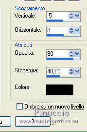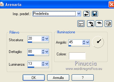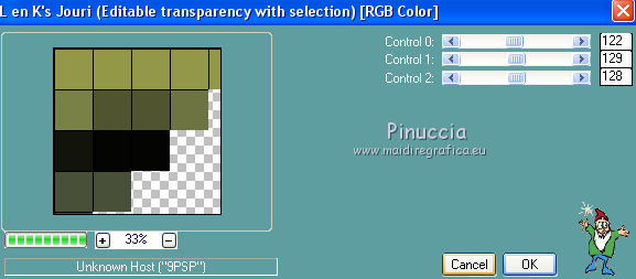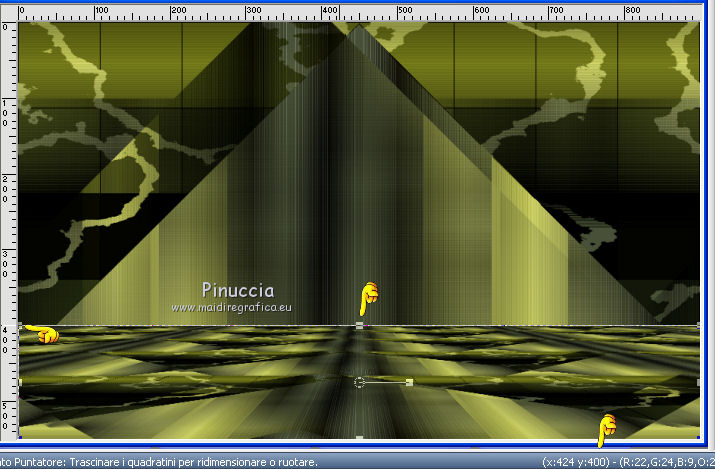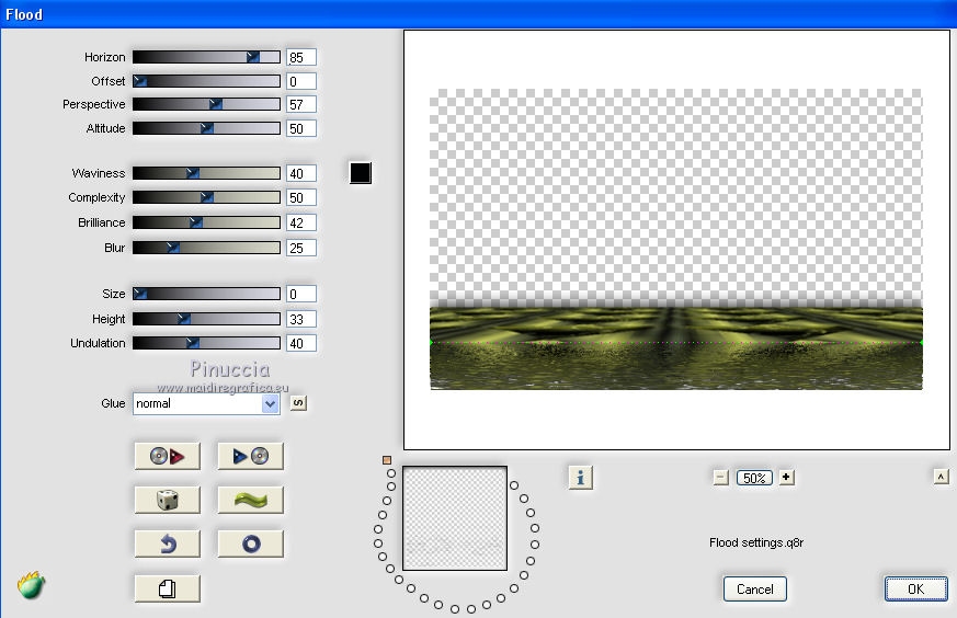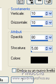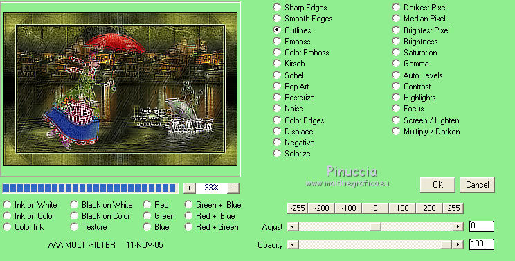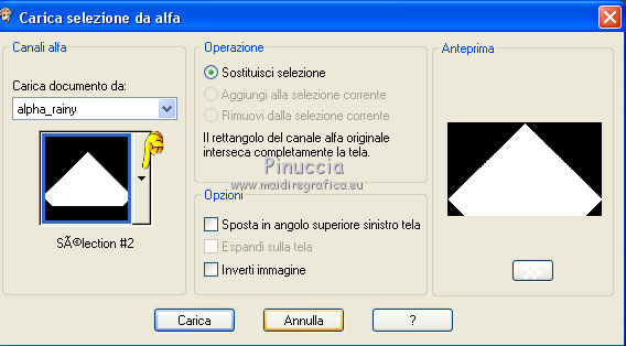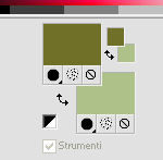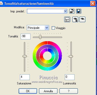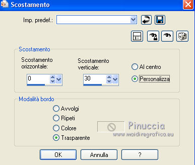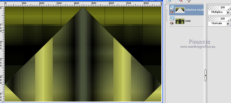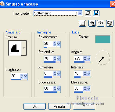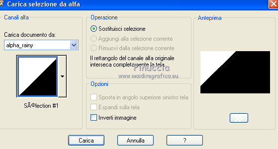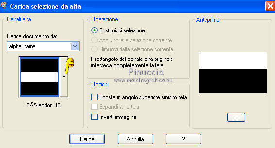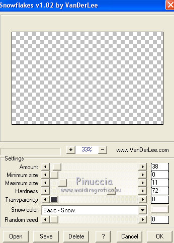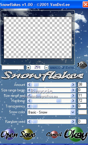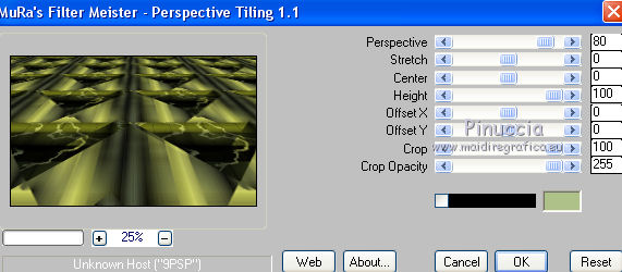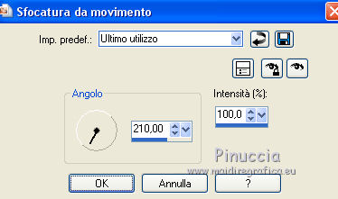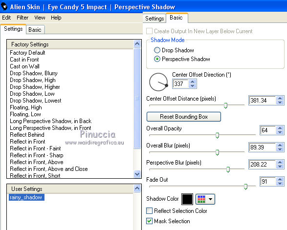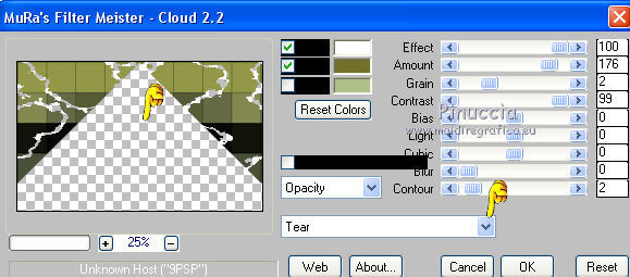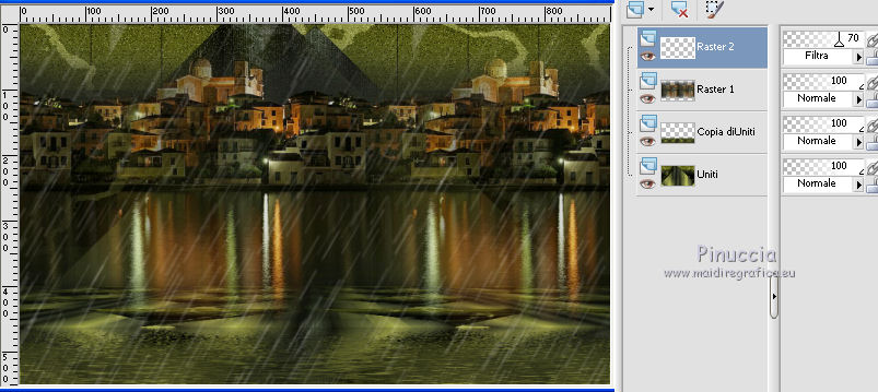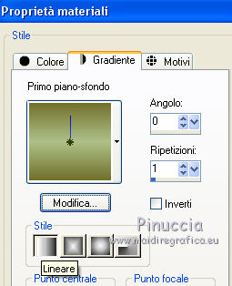 qui puoi trovare qualche risposta ai tuoi dubbi. Se l'argomento che ti interessa non è presente, ti prego di segnalarmelo. Questo tutorial è una creazione di Saturnella e non può essere copiato su altri siti nè essere offerto per il download. Lo stesso vale per la mia traduzione. E' anche proibito togliere il watermark dal materiale; rispettiamo il lavoro dei creatori di tubes, senza i quali non potremmo creare tutorials. Per tradurre questo tutorial, creato con PSP16, ho usato CorelX, ma può essere eseguito anche con le altre versioni di PSP. Dalla versione X4, il comando Immagine>Rifletti è stato sostituito con Immagine>Capovolgi in orizzontale, e il comando Immagine>Capovolgi con Immagine>Capovolgi in verticale. Nelle versioni X5 e X6, le funzioni sono state migliorate rendendo disponibile il menu Oggetti. Nel nuovo X7 sono tornati i comandi Immagine>Rifletti e Immagine>Capovolgi, ma con nuove funzioni. Vedi la scheda sull'argomento qui Occorrente: Materiale qui Grazie per i tubes Beatriz e Lize. (in questa pagina trovi i links ai loro siti). Filtri in caso di dubbi, ricorda di consultare la mia sezione filtri qui Filters Unlimited 2.0 qui L&K's - L&K's Jouri qui Flaming Pear - Flood qui VanDerLee - Snowflakes qui Alien Skin Eye Candy 5 Impact - Perspective Shadow qui Mura's Meister - Copies qui Mura's Meister - Perspective Tiling qui Simple - 4Way Average, Blintz qui AAA Filters - AAA Multifilter (nello zip) I filtri Simple si possono usare da soli o importati in Filters Unlimited (come fare vedi qui) Se un filtro fornito appare con questa icona ![]() non esitare a cambiare modalità di miscelatura e opacità secondo i colori utilizzati. Nelle ultime versioni di PSP non c'è il gradiente di primo piano/sfondo (Corel_06_029) Puoi usare i gradienti delle versioni precedenti. Trovi qui i gradienti Corel X. Metti il preset Cliccando sul file una o due volte (a seconda delle tue impostazioni), automaticamente il preset si installerà nella cartella corretta. perchè uno o due clic vedi qui Colori utilizzati ![]() 1. Imposta il colore di primo piano con #71702a, e il colore di sfondo con #aec189. ![]() Passa il colore di primo piano a Gradiente di primo piano/sfondo, stile Lineare. ![]() 2. Apri alpha_rainy. Finestra>Duplica o sulla tastiera maiuscola+D per fare una copia. ![]() Chiudi l'originale. La copia, che sarà la base del tuo lavoro, non è vuota, ma contiene le selezioni salvate sul canale alfa. Riempi l'immagine trasparente con il gradiente.3. Effetti>Effetti di trama>Arenaria, con i settaggi standard. ![]() 4. Livelli>Duplica. Immagine>Ruota per gradi - 90 gradi a sinistra. ![]() 5. Attiva il livello di sfondo. Selezione>Seleziona tutto. Immagine>Ritaglia la selezione. 6. Attiva il livello soprastante. Effetti>Effetti di immagine>Motivo unico. ![]() 7. Effetti>Effetti 3D>Sfalsa ombra. ![]() Livelli>Unisci>Unisci visibile. 8. Effetti>Plugins>Simple - Blintz. 9. Effetti>Effetti di riflesso>Specchio rotante. ![]() 10. Selezione>Carica/Salva selezione>Carica selezione da canale alfa. la selezione sélection1 è subito disponibile. Devi soltanto cliccare Carica. ![]() Selezione>Innalza selezione a livello. Effetti>Plugins>L&K's - L& Jouri, con i settaggi standard. ![]() Selezione>Deseleziona. 11. Livelli>Duplica. Immagine>Rifletti. Livelli>Unisci>Unisci giù. Cambia la modalità di miscelatura di questo livello in Moltiplica, o secondo i tuoi colori. ![]() 12. Effetti>Plugins>Mura's Meister - Cloud. il risultato è casuale; se vuoi cambiarlo, clicca sulla finestra di anteprima finché non vedi il risultato che ti piace di più ![]() 13. Attiva il livello di sfondo. Selezione>Carica/Salva selezione>Carica selezione da canale alfa. Apri il menu delle selezioni e carica sélection#2. ![]() Selezione>Innalza selezione a livello. Selezione>Deseleziona. 14. Effetti>Effetti di immagine>Motivo unico, Intermittente diagonale. ![]() 15. Livelli>Duplica. Abbassa l'opacità di questo livello al 50%. Livelli>Unisci>Unisci giù. Livelli>Unisci>Unisci visibile. 16. Livelli>Duplica. Effetti>Plugins>Mura's Meister - Perspective Tiling. ![]() 17. Premi il tasto K per attivare lo strumento Puntatore ![]() se stai usando PSP 9 il tasto D per attivare lo strumento Deformazione ![]() in modalità Scala ,spingi il nodo superiore centrale verso il basso fino a 400 pixels ![]() Tasto M per deselezionare lo strumento. 18. Effetti>Effetti 3D>Sfalsa ombra. ![]() 19. Effetti>Plugins>Flaming Pear - Flood. ![]() 20. Attiva il livello di sfondo. Selezione>Carica/Salva selezione>Carica selezione da canale alfa. Apri il menu delle selezioni e carica sélection#3. ![]() Regola>Aggiungi/Rimuovi disturbo>Aggiungi disturbo. ![]() Selezione>Deseleziona. 21. Attiva il livello superiore. Apri il tube del paesaggio di Beatriz e vai a Modifica>Copia. Torna al tuo lavoro e vai a Modifica>Incolla come nuovo livello. 22. Effetti>Effetti di immagine>Motivo unico. ![]() 23. Effetti>Effetti di immagine>Scostamento. ![]() 24. Livelli>Nuovo livello raster. Effetti>Plugins>VanDerLee - Snowflakes. se stai usando la versione precedente: Effetti>Plugins>VDL Adrenaline - Snowflakes ![]() 25. Regola>Sfocatura>Sfocatura da movimento. ![]() Per il mio esempio ho cambiato la modalità di miscelatura di questo livello in Filtra, e abbassato l'opacità a 70; a te decidere. ![]() Nota. Nel materiale trovi il livello con l'effetto. 26. Apri il tube di Lize, cancella la firma, e vai a Modifica>Copia. Torna al tuo lavoro e vai a Modifica>Incolla come nuovo livello. Immagine>Rifletti. Immagine>Ridimensiona, all'85%, tutti i livelli non selezionato. Regola>Messa a fuoco>Metti a fuoco. 27. Effetti>Plugins>Alien Skin Eye Candy 5 Impact - Perspective Shadow. Seleziona il preset rainy_shadow e ok. Questi i settaggi, in caso di problemi con il preset. ![]() 28. Apri il wordart. Per il mio esempio: Regola>Tonalità e saturazione>Tonalità/Saturatione/Luminosità. ![]() Modifica>Copia. Torna al tuo lavoro e vai a Modifica>Incolla come nuovo livello. I