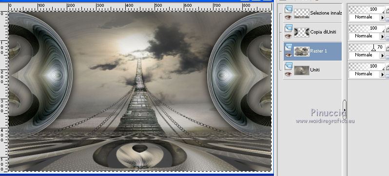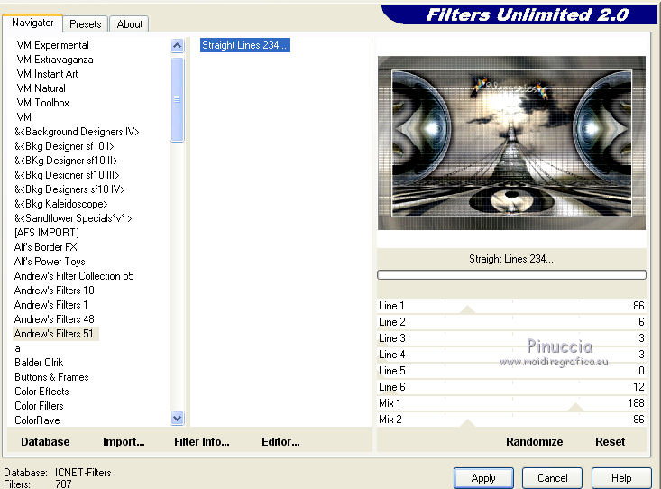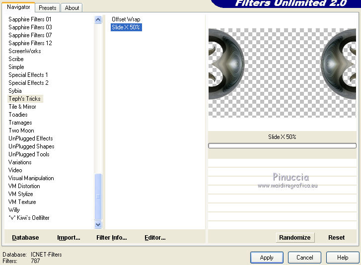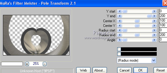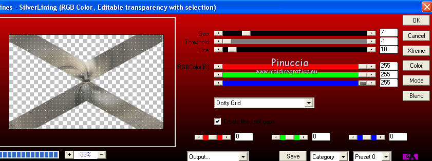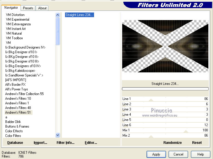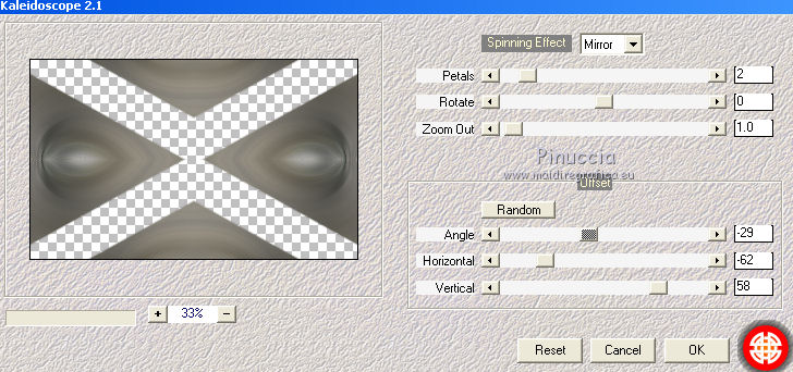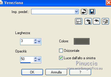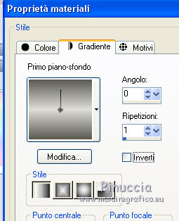 qui puoi trovare qualche risposta ai tuoi dubbi. Se l'argomento che ti interessa non è presente, ti prego di segnalarmelo. Questo tutorial è una creazione di Saturnella e non può essere copiato su altri siti nè essere offerto per il download. Lo stesso vale per la mia traduzione. E' anche proibito togliere il watermark dal materiale; rispettiamo il lavoro dei creatori di tubes, senza i quali non potremmo creare tutorials. Per tradurre questo tutorial, creato con Corel2018, ho usato CorelX, ma può essere eseguito anche con le altre versioni di PSP. Dalla versione X4, il comando Immagine>Rifletti è stato sostituito con Immagine>Capovolgi in orizzontale, e il comando Immagine>Capovolgi con Immagine>Capovolgi in verticale. Nelle versioni X5 e X6, le funzioni sono state migliorate rendendo disponibile il menu Oggetti. Nel nuovo X7 sono tornati i comandi Immagine>Rifletti e Immagine>Capovolgi, ma con nuove funzioni. Vedi la scheda sull'argomento qui In omaggio a Johnny Hallyday morto il 6 dicembre 2017 Occorrente: Materiale qui Grazie per i tubes Maryse et Marcio C. (in questa pagina trovi i links ai loro siti). Filtri in caso di dubbi, ricorda di consultare la mia sezione filtri qui Filters Unlimited 2.0 qui Mehdi - Kaleidoscope 2.1 qui Mura's Meister - Pole Transform qui Mura's Meister - Perspective Tiling qui AP 01 [Innovations] - Lines SilverLining qui Andrew's filter 51 - Straight lines 234 qui Flaming Pear - Flexify 2 qui Alien Skin Eye Candy 5 Impact - Extrude qui Toadies - What are you qui Teph's Tricks - Slide X50% qui I filtri Andrew's, Teph's Tricks e Toadies si possono usare da soli o importati in Filters Unlimited (come fare vedi qui) Se un filtro fornito appare con questa icona ![]() non esitare a cambiare modalità di miscelatura e opacità secondo i colori utilizzati. Nelle ultime versioni di PSP non c'è il gradiente di primo piano/sfondo (Corel_06_029) Puoi usare i gradienti delle versioni precedenti. Trovi qui i gradienti Corel X. Metti il preset Cliccando sul file una o due volte (a seconda delle tue impostazioni), automaticamente il preset si installerà nella cartella corretta. perchè uno o due clic vedi qui Se preferisci, puoi importare direttamente il preset nel corso del tutorial Come fare vedi la scheda del filtro Eye Candy qui 1. Imposta il colore di primo piano con il colore scuro #5a5a52, e il colore di sfondo con il colore chiaro #deded6. ![]() Passa il colore di primo piano a Gradiente di primo piano/sfondo, stile Lineare. ![]() 2. Apri alpha_requiem. Finestra>Duplica (o sulla tastiera maiuscola+D) per fare una copia. ![]() Chiudi l'originale. La copia, che sarà la base del tuo lavoro, non è vuota, ma contiene una selezione salvata sul canale alfa. Riempi l'immagine trasparente con il gradiente.3. Regola>Sfocatura>Sfocatura gaussiana - raggio 30. ![]() 4. Livelli>Nuovo livello raster. Selezione>Seleziona tutto. Apri il tube del paesaggio di Marcio e vai a Modifica>Copia. Torna al tuo lavoro e vai a Modifica>Incolla nella selezione. Selezione>Deseleziona. 5. Effetti>Effetti di immagine>Motivo unico, con i settaggi standard. ![]() 6. Regola>Sfocatura>Sfocatura radiale. ![]() Effetti>Effetti di bordo>Aumenta di più. Livelli>Unisci>Unisci visibile. 7. Livelli>Duplica. Immagine>Ridimensiona, all'80%, tutti i livelli non selezionato. Immagine>Rifletti. 8. Effetti>Plugins>Mehdi - Kaleidoscope 2.1. ![]() 9. Attiva il livello di sfondo. Selezione>Carica/Salva selezione>Carica selezione da canale alfa. La selezione sélection#1 è subito disponibile. Devi soltanto cliccare Carica. ![]() Selezione>Innalza selezione a livello. 10. Effetti>Plugins>AP 01 Innovations - Lines SilverLining. ![]() Selezione>Deseleziona. Livelli>Disponi>Porta in alto. 11. Effetti>Plugins>Alien Skin Eye Candy 5 Impact - Extrude Seleziona il preset requiem_extrude e ok. ![]() 12. Effetti>Plugins>Mura's Meister - Pole Transform ![]() Effetti>Plugins>Mura's Meister - Perspective Tiling. ![]() 13. Effetti>Effetti 3D>Sfalsa ombra. ![]() 14. Attiva il livello sottostante, copia di Uniti ![]() Effetti>Plugins>Filters Unlimited 2.0 - Andrew's filters 51 - Stright Lines 234, con i settaggi standard. ![]() Effetti>Plugins>Flaming Pear - Flexify 2. ![]() Immagine>Ridimensiona, all'80%, tutti i livelli non selezionato. Effetti>Effetti di immagine>Scostamento. ![]() 16. Effetti>Plugins>Filters Unlimited 2.0 - Teph's Tricks - Slide x 50%. ![]() Effetti>Effetti 3D>Sfalsa ombra ![]() 17. Attiva il livello di sfondo. Livelli>Nuovo livello raster. Selezione>Seleziona tutto. Modifica>Incolla nella selezione (il tube del paesaggio di Marcio è sempre in memoria). Io ho abbassato l'opacità di questo livello al 70%. ![]() Selezione>Deseleziona. 18. Effetti>Effetti di trama>Veneziana, con il tuo colore scuro. ![]() 19. Attiva il livello superiore. Apri il wordart e vai a Modifica>Copia. Torna al tuo lavoro e vai a Modifica>Incolla come nuovo livello. Spostalo in alto, al centro.Effetti>Effetti 3D>Sfalsa ombra, con i settaggi precedenti. 20. Attiva il livello di sfondo. Modifica>Copia. Immagine>Aggiungi bordatura, 1 pixel, simmetriche, colore scuro. Immagine>Aggiungi bordatura, 3 pixels, simmetriche, colore chiaro. Immagine>Aggiungi bordatura, 1 pixel, simmetriche, colore scuro. 21. Selezione>Seleziona tutto. Immagine>Aggiungi bordatura, 50 pixels, simmetriche, colore chiaro. Selezione>Inverti. Modifica>Incolla nella selezione. 22. Effetti>Plugins>Filters Unlimited 2.0 - Andrew's filter 51 - Straight Lines 234, con i settaggi precedenti. ![]() 23. Effetti>Plugins>Toadies - What are you. ![]() Regola>Messa a fuoco>Accentua messa a fuoco. 24. Selezione>Inverti. Effetti>Effetti 3D>Sfalsa ombra, con i settaggi precedenti. ![]() Selezione>Deseleziona. 25. Apri il tube di Johnny e vai a Modifica>Copia. Torna al tuo lavoro e vai a Modifica>Incolla come nuovo livello. Cancella la firma. Immagine>Ridimensiona, all'85%, tutti i livelli non selezionato. Regola>Messa a fuoco>Metti a fuoco. Sposta il tube a destra.26. Effett