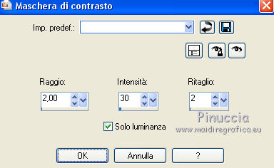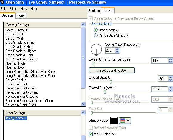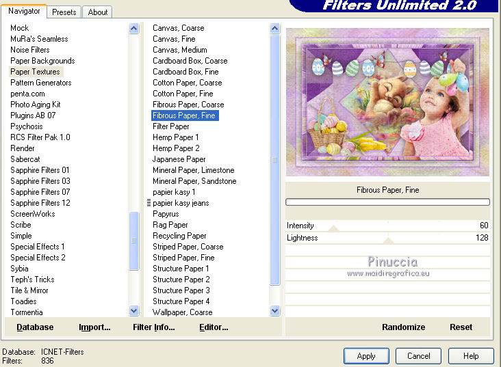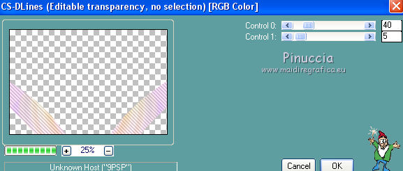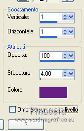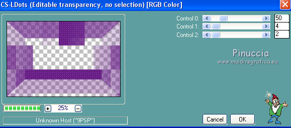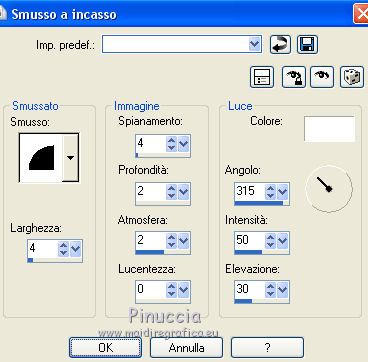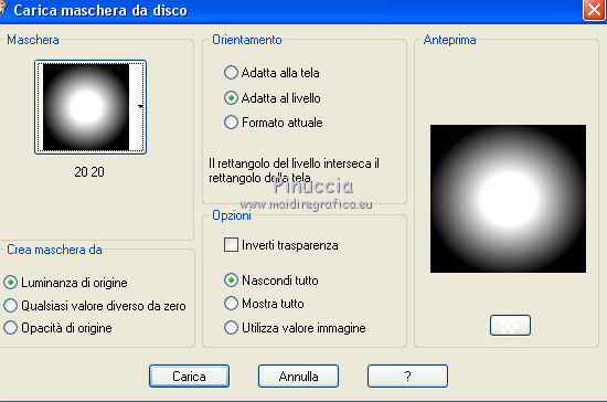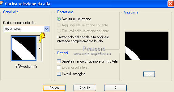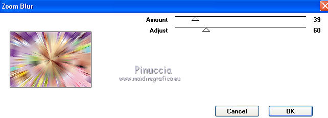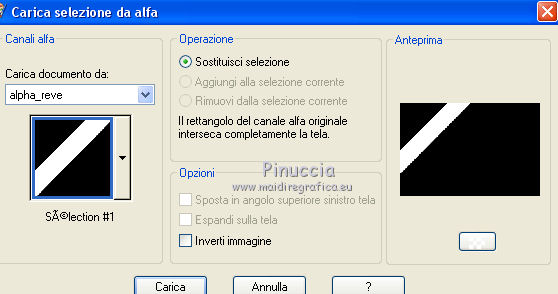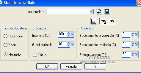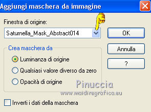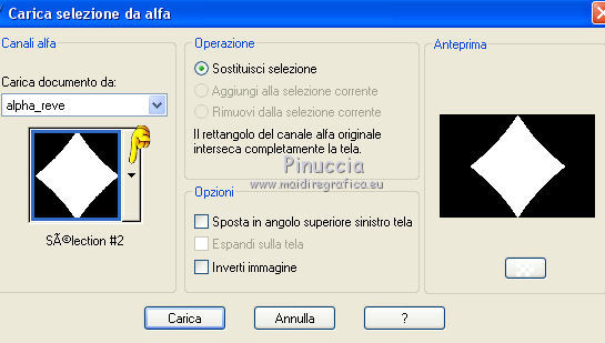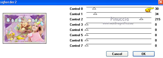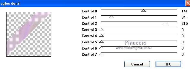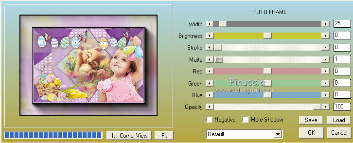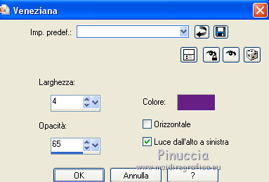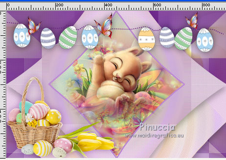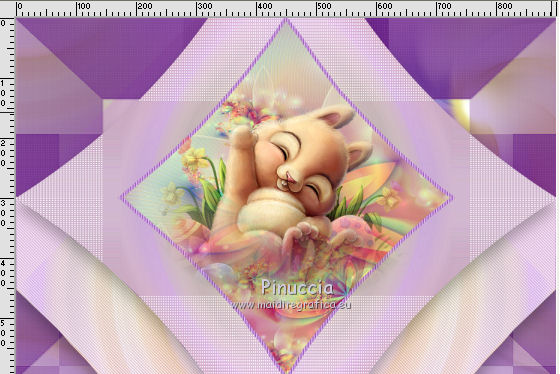 qui puoi trovare qualche risposta ai tuoi dubbi. Se l'argomento che ti interessa non è presente, ti prego di segnalarmelo. Questo tutorial è una creazione di Saturnella e non può essere copiato su altri siti nè essere offerto per il download. Lo stesso vale per la mia traduzione. E' anche proibito togliere il watermark dal materiale; rispettiamo il lavoro dei creatori di tubes, senza i quali non potremmo creare tutorials. Per tradurre questo tutorial, creato con Corel2018, ho usato CorelX, ma può essere eseguito anche con le altre versioni di PSP. Dalla versione X4, il comando Immagine>Rifletti è stato sostituito con Immagine>Capovolgi in orizzontale, e il comando Immagine>Capovolgi con Immagine>Capovolgi in verticale. Nelle versioni X5 e X6, le funzioni sono state migliorate rendendo disponibile il menu Oggetti. Nel nuovo X7 sono tornati i comandi Immagine>Rifletti e Immagine>Capovolgi, ma con nuove funzioni. Vedi la scheda sull'argomento qui Occorrente: Materiale qui Grazie: Animabelle per il tube delle uova, Cibi per il coniglio, Thafs per la farfalla e Krys per la bambina e il cesto. Il resto del materiale è di Saturnella. (in questa pagina trovi i links ai loro siti). Filtri in caso di dubbi, ricorda di consultare la mia sezione filtri qui Filters Unlimited 2.0 qui AFS IMPORT - sqborder2 qui Graphics Plus - Vertical mirror qui Carolaine and Sensibility - CS-DLines, CS-LDots qui Simple - Blintz qui VM Toolbox - Zoom blur qui Alien Skin Eye Candy 5 Impact - Perspective Shadow qui AAA Frames - Texture Frame qui I filtri AFS IMPORT, Graphics plus, VM Toolbox e Simple si possono usare da soli o importati in Filters Unlimited (come fare vedi qui) Se un filtro fornito appare con questa icona ![]() non esitare a cambiare modalità di miscelatura e opacità secondo i colori utilizzati. Metti il preset Cliccando sul file una o due volte (a seconda delle tue impostazioni), automaticamente il preset si installerà nella cartella corretta. perchè uno o due clic vedi qui Se preferisci, puoi importare direttamente il preset nel corso del tutorial Come fare vedi la scheda del filtro Eye Candy qui Metti la maschera 20-20 nella cartella Maschere. Apri la maschera di Saturnella in PSP e minimizzala con il resto del materiale Colori utilizzati ![]() 1. Imposta il colore di primo piano con il colore scuro #671f86, e il colore di sfondo con il colore chiaro #e9bffb. ![]() Apri alpha_reve. Finestra>Duplica (o sulla tastiera maiuscola+D) per fare una copia. ![]() Chiudi l'originale. La copia, che sarà la base del tuo lavoro, non è vuota, ma contiene le selezioni salvate sul canale alfa. Riempi l'immagine trasparente con il colore chiaro.2. Selezione>Seleziona tutto. Apri il tube delle uova di Animabelle e vai a Modifica>Copia. Torna al tuo lavoro e vai a Modifica>Incolla nella selezione. Selezione>Deseleziona. 3. Effetti>Effetti di immagine>Motivo unico, con i settaggi standard. ![]() 4. Regola>Sfocatura>Sfocatura radiale. ![]() Effetti>Effetti di bordo>Aumenta di più. 5. Effetti>Plugins>Simple - Blintz. Modifica>Ripeti Blintz. 6. Selezione>Carica/Salva selezione>Carica selezione da canale alfa. La selezione sélection#1 è subito disponibile. Devi soltanto cliccare Carica. ![]() Selezione>Innalza selezione a livello. Effetti>Plugins>AFS IMPORT - sqborder 2, con i settaggi standard. ![]() Selezione>Deseleziona. 7. Effetti>Effetti di riflesso>Specchio rotante. ![]() 8. Effetti>Plugins>Graphics plus - Vertical Mirror. ![]() 9. Effetti>Effetti di distorsione>Stringi (nelle versioni più recenti è diventato Compressione) ![]() 10. Selezione>Carica/Salva selezione>Carica selezione da canale alfa. Apri il menu delle selezioni e carica Sélection#2. ![]() Apri il frattale e vai a Modifica>Copia. Torna al tuo lavoro e vai a Modifica>Incolla nella selezione. Selezione>Modifica>Seleziona bordature selezione. ![]() Riempi la selezione con il colore chiaro.Effetti>Effetti di trama>Veneziana - colore scuro. ![]() Selezione>Deseleziona. 11. Attiva il livello di sfondo. Selezione>Carica/Salva selezione>Carica selezione da canale alfa. Apri il menu delle selezioni e carica Sélection#3. ![]() Selezione>Innalza selezione a livello. Selezione>Deseleziona. 12. Livelli>Duplica. Immagine>Rifletti. Livelli>Unisci>Unisci giù. 13. Effetti>Plugins>Carolaine and Sensibility - CS-DLines, con i settaggi standard. ![]() 14. Effetti>Plugins>Alien Skin Eye Candy 5 Impact - Perspective Shadow. Seleziona il preset reve_shadow e ok. ![]() 15. Attiva il livello di sfondo. Livelli>Nuovo livello raster. Riempi il livello con il colore scuro.Livelli>Nuovo livello maschera>Da immagine. Apri il menu sotto la finestra di origine e vedrai la lista dei files aperti. Seleziona la maschera Saturnella_Mask_Abstract014. ![]() Effetti>Effetti di bordo>Aumenta. Livelli>Unisci>Unisci gruppo. 16. Effetti>Plugins>Carolaine and Sensibility - CS-LDots ![]() 17. Effetti>Effetti 3D>Sfalsa ombra, colore scuro. ![]() 18. Attiva il livello superiore. Effetti>Plugins>Alien Skin Eye Candy 5 Impact - Perspective Shadow, con i settaggi precedenti. 19. Apri il tube Easter-Cute-Bunny di Cibi e vai a Modifica>Copia. Torna al tuo lavoro e vai a Modifica>Incolla come nuovo livello. Livelli>Carica/Salva maschera>Carica maschera da disco. Cerca e carica la maschera 20-20. ![]() Livelli>Unisci>Unisci gruppo. Immagine>Ridimensiona, al 65%, tutti i livelli non selezionato. Posiziona correttamente il tube al centro.![]() 20. Apri il tube del cesto di krys e vai a Modifica>Copia. Torna al tuo lavoro e vai a Modifica>Incolla come nuovo livello. Cancella la firma. Immagine>Ridimensiona, all'80%, tutti i livelli non selezionato. Regola>Messa a fuoco>Metti a fuoco. Sposta il tube in basso a sinistra.Effetti>Effetti 3D>Sfalsa ombra, colore scuro. ![]() 21. Apri il tube deco e vai a Modifica>Copia. Torna al tuo lavoro e vai a Modifica>Incolla come nuovo livello. Sposta il tube in alto.Effetti>Effetti 3D>Sfalsa ombra, con i settaggi precedenti, ma colore nero. ![]() 22. Apr