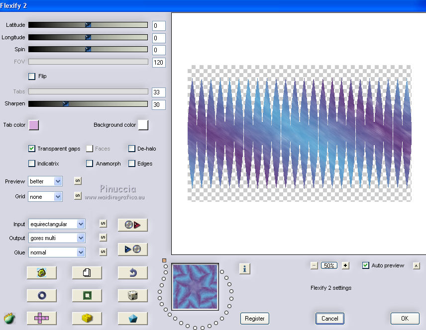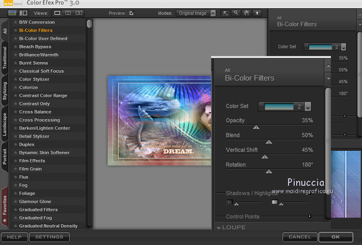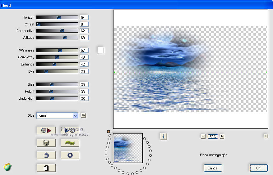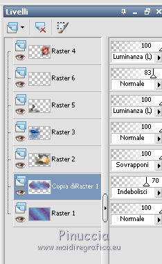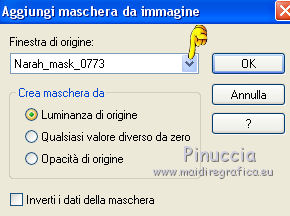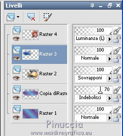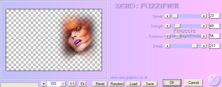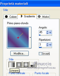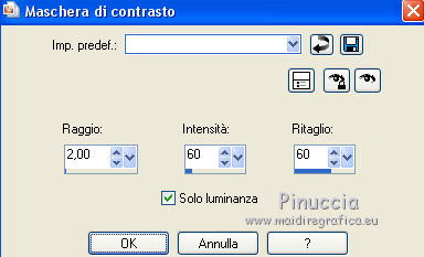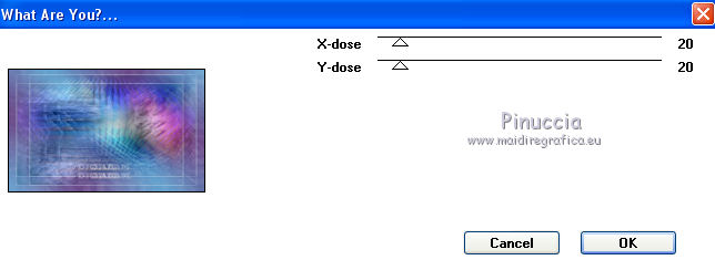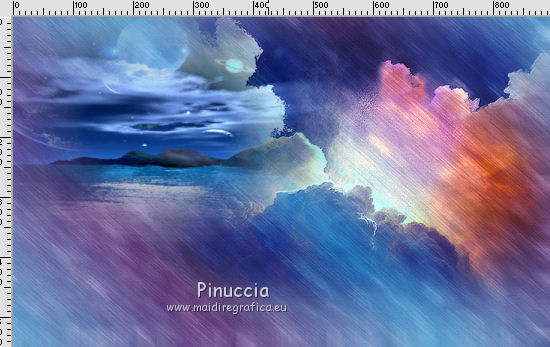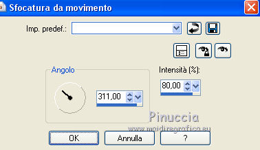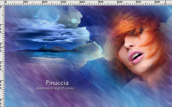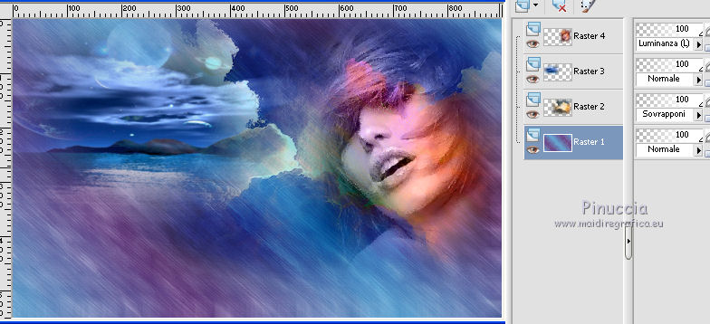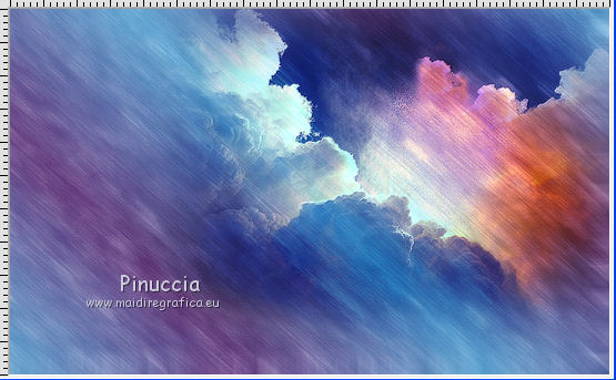 qui puoi trovare qualche risposta ai tuoi dubbi. Se l'argomento che ti interessa non è presente, ti prego di segnalarmelo. Questo tutorial è una creazione di Saturnella e non può essere copiato su altri siti nè essere offerto per il download. Lo stesso vale per la mia traduzione. E' anche proibito togliere il watermark dal materiale; rispettiamo il lavoro dei creatori di tubes, senza i quali non potremmo creare tutorials. Per tradurre questo tutorial, creato con PSP17, ho usato CorelX, ma può essere eseguito anche con le altre versioni di PSP. Dalla versione X4, il comando Immagine>Rifletti è stato sostituito con Immagine>Capovolgi in orizzontale, e il comando Immagine>Capovolgi con Immagine>Capovolgi in verticale. Nelle versioni X5 e X6, le funzioni sono state migliorate rendendo disponibile il menu Oggetti. Nel nuovo X7 sono tornati i comandi Immagine>Rifletti e Immagine>Capovolgi, ma con nuove funzioni. Vedi la scheda sull'argomento qui Occorrente: Materiale qui Grazie per i tubes LuzCristina, Logane e Krys, per il wordart Yoka e per la maschera Narah. (in questa pagina trovi i links ai loro siti). Filtri in caso di dubbi, ricorda di consultare la mia sezione filtri qui Filters Unlimited 2.0 qui Impressionist qui Xero - Fuzzifier qui Flaming Pear - Flood qui Flaming Pear - Flexify 2 qui Toadies - What Are you qui Nik Software - Color Efex Pro qui I filtri Toadies si possono usare da soli o importati in Filters Unlimited (come fare vedi qui) Se un filtro fornito appare con questa icona ![]() non esitare a cambiare modalità di miscelatura e opacità secondo i colori utilizzati. Nelle ultime versioni di PSP non c'è il gradiente di primo piano/sfondo (Corel_06_029) Trovi i gradienti delle versioni precedenti qui Apri la maschera in PSP e minimizzala con il resto del materiale. 1. Imposta il colore di primo piano con il colore #4e95c0, e il colore di sfondo con il colore #5f337a. ![]() Passa il colore di primo piano a Gradiente di primo piano/sfondo, stile Lineare. ![]() 2. Apri una nuova immagine trasparente 900 x 550 pixels, e riempila con il gradiente.3. Effetti>Plugins>Impressionist Style>Chalk Sketch>On Fine Laid Paper e Apply. ![]() 4. Regola>Sfocatura>Sfocatura da movimento. ![]() Regola>Messa a fuoco>Accentua messa a fuoco. 5. Apri il tube del paesaggio di LuzCristina 2481-luzcristina, e vai a Modifica>Copia. Torna al tuo lavoro e vai a Modifica>Incolla come nuovo livello. Immagine>Ridimensiona, al 120%, tutti i livelli non selezionato. Regola>Messa a fuoco>Metti a fuoco. Cambia la modalità di miscelatura di questo livello in Sovrapponi. Sposta il tube a destra.![]() 6. Apri il tube del paesaggio "logane_mistedciel_30decembre", e vai a Modifica>Copia. Torna al tuo lavoro e vai a Modifica>Incolla come nuovo livello. Sposta il tube in alto a sinistra.![]() 7. Apri il tube del viso di LuzCristina 2824-luzcristina, e vai a Modifica>Copia. Torna al tuo lavoro e vai a Modifica>Incolla come nuovo livello. Immagine>Rifletti. Sposta il tube a destra.![]() 8. Effetti>Plugins>Xero - Fuzzifier. ![]() Cambia la modalità di miscelatura di questo livello in Luminanza (esistente). 9. Attiva il livello di sfondo. ![]() Livelli>Duplica. Effetti>Plugins>Flaming Pear - Flexify 2. ![]() 10. Ripeti Effetti>Plugins>Flaming Pear - Flexify 2, con i seguenti settaggi. ![]() 11. Effetti>Effetti di immagine>Scostamento. ![]() Cambia la modalità di miscelatura di questo livello in Indebolisci, e abbassa l'opacità al 70%. ![]() 12. Attiva il livello del paesaggio di Logane - raster 3. ![]() Effetti>Plugins>Flaming Pear - Flood. ![]() 13. Apri il tube di Krys "krysfantastique22", e vai a Modifica>Copia. Torna al tuo lavoro e vai a Modifica>Incolla come nuovo livello. Cancella il watermark. Immagine>Rifletti. Cambia la modalità di miscelatura di questo livello in Luminanza (esistente). Sposta il tube a sinistra.14. Effetti>Effetti 3D>Sfalsa ombra. ![]() 15. Apri il wordart di Yoka e vai a Modifica>Copia. Torna al tuo lavoro e vai a Modifica>Incolla come nuovo livello. Immagine>Ridimensiona, all'80%, tutti i livelli non selezionato. Immagine>Immagine negativa. Se stai usando PSP 9: Regola>Bilanciamento colore>Immagine negativa 16. Effetti>Effetti 3D>Sfalsa ombra. ![]() Abbassa l'opacità di questo livello all'83%. 17. Attiva il livello "copia di Raster 2" (il secondo livello dal basso) ![]() Imposta il colore di primo piano con il colore bianco. Livelli>Nuovo livello raster. Riempi il livello con il colore bianco.18. Livelli>Nuovo livello maschera>Da immagine. Apri il menu sotto la finestra di origine e vedrai la lista dei files aperti. Seleziona la maschera Narah_mask_0773, con i seguenti settaggi. ![]() Effetti>Effetti di bordo>Aumenta. Livelli>Unisci>Unisci gruppo. 19. Effetti>Effetti 3D>Sfalsa ombra. ![]() Cambia la modalità di miscelatura di questo livello in Sovrapponi, o secondo i tuoi colori. 20. Attiva il livello di sfondo. Modifica>Copia. 21. Immagine>Aggiungi bordatura, 1 pixel, simmetriche, colore di primo piano. Immagine>Aggiungi bordatura, 3 pixels, simmetriche, colore bianco. Immagine>Aggiungi bordatura, 1 pixel, simmetriche, colore di primo piano. 22. Immagine>Aggiungi bordatura, simmetriche non selezionato, colore bianco. ![]() Attiva lo strumento Bacchetta magica ![]() e clicca nel bordo per selezionarlo. 23. Modifica>Incolla nella selezione. 24. Effetti>Plugins>Toadies, What are you, con i settaggi standard. ![]() Effetti>Effetti di bordo>Aumenta. Selezione>Inverti. Effetti>Effetti 3D>Sfalsa ombra. ![]() Selezione>Deseleziona. 25. Effetti>Plugins>Nik Software - Color Efex Pro - Bi-color filters, a destra seleziona un Color Set adatto ai tuoi colori; per l'esempio Cool/Warm 2. ![]() 26. Firma il tuo lavoro su un nuovo livello. Immagine>Aggiungi bordatura, 1 pixel, simmetriche, colore nero. Immagine>Ridimensiona, 900 pixels di larghezza, tutti i livelli selezionato. Regola>Messa a fuoco>Maschera di contrasto. ![]() Salva in formato jpg. Il tube di questo esempio è di Yoka ![]() Le v