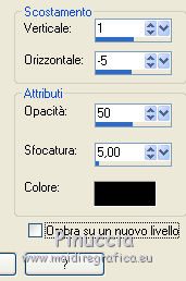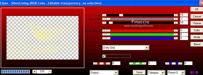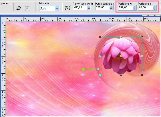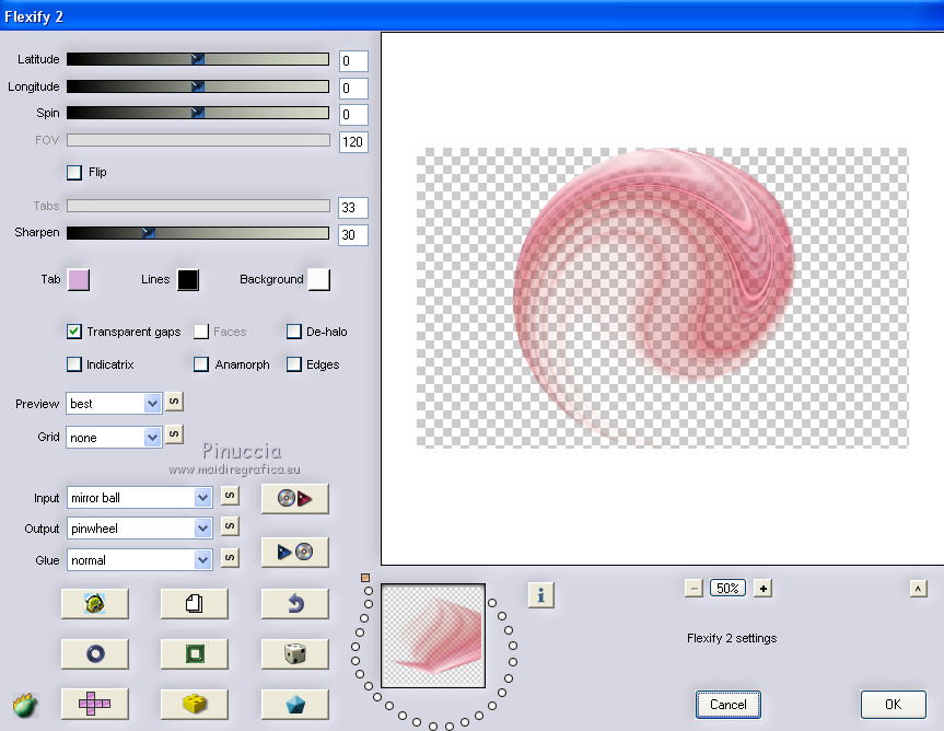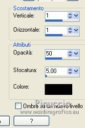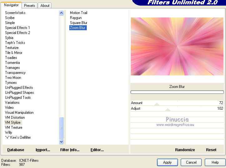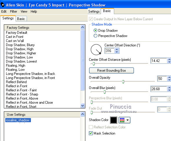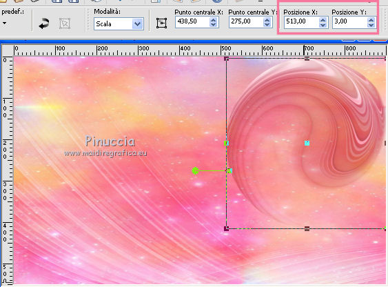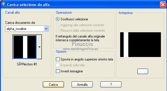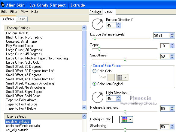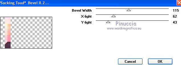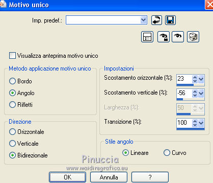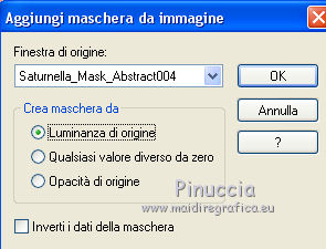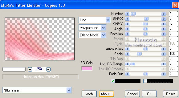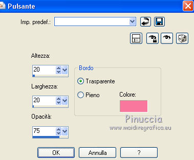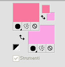 qui puoi trovare qualche risposta ai tuoi dubbi. Se l'argomento che ti interessa non è presente, ti prego di segnalarmelo. Questo tutorial è una creazione di Saturnella e non può essere copiato su altri siti nè essere offerto per il download. Lo stesso vale per la mia traduzione. E' anche proibito togliere il watermark dal materiale; rispettiamo il lavoro dei creatori di tubes, senza i quali non potremmo creare tutorials. Per tradurre questo tutorial, creato con Corel2018, ho usato CorelX, ma può essere eseguito anche con le altre versioni di PSP. Dalla versione X4, il comando Immagine>Rifletti è stato sostituito con Immagine>Capovolgi in orizzontale, e il comando Immagine>Capovolgi con Immagine>Capovolgi in verticale. Nelle versioni X5 e X6, le funzioni sono state migliorate rendendo disponibile il menu Oggetti. Nel nuovo X7 sono tornati i comandi Immagine>Rifletti e Immagine>Capovolgi, ma con nuove funzioni. Vedi la scheda sull'argomento qui Occorrente: Materiale qui Tutto il materiale è di Saturnella. (in questa pagina trovi i links ai loro siti). Filtri in caso di dubbi, ricorda di consultare la mia sezione filtri qui Filters Unlimited 2.0 qui Flaming Pear - Flexify 2 qui Mura's Meister - Copies qui Toadies - Sucking Toad Bevel II.2 qui AP 01 Innovations - Lines SilverLining qui VM Toolbox - Zoom Blur qui Alien Skin Eye Candy 5 Impact - Perspective Shadow, Extrude qui I filtri Toadies e VM Toolbox si possono usare da soli o importati in Filters Unlimited (come fare vedi qui) Se un filtro fornito appare con questa icona ![]() non esitare a cambiare modalità di miscelatura e opacità secondo i colori utilizzati. Metti i preset Cliccando sul file una o due volte (a seconda delle tue impostazioni), automaticamente il preset si installerà nella cartella corretta. perchè uno o due clic vedi qui Se preferisci, puoi importare direttamente il preset nel corso del tutorial Come fare vedi la scheda del filtro Eye Candy qui Apri la maschera in PSP e minimizzala con il resto del materiale. Colori utilizzati ![]() 1. Imposta il colore di primo piano con il colore scuro #f8779d, e il colore di sfondo con il colore chiaro #faa5e4. ![]() Apri alpha_rosaline. Finestra>Duplica, o sulla tastiera tasto della maiuscola+D per fare una copia. Chiudi l'originale. La copia, che sarà la base del tuo lavoro, non è vuota, ma contiene una selezione salvata sul canale alfa. 2. Selezione>Seleziona tutto. Apri l'immagine fond_rosaline e vai a Modifica>Copia. Torna al tuo lavoro e vai a Modifica>Incolla nella selezione. Selezione>Deseleziona. 3. Effetti>Effetti di immagine>Motivo unico. ![]() 4. Apri il tube element_01 e vai a Modifica>Copia. Torna al tuo lavoro e vai a Modifica>Incolla come nuovo livello. 5. Effetti>Plugins>Mura's Meister - Copies. ![]() 6. Effetti>Effetti 3D>Sfalsa ombra. ![]() Cambia la modalità di miscelatura di questo livello in Luce diffusa, o altro. 7. Livelli>Duplica. Immagine>Rifletti. Riporta la modalità di miscelatura di questo livello a Normale. Effetti>Plugins>Flaming Pear - Flexify 2. ![]() Immagine>Ridimensiona, al 75%, tutti i livelli non selezionato. 8. Tasto K per attivare lo strumento Puntatore ![]() e imposta Posizione X: 513,00 e Posizione Y: 3,00. ![]() 9. Apri il tube fleur sat_lot01 e vai a Modifica>Copia. Torna al tuo lavoro e vai a Modifica>Incolla come nuovo livello. Cancella la firma. Immagine>Ridimensiona, 2 volte al 75%, tutti i livelli non selezionato. Tasto K per attivare lo strumento Puntatore ![]() e imposta Posizione X: 547,00 e Posizione Y: 88,00. ![]() Abbassa l'opacità di questo livello al 70%. 10. Livelli>Disponi>Sposta giù. 11. Attiva il livello superiore. Livelli>Unisci>Unisci giù. 12. Attiva il livello di sfondo. Selezione>Carica/Salva selezione>Carica selezione da canale alfa. La selezione #1 è subito disponibile. Devi soltanto cliccare Carica. ![]() Selezione>Innalza selezione a livello. Selezione>Deseleziona. Effetti>Plugins>Toadies - Sucking Toad Bevel II.2, con i settaggi standard. ![]() Effetti>Plugins>Alien Skin Eye Candy 5 Impact - Extrude seleziona il preset Rosaline_extrude e ok. ![]() 13. Effetti>Effetti di riflesso>Fuga di specchi. ![]() Cambia la modalità di miscelatura di questo livello in Moltiplica, e abbassa l'opacità al 59%. 14. Effetti>Effetti 3D>Sfalsa ombra. ![]() 15. Attiva nuovamente il livello di sfondo. Livelli>Nuovo livello raster. Imposta il colore di primo piano con #fff29e. Riempi con il colore #fff29e.Livelli>Nuovo livello maschera>Da immagine. Apri il menu sotto la finestra di origine e vedrai la lista dei files aperti. Seleziona la maschera Saturnella_Mask_Abstract004. ![]() Effetti>Effetti di bordo>Aumenta. Livelli>Unisci>Unisci gruppo. Cambia la modalità di miscelatura di questo livello in Luminanza (esistente), o altro. 16. Effetti>Plugins>AP 01 Innovations - Lines SilverLining. ![]() 17. Attiva il livello di sfondo. Modifica>Copia. Per i bordi: imposta nuovamente il colore di primo piano con il colore scuro #f8779d. ![]() Immagine>Aggiungi bordatura, 1 pixel, simmetriche, colore scuro. Immagine>Aggiungi bordatura, 3 pixels, simmetriche, colore chiaro. Immagine>Aggiungi bordatura, 1 pixel, simmetriche, colore scuro. Selezione>Seleziona tutto. Immagine>Aggiungi bordatura, 20 pixels, simmetriche, colore #fff29e. Selezione>Inverti. Effetti>Plugins>Filters Unlimited 2.0 - VM Toolboox o VM Stylize - Zoom Blur. ![]() 18. Effetti>Effetti 3D>Pulsante, colore scuro di primo piano. ![]() 19. Effetti>Effetti 3D>Sfalsa ombra. ![]() Selezione>Deseleziona. 20. Immagine>Aggiungi bordatura, 1 pixel, simmetriche, colore scuro. Immagine>Aggiungi bordatura, 3 pixels, simmetriche, colore chiaro. Immagine>Aggiungi bordatura, 1 pixel, simmetriche, colore scuro. 21. Selezione>Seleziona tutto. Immagine>Aggiungi bordatura, 50 pixels, simmetriche, colore #bianco. Selezione>Inverti. Modifica>Incolla nella selezione (lo sfondo in memoria). 22. Effetti>Effetti di riflesso>Caleidoscopio. ![]() 23. Selezione>Inverti. Effetti>Effetti 3