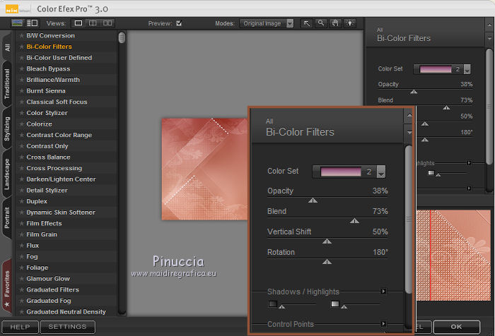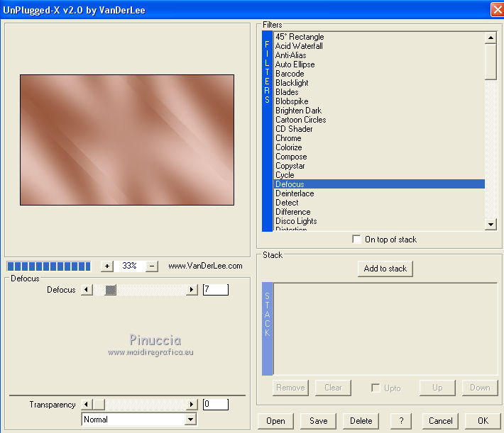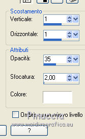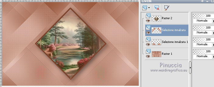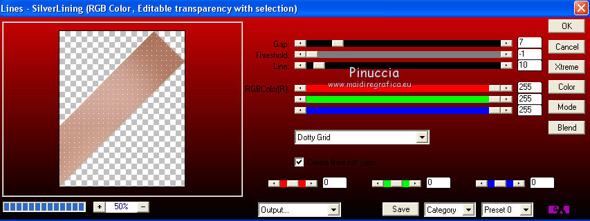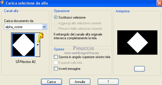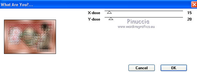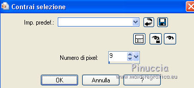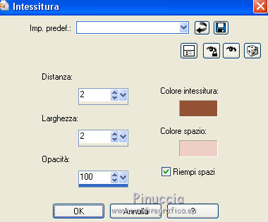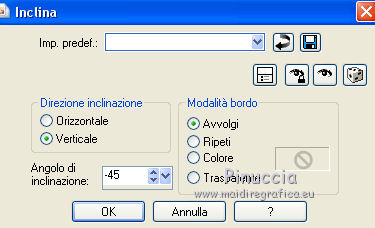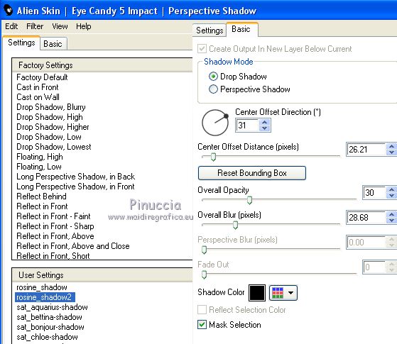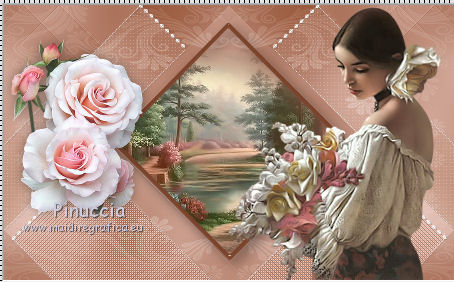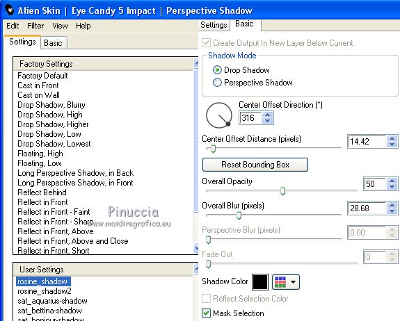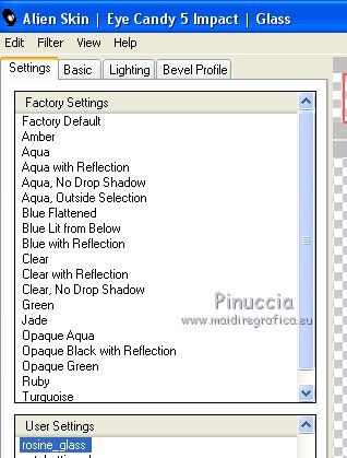 qui puoi trovare qualche risposta ai tuoi dubbi. Se l'argomento che ti interessa non è presente, ti prego di segnalarmelo. Questo tutorial è una creazione di Saturnella e non può essere copiato su altri siti nè essere offerto per il download. Lo stesso vale per la mia traduzione. E' anche proibito togliere il watermark dal materiale; rispettiamo il lavoro dei creatori di tubes, senza i quali non potremmo creare tutorials. Per tradurre questo tutorial, creato con X6, ho usato CorelX, ma può essere eseguito anche con le altre versioni di PSP. Dalla versione X4, il comando Immagine>Rifletti è stato sostituito con Immagine>Capovolgi in orizzontale, e il comando Immagine>Capovolgi con Immagine>Capovolgi in verticale. Nelle versioni X5 e X6, le funzioni sono state migliorate rendendo disponibile il menu Oggetti. Nel nuovo X7 sono tornati i comandi Immagine>Rifletti e Immagine>Capovolgi, ma con nuove funzioni. Vedi la scheda sull'argomento qui Occorrente: Materiale qui Grazie per i tubes Mtfp, e per la maschera Linda. (in questa pagina trovi i links ai loro siti). Filtri in caso di dubbi, ricorda di consultare la mia sezione filtri qui Filters Unlimited 2.0 qui Toadies - What are you qui AP 01 Innovations - Lines SilverLining qui Mehdi - Wavy Lab qui VanDerLee - Unplugged-X qui Nik Software - Color Efex Pro qui Simple - Blintz qui Alien Skin Eye Candy 5 Impact - Perspective Shadow, Glass qui I filtri Toadies e Simple si possono usare da soli o importati in Filters Unlimited (come fare vedi qui) Se un filtro fornito appare con questa icona ![]() non esitare a cambiare modalità di miscelatura e opacità secondo i colori utilizzati. Metti i preset Cliccando sul file una o due volte (a seconda delle tue impostazioni), automaticamente il preset si installerà nella cartella corretta. perchè uno o due clic vedi qui Apri la maschera in PSP e minimizzala con il resto del materiale. 1. Imposta il colore di primo piano con #edcec5, e il colore di sfondo con #945236. ![]() Apri alpha_rosine. Finestra>Duplica, o sulla tastiera maiuscola+D, per fare una copia. Chiudi l'originale. La copia, che sarà la base del tuo lavoro, non è vuota, ma contiene le selezioni salvate sul canale alfa. 2. Effetti>Plugins>Mehdi - Wavy Lab. Questo filtro lavora con i colori della paletta. Il primo è il colore di sfondo e il secondo il colore di primo piano, mantieni il terzo colore creato dal filtro. ![]() 3. Regola>Sfocatura>Sfocatura gaussiana - raggio 50. ![]() 4. Effetti>Effetti geometrici>Inclina. ![]() 5. Effetti>Plugins>VanDerLee - Unplugged-X - Defocus. ![]() Effetti>Effetti di bordo>Aumenta di più. 6. Effetti>Plugins>Simple - Blintz. Modifica>Ripeti Blintz. 7. Livelli>Duplica. Immagine>Rifletti. Abbassa l'opacità di questo livello al 50%. ![]() Livelli>Unisci>Unisci giù. Regola>Messa a fuoco>Accentua messa a fuoco. 8. Selezione>Carica/Salva selezione>Carica selezione da canale alfa. La selezione sélection#1 è subito disponibile. Devi soltanto cliccare Carica. ![]() Selezione>Innalza selezione a livello. Effetti>Plugins>AP 01 Innovations] - Lines SilverLining. ![]() Selezione>Deseleziona. 9. 6. Livelli>Duplica. Immagine>Rifletti. Livelli>Unisci>Unisci giù. 10. Selezione>Carica/Salva selezione>Carica selezione da canale alfa. Apri il menu delle selezioni e carica sélection#2. ![]() Livelli>Nuovo livello raster. Riempi con il colore scuro di sfondo.11. Selezione>Modifica>Contrai - 9 pixels. ![]() Premi sulla tastiera il tasto CANC ![]() 12. Apri il tube del paesaggio e vai a Modifica>Copia. Torna al tuo lavoro e vai a Modifica>Incolla come nuovo livello. Posiziona il tube nell'area selezionata.![]() 13. Selezione>Inverti. Premi sulla tastiera il tasto CANC. Selezione>Deseleziona. 14. Attiva il livello sottostante (la cornice). Effetti>Plugins>Alien Skin Eye Candy 5 Impact - Glass. seleziona il preset rosine_glass e ok. ![]() Questi i settaggi che, in caso di problemi con il preset, puoi impostare manualmente. ![]() Attiva il livello superiore. Livelli>Unisci>Unisci giù. 15. Effetti>Plugins>Alien Skin Eye Candy 5 Impact - Perspective Shadow. Seleziona il preset rosine_shadow e ok. ![]() 16. Attiva il livello di sfondo. Selezione>Carica/Salva selezione>Carica selezione da canale alfa. Apri il menu delle selezioni e carica sélection#3. ![]() Selezione>Innalza selezione a livello. 17. Effetti>Effetti di trama>Intessitura: colore intessitura: colore scuro di sfondo - colore spazio: colore chiaro di primo piano. ![]() Selezione>Deseleziona. 18. Livelli>Duplica. Immagine>Rifletti. Livelli>Unisci>Unisci giù. 19. Attiva il livello "selezione innalzata". ![]() Imposta il colore di primo piano con il colore bianco #ffffff. Livelli>Nuovo livello raster. Riempi con il colore bianco.20. Livelli>Nuovo livello maschera>Da immagine. Apri il menu sotto la finestra di origine e vedrai la lista dei files aperti. Seleziona la maschera LF-Mask-179, con i seguenti settaggi. ![]() Effetti>Effetti di bordo>Aumenta. Livelli>Unisci>Unisci gruppo. 21. Effetti>Effetti 3D>Sfalsa ombra, colore bianco. ![]() Cambia la modalità di miscelatura di questo livello in Luce diffusa, o come preferisci. 22. Apri il tube déco, e vai a Modifica>Copia. Torna al tuo lavoro e vai a Modifica>Incolla come nuovo livello. Non spostarlo. E' al suo posto. 23. Effetti>Effetti 3D>Sfalsa ombra, colore nero. ![]() 24. Attiva il livello superiore. Apri il tube delle rose di Mtfp, e vai a Modifica>Copia. Torna al tuo lavoro e vai a Modifica>Incolla come nuovo livello. Immagine>Ridimensiona, al 60%, tutti i livelli non selezionato. Spostalo a sinistra.Regola>Messa a fuoco>Metti a fuoco. 25. Effetti>Effetti 3D>Sfalsa ombra, colore nero. ![]() 26. Apri il tube della donna di mtfp, e vai a Modifica>Copia. Torna al tuo lavoro e vai a Modifica>Incolla come nuovo livello. Immagine>Rifletti. Spostalo a destra.![]() 27. Effetti>Plugins>Alien Skin Eye Candy 5 Impact - Perspective Shadow. Seleziona il preset rosine_shadow2 e ok. ![]() 28. Chiudi i livelli dei fiori, 