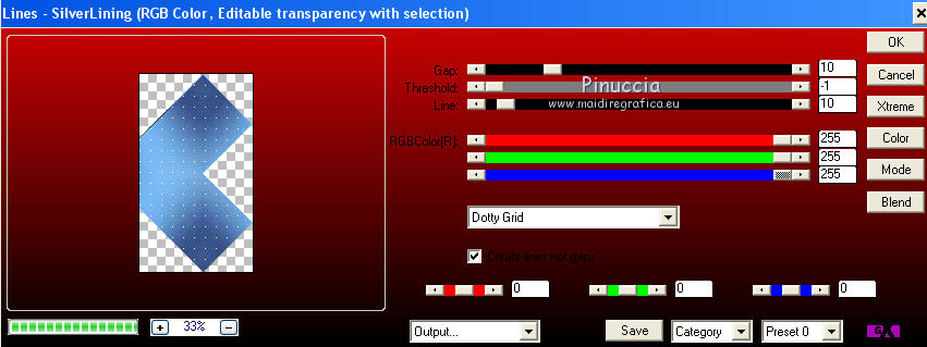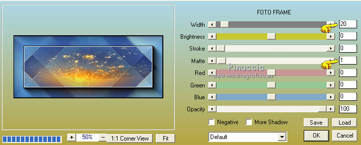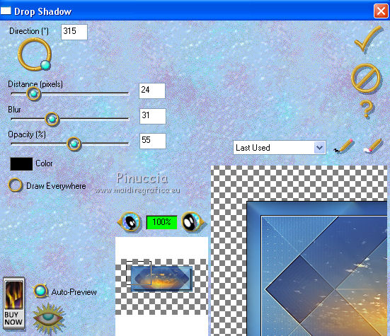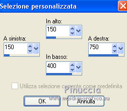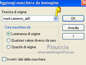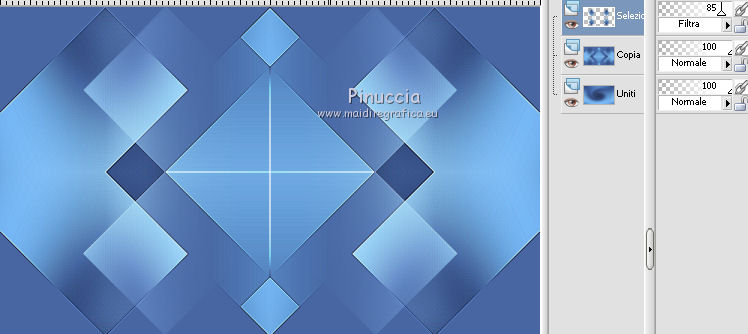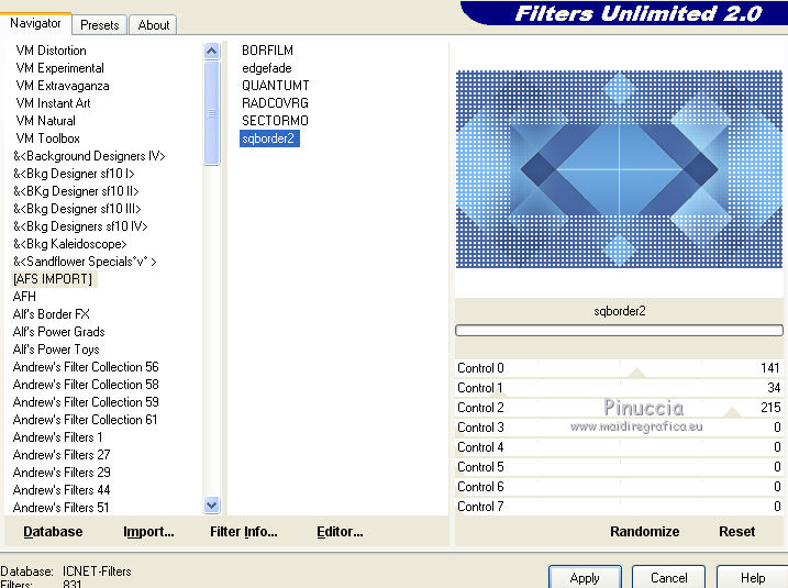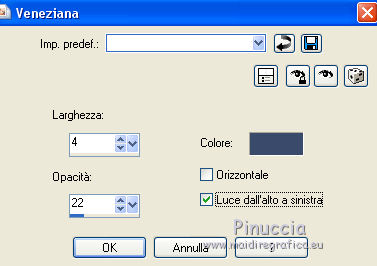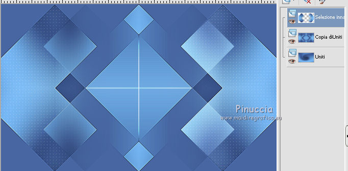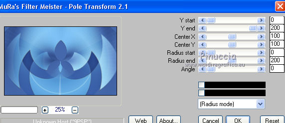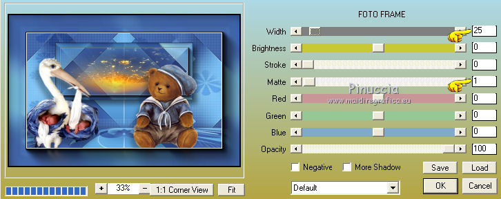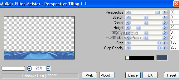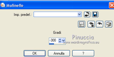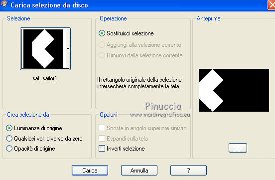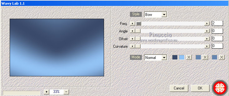 qui puoi trovare qualche risposta ai tuoi dubbi. Se l'argomento che ti interessa non è presente, ti prego di segnalarmelo. Questo tutorial è una creazione di Saturnella e non può essere copiato su altri siti nè essere offerto per il download. Lo stesso vale per la mia traduzione. E' anche proibito togliere il watermark dal materiale; rispettiamo il lavoro dei creatori di tubes, senza i quali non potremmo creare tutorials. Il tutorial è stato scritto con CorelX16, ma può essere eseguito anche con le altre versioni di PSP. Secondo la versione utilizzata (anteriore a PSP X) potresti ottenere dei risultati differenti. Vedi la mia scheda riguardante le funzioni Rifletti>Capovolgi nelle nuove versioni di PSP qui Per tradurre questo tutorial ho usato PSP X. Occorrente: Materiale qui Per i tubes grazie Luna e Schiwa. Per la maschera grazie Cameron. (in questa pagina trovi i links ai loro siti). Filtri in caso di dubbi, ricorda di consultare la mia sezione filtri qui Filters Unlimited 2.0 qui Mehdi - Wavy Lab 1.1 qui Mura's Meister - Perspective Tiling qui Mura's Meister - Pole Transform qui AAA Frames - Foto Frame qui Ap 01 [Innovations] - Lines SilverLining qui Eye Candy 3 - Drop Shadow qui Simple qui ![]() non esitare a cambiare modalità di miscelatura e opacità secondo i colori utilizzati. Metti la selezione nella cartella Selezioni. Apri la maschera in PSP e minimizzala con il resto del materiale. 1. Imposta il colore di primo piano con il colore chiaro #92c2f4, e il colore di sfondo con il colore scuro #3a4a6a. ![]() Apri una nuova immagine trasparente 900 x 550 pixels. Effetti>Plugins>Mehdi - Wavy Lab 1.1. Questo filtro lavora con i colori impostati nella paletta dei materiali. Il primo è il colore di sfondo, il secondo è il colore di primo piano; mantieni gli ultimi due colori creati dal filtro. ![]() 2. Effetti>Effetti di distorsione>Mulinello. ![]() 3. Livelli>Duplica. Immagina>Rifletti. Immagine>Capovolgi. Cambia la modalità di miscelatura di questo livello in Sovrapponi, e abbassa l'opacità al 50%. 4. Livelli>Unisci>Unisci visibile. Livelli>Duplica. 5. Effetti>Plugins>Simple - Pizza Slice Mirror. Modifica>Ripeti Pizza Slice Mirror. 6. Effetti>Plugins>Simple - Blintz. Effetti>Effetti di bordo>Aumenta di più. 7. Effetti>Plugins>Simple - Top Left Mirror. 8. Selezione>Carica/Salva selezione>Carica selezione da disco. Cerca e carica la selezione sat_sailor1. ![]() Selezione>Innalza selezione a livello. 9. Effetti>Effetti di trama>Veneziana - colore scuro di sfondo. ![]() Selezione>Deseleziona. 10. Livelli>Duplica. Immagine>Rifletti. Livelli>Unisci>Unisci giù. 11. Effetti>Effetti di immagine>Motivo unico. ![]() Cambia la modalità di miscelatura di questo livello in Filtra, e abbassa l'opacità all'85%. ![]() 12. Attiva il livello sottostante. Selezione>Carica/Salva selezione>Carica selezione da disco. Carica nuovamente la selezione sat_sailor1. ![]() Selezione>Innalza selezione a livello. 13. Effetti>Plugins>AP 01 [Innovations] - Lines SilverLining. ![]() Selezione>Deseleziona. Livelli>Duplica. Immagine>Rifletti. 14. Attiva il livello superiore. Livelli>Unisci>Unisci giù - 2 volte. Dovresti avere questo. ![]() 15. Livelli>Unisci>Unisci visibile. Livelli>Duplica. Effetti>Plugins>Filters Unlimited 2.0 - AFS IMPORT - sqborder2, con i settaggi standard. ![]() Cambia la modalità di miscelatura di questo livello in Luce diffusa, e abbassa l'opacità al 60%, o secondo i tuoi colori. Livelli>Unisci>Unisci visibile. 16. Livelli>Duplica. Effetti>Plugins>Mura's Meister’s - Pole transform. ![]() 17. Effetti>Plugins>Mura Meister’s - Perspective tiling. ![]() 18. Effetti>Effetti 3D>Sfalsa ombra, con il colore scuro. ![]() 19. Attiva il livello di sfondo. Attiva lo strumento Selezione ![]() clicca sull'icona Selezione personalizzata ![]() e imposta i seguenti settaggi. ![]() Selezione>Innalza selezione a livello. 20. Livelli>Nuovo livello raster. Apri il tube del paesaggio di Luna e vai a Modifica>Copia. Torna al tuo lavoro e vai a Modifica>Incolla nella selezione. Livelli>Unisci>Unisci giù. 21. Effetti>Plugins>AAA Frames - Foto Frame. ![]() Selezione>Deseleziona. 22. Effetti>Effetti di immagine>Scostamento. ![]() 23. Effetti>Plugins>Eye Candy 3.1 - Drop Shadow. ![]() 24. Attiva il livello di sfondo. Livelli>Nuovo livello raster. Riempi con il colore chiaro.25. Livelli>Nuovo livello maschera>Da immagine. Apri il menu sotto la finestra di origine e vedrai la lista dei files aperti. Seleziona la maschera Cameron_air6, con i seguenti settaggi. ![]() Effetti>Effetti di bordo>Aumenta di più. Livelli>Unisci>Unisci gruppo. 26. Effetti>Effetti di immagine>Motivo unico, con i settaggi standard. ![]() 27. Effetti>Effetti 3D>Sfalsa ombra, colore nero. ![]() Cambia la modalità di miscelatura di questo livello in Moltiplica, e abbassa l'opacità al 63%. 28. Attiva il livello superiore. Apri il tube della cicogna di Schiwa e vai a Modifica>Copia. Torna al tuo lavoro e vai a Modifica>Incolla come nuovo livello. Immagine>Ridimensiona, all'80%, tutti i livelli non selezionato. Sposta il tube a sinistra.29. Effetti>Effetti 3D>Sfalsa ombra, colore nero. ![]() 30. Apri il tube dell'orsetto e vai a Modifica>Copia. Torna al tuo lavoro e vai a Modifica>Incolla come nuovo livello. Sposta il tube a destra.31. Effetti>Effetti 3D>Sfalsa ombra, con i settaggi precedenti. 32. Attiva il livello di sfondo e vai a Modifica>Copia. Immagine>Aggiungi bordatura, 1 pixel, simmetriche, con il colore scuro. Immagine>Aggiungi bordatura, 3 pixels, simmetriche, con il colore chiaro. Immagine>Aggiungi bordatura, 1 pixel, simmetriche, con il colore chiaro. Immagine>Aggiungi bordatura, 50 pixels, simmetriche, con il colore bianco. 33. Attiva lo strumento Bacchetta magica ![]() e clicca nel bordo bianco per selezionarlo. Modifica>Incolla nella selezione. 34. Regola>Sfocatura>Sfocatura gaussiana - raggio 30. ![]() 35. Effetti>Effetti artistici>Smalto. ![]() 36. Selezione>Inverti. Effetti>Effetti 3D>Sfalsa ombra, colore nero. ![