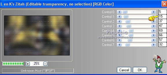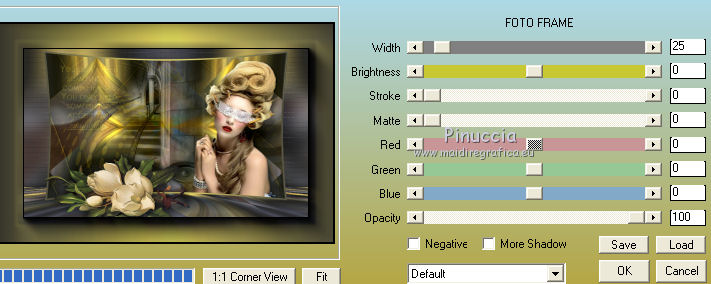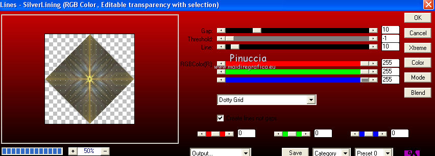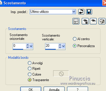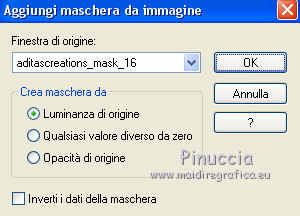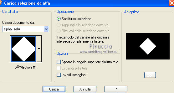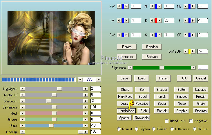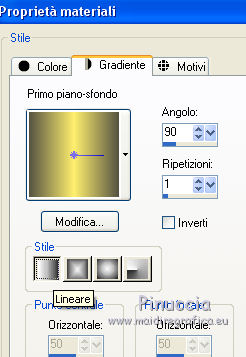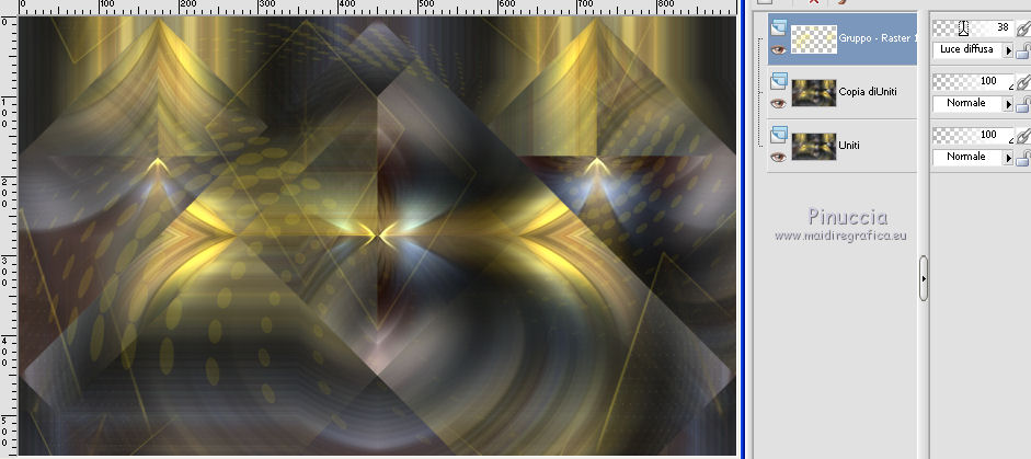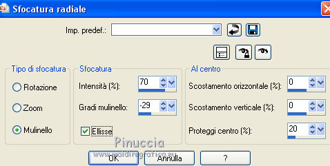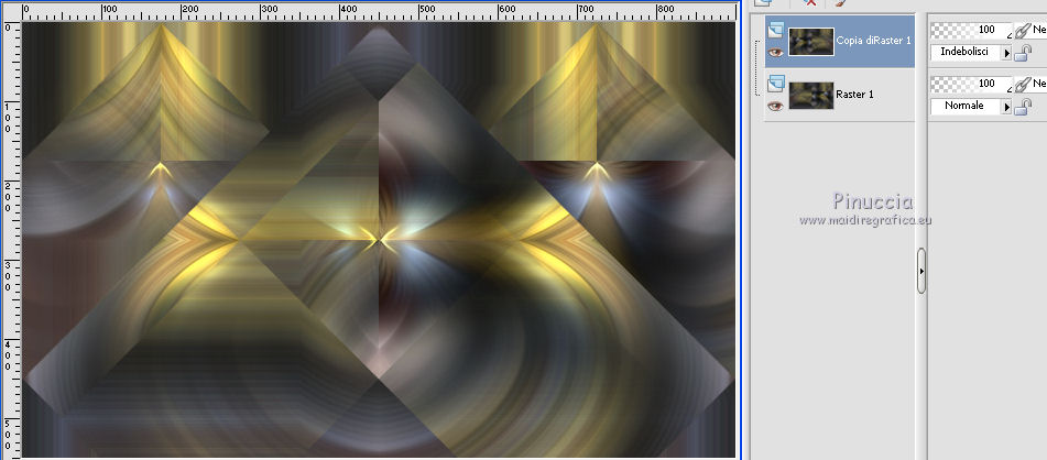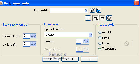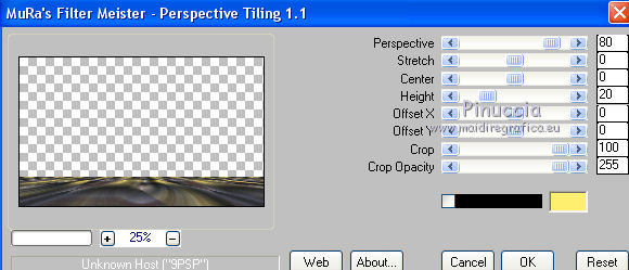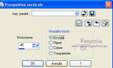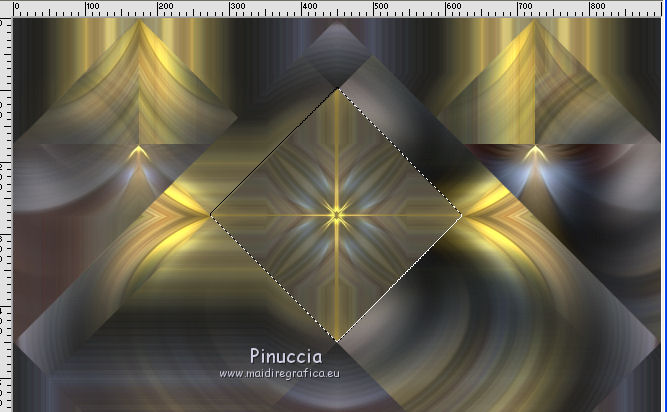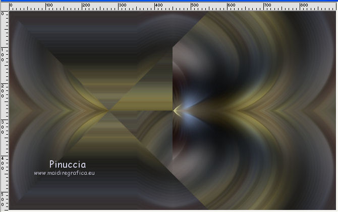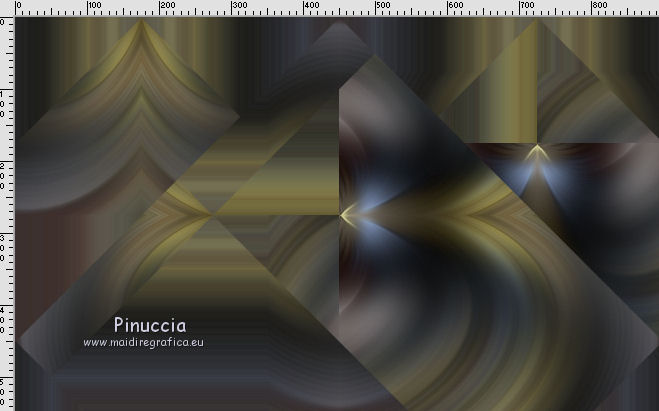 qui puoi trovare qualche risposta ai tuoi dubbi. Se l'argomento che ti interessa non è presente, ti prego di segnalarmelo. Questo tutorial è una creazione di Saturnella e non può essere copiato su altri siti nè essere offerto per il download. Lo stesso vale per la mia traduzione. E' anche proibito togliere il watermark dal materiale; rispettiamo il lavoro dei creatori di tubes, senza i quali non potremmo creare tutorials. Per tradurre questo tutorial, creato con PSP16, ho usato CorelX, ma può essere eseguito anche con le altre versioni di PSP. Dalla versione X4, il comando Immagine>Rifletti è stato sostituito con Immagine>Capovolgi in orizzontale, e il comando Immagine>Capovolgi con Immagine>Capovolgi in verticale. Nelle versioni X5 e X6, le funzioni sono state migliorate rendendo disponibile il menu Oggetti. Nel nuovo X7 sono tornati i comandi Immagine>Rifletti e Immagine>Capovolgi, ma con nuove funzioni. Vedi la scheda sull'argomento qui Occorrente: Materiale qui Grazie: per i tubes Yoka, Luz Cristina, Angel Keeper, Patries e per le maschera Adita. (in questa pagina trovi i links ai loro siti). Filtri in caso di dubbi, ricorda di consultare la mia sezione filtri qui Filters Unlimited 2.0 qui AP 01 Innovations - Lines SilverLining qui Mura's Meister - Perspective Tiling qui Graphics Plus - Vertical mirror qui Simple - Pizza Slice mirror, Blintz qui L&K's - L&K Zitah qui AAA Frames - Foto Frame /AAA Filters - Custom qui I filtri Simple e Graphics Plus si possono usare da soli o importati in Filters Unlimited (come fare vedi qui) Se un filtro fornito appare con questa icona ![]() non esitare a cambiare modalità di miscelatura e opacità secondo i colori utilizzati. Nelle ultime versioni di PSP non c'è il gradiente di primo piano/sfondo (Corel_06_029) Puoi usare i gradienti delle versioni precedenti. Trovi qui i gradienti Corel X. Apri la maschera in PSP e minimizzala con il resto del materiale. 1. Imposta il colore di primo piano con il colore scuro #565442, e il colore di sfondo con il colore chiaro #ffef6f. ![]() Apri alpha_sally. Finestra>Duplica, o sulla tastiera maiuscola+D, per fare una copia. ![]() Chiudi l'originale. La copia, che sarà la base del tuo lavoro, non è vuota, ma contiene le selezioni salvate sul canale alfa. 2. Selezione>Seleziona tutto. Apri l'immagine fractale e vai a Modifica>Copia. Torna al tuo lavoro e vai a Modifica>Incolla nella selezione. Selezione>Deseleziona. 3. Effetti>Effetti di riflesso>Specchio rotante. ![]() 4. Effetti>Plugins>Graphics Plus - Vertical mirror, con i settaggi standard. ![]() 5. Effetti>Effetti di immagine>Motivo unico, con i settaggi standard. ![]() 6. Regola>Sfocatura>Sfocatura radiale. ![]() Effetti>Effetti di bordo>Aumenta. 7. Effetti>Plugins>Simple - Pizza Slice Mirror. Risultato del filtro, che lavora senza finestra ![]() 8. Effetti>Plugins>Simple - Blintz. Risultato del filtro che lavora senza finestra ![]() 9. Livelli>Duplica. Immagine>Rifletti. Cambia la modalità di miscelatura di questo livello in Indebolisci, o altro. ![]() Livelli>Unisci>Unisci visibile. 10. Livelli>Duplica. Selezione>Carica/Salva selezione>Carica selezione da canale alfa. La selezione sélection 1 è subito disponibile. Devi soltanto cliccare Carica. ![]() Selezione>Innalza selezione a livello. Effetti>Plugins>Simple - Pizza Slice Mirror. ![]() 11. Effetti>Plugins>AP 01 Innovations - Lines SilverLining. ![]() 12. Selezione>Modifica>Seleziona bordature selezione. Riempi la selezione con il colore chiaro.Selezione>Deseleziona. 13. Effetti>Effetti di immagine>Motivo unico. ![]() 14. Effetti>Effetti geometrici>Prospettiva verticale. ![]() Cambia la modalità di miscelatura di questo livello in Luce diffusa, o altro, e abbassa l'opacità al 60%. ![]() 15. Effetti>Effetti di immagine>Motivo unico, Intermittente diagonale. ![]() 16. Effetti>Effetti 3D>Sfalsa ombra. ![]() Livelli>Unisci>Unisci giù. 17. Livelli>Nuovo livello raster. Riempi con il colore chiaro.Livelli>Nuovo livello maschera>Da immagine. Apri il menu sotto la finestra di origine e vedrai la lista dei files aperti. Seleziona la maschera aditascreations_mask_16. ![]() Effetti>Effetti di bordo>Aumenta. Livelli>Unisci>Unisci gruppo. Immagine>Rifletti. Cambia la modalità di miscelatura di questo livello in Luce diffusa, o altro, e abbassa l'opacità al 38%. ![]() 18. Effetti>Effetti 3D>Sfalsa ombra. ![]() 19. Apri il tube della scala di Angel Keeper e vai a Modifica>Copia. Torna al tuo lavoro e vai a Modifica>Incolla come nuovo livello. Cambia la modalità di miscelatura di questo livello in Luminanza (esistente). 20. Apri il tube della donna di Luz Cristina e vai a Modifica>Copia. Torna al tuo lavoro e vai a Modifica>Incolla come nuovo livello. Immagine>Ridimensiona, al 90%, tutti i livelli non selezionato. Regola>Messa a fuoco>Metti a fuoco. Sposta il tube a destra.21. Effetti>Effetti 3D>Sfalsa ombra. ![]() 22. Chiudi il livello di sfondo. Livelli>Unisci>Unisci visibile. 23. Effetti>Plugins>AAA Filters - Custom, clicca su Landscape e ok. ![]() Immagine>Ridimensiona, all'85%, tutti i livelli non selezionato. 24. Effetti>Effetti di immagine>Scostamento. ![]() 25. Selezione>Seleziona tutto. Selezione>Mobile. Selezione>Immobilizza. Selezione>Modifica>Seleziona bordature selezione, con i settaggi precedenti. ![]() Passa il colore di primo piano a Gradiente di primo piano/sfondo, stile Lineare. ![]() Riempi la selezione con il gradiente.Effetti>Effetti di bordo>Aumenta. Selezione>Deseleziona. 26. Effetti>Effetti di distorsione>Distorsione lente. ![]() 27. Riapri e attiva il livello di sfondo. Livelli>Duplica. Effetti>Plugins>Mura's Meister - Perspective Tiling. ![]() Effetti>Effetti di bordo>Aumenta. ![]() 28. Attiva il livello sottostante. Regola>Sfocatura>Sfocatura gaussiana - raggio 20. ![]() Effetti>Plugins>L&K's - L&K Zitah. ![]() Ripeti il Filtro Zitah una seconda volta con gli stessi settaggi. 29. Attiva il livello superiore. Apri il tube dei fiori di Patries e vai a Modifica>Copia. Torna al 