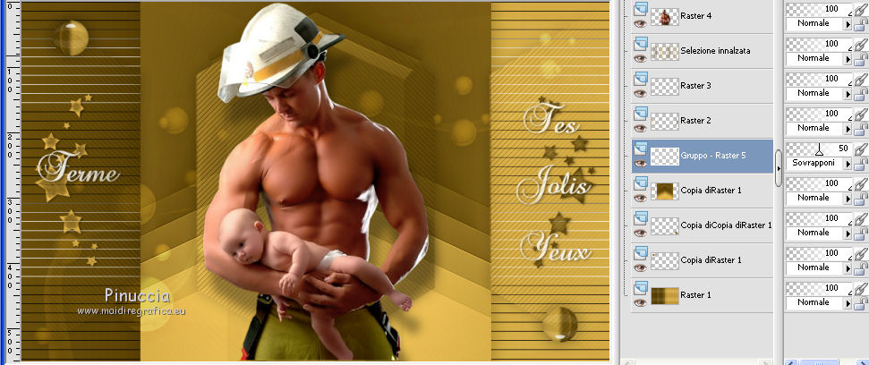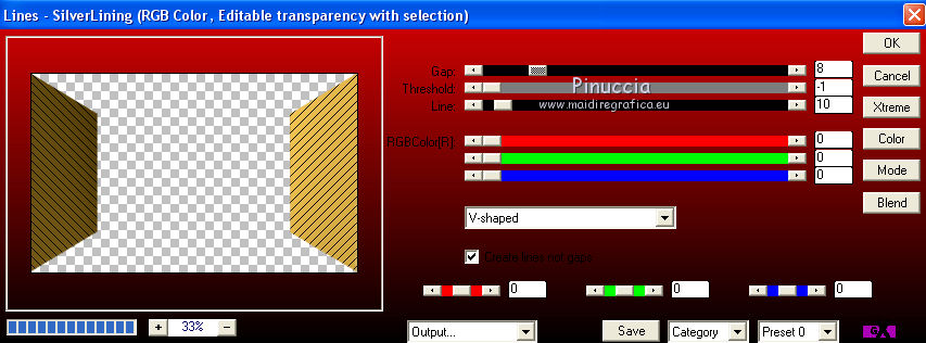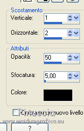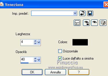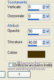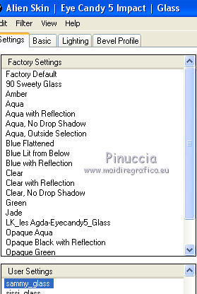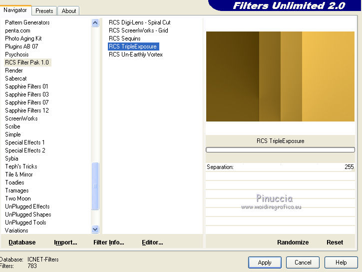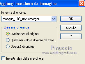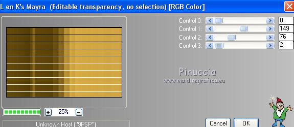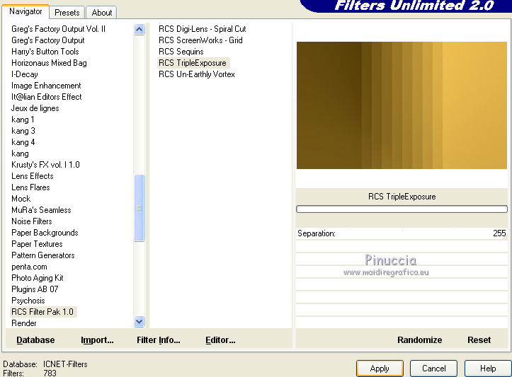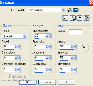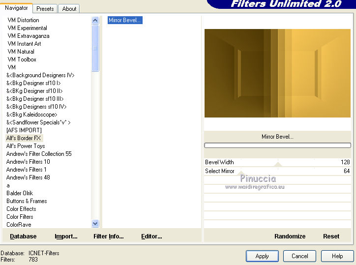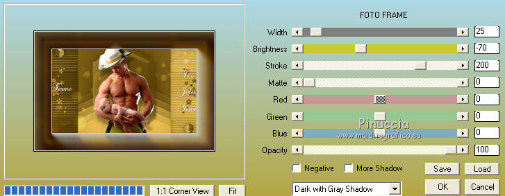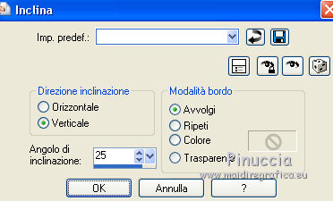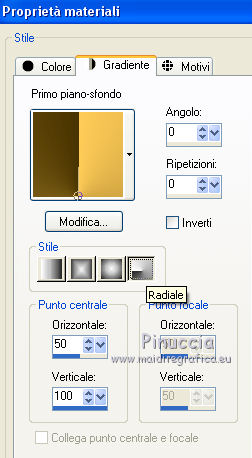 qui puoi trovare qualche risposta ai tuoi dubbi. Se l'argomento che ti interessa non è presente, ti prego di segnalarmelo. Questo tutorial è una creazione di Saturnella e non può essere copiato su altri siti nè essere offerto per il download. Lo stesso vale per la mia traduzione. E' anche proibito togliere il watermark dal materiale; rispettiamo il lavoro dei creatori di tubes, senza i quali non potremmo creare tutorials. Per tradurre questo tutorial, creato con Corel2018, ho usato CorelX, ma può essere eseguito anche con le altre versioni di PSP. Dalla versione X4, il comando Immagine>Rifletti è stato sostituito con Immagine>Capovolgi in orizzontale, e il comando Immagine>Capovolgi con Immagine>Capovolgi in verticale. Nelle versioni X5 e X6, le funzioni sono state migliorate rendendo disponibile il menu Oggetti. Nel nuovo X7 sono tornati i comandi Immagine>Rifletti e Immagine>Capovolgi, ma con nuove funzioni. Vedi la scheda sull'argomento qui Occorrente: Materiale qui Grazie: per il tube Mina e per la maschera Franie Margot. (in questa pagina trovi i links ai loro siti). Filtri in caso di dubbi, ricorda di consultare la mia sezione filtri qui Filters Unlimited 2.0 qui RCS Filter Pack - Triple Exposure qui Alf's Border FX - Mirror Bevel qui AP 01 [Innovations] - Lines SilverLining qui Graphics Plus - Horizontal Mirror qui L&K's - L&K Mayra qui Alien Skin Eye Candy 5 Impact - Glass qui Simple - 4 Way Average qui AAA Frames - Foto Frame qui I filtri RCS, Alf's Border FX, Simple e Graphics Plus si possono usare da soli o importati in Filters Unlimited (come fare vedi qui) Se un filtro fornito appare con questa icona ![]() non esitare a cambiare modalità di miscelatura e opacità secondo i colori utilizzati. Nelle ultime versioni di PSP non c'è il gradiente di primo piano/sfondo (Corel_06_029) Puoi usare i gradienti delle versioni precedenti. Trovi qui i gradienti Corel X. Metti il preset Cliccando sul file una o due volte (a seconda delle tue impostazioni), automaticamente il preset si installerà nella cartella corretta. perchè uno o due clic vedi qui Se preferisci, puoi importare direttamente il preset nel corso del tutorial Come fare vedi la scheda del filtro Eye Candy qui Apri la maschera in PSP e minimizzala con il resto del materiale. 1. Imposta il colore di primo piano con il colore chiaro #ffcc58, e il colore di sfondo con il colore scuro #493400. ![]() Passa il colore di primo piano a Gradiente di primo piano/sfondo, stile Radiale. ![]() 2. Apri alpha_sammy. Finestra>Duplica (o sulla tastiera maiuscola+D) per fare una copia. ![]() Chiudi l'originale. La copia, che sarà la base del tuo lavoro, non è vuota, ma contiene una selezione salvata sul canale alfa. Riempi l'immagine trasparente con il gradiente.2. Effetti>Plugins>Filters Unlimited 2.0 - RCS Filter Pack - Triple Exposure, con i settaggi standard. ![]() Ripeti il filtro una seconda volta. ![]() Effetti>Effetti di bordo>Aumenta. 3. Effetti>Plugins>Filters Unlimited 2.0 - Alf's Border FX - Mirror Bevel, con i settaggi standard. ![]() 4. Selezione>Carica/Salva selezione>Carica selezione da canale alfa. La selezione sélection#1 è subito disponibile. Devi soltanto cliccare Carica. ![]() Selezione>Innalza selezione a livello. Effetti>Plugins>AP 01 Innovations - Lines SilverLining. ![]() 5. Effetti>Effetti 3D>Sfalsa ombra. ![]() Selezione>Deseleziona. 6. Effetti>Effetti di immagine>Motivo unico. ![]() 7. Attiva il livello inferiore. Livelli>Duplica. Immagine>Ruota per gradi - 90 gradi a destra. ![]() 8. Immagine>Ridimensiona, al 97%, tutti i livelli non selezionato. 9. Effetti>Effetti geometrici>Inclina. ![]() 10. Effetti>Effetti 3D>Sfalsa ombra, con il tuo colore scuro. ![]() 11. Effetti>Plugins>Graphics Plus - Horizontal Mirror. ![]() 12. Apri il tube déco e vai a Modifica>Copia. Torna al tuo lavoro e vai a Modifica>Incolla come nuovo livello. E' al suo posto. 13. Effetti>Effetti 3D>Sfalsa ombra. ![]() 14. Apri il tube texte e vai a Modifica>Copia. Torna al tuo lavoro e vai a Modifica>Incolla come nuovo livello. Effetti>Effetti 3D>Sfalsa ombra, con i settaggi precedenti. 15. Attiva il livello di sfondo. Effetti>Plugins>L&K's - L&K Mayra, con i settaggi standard. ![]() 15. Sempre sul livello di sfondo: Livelli>Duplica. Effetti>Effetti geometrici>Cerchio. ![]() Immagine>Ridimensiona, al 10%, tutti i livelli non selezionato. 16. Effetti>Plugins>Alien Skin Eye Candy 5 Impact - Glass. Seleziona il preset sammy_glass e ok. ![]() 17. Effetti>Effetti di immagine>Scostamento. ![]() 18. Effetti>Effetti 3D>Sfalsa ombra. ![]() 19. Livelli>Duplica. Immagine>Rifletti. Immagine>Capovolgi. 20. Attiva il livello superiore. Apri il tube dell'uomo di Mina e vai a Modifica>Copia. Torna al tuo lavoro e vai a Modifica>Incolla come nuovo livello. Immagine>Ridimensiona, 1 volta al 70% e una volta al 90%, tutti i livelli non selezionato. Regola>Messa a fuoco>Metti a fuoco. 21. Effetti>Effetti 3D>Sfalsa ombra. ![]() 22. Attiva il livello copia di Raster 1. Imposta il colore di primo piano con il colore bianco. Livelli>Nuovo livello raster. Riempi il livello con il colore bianco.Livelli>Nuovo livello maschera>Da immagine. Apri il menu sotto la finestra di origine e vedrai la lista dei files aperti. Seleziona la maschera masque_103_franiemargot ![]() Livelli>Unisci>Unisci gruppo. Cambia la modalità di miscelatura di questo livello in Sovrapponi, o altro, e abbassa l'opacità al 50%. ![]() 23. Attiva il livello di sfondo. Modifica>Copia. Immagine>Aggiungi bordatura, 1 pixel, simmetriche, colore scuro. Immagine>Aggiungi bordatura, 3 pixels, simmetriche, colore chiaro. Immagine>Aggiungi bordatura, 1 pixel, simmetriche, colore scuro. Immagine>Aggiungi bordatura, 15 pixels, simmetriche, colore chiaro. 24. Attiva lo strumento Bacchetta magica ![]() e clicca nel bordo chiaro di 15 pixels per selezionarlo. Effetti>Effetti di trama>Ciottoli. ![]() Selezione>Deseleziona. 25. Immagine>Aggiungi bordatura, 1 pixel, simmetriche, colore scuro. 26. Selezione>S