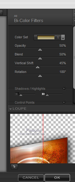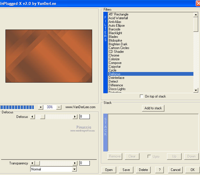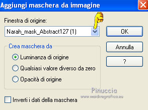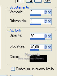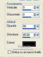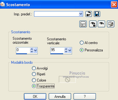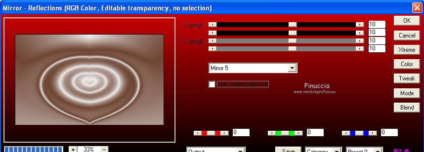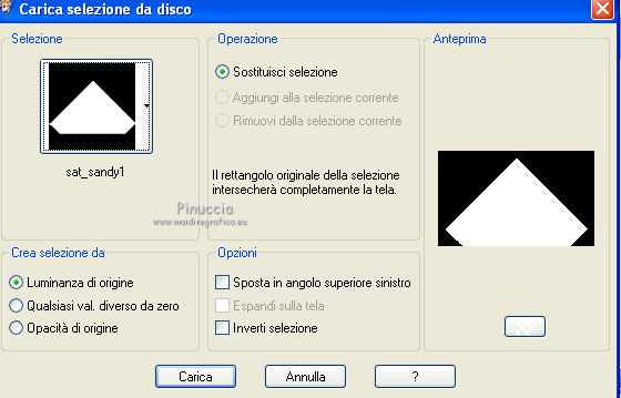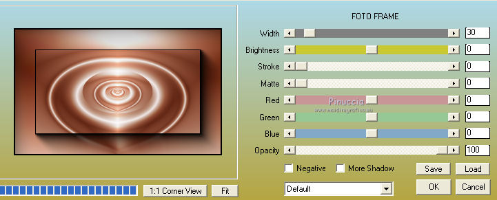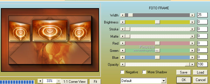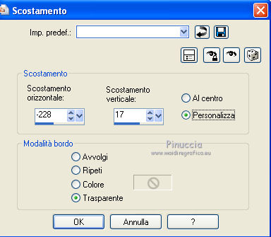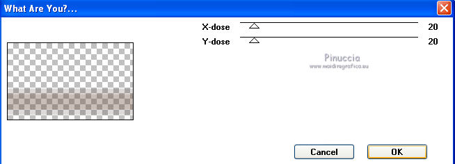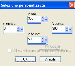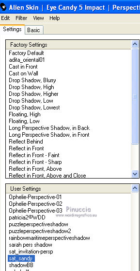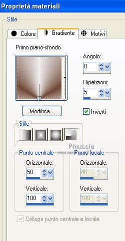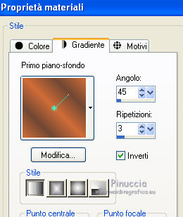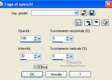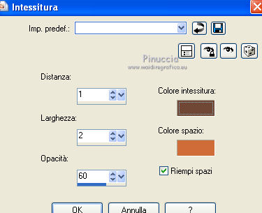 qui puoi trovare qualche risposta ai tuoi dubbi. Se l'argomento che ti interessa non è presente, ti prego di segnalarmelo. Questo tutorial è una creazione di Saturnella e non può essere copiato su altri siti nè essere offerto per il download. Lo stesso vale per la mia traduzione. E' anche proibito togliere il watermark dal materiale; rispettiamo il lavoro dei creatori di tubes, senza i quali non potremmo creare tutorials. Questo tutorial è stato creato con PSP 12, ma può essere eseguito anche con le altre versioni di PSP. Per tradurlo ho usato PSP X. Occorrente: Materiale qui Il tube della donna è di Thafs. Grazie a tutti per il vostro magnifico lavoro. (in questa pagina trovi i links ai loro siti). Filtri in caso di dubbi, ricorda di consultare la mia sezione filtri qui AP01 [Innovations] - Mirror Reflections qui AAA Frames - Foto Frame qui Simple qui VanDerLee - Unplugged X qui Andromeda - Perspective qui Toadies - What are you qui Alien Skin Eye Candy 5 Impact - Perspective Shadow qui Nik Software - Color Efex Pro qui ![]() non esitare a cambiare modalità di miscelatura e opacità secondo i colori utilizzati. Metti il preset sat_sandy nella cartella del filtro. Con un doppio clic sul file il preset sarà automaticamente installato nella cartella corretta. Metti la selezione nella cartella Selezioni. Apri il pennello "penello" in PSP ed esportalo come Pennello personalizzato. Apri la maschera "narah_mask_Abstract127(1)" in PSP e minimizzala con il resto del materiale. 1. Imposta il colore di primo piano con #704734, e il colore di sfondo con #efedee. ![]() Passa il colore di primo piano a Gradiente, stile Radiale. ![]() 2. Apri una nuova immagine trasparente 900 x 550 pixels, e riempila con il gradiente.3. Livelli>Duplica. Effetti>Effetti di distorsione>Mulinello ![]() Cambia la modalità di miscelatura di questo livello in Luce netta. 4. Effetti>Plugins>AP91 [Innovations] - Mirror Reflections. ![]() 5. Effetti>Effetti di riflesso>Fuga di specchi. ![]() 6. Livelli>Unisci>Unisci visibile. 7. Effetti>Plugins>AAA Frames - Foto Frame. ![]() 8. Livelli>Nuovo livello raster. Attiva lo strumento Pennello ![]() cerca e seleziona il pennello che hai esportato prima di cominciare, ![]() e applicalo nell'angolo in basso a sinistra, cliccando con il tasto destro del mouse, per usare il colore chiaro di sfondo. Livelli>Duplica. Immagine>Rifletti. Immagine>Capovolgi. Livelli>Unisci>Unisci giù. Cambia la modalità di miscelatura di questo livello in Indebolisci. 9. Apri il tube di Guismo calguisfleur31012012. Attiva il livello centrale (il mist) e vai a Modifica>Copia. non chiuderlo, perchè ti servirà ancora Torna al tuo lavoro e vai a Modifica>Incolla come nuovo livello. 10. Immagine>Ridimensiona, all'80%, tutti i livelli non selezionato. Spostalo in alto a sinistra.Effetti>Effetti di bordo>Aumenta. Cambia la modalità di miscelatura di questo livello in Sovrapponi, e abbassa l'opacità al 70% (secondo i tuoi colori). 11. Livelli>Duplica. Immagine>Rifletti. Immagine>Capovolgi. Immagine>Ridimensiona, all'80%, tutti i livelli non selezionato. Sposta questo tube nell'angolo in basso a destra.Cambia la modalità di miscelatura di questo livello in Luce diffusa, e riporta l'opacità a 100 (secondo i tuoi colori). ![]() 12. Immagine>Aggiungi bordatura, 1 pixel, simmetriche, con il colore nero. Minimizza l'immagine per il momento. 13. Imposta il colore di primo piano con #d06c38. Passa il colore di primo piano a Gradiente, stile Lineare. ![]() Apri una nuova immagine trasparente 900 x 550 pixels, e riempila con il gradiente.15. Effetti>Plugins>Simple - Blintz. Modifica>Ripeti Blintz. 16. Effetti>Plugins>VanDerLee - Unplugged X - Defocus. ![]() 17. Effetti>Effetti di bordo>Aumenta di più. 18. Livelli>Duplica. Immagine>Rifletti. Abbassa l'opacità di questo livello al 50%. Livelli>Unisci>Unisci giù. 19. Regola>Messa a fuoco>Accentua messa a fuoco. 20. Selezione>Carica/Salva selezione>Carica selezione da disco. Cerca e carica la selezione sat_sandy1. ![]() Selezione>Innalza selezione a livello. Selezione>Deseleziona. 21. Effetti>Effetti di trama>Intessitura. ![]() 22. Effetti>Effetti 3D>Sfalsa ombra. ![]() 23. Selezione>Carica/Salva selezione>Carica selezione da disco. Carica nuovamente la selezione sat_sandy1. ![]() Attiva nuovamente il tube di Guismo e vai a Modifica>Copia. Torna al tuo lavoro e vai a Modifica>Incolla come nuovo livello. Posiziona il tube nell'area selezionata.Selezione>Inverti. Premi sulla tastiera il tasto CANC. Selezione>Deseleziona. 24. Cambia la modalità di miscelatura di questo livello in Luce netta, e abbassa l'opacità al 75%. Effetti>Effetti di bordo>Aumenta. 25. Livelli>Unisci>Unisci visibile. 26. Attiva l'immagine che hai lasciato in attesa al punto 12 e vai a Modifica>Copia. Torna al tuo lavoro e vai a Modifica>Incolla come nuovo livello. 27. Immagine>Ridimensiona, al 40%, tutti i livelli non selezionato. Regola>Messa a fuoco>Accentua messa a fuoco. 28. Effetti>Effetti 3D>Sfalsa ombra, con i settaggi precedenti. 29. Effetti>Effetti di immagine>Scostamento. ![]() 30. Livelli>Duplica. Effetti>Plugins>Andromeda - Perspective clicca sull'icona Presets ![]() e imposta i seguenti settaggi, clicca sul segno di spunta in basso a destra per confermare ![]() di nuovo clicca sul segno di spunta per chiudere il filtro. ![]() 31. Effetti>Effetti di immagine>Scostamento. ![]() Livelli>Duplica. Immagine>Rifletti. 32. Attiva il livello inferiore di sfondo. Attiva lo strumento Selezione ![]() clicca sull'icona Selezione personalizzata ![]() e imposta i seguenti settaggi. ![]() 33. Livelli>Nuovo livello raster. Riempi la selezione con il colore chiaro,opacità dello strumento impostata a 30. ![]() Selezione>Deseleziona. 34. Effetti>Effetti 3D>Sfalsa ombra. ![]() 35. Effetti>Plugins>Toadies - What are you - 2 volte con i seguenti settaggi. ![]() Effetti>Effetti di bordo>Aumenta. 36. Livelli>Nuovo livello raster. Imposta il colore di primo piano con il colore bianco. Riporta l'opacit