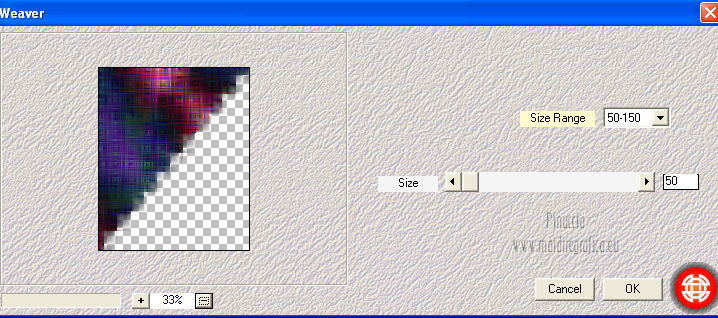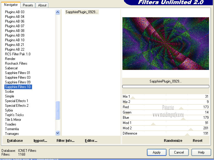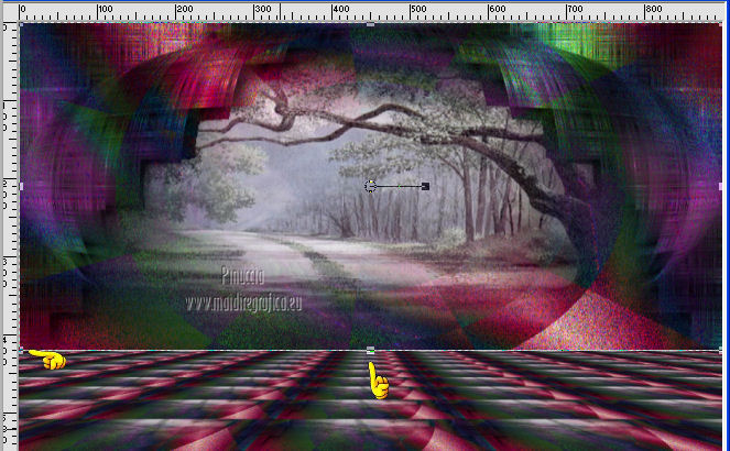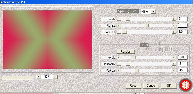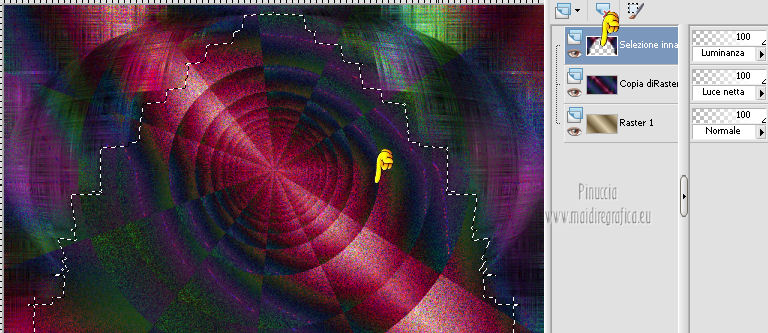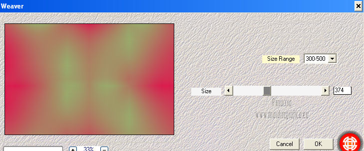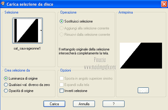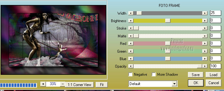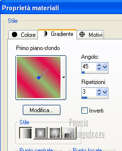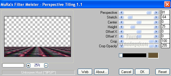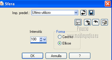 qui puoi trovare qualche risposta ai tuoi dubbi. Se l'argomento che ti interessa non è presente, ti prego di segnalarmelo. Questo tutorial è una creazione di Saturnella e non può essere copiato su altri siti nè essere offerto per il download. Lo stesso vale per la mia traduzione. E' anche proibito togliere il watermark dal materiale; rispettiamo il lavoro dei creatori di tubes, senza i quali non potremmo creare tutorials. Questo tutorial è stato creato con PSP 12, ma può essere eseguito anche con le altre versioni di PSP. Per tradurlo ho usato PSP X. Occorrente: Materiale qui I tubes sono di Veda e LuzCristina. Grazie a tutti per il vostro magnifico lavoro. (in questa pagina trovi i links ai loro siti). Filtri in caso di dubbi, ricorda di consultare la mia sezione filtri qui Filters Unlimited 2.0 qui Sapphire Filter 10 qui Simple qui Mehdi - Weaver qui Mehdi - Kaleidoscope 2.1 qui Adjust Variations qui AAA Frames - Foto Frame qui Alien Skin Eye Candy 5 Impact - Perspective Shadow qui ![]() non esitare a cambiare modalità di miscelatura e opacità secondo i colori utilizzati. Metti la selezione nella cartella Selezioni. 1. Imposta il colore di primo piano con #decfae, e il colore di sfondo con #665332. ![]() Passa il colore di primo piano a Gradiente, stile Lineare. ![]() Apri una nuova immagine trasparente 900 x 550 pixels, e riempila con il gradiente.2. Livelli>Duplica. Effetti>Plugins>Filters Unlimited 2.0 - Sapphire Filters 10 - SapphirePlugin_0929. ![]() Cambia la modalità di miscelatura di questo livello in Luce netta. 3. Selezione>Carica/Salva selezione>Carica selezione da disco. Cerca e carica la selezione sat_sauvageonne1. ![]() Selezione>Innalza selezione a livello. Selezione>Deseleziona. 4. Effetti>Plugins>Mehdi - Weaver. ![]() 5. Effetti>Effetti geometrici>Sfera. ![]() 6. Livelli>Duplica. Immagine>Rifletti. Livelli>Unisci>Unisci giù. Cambia la modalità di miscelatura di questo livello in Luminanza. 7. Attiva lo strumento Bacchetta magica ![]() e clicca nella parte trasparente per selezionarla. ![]() 8. Livelli>Nuovo livello raster. Apri il tube del paesaggio 1366-luzcristina e vai a Modifica>Copia. Torna al tuo lavoro e vai a Modifica>Incolla nella selezione. Selezione>Deseleziona. Livelli>Disponi>Sposta giù. 9. Attiva il livello superiore. Effetti>Effetti 3D>Sfalsa ombra. ![]() Ripeti l'Effetto Sfalsa ombra, cambiando verticale e orizzontale con -10. 10. Livelli>Unisci>Unisci visibile. 11. Livelli>Duplica. Attiva lo strumento Selezione ,clicca sull'icona Selezione personalizzata ![]() e imposta i seguenti settaggi: ![]() Selezione>Innalza selezione a livello. Selezione>Deseleziona. 12. Effetti>Plugins>Mura's Meister - Perspective Tiling. ![]() 13. Livelli>Disponi>Sposta giù. 14. Attiva il livello superiore. Attiva lo strumento Puntatore ![]() se stai usando PSP lo strumento Deformazione ![]() e, in modalità Scala, spingi in alto il nodo inferiore centrale, fino a 420 pixels. ![]() 15. Apri il tube della donna VPC_ShesAlwaysNear@Vasilich, e vai a Modifica>Copia. Torna al tuo lavoro e vai a Modifica>Incolla come nuovo livello. Immagine>Ridimensiona, al 75%, tutti i livelli non selezionato. Posiziona correttamente il tube.16. Effetti>Plugins>Alien Skin Eye Candy 5 Impact - Perspective shadow seleziona il preset Short perspective shadow in back e ok. ![]() 17. Effetti>Effetti 3D>Sfalsa ombra. ![]() 18. Apri il file di testo e vai a Modifica>Copia. Torna al tuo lavoro e vai a Modifica>Incolla come nuovo livello. Spostalo in alto a destra.19. Livelli>Unisci>Unisci tutto. Modifica>Copia. 20. Imposta il colore di primo piano con #8fc070, e il colore di sfondo con #e5074b. ![]() Passa il colore di primo piano a Gradiente, stile Lineare. ![]() 21. Immagine>Aggiungi bordatura, 2 pixels, simmetriche, con il colore verde. Immagine>Aggiungi bordatura, 4 pixels, simmetriche, con il colore rosso. Immagine>Aggiungi bordatura, 2 pixels, simmetriche, con il colore verde. 22. Livelli>Innalza livello di sfondo. 23. Immagine>Dimensioni tela - 1016 x 666. ![]() 24. Livelli>Nuovo livello raster. Livelli>Disponi>Sposta giù. Selezione>Seleziona tutto. Modifica>Incolla nella selezione. Selezione>Deseleziona. 25. Chiudi il livello superiore, e rimani posizionato sul livello inferiore. 26. Livelli>Nuovo livello raster. Riempi con il gradiente.27. Regola>Sfocatura>Sfocatura gaussiana - raggio 50. ![]() Cambia la modalità di miscelatura di questo livello in Sovrapponi. 28. Effetti>Plugins>Mehdi - Kaleidoscope 2.1. ![]() 29. Effetti>Plugins>Mehdi - Weaver. ![]() 30. Effetti>Plugins>Simple - 4 Way Average. 31. Effetti>Plugins>Adjust - Variations. Un clic su Original, un clic su More Red, un clic su Darker e ok. 32. Apri e attiva il livello superiore. Effetti>Effetti 3D>Sfalsa ombra. ![]() Modifica>Ripeti Sfalsa ombra. 33. Livelli>Unisci>Unisci tutto. 34. Effetti>Plugins>AAA Frames - Foto Frame - 2 volte con i seguenti settaggi. ![]() Firma il tuo lavoro. Immagine>Ridimensiona, a 900 pixels di larghezza. Regola>Messa a fuoco>Metti a fuoco. Salva in formato jpg. ![]() Se hai problemi o dubbi, o trovi un link non funzionante, o anche soltanto per dirmi che ti è piaciuto, scrivimi. 22 Agosto 2012 |