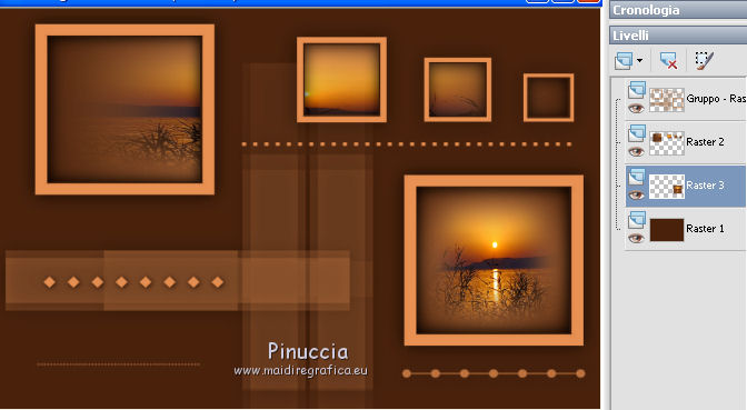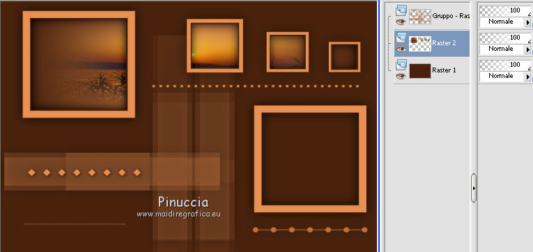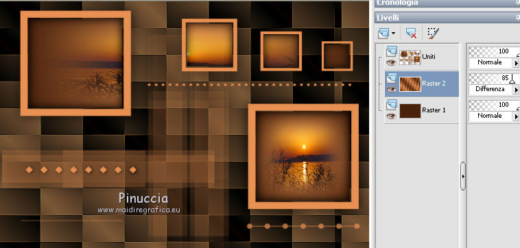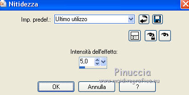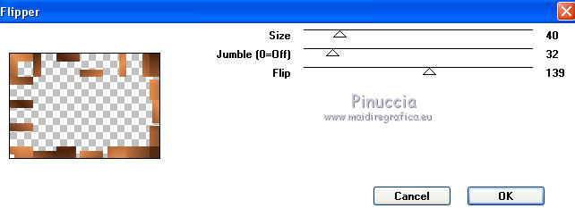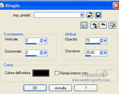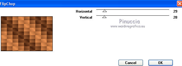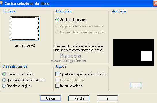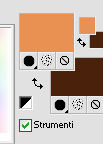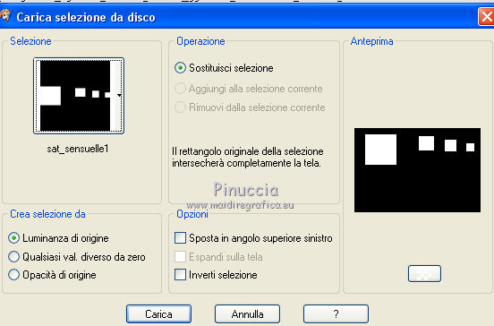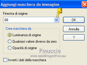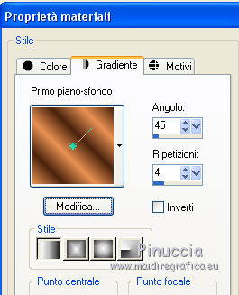 qui puoi trovare qualche risposta ai tuoi dubbi. Se l'argomento che ti interessa non è presente, ti prego di segnalarmelo. Questo tutorial è una creazione di Saturnella e non può essere copiato su altri siti nè essere offerto per il download. Lo stesso vale per la mia traduzione. E' anche proibito togliere il watermark dal materiale; rispettiamo il lavoro dei creatori di tubes, senza i quali non potremmo creare tutorials. Per tradurre questo tutorial, creato con X15, ho usato CorelX, ma può essere eseguito anche con le altre versioni di PSP. Dalla versione X4, il comando Immagine>Rifletti è stato sostituito con Immagine>Capovolgi in orizzontale, e il comando Immagine>Capovolgi con Immagine>Capovolgi in verticale. Nelle versioni X5 e X6, le funzioni sono state migliorate rendendo disponibile il menu Oggetti. Vedi la scheda sull'argomento qui Occorrente: Materiale qui Per i tubes grazie Guismo, Créaline, Luz Cristina. (in questa pagina trovi i links ai loro siti). Filtri in caso di dubbi, ricorda di consultare la mia sezione filtri qui Filters Unlimited 2.0 qui VM Distortion qui I filtri VM Distortion si possono usare da soli o importati in Filters Unlimited (come fare vedi qui) Se un filtro fornito appare con questa icona ![]() non esitare a cambiare modalità di miscelatura e opacità secondo i colori utilizzati. Metti le selezioni nella cartella Selezioni. Apri la maschera in PSP e minimizzala con il resto del materiale. 1. Imposta il colore di primo piano con #e99152, e il colore di sfondo con #4a230e. ![]() Apri una nuova immagine trasparente 900 x 600 pixels, e riempila con il colore scuro.2. Livelli>Nuovo livello raster. Riempi con il colore chiaro.3. Livelli>Nuovo livello maschera>Da immagine. Apri il menu sotto la finestra di origine e vedrai la lista dei files aperti. Seleziona la maschera masque 68, con i seguenti settaggi. ![]() Livelli>Unisci>Unisci gruppo. 4. Effetti>Effetti 3D>Sfalsa ombra, colore nero. ![]() 5. Livelli>Nuovo livello raster. Selezione>Carica/Salva selezione>Carica selezione da disco. Cerca e carica la selezione sat_sensuelle1. ![]() Passa il colore di primo piano a Gradiente di primo piano/sfondo, stile Sprazzo di luce. ![]() Riempi la selezione con il gradiente.Mantieni selezionato. 6. Livelli>Nuovo livello raster. Apri il tube del paesaggio e vai a Modifica>Copia. Torna al tuo lavoro e vai a Modifica>Incolla nella selezione. Mantieni ancora selezionato. 7. Livelli>Nuovo livello raster. Effetti>Effetti 3D>Ritaglio, colore nero. ![]() Selezione>Deseleziona. Livelli>Unisci>Unisci giù - 2 volte. Livelli>Disponi>Sposta giù. ![]() 8. Livelli>Nuovo livello raster. Selezione>Carica/Salva selezione>Carica selezione da disco. Cerca e carica la selezione sat_sensuelle2. ![]() Riempi la selezione con il gradiente.9. Livelli>Nuovo livello raster. Attiva nuovamente il tube del paesaggio. Immagine>Rifletti. Modifica>Copia. 10. Torna al tuo lavoro e vai a Modifica>Incolla nella selezione. 11. Livelli>Nuovo livello raster. Effetti>Effetti 3D>Ritaglio, con i settaggi precedenti. Selezione>Deseleziona. 12. Livelli>Unisci>Unisci giù - 2 volte. Livelli>Disponi>Sposta giù. ![]() 13. Chiudi il livello di sfondo. Livelli>Unisci>Unisci visibile. Riapri e attiva il livello di sfondo. 14. Livelli>Nuovo livello raster. Cambia i settaggi del gradiente, in stile Lineare. ![]() Riempi il livello con questo gradiente.15. Effetti>Plugins>VM Distortion - Flip Chop, con i settaggi standard. ![]() Effetti>Effetti di bordo>Aumenta. Cambia la modalità di miscelatura di questo livello in Differenza (o secondo i tuoi colori) e abbassa l'opacità all'85%. ![]() 16. Attiva il livello superiore. Apri il tube della donna e vai a Modifica>Copia. Torna al tuo lavoro e vai a Modifica>Incolla come nuovo livello. Regola>Luminosità e contrasto>Nitidezza. ![]() Regola>Messa a fuoco>Metti a fuoco. Effetti>Effetti 3D>Sfalsa ombra, colore nero. ![]() 17. Apri il tube dei fiori e vai a Modifica>Copia. Torna al tuo lavoro e vai a Modifica>Incolla come nuovo livello. Immagine>Ridimensiona, al 70%, tutti i livelli non selezionato. Effetti>Effetti 3D>Sfalsa ombra, con i settaggi precedenti. Livelli>Unisci>Unisci tutto. 18. Immagine>Aggiungi bordatura, 2 pixels, simmetriche, con il colore chiaro. Immagine>Aggiungi bordatura, 50 pixels, simmetriche, con il colore scuro. 19. Attiva lo strumento Bacchetta magica ![]() e clicca nel bordo da 50 pixels per selezionarlo. Riempi la selezione con il gradiente lineare.20. Selezione>Innalza selezione a livello. Effetti>Plugins>VM Distortion - Flipper. ![]() Effetti>Effetti di bordo>Aumenta di più. Cambia la modalità di miscelatura di questo livello in Sovrapponi. 21. Selezione>Inverti. Effetti>Effetti 3D>Sfalsa ombra, colore nero. ![]() Selezione>Deseleziona. 22. Immagine>Aggiungi bordatura, 2 pixels, simmetriche, con il colore scuro. 23. Immagine>Ridimensiona, a 900 pixels di larghezza, tutti i livelli selezionato. Firma il tuo lavoro e salva in formato jpg. Per questo esempio ho usato tubes di Syl. ![]() ![]() Se hai problemi o dubbi, o trovi un link non funzionante, o anche soltanto per dirmi che ti è piaciuto, scrivimi. 21 Agosto 2014 |