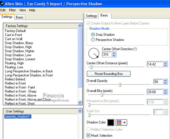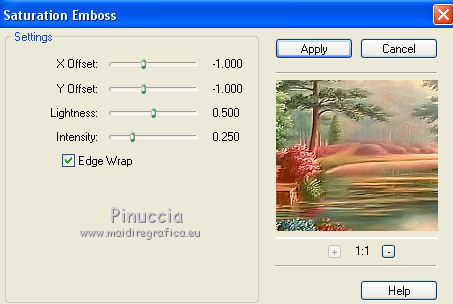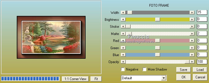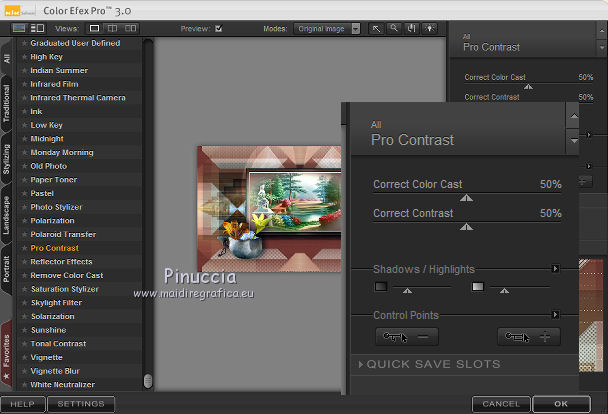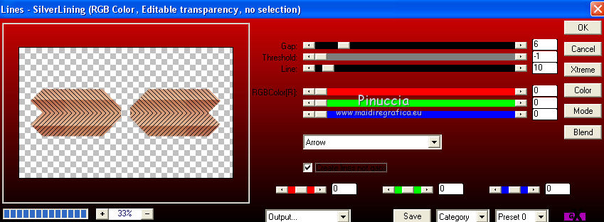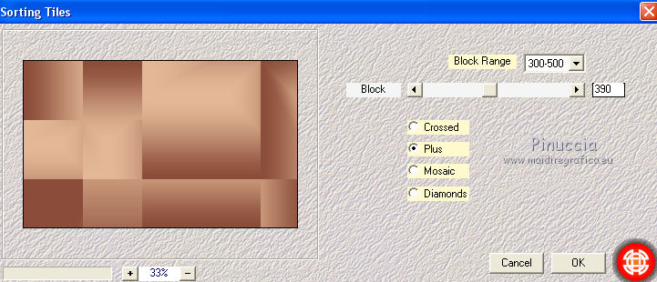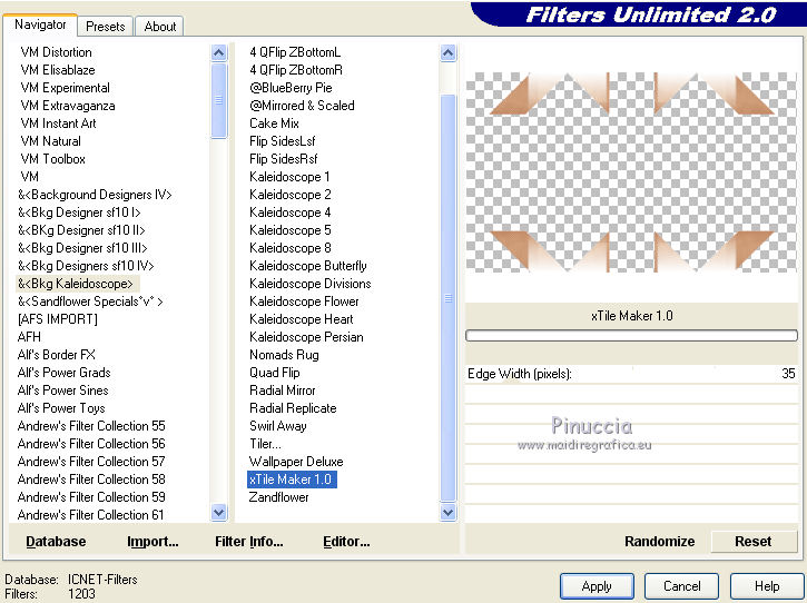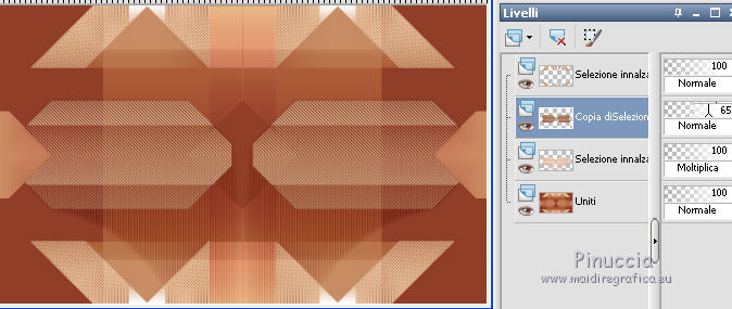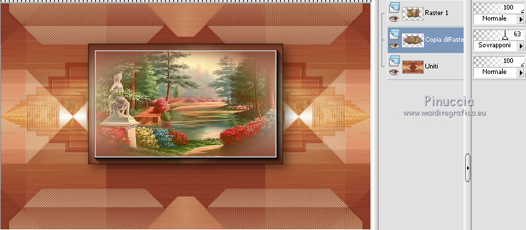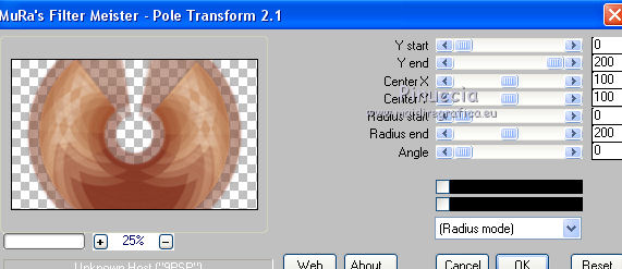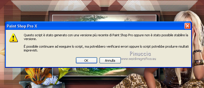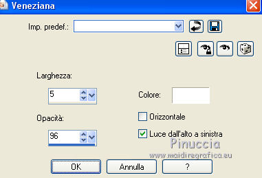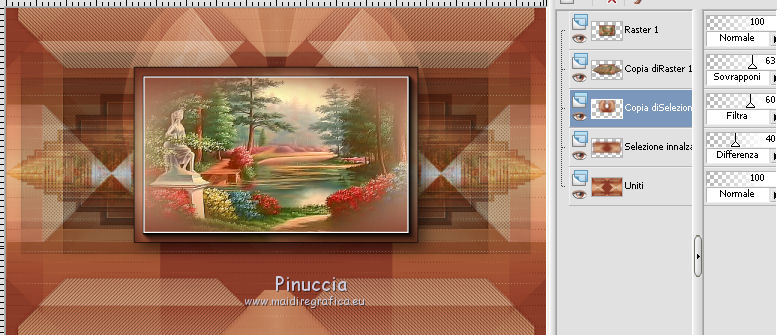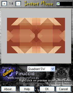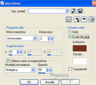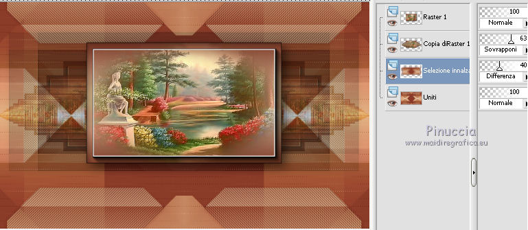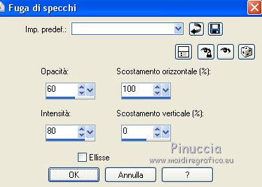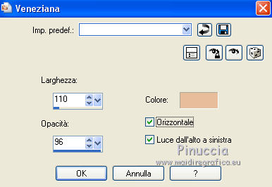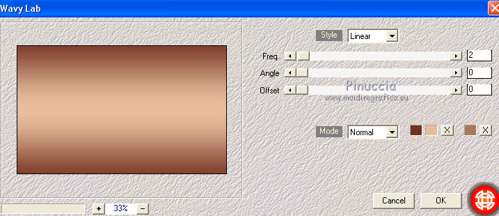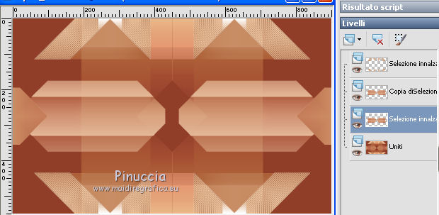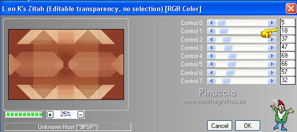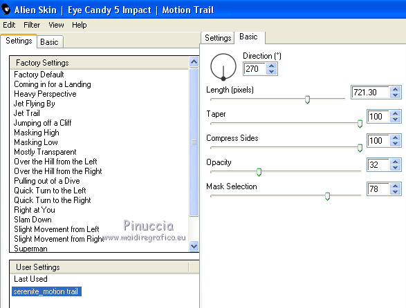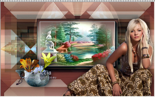 qui puoi trovare qualche risposta ai tuoi dubbi. Se l'argomento che ti interessa non è presente, ti prego di segnalarmelo. Questo tutorial è una creazione di Saturnella e non può essere copiato su altri siti nè essere offerto per il download. Lo stesso vale per la mia traduzione. E' anche proibito togliere il watermark dal materiale; rispettiamo il lavoro dei creatori di tubes, senza i quali non potremmo creare tutorials. Per tradurre questo tutorial, creato con X6, ho usato CorelX, ma può essere eseguito anche con le altre versioni di PSP. Dalla versione X4, il comando Immagine>Rifletti è stato sostituito con Immagine>Capovolgi in orizzontale, e il comando Immagine>Capovolgi con Immagine>Capovolgi in verticale. Nelle versioni X5 e X6, le funzioni sono state migliorate rendendo disponibile il menu Oggetti. Nel nuovo X7 sono tornati i comandi Immagine>Rifletti e Immagine>Capovolgi, ma con nuove funzioni. Vedi la scheda sull'argomento qui Occorrente: Materiale qui Grazie per il tube della donna AnaRidzi e per il tube del vaso Thafs. (in questa pagina trovi i links ai loro siti). Filtri in caso di dubbi, ricorda di consultare la mia sezione filtri qui Filters Unlimited 2.0 qui &<Bkg Kaleidoscope> - xTile Maker 1.0 (da importare in Unlimited) qui Alien Skin Eye Candy 5 Impact - Perspective Shadow, Motion Trail qui Simple - Pizza Slice mirror, Blintz qui Mura's Meister - Pole Transform qui AP 01 [Innovations] - Lines SilverLining qui Toadies - What are you qui Plugin Galaxy - Instant Mirror qui L&K's - L&K's Zitah qui FM Tile Tools - Saturation Emboss qui AAA Frames - Foto Frame qui Mehdi - Sorting Tiles - Wavy Lab qui Nik Software - Color Efex Pro qui I filtri Simple e Toadies si possono usare da soli o importati in Filters Unlimited (come fare vedi qui) Se un filtro fornito appare con questa icona ![]() non esitare a cambiare modalità di miscelatura e opacità secondo i colori utilizzati. Metti i preset Cliccando sul file una o due volte (a seconda delle tue impostazioni), automaticamente il preset si installerà nella cartella corretta. perchè uno o due clic vedi qui Metti lo script nella cartella Script sicuri. 1. Imposta il colore di primo piano con il colore con #e7bd9c, e il colore di sfondo con #733121. ![]() Apri alpha_serenite. Finestra>Duplica, o sulla tastiera maiuscola+D, per fare una copia. Chiudi l'originale. La copia, che sarà la base del tuo lavoro, non è vuota, ma contiene le selezioni salvate sul canale alfa. Rinomina il livello "Raster 1". una piccola curiosità: se rinomini il livello con la lettera minuscola - raster 1 - il programma assegnerà nuovamente il numero 1 al successivo livello. Se invece rinomini il livello con la lettera maiuscola - Raster 1 - il programma assegnerà al livello successivo il numero 2 2. Effetti>Plugins>Mehdi - Wavy Lab questo filtro lavora con i colori della paletta: il primo è il colore di sfondo, il secondo quello di primo piano. Mantieni il terzo colore creato dal filtro. ![]() 3. Regola>Sfocatura>Sfocatura gaussiana - raggio 50. ![]() 4. Effetti>Plugins>Mehdi - Sorting Tiles. ![]() 5. Effetti>Plugins>Simple - Blintz. Modifica>Ripeti Blintz. 6. Effetti>Plugins>Simple - Pizza slice mirror. 7. Livelli>Duplica. Immagine>Rifletti. Cambia la modalità di miscelatura di questo livello in Luce netta, e abbassa l'opacità al 50%. ![]() Livelli>Unisci>Unisci visibile. 8. Effetti>Plugins>The Plugin Site - Instant Mirror. nella lista dei filtri trovi i filtri Galaxy sotto la lettera T di "The Plugin Site" ![]() 9. Selezione>Carica/Salva selezione>Carica selezione da canale alfa. La selezione sélection#1 è subito disponibile. Devi soltanto cliccare Carica. ![]() Selezione>Innalza selezione a livello. Selezione>Deseleziona. 10. Effetti>Effetti artistici>Mezzitoni. ![]() 11. Livelli>Duplica. Immagine>Capovolgi. Livelli>Unisci>Unisci giù. 12. Effetti>Plugins>Filters Unlimited 2.0 - &<Bkg Kaleidoscope> - xTile Maker 1.0, con i settaggi standard. ![]() 13. Attiva il livello di sfondo. Selezione>Carica/Salva selezione>Carica selezione da canale alfa. Apri il menu delle selezioni e carica sélection#2. ![]() Selezione>Innalza selezione a livello. Selezione>Deseleziona. 14. Effetti>Effetti di trama>Veneziana, con il tuo colore chiaro. ![]() 15. Livelli>Duplica. Immagine>Rifletti. Livelli>Unisci>Unisci giù. Ancora Livelli>Duplica. 16. Attiva il livello sottostante. ![]() Effetti>Plugins>Alien Skin Eye Candy 5 Impact - Motion Trail. Seleziona il preset serenite_motion trail e ok. In caso di problemi con il preset puoi copiare i settaggi che vedi nella schermata. ![]() 17. Effetti>Effetti di trama>Veneziana, colore bianco. ![]() Cambia la modalità di miscelatura di questo livello in Moltiplica, o secondo i tuoi colori. 18. Attiva il livello soprastante. Effetti>Plugins>AP01 [Innovations] - Lines SilverLining. ![]() Abbassa l'opacità di questo livello al 65%. ![]() 19. Attiva il livello di sfondo. Effetti>Plugins>L&K's - L&K's Zitah. ![]() Livelli>Unisci>Unisci visibile. 20. Effetti>Plugins>The Plugin Site - Instant Mirror. ![]() 21. Selezione>Carica/Salva selezione>Carica selezione da canale alfa. Apri il menu delle selezioni e carica sélection#3. ![]() Livelli>Nuovo livello raster. Effetti>Plugins>Mehdi - Wavy Lab, con i settaggi precedenti. ![]() 22. Livelli>Nuovo livello raster. Apri il tube del paesaggio e vai a Modifica>Copia. Torna al tuo lavoro e vai a Modifica>Incolla nella selezione. Effetti>Plugins>FM Tile Tools - Saturation Emboss, con i settaggi standard. ![]() Mantieni selezionato. Livelli>Unisci>Unisci giù. 23. Effetti>Plugins>AAA Frames - Foto Frame. ![]() Selezione>Deseleziona. 24. Livelli>Duplica. Effetti>Effetti di riflesso>Fuga di specchi. ![]() Livelli>Duplica. Immagine>Rifletti. Livelli>Unisci>Unisci giù. Livelli>Disponi>Sposta giù. Cambia la modalità di miscelatura di questo livello in Sovrapponi, o secondo i tuoi colori, e abbassa l'opacità al 63%. ![]() 25. Attiva il livello superiore. Effetti>Plugins>Alien Skin Ey