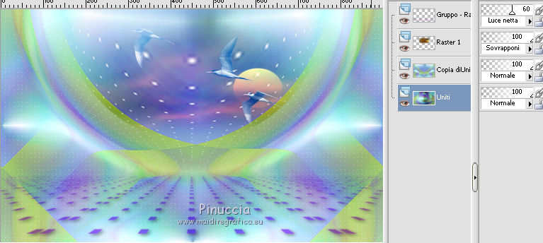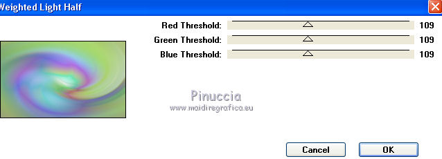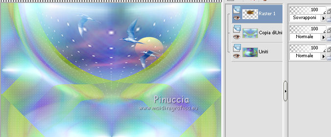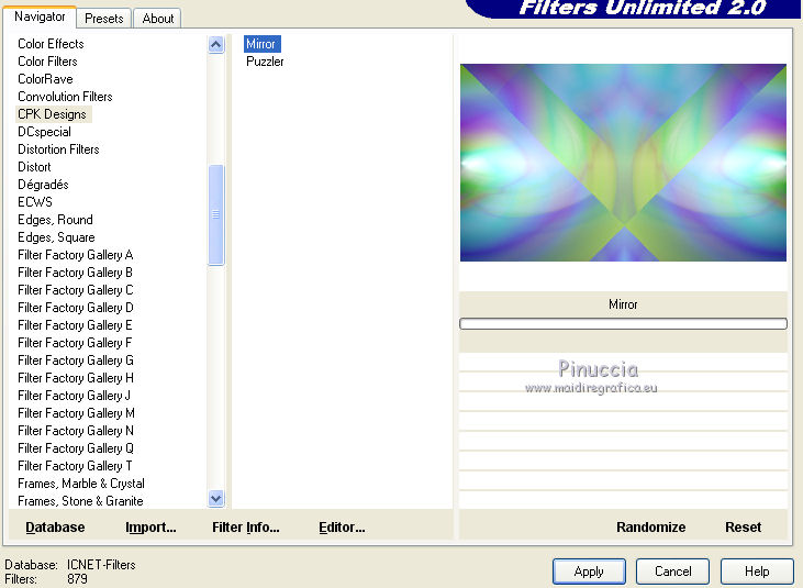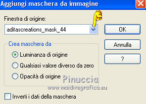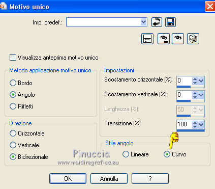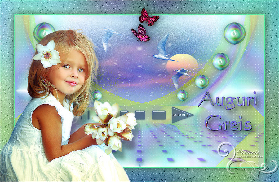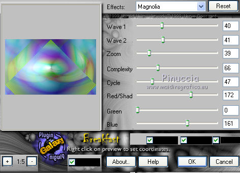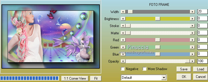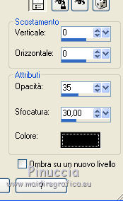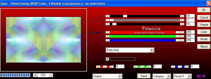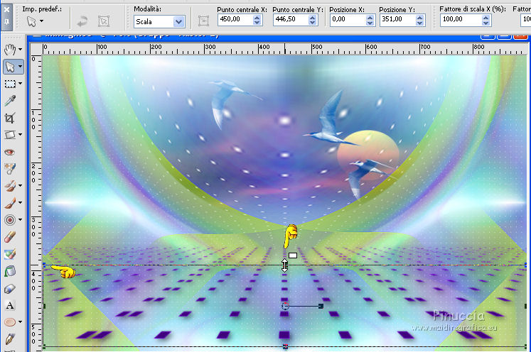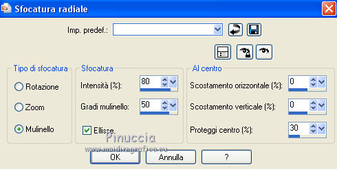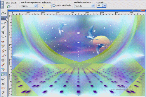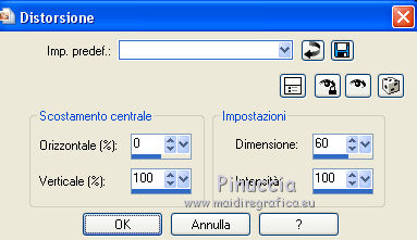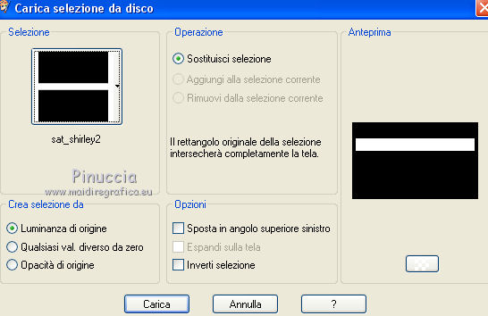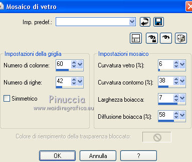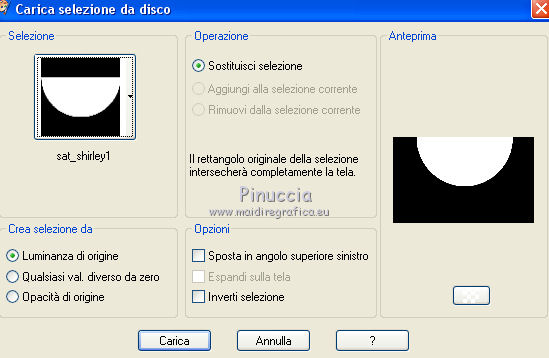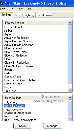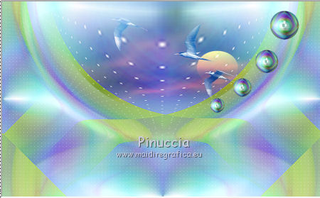 qui puoi trovare qualche risposta ai tuoi dubbi. Se l'argomento che ti interessa non è presente, ti prego di segnalarmelo. Questo tutorial è una creazione di Saturnella e non può essere copiato su altri siti nè essere offerto per il download. Lo stesso vale per la mia traduzione. E' anche proibito togliere il watermark dal materiale; rispettiamo il lavoro dei creatori di tubes, senza i quali non potremmo creare tutorials. Il tutorial è stato scritto con CorelX16, ma può essere eseguito anche con le altre versioni di PSP. Secondo la versione utilizzata (anteriore a PSP X) potresti ottenere dei risultati differenti. Vedi la mia scheda riguardante le funzioni Rifletti>Capovolgi nelle nuove versioni di PSP qui Per tradurre questo tutorial ho usato PSP X. Occorrente: Materiale qui Per i tube grazie Joanie, LuzCristina, Gran-Gran e Syl. Per la maschera grazie Adita (in questa pagina trovi i links ai loro siti). Filtri in caso di dubbi, ricorda di consultare la mia sezione filtri qui AP 01 [Innovations] - Lines SilverLining qui Alien Skin Eye Candy 5 Impact - Glass qui Simple - Blintz qui Teph's Tricks - Weighted Light Half qui Plugin Galaxy - Breakfast qui Adjust - Variations qui CPK Design - Mirror qui Filters Unlimited 2.0 qui I filtri Simple, Teph's e CPK Design si possono usare da soli o importati in Filters Unlimited (come fare vedi qui) Se un filtro fornito appare con questa icona ![]() se non vuoi sentire la musica premi il tasto ESC Il midi che stai ascoltando è As time goes by cantato da Shirley Bassey non esitare a cambiare modalità di miscelatura e opacità secondo i colori utilizzati. Metti il preset Cliccando sul file una o due volte (a seconda delle tue impostazioni), automaticamente il preset si installerà nella cartella corretta. perchè uno o due clic vedi qui Metti le selezioni nella cartella Selezioni. Apri la maschera in PSP e minimizzala con il resto del materiale. 1. Imposta il colore di primo piano con #4de299, e il colore di sfondo con #3f017c. ![]() Apri una nuova immagine trasparente 900 x 550 pixels. Selezione>Seleziona tutto. 2. Apri l'immagine di sfondo "fond" e vai a Modifica>Copia. Torna al tuo lavoro e vai a Modifica>Incolla nella selezione. Selezione>Deseleziona. Se necessario, colorizza con i tuoi colori (sul Viraggio vedi qui) 3. Regola>Sfocatura>Sfocatura radiale. ![]() 4. Effetti>Plugins>Teph's Tricks - Weighted Light Half. ![]() se necessario, adatta i settaggi ai tuoi colori 5. Effetti>Plugins>Simple - Blintz. Modifica>Ripeti Blintz. Livelli>Duplica. Immagine>Rifletti. Cambia la modalità di miscelatura di questo livello in Luce netta, o secondo i tuoi colori, e abbassa l'opacità al 50%. 6. Livelli>Unisci>Unisci visibile. 7. Effetti>Plugins>The Plugin Site - Breakfast. nell'elenco dei filtri i Filtri Galaxy si trovano sotto "The Plugin Site" non preoccuparti se nella barra inferiore non vedi le scritte ma soltanto delle strisce nere. Il filtro funziona lo stesso ![]() 8. Livelli>Duplica. Effetti>Plugins>Filters Unlimited 2.0 - CPK Design - Mirror. ![]() 9. Effetti>Effetti di immagine>Motivo unico. ![]() 10. Effetti>Plugins>AP 01 [Innovations] - Lines SilverLining. ![]() 11. Effetti>Effetti di distorsione>Distorsione. ![]() Immagine>Capovolgi. 12. Selezione>Carica/Salva selezione>Carica selezione da disco. Cerca e carica la selezione sat_shirley1. ![]() Livelli>Nuovo livello raster. Apri il tube del paesaggio di Luz Cristina e vai a Modifica>Copia. Torna al tuo lavoro e vai a Modifica>Incolla nella selezione. Cambia la modalità di miscelatura di questo livello in Sovrapponi, o secondo i tuoi colori. Selezione>Deseleziona. Regola>Messa a fuoco>Metti a fuoco. ![]() 13. Livelli>Nuovo livello raster. Riempi con il colore di sfondo.14. Livelli>Nuovo livello maschera>Da immagine. Apri il menu sotto la finestra di origine e vedrai la lista dei files aperti. Seleziona la maschera Aditascreations_mask_44, con i seguenti settaggi. ![]() Livelli>Unisci>Unisci gruppo. 15. Selezione>Carica/Salva selezione>Carica selezione da disco. Cerca e carica la selezione sat_shirley2. ![]() Premi sulla tastiera il tasto CANC ![]() Selezione>Deseleziona. 16. Effetti>Effetti 3D>Sfalsa ombra. ![]() Effetti>Effetti di bordo>Aumenta. 17. Premi il tasto K per attivare lo strumento Puntatore ![]() se stai usando PSP 9 il tasto D per attivare lo strumento Deformazione ![]() in modalità Scala, spingi il nodo superiore centrale verso il basso fino a 390 pixels, (se non visualizzi i Righelli, vai a Visualizza>Righelli) ![]() ![]() Cambia la modalità di miscelatura di questo livello in Luce netta, o secondo i tuoi colori, e abbassa l'opacità al 60%. 18. Attiva il livello di sfondo. ![]() Livelli>Duplica. Livelli>Disponi>Porta in alto. Effetti>Effetti geometrici>Cerchio. ![]() 19. Immagine>Ridimensiona, al 15%, tutti i livelli non selezionato. Regola>Messa a fuoco>Metti a fuoco. Sposta la sfera in alto a destra.![]() 20. Effetti>Plugins>Alien Skin Eye Candy 5 Impact - Glass. Seleziona il preset sat_shirley-glass e ok. ![]() Questi i settaggi che, in caso di problemi con il preset, puoi impostare manualmente. ![]() 21. Livelli>Duplica. Immagine>Ridimensiona, all'80%, tutti i livelli non selezionato. 22. Livelli>Duplica. Immagine>Ridimensiona, all'80%, tutti i livelli non selezionato. 23. Livelli>Duplica. Immagine>Ridimensiona, all'80%, tutti i livelli non selezionato. Posiziona le sfere come nell'esempio.![]() 24. Assicurati di essere posizionato sul livello superiore. Livelli>Unisci>Unisci giù - 3 volte, e avrai le sfere su un unico livello. 25. Livelli>Duplica. Immagine>Rifletti. Livelli>Unisci>Unisci giù. 26. Effetti>Effetti 3D>Sfalsa ombra. ![]() 27. Apri il tube sat_déco1 e vai a Modifica>Copia. Torna al tuo lavoro e vai a Modifica>Incolla come nuovo livello. Colorizza, se necessario. Abbassa l'opacità di questo livello al 60%. Posiziona l'elemento come nel mio esempio.28. Effetti>Effetti 3D>Sfalsa ombra, con i settaggi precedenti, ancora in memoria. ![]() 29. Attiva il l
