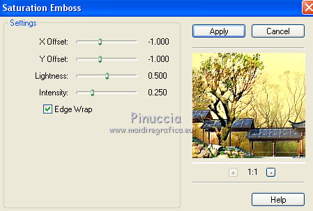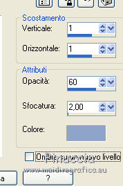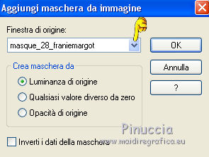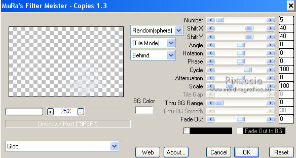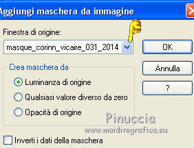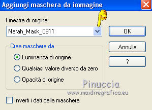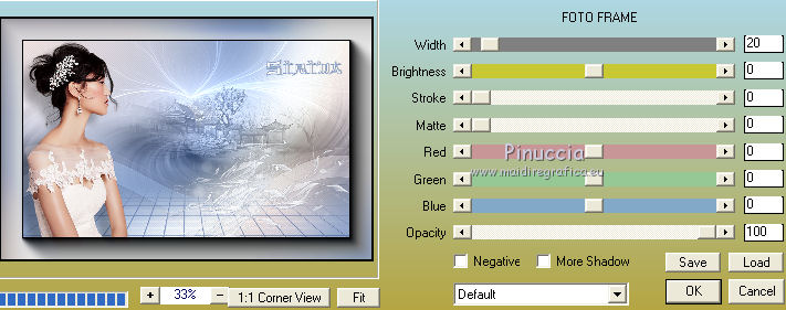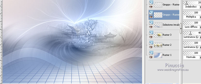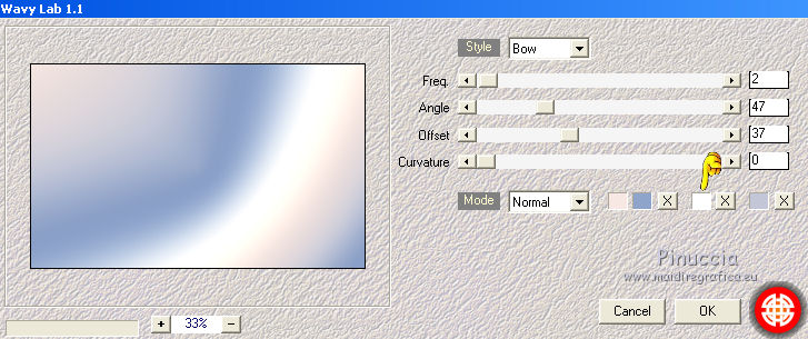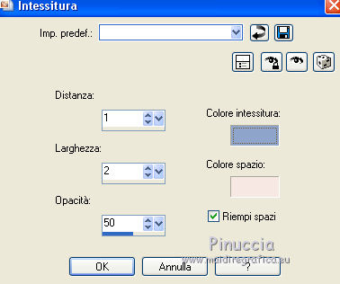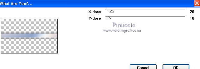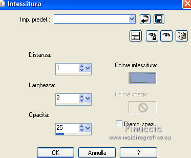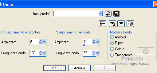 qui puoi trovare qualche risposta ai tuoi dubbi. Se l'argomento che ti interessa non è presente, ti prego di segnalarmelo. Questo tutorial è una creazione di Saturnella e non può essere copiato su altri siti nè essere offerto per il download. Lo stesso vale per la mia traduzione. E' anche proibito togliere il watermark dal materiale; rispettiamo il lavoro dei creatori di tubes, senza i quali non potremmo creare tutorials. Per tradurre questo tutorial, creato con PSP19, ho usato CorelX, ma può essere eseguito anche con le altre versioni di PSP. Dalla versione X4, il comando Immagine>Rifletti è stato sostituito con Immagine>Capovolgi in orizzontale, e il comando Immagine>Capovolgi con Immagine>Capovolgi in verticale. Nelle versioni X5 e X6, le funzioni sono state migliorate rendendo disponibile il menu Oggetti. Nel nuovo X7 sono tornati i comandi Immagine>Rifletti e Immagine>Capovolgi, ma con nuove funzioni. Vedi la scheda sull'argomento qui Occorrente: Materiale qui Grazie: per i tubes Thafs e Beatriz; per le maschere Narah, Corinne Vicaire e Franiemargot. Il resto del materiale è di Saturnella. (in questa pagina trovi i links ai loro siti). Filtri in caso di dubbi, ricorda di consultare la mia sezione filtri qui Filters Unlimited 2.0 qui Mehdi - Wavy Lab 1.1 qui FM Tile Tools - Saturation Emboss qui Toadies - What are you qui AAA Frames - Foto Frame qui Mura's Meister - Copies qui I filtri Toadies si possono usare da soli o importati in Filters Unlimited (come fare vedi qui) Se un filtro fornito appare con questa icona ![]() non esitare a cambiare modalità di miscelatura e opacità secondo i colori utilizzati. Nelle ultime versioni di PSP non c'è il gradiente di primo piano/sfondo (Corel_06_029) Puoi usare i gradienti delle versioni precedenti. Trovi qui i gradienti Corel X. Apri le maschere in PSP e minimizzale con il resto del materiale. 1. Imposta il colore di primo piano con il colore scuro #8ea4cb e il colore di sfondo con il colore chiaro #f7e8e3. ![]() Apri alpha_sirima. Finestra>Duplica o sulla tastiera maiuscola+D per fare una copia. ![]() Chiudi l'originale. La copia, che sarà la base del tuo lavoro, non è vuota, ma contiene una selezione salvata sul canale alfa. Effetti>Plugins>Mehdi - Wavy Lab 1 questo filtro lavora con i colori della paletta: il primo è il colore di sfondo, il secondo quello di primo piano; cambia il terzo colore con il colore bianco #ffffff e mantieni il quarto colore creato dal filtro. ![]() 2. Regola>Sfocatura>Sfocatura gaussiana - raggio 30. ![]() 3. Effetti>Effetti di trama>Intessitura - colore intessitura: colore di primo piano ![]() 4. Apri il tube del paesaggio di Thafs e vai a Modifica>Copia. Torna al tuo lavoro e vai a Modifica>Incolla come nuovo livello. 5. Effetti>Effetti di immagine>Motivo unico. ![]() 6. Regola>Sfocatura>Sfocatura radiale. ![]() Cambia la modalità di miscelatura di questo livello in Luminanza (esistente). 7. Modifica>Incolla come nuovo livello (il tube del paesaggio è ancora in memoria). Posiziona correttamente il tube.Cambia la modalità di miscelatura di questo livello in Luminanza (esistente) e abbassa l'opacità al 40%. ![]() 8. Effetti>Plugins>FM Tile Tools - Saturation Emboss. ![]() 9. Attiva il livello di sfondo. Selezione>Carica/Salva selezione>Carica selezione da canale alpha. La selezione sélection#1 è subito disponibile. Devi soltanto cliccare Carica. ![]() Selezione>Innalza selezione a livello. Selezione>Deseleziona. Livelli>Disponi>Porta in alto. 10. Effetti>Plugins>Toadies - What are you. ![]() Regola>Messa a fuoco>Accentua messa a fuoco. 11. Effetti>Effetti di distorsione>Onda. ![]() 12. Effetti>Effetti di immagine>Scostamento. ![]() Cambia la modalità di miscelatura di questo livello in Luce diffusa. 13. Effetti>Effetti 3D>Sfalsa ombra. ![]() 14. Livelli>Nuovo livello raster. Riempi con il colore scuro di primo piano.Livelli>Nuovo livello maschera>Da immagine. Apri il menu sotto la finestra di origine e vedrai la lista dei files aperti. Seleziona la maschera Narah_Mask_0911. ![]() Effetti>Effetti di bordo>Aumenta. Livelli>Unisci>Unisci gruppo. 15. Effetti>Effetti 3D>Sfalsa ombra, colore scuro. ![]() 16. Premi il tasto K per attivare lo strumento Puntatore ![]() se stai usando PSP 9 il tasto D per attivare lo strumento Deformazione ![]() in modalità Scala , spingi il nodo superiore centrale verso il basso fino a 100 pixels, e il nodo inferiore centrale verso l'alto fino a 410 pixels (se non visualizzi i Righelli, vai a Visualizza>Righelli) ![]() Tasto M per deselezionare lo strumento. Io ho cambiato la modalità di miscelatura in Moltiplica, a te decidere. 17. Livelli>Nuovo livello raster. Riempi con il colore chiaro di sfondo.Livelli>Nuovo livello maschera>Da immagine. Apri il menu sotto la finestra di origine e seleziona la maschera masque 28_Franiemargot. ![]() Effetti>Effetti di bordo>Aumenta. Livelli>Unisci>Unisci gruppo. io ho fatto (a te decidere): Effetti>Effetti di immagine>Scostamento ![]() Cambia la modalità di miscelatura di questo livello in Indebolisci, e abbassa l'opacità al 20%. ![]() 18. Apri il tube della donna di Beatriz e vai a Modifica>Copia. Torna al tuo lavoro e vai a Modifica>Incolla come nuovo livello. Immagine>Ridimensiona, all'85%, tutti i livelli non selezionato. Regola>Messa a fuoco>Metti a fuoco. 19. Effetti>Effetti 3D>Sfalsa ombra. ![]() 20. Imposta il colore di sfondo con il colore bianco. Livelli>Nuovo livello raster. Riempi con il colore bianco.Livelli>Nuovo livello maschera>Da immagine. Apri il menu sotto la finestra di origine e seleziona la maschera Corinne Vicaire. ![]() Regola>Messa a fuoco>Accentua messa a fuoco. Livelli>Unisci>Unisci gruppo. 21. Immagine>Ridimensiona, al 40%, tutti i livelli non selezionato. Regola>Messa a fuoco>Metti a fuoco. 22. Effetti>Effetti 3D>Sfalsa ombra, colore di primo piano. ![]() Posiziona l'immagine come nell'esempio.![]() 23. Effetti>Plugins>Mura's Meister - Copies. ![]() ricorda che Random significa casuale; per questo mo