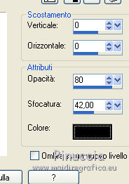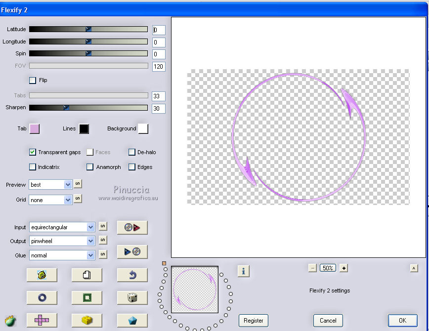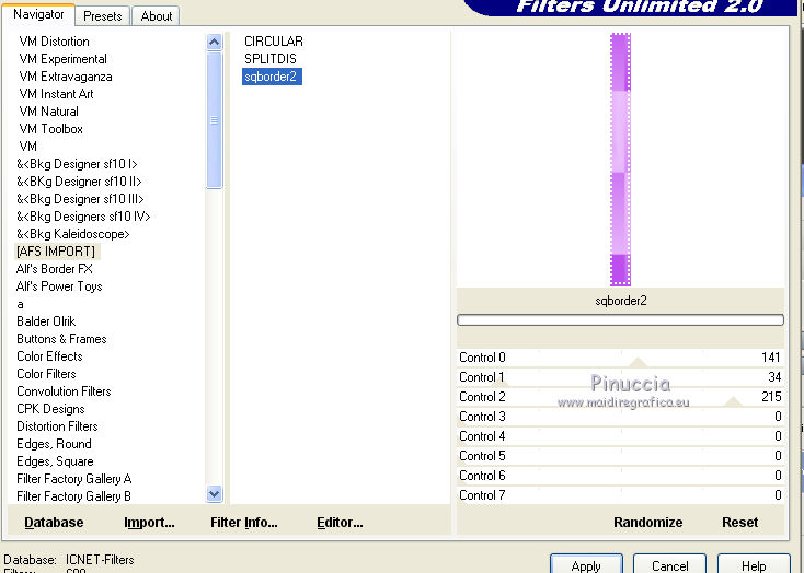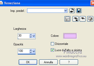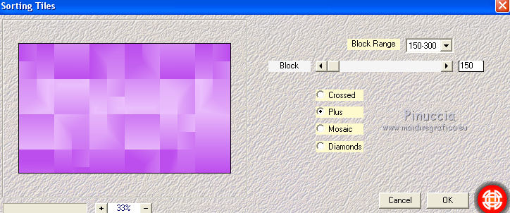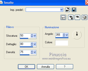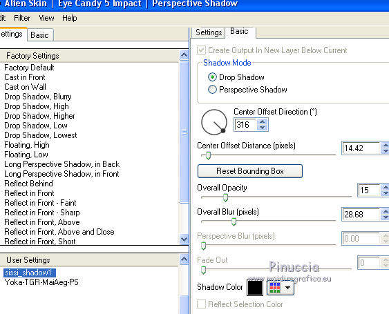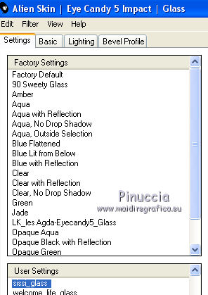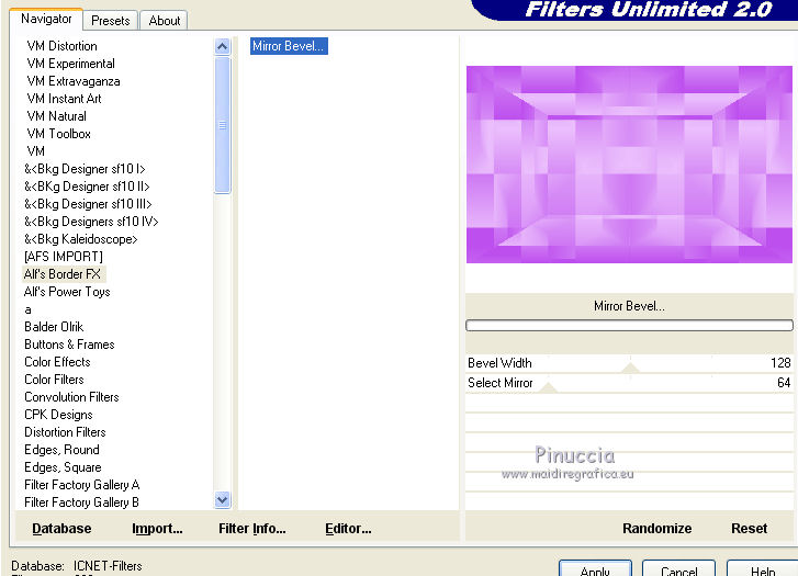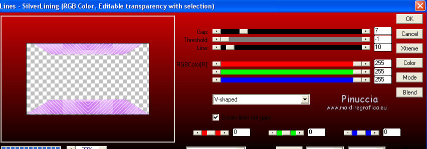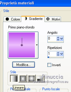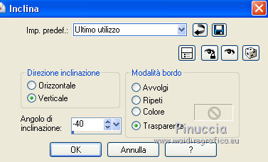 qui puoi trovare qualche risposta ai tuoi dubbi. Se l'argomento che ti interessa non è presente, ti prego di segnalarmelo. Questo tutorial è una creazione di Saturnella e non può essere copiato su altri siti nè essere offerto per il download. Lo stesso vale per la mia traduzione. E' anche proibito togliere il watermark dal materiale; rispettiamo il lavoro dei creatori di tubes, senza i quali non potremmo creare tutorials. Per tradurre questo tutorial, creato con PSP16, ho usato CorelX, ma può essere eseguito anche con le altre versioni di PSP. Dalla versione X4, il comando Immagine>Rifletti è stato sostituito con Immagine>Capovolgi in orizzontale, e il comando Immagine>Capovolgi con Immagine>Capovolgi in verticale. Nelle versioni X5 e X6, le funzioni sono state migliorate rendendo disponibile il menu Oggetti. Nel nuovo X7 sono tornati i comandi Immagine>Rifletti e Immagine>Capovolgi, ma con nuove funzioni. Vedi la scheda sull'argomento qui Occorrente: Materiale qui Grazie: per i tubes Verocreation e Sonia, per la maschera Narah (in questa pagina trovi i links ai loro siti). Filtri in caso di dubbi, ricorda di consultare la mia sezione filtri qui Filters Unlimited 2.0 qui &<Bkg Kaleidoscope> - 4QFlip UpperR (da importare in Unlimited) qui Alf's Border FX - Mirror Bevel qui AFS IMPORT - sqborder2 qui Mehdi - Sorting Tiles qui AP 01 Innovations - Lines SilverLining qui Mura's Meister - Perspective Tiling qui Alien Skin Eye Candy 5 Impact - Perspective Shadow, Extrude Glass qui Flaming Pear - Flexify 2 qui I filtri Alf's Border Fx e AFS IMPORT si possono usare da soli o importati in Filters Unlimited (come fare vedi qui) Se un filtro fornito appare con questa icona ![]() non esitare a cambiare modalità di miscelatura e opacità secondo i colori utilizzati. Nelle ultime versioni di PSP non c'è il gradiente di primo piano/sfondo (Corel_06_029) Puoi usare i gradienti delle versioni precedenti. Trovi qui i gradienti Corel X. Metti i presets Cliccando sul file una o due volte (a seconda delle tue impostazioni), automaticamente il preset si installerà nella cartella corretta. perchè uno o due clic vedi qui Se preferisci, puoi importare direttamente il preset nel corso del tutorial Come fare vedi la scheda del filtro Eye Candy qui Apri la maschera in PSP e minimizzala con il resto del materiale. Imposta il colore di primo piano con il colore medio #bd4fef, e il colore di sfondo con il colore chiaro #ebbefc. ![]() Passa il colore di primo piano a Gradiente di primo piano/sfondo, stile Lineare. ![]() 1. Apri alpha_sissi. Finestra>Duplica, o sulla tastiera maiuscola+D, per fare una copia. ![]() Chiudi l'originale. La copia, che sarà la base del tuo lavoro, non è vuota, ma contiene le selezioni salvate sul canale alfa. 2. Riempi l'immagine trasparente con il gradiente.3. Effetti>Plugins>Mehdi - Sorting Tiles. ![]() 4. Effetti>Effetti di riflesso>Specchio rotante. ![]() 5. Effetti>Plugins>Filters Unlimited 2.0 Alf's Border FX - Mirror Bevel, con i settaggi standard. ![]() 6. Selezione>Carica/Salva selezione>Carica selezione da canale alfa. La selezione Sélection#1 è subito disponibile. Devi soltanto cliccare Carica. ![]() Selezione>innalza selezione a livello. 7. Effetti>Plugins>AP 01 Innovations - Lines SilverLining. ![]() Selezione>Deseleziona. Cambia la modalità di miscelatura di questo livello in Moltiplica, o altro. 8. Effetti>Plugins>Alien Skin Eye Candy 5 Impact - Perspective Shadow. Seleziona il preset sissi_shadow1 e ok. Questi i settaggi, in caso di problemi con il preset. ![]() Livelli>Unisci>Unisci visibile. 9. Livelli>Duplica. Effetti>Effetti geometrici>Inclina. ![]() 10. Effetti>Plugins>AP 01 Innovations - Lines SilverLining. ![]() 11. Effetti>Plugins>Filters Unlimited 2.0 - &<Bkg Kaleidoscope> - 4Q Flip UpperR ![]() 12. Immagine>Ridimensiona, al 65%, tutti i livelli non selezionato. Modifica>Copia. Modifica>Incolla come nuova immagine, e minimizza questa immagine. 13. Torna al tuo lavoro. Effetti>Effetti 3D>Sfalsa ombra. ![]() 14. Livelli>Nuovo livello raster. Riempi il livello con il gradiente.Selezione>Seleziona tutto. Selezione>Modifica>Contrai - 30 pixels. ![]() Premi sulla tastiera il tasto CANC ![]() 15. Effetti>Effetti 3D>Sfalsa ombra, con i settaggi precedenti in memoria ![]() Selezione>Deseleziona. Livelli>Unisci>Unisci giù. 16. Attiva il livello di sfondo. Selezione>Carica/Salva selezione>Carica selezione da canala alfa. apri il menu delle selezioni e carica sélection#2. ![]() Selezione>Innalza selezione a livello. Effetti>Plugins>AFS IMPORT - sqborder2, con i settaggi standard. ![]() Selezione>Deseleziona. 17. Livelli>Duplica. Immagine>Rifletti. Livelli>Unisci>Unisci giù. 18. Livelli>Duplica. Effetti>Plugins>Flaming Pear - Flexify 2. ![]() 19. Effetti>Plugins>Alien Skin Eye Candy 5 Impact - Extrude. Seleziona il preset sissi_extrude e ok. Sotto Basic>Solid Color, metti il tuo colore scuro. ![]() Livelli>Disponi>Porta in alto. 20. Selezione>Carica/Salva selezione>Carica selezione da canala alfa. apri il menu delle selezioni e carica sélection#3. ![]() Livelli>Nuovo livello raster. Apri il paesaggio di Sonia e vai a Modifica>Copia. Torna al tuo lavoro e vai a Modifica>Incolla come nuovo livello. Livelli>Disponi>Sposta giù. Selezione>Deseleziona. Io ho abbassato l'opacità di questo livello al 70%. Attiva il livello superiore. Livelli>Unisci>Unisci giù. 21. Attiva il livello Selezione Innalzata. ![]() Selezione>Carica/Salva selezione>Carica selezione da canala alfa. apri il menu delle selezioni e carica sélection#4. ![]() Selezione>Innalza selezione a livello. 22. Effetti>Effetti artistici>Smalto. ![]() 23. Effetti>Effetti 3D>Sfalsa ombra, con i settaggi precedenti in memoria. ![]() Selezione>Deseleziona. 23. Livelli>Duplica. Immagine>Rifletti. Livelli>Unisci>Unisci giù 2 volte. Effetti>Effetti 3D>Sfalsa ombra, con i settaggi precedenti. 24. Attiva il livello superiore. Apri il tube di Romy di Verocreation e vai a Modifica>Copia. Torna al tuo lavoro e vai a 