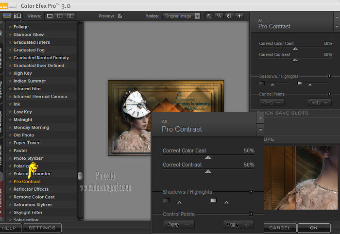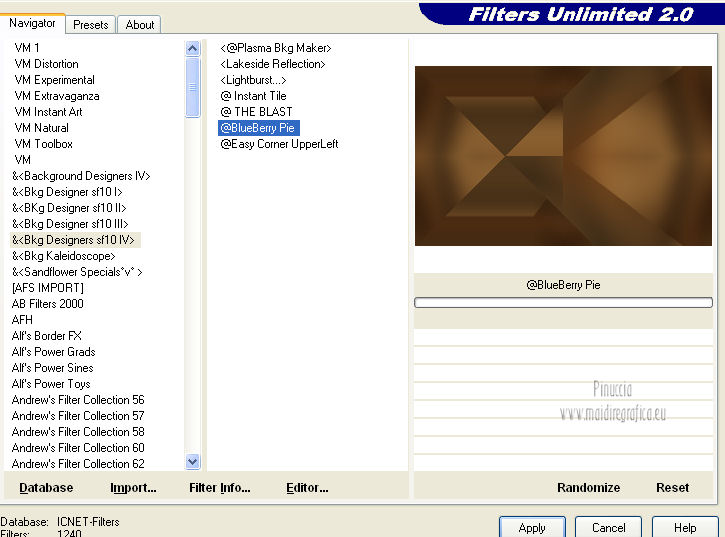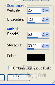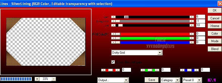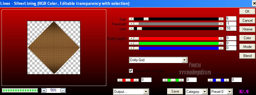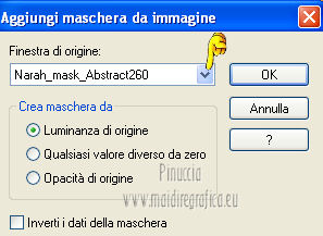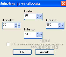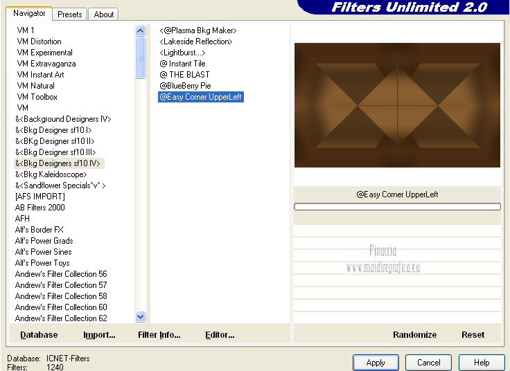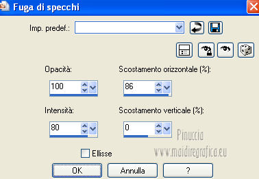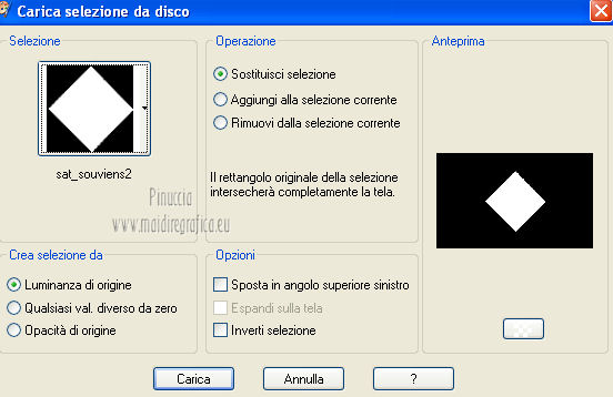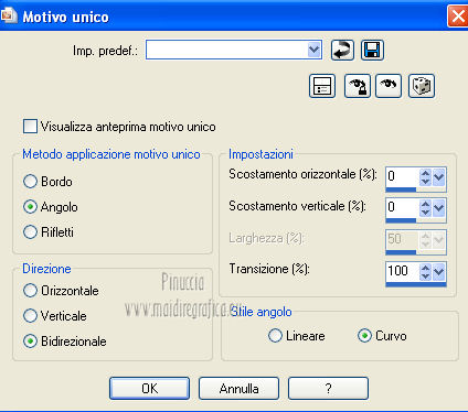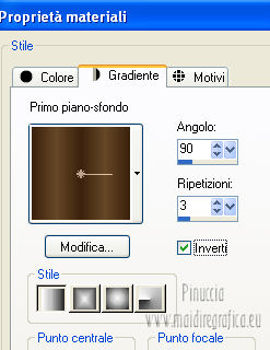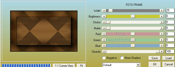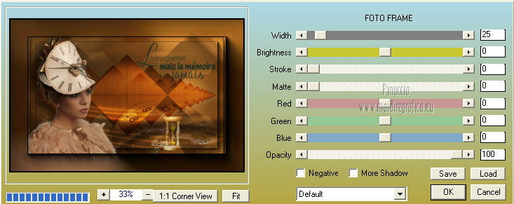 qui puoi trovare qualche risposta ai tuoi dubbi. Se l'argomento che ti interessa non è presente, ti prego di segnalarmelo. Questo tutorial è una creazione di Saturnella e non può essere copiato su altri siti nè essere offerto per il download. Lo stesso vale per la mia traduzione. E' anche proibito togliere il watermark dal materiale; rispettiamo il lavoro dei creatori di tubes, senza i quali non potremmo creare tutorials. Questo tutorial è stato creato con PSP 12, ma può essere eseguito anche con le altre versioni di PSP. Per tradurlo ho usato PSP X. Occorrente: Materiale qui I tubes sono di Maryse e Angelesdesign. La maschera è di Narah. Grazie a tutti per il vostro magnifico lavoro. (in questa pagina trovi i links ai loro siti). Filtri in caso di dubbi, ricorda di consultare la mia sezione filtri qui Filters Unlimited 2.0 qui &<Background Designers IV> qui &<Bkg Designer sfIV> qui AP 01 Innovations - Lines SilverLining qui AAA Frames - Foto frame qui Alien Skin Eye Candy 5 Impact - Perspective Shadow qui Nik Software - Colore Efex Pro qui ![]() non esitare a cambiare modalità di miscelatura e opacità secondo i colori utilizzati. Metti le selezioni nella cartella Selezioni. Apri la maschera in PSP e minimizzala con il resto del materiale. 1. Imposta il colore di primo piano con #654826, e il colore di sfondo con #3b220e. ![]() Passa il colore di primo piano a Gradiente, stile lineare, con i seguenti settaggi. ![]() 2. Apri una nuova immagine trasparente 900 x 550 pixels, e riempila con il gradiente.3. Regola>Sfocatura>Sfocatura gaussiana - raggio 30. ![]() 4. Effetti>Plugins>Filters Unlimited 2.0 - &<Background Designers IV - @Kaleidoscope 3. ![]() 5. Effetti>Plugins>Filters Unlimited 2.0 - &<Background Designers IV - @Night shadow pool. ![]() 6. 4. Effetti>Plugins>Filters Unlimited 2.0 - &<Bkg Designers sf10IV - @BlueBerry Pie. ![]() 7. 4. Effetti>Plugins>Filters Unlimited 2.0 - &<Bkg Designers sf20IV - @Easy corner Upper left. ![]() 8. Effetti>Effetti di immagine>Motivo unico. ![]() 9. Selezione>Carica/salva selezione>Carica selezione da disco. Cerca e carica la selezione sat_souviens1. ![]() Selezione>Innalza selezione a livello. 10. Effetti>Plugins>AP 01 Innovations - Lines SilverLining. ![]() Selezione>Deseleziona. 11. Effetti>Plugins>Toadies - What are you. ![]() Effetti>Effetti 3D>sfalsa ombra. ![]() Livelli>Unisci>Unisci visibile. 12. Attiva lo strumento Selezione ,clicca sull'icona Selezione personalizzata ![]() e imposta i seguenti settaggi: ![]() 13. Effetti>Plugins>AAA Frames - Foto Frame. ![]() 14. Effetti>Plugins>Alien Skin Eye Candy 5 Impact - Perspective Shadow. Seleziona il preset Drop Shadow Blurry e ok. ![]() 15. Selezione>Carica/Salva selezione>Carica selezione da disco. Cerca e carica la selezione sat_souviens2. (la nuova selezione sostituirà la precedente) ![]() Selezione>Innalza selezione a livello. 16. Effetti>Plugins>AP 01 Innovations - Lines Silverlining, con i settaggi precedenti. ![]() Selezione>Deseleziona. 17. Effetti>Effetti di immagine>Motivo unico. ![]() 18. Effetti>Effetti di riflesso>Fuga di specchi. ![]() Cambia la modalità di miscelatura di qusto livello in Sovrapponi. 19. Imposta il colore di primo piano con #f2edc9. Attiva il livello di sfondo. 20. Livelli>Nuovo livello raster. Riempi il livello con il colore di primo piano.21. Livelli>Nuovo livello maschera>Da immagine. Apri il menu sotto la finestra di origine e vedrai la lista dei files aperti. Seleziona la maschera Narah_mask_Abstract260, con i seguenti settaggi: ![]() Livelli>Unisci>Unisci gruppo. Cambia la modalità di miscelatura di questo livello in Sovrapponi (o secondo i tuoi colori). 22. Attiva il livello superiore. Apri il tube di Maryse "MR Time Hat". Cancella la firma. Modifica>Copia. Torna al tuo lavoro e vai a Modifica>Incolla come nuovo livello. Immagine>Rifletti. Immagine>Ridimensiona, 2 volte all'80%, tutti i livelli non selezionato. Sposta il tube a sinistra.23. Effetti>Effetti 3D>Sfalsa ombra. ![]() 24. Apri il tube "Wordart1" e vai a Modifica>Copia. Torna al tuo lavoro e vai a Modifica>Incolla come nuovo livello. Sposta il testo dove preferisci o vedi il mio esempio.25. Effetti>Effetti 3D>Sfalsa ombra. ![]() 26. Attiva il livello di sfondo. Apri il tube deco "angeleutre3", e vai Modifica>Copia. Torna al tuo lavoro e vai a Modifica>Incolla come nuovo livello. Immagine>Ridimensiona, all'80%, tutti i livelli non selezionato. Sposta il tube in basso a destra.Regola>Messa a fuoco>Metti a fuoco. Cambia la modalità di miscelatura di questo livello in Luce netta, e abbassa l'opacità al 50%. 27. Attiva nuovamente il livello di sfondo. Effetti>Effetti di trama>Veneziana, con il colore scuro. ![]() 28. Aggiungi il tuo nome e/o il tuo watermark su un nuovo livello. non preoccuparti se i colori del tuo lavoro sono diversi dal mio esempio finale. Più tardi cambieranno 29. Livelli>Unisci>Unisci tutto. Modifica>Copia. 30. Immagine>Aggiungi bordatura, 2 pixels, simmetriche, con il colore scuro. Immagine>Aggiungi bordatura, 50 pixels, simmetriche, con il colore chiaro. Seleziona questo bordo con la bacchetta magica ![]() Modifica>Incolla nella selezione. 31. Regola>Sfocatura>Sfocatura gaussiana - raggio 30. ![]() 32. Effetti>Plugins>Toadies - What are you - 2 volte con i settaggi standard. ![]() Effetti>Effetti di bordo>Aumenta. 33. Effetti>Plugins>AAA Frames - Foto Frame. ![]() Selezione>Deseleziona. 34. Immagine>Aggiungi bordatura, 2 pixels, simmetriche, con il colore scuro. 35. Immagine>Ridimensiona, a 900 pixels di larghezza, tutti i livelli selezionato. 36. Effetti>Plugins>Nik Software - Color Efex Pro - Pro Contrast, con i settaggi standard. ![]() Salva in formato jpg. ![]() Se hai problemi o dubbi, o trovi un link non funzionante, o anche soltanto per dirmi che ti è piaciuto, scrivimi. 29 Settembre 2012 |