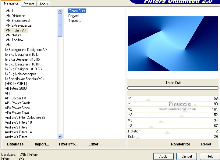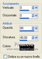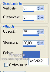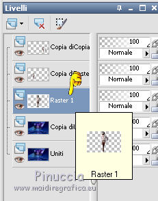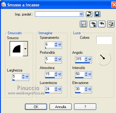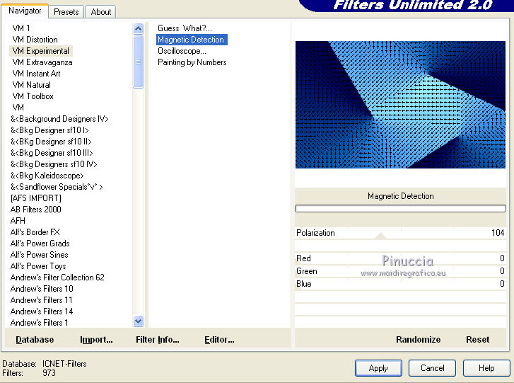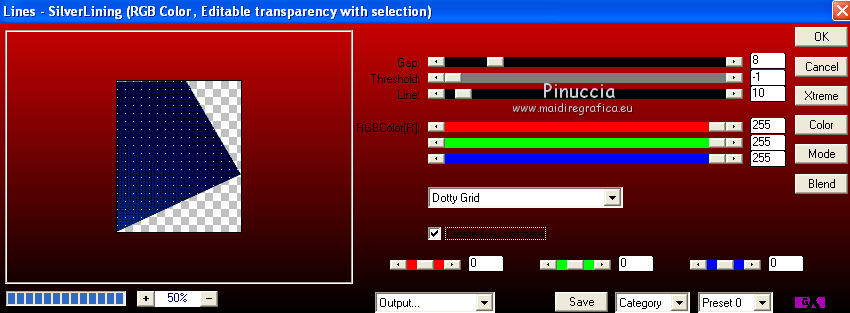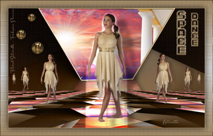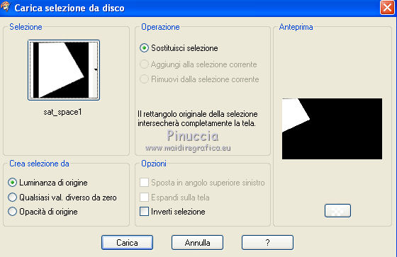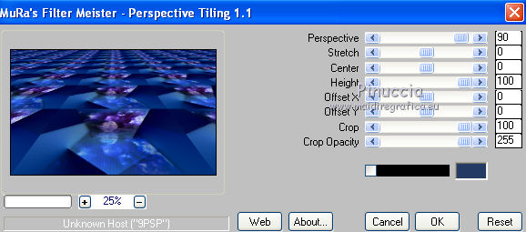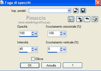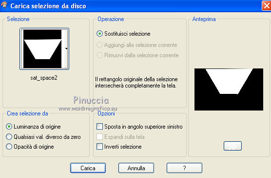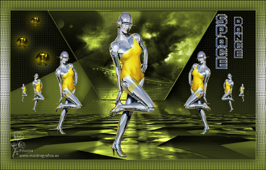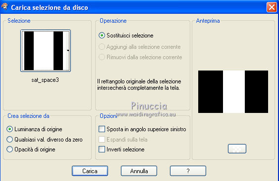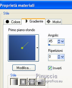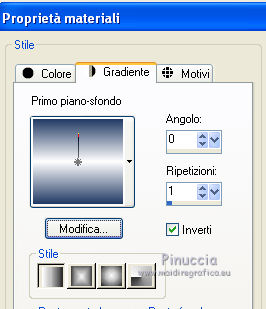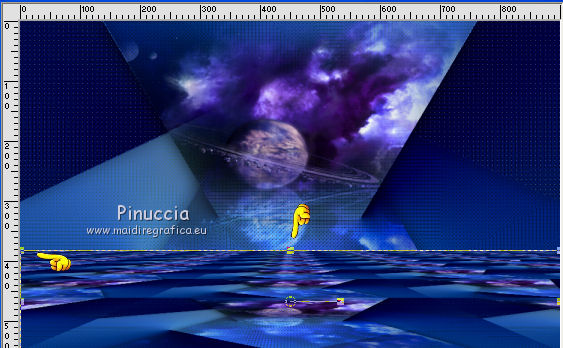 qui puoi trovare qualche risposta ai tuoi dubbi. Se l'argomento che ti interessa non è presente, ti prego di segnalarmelo. Questo tutorial è una creazione di Saturnella e non può essere copiato su altri siti nè essere offerto per il download. Lo stesso vale per la mia traduzione. E' anche proibito togliere il watermark dal materiale; rispettiamo il lavoro dei creatori di tubes, senza i quali non potremmo creare tutorials. Il tutorial è stato creato con PSP12 e tradotto con PSPX, ma può essere eseguito anche con le altre versioni. Dalla versione X4, il comando Immagine>Rifletti è stato sostituito con Immagine>Capovolgi in orizzontale, e il comando Immagine>Capovolgi con Immagine>Capovolgi in verticale. Nelle versioni X5 e X6, le funzioni sono state migliorate rendendo disponibile il menu Oggetti. Con la nuova versione X7, sono tornati Rifletti>Capovolgi, ma con nuove varianti. Vedi la scheda sull'argomento qui Occorrente: Materiale qui Il tube del paesaggio è di Corinne Vicaire. Il tube del personaggio è di Thafs. (in questa pagina trovi i links ai loro siti). Filtri in caso di dubbi, ricorda di consultare la mia sezione filtri qui Filters Unlimited 2.0 qui VM Intanst Art - Three Cuts qui Mura's Meister - Perspective Tiling qui VM Experimental - Magnetic Detection qui Alien Skin Eye Candy 5 Impact qui AP 01 Lines SilverLining qui I filtri della serie Visman (VM Experimental, VM Instant art) si possono usare da soli o importati in Filters Unlimited (come fare vedi qui) Se un filtro fornito appare con questa icona ![]() non esitare a cambiare modalità di miscelatura e opacità secondo i colori utilizzati. Nelle versioni più recenti di PSP non c'è il gradiente di primo piano/sfondo (Corel_06_029) Puoi usare i gradienti delle versioni precedenti. Trovi qui i gradienti Corel X. Metti le selezioni nella cartella Selezioni. 1. Imposta il colore di primo piano con #416abc, e il colore di sfondo con #223a64. ![]() Passa il colore di primo piano a Gradiente di primo piano/sfondo, stile Lineare, con i seguenti settaggi. ![]() 2. Apri una nuova immagine trasparente 900 x 550 pixels, e riempila con il gradiente.3. Effetti>Plugins>Filters Unlimited 2.0 - VM Instant ARt - Three Cuts. ![]() Se stai usando altri colori - poichè il colore standard di questo filtro è blu - dopo averlo applicato, usa il Viraggio per adattare il livello ai tuoi colori. Sul Viraggio vedi qui 4. Livelli>Duplica. Immagine>Rifletti. Cambia la modalità di miscelatura di questo livello in Moltiplica, e abbassa l'opacità al 50%. 5. Effetti>Plugins>Filters Unlimited 2.0 - VM Experimental - Magnetic Detection. ![]() 6. Selezione>Carica/Salva selezione>Carica selezione da disco. Cerca e carica la selezione sat_space1 ![]() Selezione>Innalza selezione a livello. 7. Effetti>Plugins>AP 01 Innovations - Lines SilverLining. ![]() 8. Effetti>Effetti 3D>Sfalsa ombra. ![]() Selezione>Deseleziona. 9. Livelli>Duplica. Immagine>Rifletti. Livelli>Unisci>Unisci giù. Abbassa l'opacità di questo livello al 50%. 10. Livelli>Nuovo livello raster. Selezione>Carica/Salva selezione>Carica selezione da disco. Cerca e carica la selezione sat_space2 ![]() 11. Apri il tube del paesaggio di Corinne Vicaire e vai a Modifica>Copia. Torna al tuo lavoro e vai a Modifica>Incolla nella selezione. Effetti>Effetti 3D>Sfalsa ombra, con i settaggi precedenti. Selezione>Deseleziona. 12. Livelli>Duplica. Immagine>Capovolgi. Cambia la modalità di miscelatura di questo livello in Luce netta, e abbassa l'opacità al 50%. 13. Livelli>Unisci>Unisci visibile. 14. Livelli>Duplica. 15. Effetti>Plugins>Mura's Meister - Perspective Tiling. ![]() 16. Se non visualizzi i righelli vai a Visualizza>Righelli. Premi il tasto D (valido per tutte le versioni di PSP) per attivare lo strumento Deformazione ![]() in modalità Scala, spingi in basso il nodo centrale superiore fino a 380 pixels circa. ![]() 17. Attiva il livello di sfondo. 18. Selezione>Carica/Salva selezione>Carica selezione da disco. Carica nuovamente la selezione sat_space2 ![]() 19. Selezione>Modifica>Seleziona bordature selezione. ![]() 20. Livelli>Nuovo livello raster. Riempi la selezione con il colore di sfondo.21. Effetti>Effetti 3D>Smusso a incasso. ![]() Selezione>Deseleziona. 22. Livelli>Unisci>Unisci visibile. Livelli>Duplica. 23. Apri il tube della donna di Thafs e vai a Modifica>Copia. Torna al tuo lavoro e vai a Modifica>Incolla come nuovo livello. Immagine>Ridimensiona, all'80%, tutti i livelli non selezionato. 24. Livelli>Duplica. Effetti>Effetti di riflesso>Fuga di specchi. ![]() 25. Selezione>Carica/Salva selezione>Carica selezione da disco. Cerca e carica la selezione sat_space3 ![]() Premi sulla tastiera il tasto CANC. Selezione>Deseleziona. 26. Attiva lo strumento Gomma ![]() e cancella sull'estrema destra il resto dell'effetto Fuga di specchi. ![]() Sposta il tube un po' più in basso,vedi l'esempio finale. 27. Effetti>Effetti 3D>Sfalsa ombra. ![]() 28. Livelli>Duplica. Immagine>Rifletti. 29. Attiva il livello del tube originale. ![]() 30. Livelli>Duplica, e attiva il livello sottostante dell'originale. 31. Effetti>Plugins>Alien Skin Eye Candy 5 Impact - Backlight. Seleziona il preset Forward Fog Streaks e ok. ![]() Cambia la modalità di miscelatura di questo livello in Sovrapponi. 32. Attiva il livello soprastante della copia. Effetti>Effetti 3D>Sfalsa ombra. ![]() 33. Attiva il livello superiore. Apri il tube déco_sat e vai a Modifica>Copia. Torna al tuo lavoro e vai a Modifica>Incolla come nuovo livello. Spostalo in alto a sinistra.34. Effetti>Effetti 3D>Sfalsa ombra, con il colore #b8d6e2. ![]() 35. Apri il file di testo "texte" e vai a Modifica>Copia. Torna al tuo lavoro e vai a Modifica>Incolla come nuovo livello. Spostalo in alto a destra.36. Firma il tuo lavoro. Livelli>Unisci>Unisci tutto. 37. Imposta il colore di primo piano con il colore bianco #ffffff, e mantieni il colore scuro come colore di sfondo. Passa il colore di primo piano a Gradiente, stile Lineare. ![]() 38. Imm