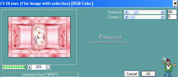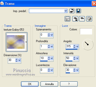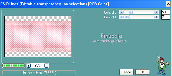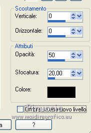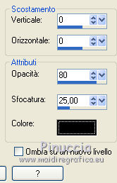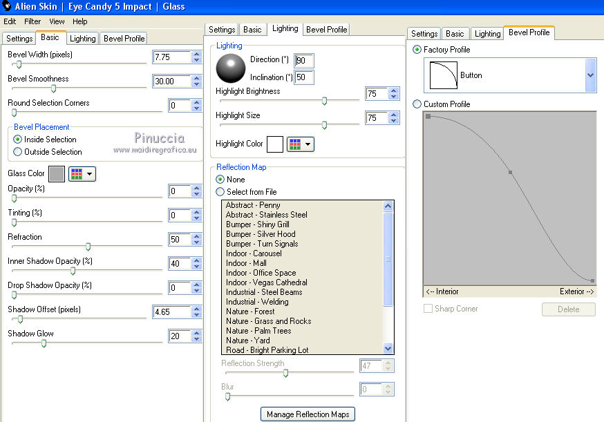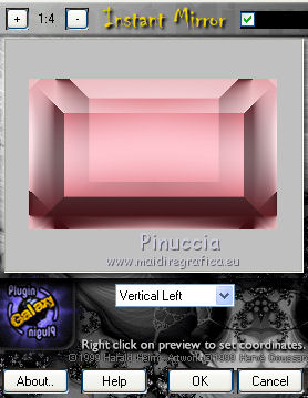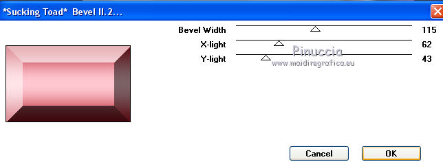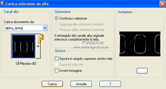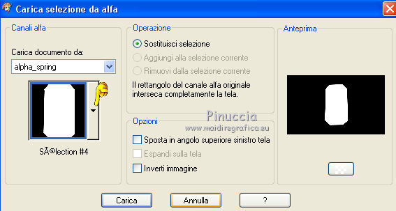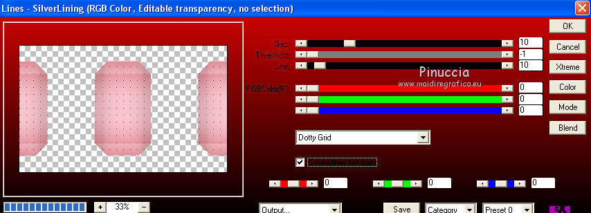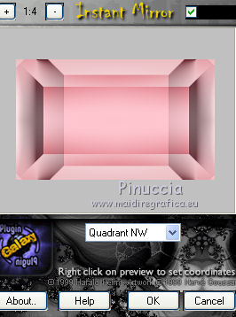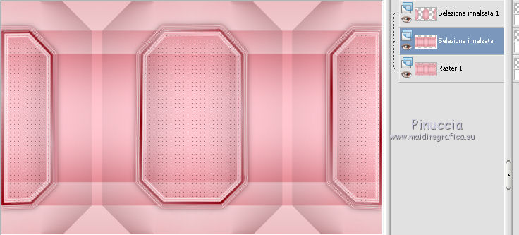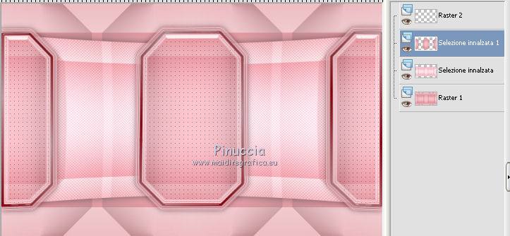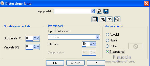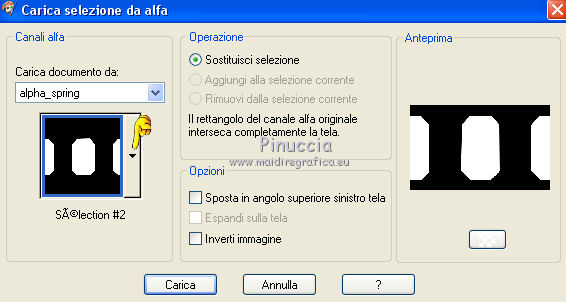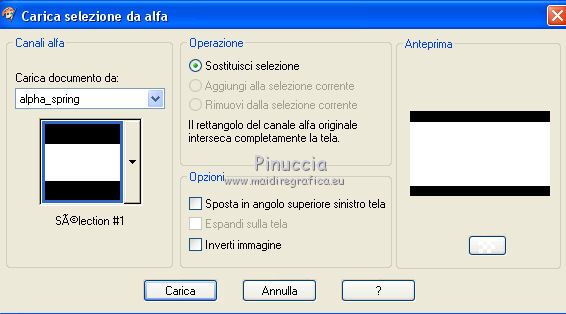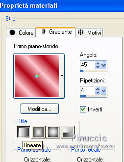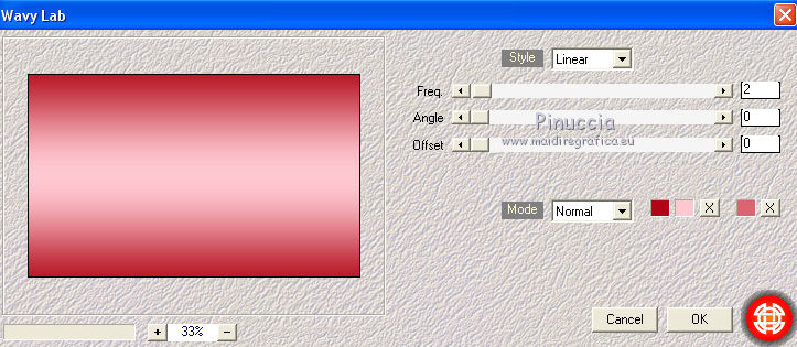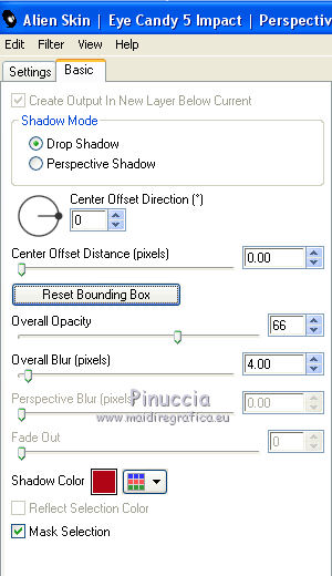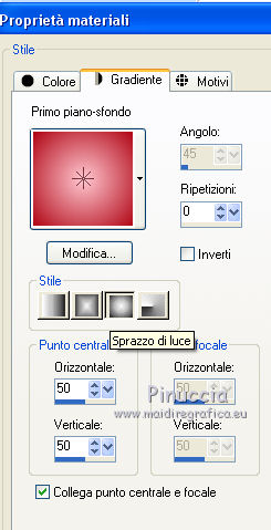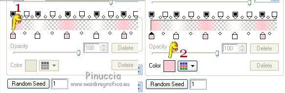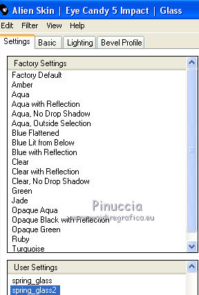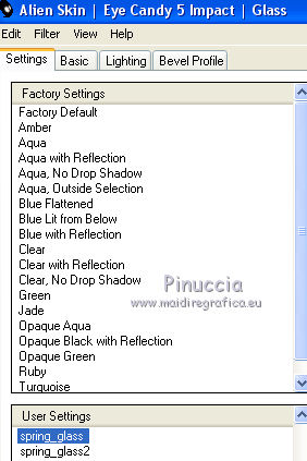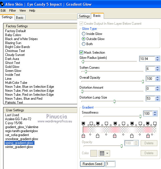 qui puoi trovare qualche risposta ai tuoi dubbi. Se l'argomento che ti interessa non è presente, ti prego di segnalarmelo. Questo tutorial è una creazione di Saturnella e non può essere copiato su altri siti nè essere offerto per il download. Lo stesso vale per la mia traduzione. E' anche proibito togliere il watermark dal materiale; rispettiamo il lavoro dei creatori di tubes, senza i quali non potremmo creare tutorials. Per tradurre questo tutorial, creato con X6, ho usato CorelX, ma può essere eseguito anche con le altre versioni di PSP. Dalla versione X4, il comando Immagine>Rifletti è stato sostituito con Immagine>Capovolgi in orizzontale, e il comando Immagine>Capovolgi con Immagine>Capovolgi in verticale. Nelle versioni X5 e X6, le funzioni sono state migliorate rendendo disponibile il menu Oggetti. Nel nuovo X7 sono tornati i comandi Immagine>Rifletti e Immagine>Capovolgi, ma con nuove funzioni. Vedi la scheda sull'argomento qui Occorrente: Materiale qui Grazie per i tubes Mica e Radyga, per la trama Gabry. (in questa pagina trovi i links ai loro siti). Filtri in caso di dubbi, ricorda di consultare la mia sezione filtri qui Filters Unlimited 2.0 qui Mehdi - Wavy Lab qui Carolaine and Sensibility - CS-DLines qui AP 01 [Innovations] - Lines SilverLining qui Toadies - Sucking Toad,Bevel II.2, What are you qui Plugin Galaxy - Instant Mirror qui Alien Skin Eye Candy 5 Impact - Perspective Shadow, Glass qui Simple - 4way average, Zoom out and flip qui Adjust - Variations qui I filtri Toadies e Simple si possono usare da soli o importati in Filters Unlimited (come fare vedi qui) Se un filtro fornito appare con questa icona ![]() non esitare a cambiare modalità di miscelatura e opacità secondo i colori utilizzati. Metti i preset Cliccando sul file una o due volte (a seconda delle tue impostazioni), automaticamente il preset si installerà nella cartella corretta. perchè uno o due clic vedi qui Metti la trama texture-Gabry-053 nella cartella Trame. Apri la maschera in PSP e minimizzala con il resto del materiale. 1. Imposta il colore di primo piano con #ffc8d1, e il colore di sfondo con #b00514. ![]() Passa il colore di primo piano a Gradiente di primo piano/sfondo, stile Lineare. ![]() 2. Apri alpha_springtime. Finestra>Duplica, o sulla tastiera maiuscola+D, per fare una copia. Chiudi l'originale. La copia, che sarà la base del tuo lavoro, non è vuota, ma contiene le selezioni salvate sul canale alfa. 3. Effetti>Plugins>Mehdi - Wavy Lab questo filtro lavora con i colori della paletta; il primo è il colore di sfondo, il secondo quello di primo piano mantieni il terzo colore creato dal filtro. ![]() 4. Effetti>Plugins>Toadies - Sucking Toad,Bevel II.2, con i settaggi standard. ![]() 5. Effetti>Effetti di immagine>Motivo unico. ![]() 6. Effetti>Plugins>The Plugin Site - Instant Mirror. il filtro Galaxy si posiziona nella lista sotto The Plugin Site ![]() Effetti>Plugins>The Plugin Site - Instant Mirror. ![]() 7. Effetti>Effetti di immagine>Motivo unico. ![]() 8. Selezione>Carica/Salva selezione>Carica selezione da canale alfa. La selezione sélection#1 è subito disponibile. Devi soltanto cliccare Carica. ![]() Selezione>Innalza selezione a livello. Selezione>Deseleziona. 9. Attiva il livello sottostante. ![]() Selezione>Carica/Salva selezione>Carica selezione da canale alfa. Apri il menu delle selezioni e carica sélection#2. ![]() Selezione>Innalza selezione a livello. Selezione>Deseleziona. Livelli>Disponi>Porta in alto. 10. Effetti>Plugins>AP 01 [Innovations] - Lines SilverLining. ![]() 11. Selezione>Carica/Salva selezione>Carica selezione da canale alfa. Apri il menu delle selezioni e carica sélection#3. ![]() Livelli>Nuovo livello raster. Riempi il livello con il gradiente.12. Effetti>Plugins>Alien Skin Eye Candy 5 Impact - Glass. Seleziona il preset spring_glass e ok. ![]() Questi i settaggi che puoi copiare in caso di problemi con il preset. ![]() 13. Effetti>Plugins>Alien Skin Eye Candy 5 Impact - Gradient Glow. Seleziona il preset spring_gradient-glow e ok. ![]() Se vuoi cambiare i colori, clicca sull'icona del "calamaio" (1) per attivare la paletta dei colori(2). ![]() Selezione>Deseleziona. Livelli>Unisci>Unisci giù. 14. Effetti>Plugins>Alien Skin Eye Candy 5 Impact - Perspective Shadow. Preset Drop Shadow Blurry, con i seguenti settaggi e con il tuo colore scuro. ![]() 15. Effetti>Effetti 3D>Sfalsa ombra. ![]() 16. Attiva il livello sottostante. ![]() Effetti>Plugins>Carolaine and Sensibility - CS-DLines. ![]() 17. Livelli>Duplica. Immagine>Rifletti. Abbassa l'opacità di questo livello al 50%. Livelli>Unisci>Unisci giù. 18. Effetti>Effetti di distorsione>Distorsione lente. ![]() 19. Effetti>Effetti 3D>Sfalsa ombra. ![]() 20. Attiva il livello superiore selezione innalzata 1. ![]() Selezione>Carica/Salva selezione>Carica selezione da canale alfa. Apri il menu delle selezioni e carica nuovamente sélection#2. ![]() Livelli>Nuovo livello raster. Effetti>Plugins>Alien Skin Eye Candy 5 Impact - Glass. Seleziona il preset spring_glass2 e ok. ![]() Questi i settaggi. ![]() Selezione>Deseleziona. 21. Attiva nuovamente il livello Selezione innalzata 1. ![]() Selezione>Carica/Salva selezione>Carica selezione da canale alfa. Apri il menu delle selezioni e carica sélection#4. ![]() 22. Apri il tube dei fiori di Radyga e vai a Modifica>Copia. Torna al tuo lavoro e vai a Modifica>Incolla come nuovo livello. Immagine>Ridimensiona, all'80%, tutti i livelli non selezionato. Posiziona correttamente il tube nella selezione.23. Selezione>inverti. Premi sulla tastiera il tasto CANC ![]() Selezione>Deseleziona. 24. Attiva il livello superiore. Livelli>Unisci>Unisci giù - 2 volte. 25. Apri il tube deco, e vai a Modifica>Copia. Torna al tuo lavoro e vai a Modifica>Incolla come nuovo livello. 26. Effetti>Effetti di immagine>Scostamento. ![]() 27. Effetti>Effetti 3D>Sfalsa ombra. ![]() 28. Attiva il livello di sfondo. Effetti>Effetti di trama>Trama - seleziona la trama texture-gabry05