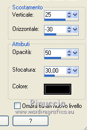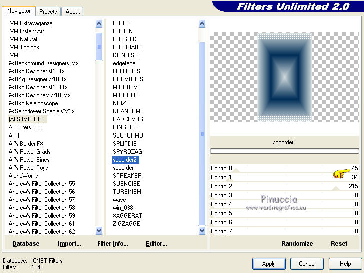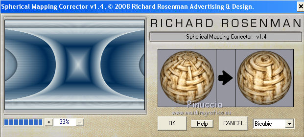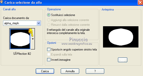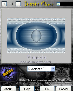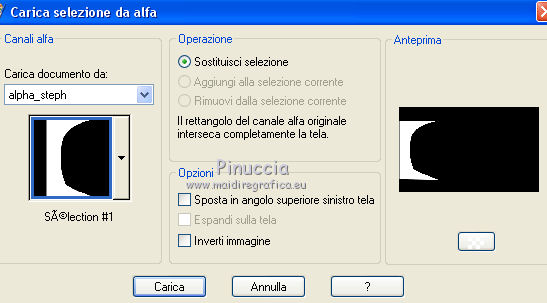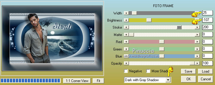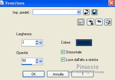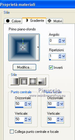 qui puoi trovare qualche risposta ai tuoi dubbi. Se l'argomento che ti interessa non è presente, ti prego di segnalarmelo. Questo tutorial è una creazione di Saturnella e non può essere copiato su altri siti nè essere offerto per il download. Lo stesso vale per la mia traduzione. E' anche proibito togliere il watermark dal materiale; rispettiamo il lavoro dei creatori di tubes, senza i quali non potremmo creare tutorials. Per tradurre questo tutorial, creato con PSP17, ho usato CorelX, ma può essere eseguito anche con le altre versioni di PSP. Dalla versione X4, il comando Immagine>Rifletti è stato sostituito con Immagine>Capovolgi in orizzontale, e il comando Immagine>Capovolgi con Immagine>Capovolgi in verticale. Nelle versioni X5 e X6, le funzioni sono state migliorate rendendo disponibile il menu Oggetti. Nel nuovo X7 sono tornati i comandi Immagine>Rifletti e Immagine>Capovolgi, ma con nuove funzioni. Vedi la scheda sull'argomento qui Occorrente: Materiale qui Per i tubes grazie Min@ e Beatriz. (in questa pagina trovi i links ai loro siti). Filtri in caso di dubbi, ricorda di consultare la mia sezione filtri qui Filters Unlimited 2.0 qui Plugin Galaxy - Instant Mirror qui AFS IMPORT - sqborder2 qui Richard Rosenman - Spherical Mapping Corrector qui AP01 Innovations - Lines SilverLining qui AAA Frames - Foto Frame qui I filtri AFS IMPORT si possono usare da soli o importati in Filters Unlimited (come fare vedi qui) Se un filtro fornito appare con questa icona ![]() non esitare a cambiare modalità di miscelatura e opacità secondo i colori utilizzati. Nelle ultime versioni di PSP non c'è il gradiente di primo piano/sfondo (Corel_06_029) Trovi i gradienti delle versioni precedenti qui Metti la trama nella cartella Trame. 1. Imposta il colore di primo piano con il colore scuro #002e58, e il colore di sfondo con il colore chiaro #d2dcde. ![]() Passa il colore di primo piano a Gradiente di primo piano/sfondo, stile Rettangolare. ![]() 2. Apri alpha_steph. Finestra>Duplica, o sulla tastiera maiuscola+D, per fare una copia. ![]() Chiudi l'originale. La copia, che sarà la base del tuo lavoro, non è vuota, ma contiene le selezioni salvate sul canale alfa. Riempi l'immagine trasparente con il gradiente.3. Livelli>Duplica. Immagine>Ruota per gradi - 90 gradi a sinistra. ![]() 4. Immagine>Ridimensiona, al 60%, tutti i livelli non selezionato. Regola>Messa a fuoco>Metti a fuoco. 5. Effetti>Plugins>Filters Unlimited 2.0 - AFS IMPORT - sqborder2. ![]() 6. Attiva il livello inferiore (raster 1). Effetti>Effetti di trama>Veneziana, con il colore scuro. ![]() Livelli>Unisci>Unisci visibile. 7. Livelli>Duplica. Immagine>Ridimensiona, all'83%, tutti i livelli non selezionato. Regola>Messa a fuoco>Metti a fuoco. 8. Effetti>Effetti 3D>Sfalsa ombra, colore nero. ![]() Livelli>Unisci>Unisci visibile. 9. Effetti>Plugins>Richard Rosenman - Spherical Mapping Corrector. ![]() 10. Effetti>Plugins>The Plugin Site - Instant Mirror Il filtro Plugin Galaxy nella lista dei filtri si posiziona sotto The Plugin Site. ![]() 11. Selezione>Carica/Salva selezione>Carica selezione da canale alfa. La selezione sélection#1 è subito disponibile. Devi soltanto cliccare Carica. ![]() Selezione>Innalza selezione a livello. Selezione>Deseleziona. 12. Effetti>Plugins>AP 01 Innovations - Lines SilverLining. ![]() Cambia la modalità di miscelatura di questo livello in Moltiplica, o secondo i tuoi colori. 13. Livelli>Duplica. Immagine>Rifletti. Livelli>Unisci>Unisci giù. 14. Selezione>Carica/Salva selezione>Carica selezione da canale alfa. Apri il menu delle selezioni e carica Selection#2. ![]() Livelli>Nuovo livello raster. Apri il tube del paesaggio di Beatriz 1255-moon_misted8_LB TUBES, e vai a Modifica>Copia. Torna al tuo lavoro e vai a Modifica>Incolla nella selezione. Selezione>Deseleziona. 15. Apri il tube deco e vai a Modifica>Copia. Torna al tuo lavoro e vai a Modifica>Incolla come nuovo livello. Lascialo come sta. E' al suo posto. Cambia la modalità di miscelatura di questo livello in Luminanza (esistente) (o secondo i tuoi colori) e abbassa l'opacità all'80%. 16. Apri il tube dell'uomo Min@-Joao.25.02.15, e vai a Modifica>Copia. Torna al tuo lavoro e vai a Modifica>Incolla come nuovo livello. Immagine>Ridimensiona, al 55%, tutti i livelli non selezionato. Regola>Messa a fuoco>Metti a fuoco. Spostalo un po' più a sinistra.17. Effetti>Effetti 3D>Sfalsa ombra, colore nero. ![]() 18. Apri il tube texte, e vai a Modifica>Copia. Torna al tuo lavoro e vai a Modifica>Incolla come nuovo livello. Spostalo in alto a destra.19. Effetti>Effetti 3D>Sfalsa ombra, colore bianco. ![]() 20. Attiva il livello di sfondo. Modifica>Copia. 21. Immagine>Aggiungi bordatura, 1 pixel, simmetriche, con il colore scuro. Immagine>Aggiungi bordatura, 3 pixels, simmetriche, colore bianco. Immagine>Aggiungi bordatura, 1 pixel, simmetriche, colore scuro. Immagine>Aggiungi bordatura, 50 pixels, simmetriche, colore bianco. 22. Attiva lo strumento Bacchetta magica ![]() e clicca nel bordo bianco da 50 pixels per selezionarlo. Modifica>Incolla nella selezione. 23. Regola>Sfocatura>Sfocatura gaussiana - raggio 40. ![]() 24. Effetti>Effetti di trama>Trama - seleziona la trama Winni.texture, con i seguenti settaggi. ![]() 25. Effetti>Pluglns>AAA Frames - Foto Frame prima seleziona Dark with gray shadow, e poi cambia i due settaggi superiori. ![]() 26. Selezione>Inverti. Effetti>Effetti 3D>Sfalsa ombra. ![]() Selezione>Deseleziona. 27. Firma il tuo lavoro su un nuovo livello. Immagine>Aggiungi bordatura, 1 pixel, simmetriche, colore nero. 28. Immagine>Ridimensiona, 900 pixels di larghezza, tutti i livelli selezionato. Regola>Messa a fuoco>Maschera di contrasto. ![]() Salva in formato jpg. Il tube di questo esempio è di Min@ ![]() Le vostre versioni. Grazie ![]() Olimpia ![]() Rossella ![]() Seval ![]() Rom ![]() Trovi la mia mail nella barra superiore del menu. Puoi scrivermi per qualsiasi problema, o dubbio se trovi un link che non funziona, o an