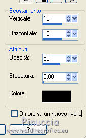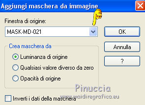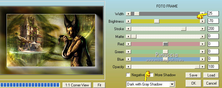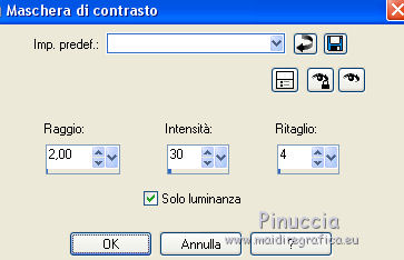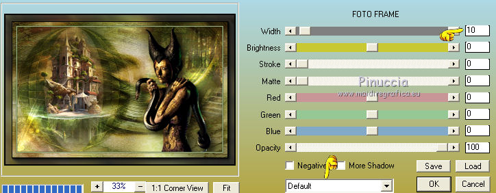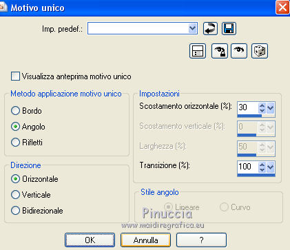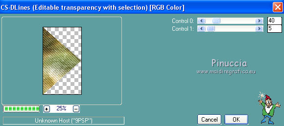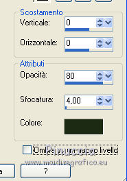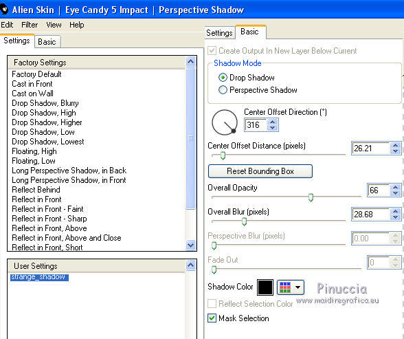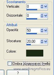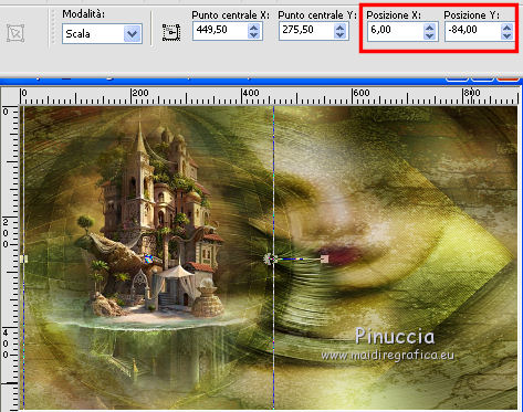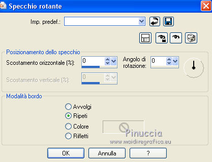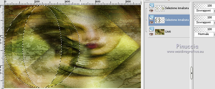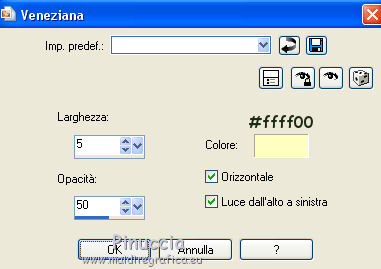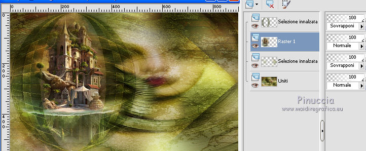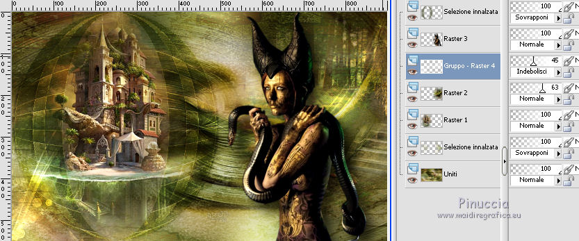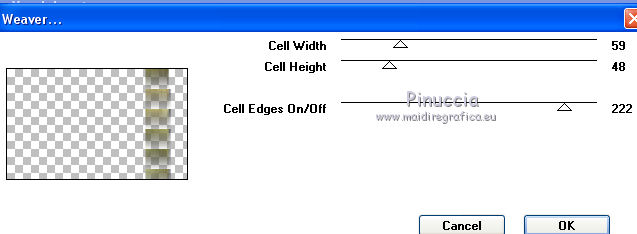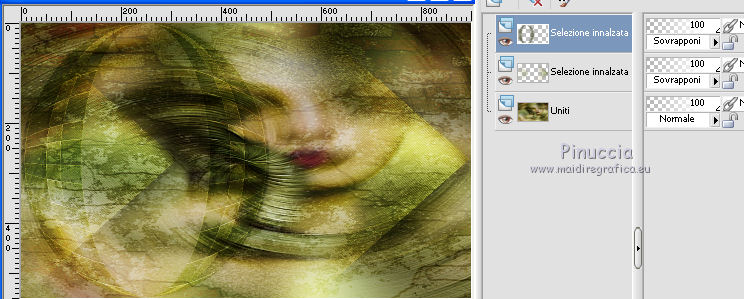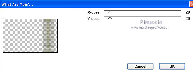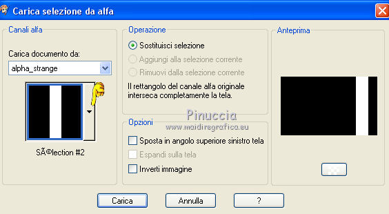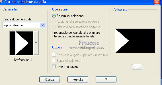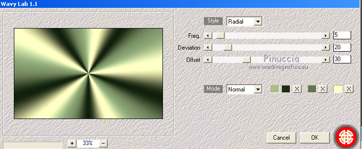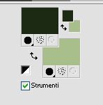 qui puoi trovare qualche risposta ai tuoi dubbi. Se l'argomento che ti interessa non è presente, ti prego di segnalarmelo. Questo tutorial è una creazione di Saturnella e non può essere copiato su altri siti nè essere offerto per il download. Lo stesso vale per la mia traduzione. E' anche proibito togliere il watermark dal materiale; rispettiamo il lavoro dei creatori di tubes, senza i quali non potremmo creare tutorials. Per tradurre questo tutorial, creato con Corel19, ho usato CorelX, ma può essere eseguito anche con le altre versioni di PSP. Dalla versione X4, il comando Immagine>Rifletti è stato sostituito con Immagine>Capovolgi in orizzontale, e il comando Immagine>Capovolgi con Immagine>Capovolgi in verticale. Nelle versioni X5 e X6, le funzioni sono state migliorate rendendo disponibile il menu Oggetti. Nel nuovo X7 sono tornati i comandi Immagine>Rifletti e Immagine>Capovolgi, ma con nuove funzioni. Vedi la scheda sull'argomento qui Occorrente: Materiale qui Grazie: per i tubes Jeanne, Thafs e Krys; per la maschera MD. (in questa pagina trovi i links ai loro siti). Filtri in caso di dubbi, ricorda di consultare la mia sezione filtri qui Filters Unlimited 2.0 qui Mehdi - Wavy Lab 1.1 qui Carolaine and Sensibility - CS-DLine qui Toadies - Weaver, What are you qui Alien Skin Eye Candy 5 Impact - Perspective Shadow qui AAA Frames - Foto Frame qui I filtri Toadies si possono usare da soli o importati in Filters Unlimited (come fare vedi qui) Se un filtro fornito appare con questa icona ![]() non esitare a cambiare modalità di miscelatura e opacità secondo i colori utilizzati. Metti il preset Cliccando sul file una o due volte (a seconda delle tue impostazioni), automaticamente il preset si installerà nella cartella corretta. perchè uno o due clic vedi qui Se preferisci, puoi importare direttamente il preset nel corso del tutorial Come fare vedi la scheda del filtro Eye Candy qui Apri la maschera in PSP e minimizzala con il resto del materiale. 1. Imposta il colore di primo piano con il colore scuro #1d2b14, e il colore di sfondo con il colore chiaro #a8bf8b. ![]() Apri alpha_strange. Finestra>Duplica (o sulla tastiera maiuscola+D) per fare una copia. ![]() Chiudi l'originale. La copia, che sarà la base del tuo lavoro, non è vuota, ma contiene le selezioni salvate sul canale alfa. 2. Effetti>Plugins>Mehdi - Wavy Lab 1.1. Questo filtro lavora con i colori della paletta: il primo è il colore di sfondo, il secondo quello di primo piano; degli ultimi due colori creati dal filtro, cambia soltanto il quarto colore con #ffffc0. ![]() 3. Regola>Sfocatura>Sfocatura gaussiana - raggio 50. ![]() 4. Livelli>Nuovo livello raster. Selezione>Seleziona tutto. Apri il tube della donna di Jeanne, cancella il watermark, e vai a Modifica>Copia. Torna al tuo lavoro e vai a Modifica>Incolla nella selezione. Selezione>Deseleziona. 5. Effetti>Effetti di immagine>Motivo unico, con i settaggi standard. ![]() 6. Regola>Sfocatura>Sfocatura radiale. ![]() Effetti>Effetti di bordo>Aumenta di più. Livelli>Unisci>Unisci giù. 7. Livelli>Nuovo livello raster. Selezione>Seleziona tutto. Apri l'immagine background10_saturnella e vai a Modifica>Copia. Torna al tuo lavoro e vai a Modifica>Incolla nella selezione. Selezione>Deseleziona. Cambia la modalità di miscelatura di questo livello in Luce diffusa. Regola>Messa a fuoco>Accentua messa a fuoco. Livelli>Unisci>Unisci visibile. 8. Selezione>Carica/Salva selezione>Carica selezione da canale alfa. La selezione sélection#1 è subito disponibile. Devi soltanto cliccare Carica. ![]() Selezione>Innalza selezione a livello. 9. Effetti>Plugins>Carolaine and Sensibility - CS-DLines. ![]() Regola>Messa a fuoco>Metti a fuoco. 10. Effetti>Effetti 3D>Sfalsa ombra. ![]() Selezione>Deseleziona. 11. Effetti>Effetti di immagine>Motivo unico. ![]() Cambia la modalità di miscelatura di questo livello in Sovrapponi. 12. Attiva il livello inferiore. Selezione>Carica/Salva selezione>Carica selezione da canale alfa. Apri il menu delle selezioni e carica sélection#2. ![]() Selezione>Innalza selezione a livello. Effetti>Effetti di trama>Veneziana - colore #ffffc0. ![]() Effetti>Effetti 3D>Sfalsa ombra. ![]() Selezione>Deseleziona. 13. Effetti>Plugins>Toadies - Weaver. ![]() 14. Effetti>Plugins>Toadies - What are you. ![]() Effetti>Effetti di bordo>Aumenta di più. 15. Effetti>Effetti di riflesso>Specchio rotante. ![]() 16. Effetti>Effetti geometrici>Cerchio. ![]() Oggetti>Allinea>Sinistra oppure premi il tasto K per attivare lo strumento Puntatore ![]() e imposta Posizione X: 0,00 e Posizione Y: 0,0. ![]() Premi il tasto M per deselezionare lo strumento. 17. Selezione>Seleziona tutto. Selezione>Mobile. Selezione>Immobilizza. Cambia la modalità di miscelatura di questo livello in Sovrapponi. ![]() Effetti>Effetti 3D>Sfalsa ombra, con il colore scuro. ![]() Selezione>Deseleziona. Livelli>Disponi>Porta in alto. ![]() 18. Apri il tube del paesaggio di Thafs e vai a Modifica>Copia. Torna al tuo lavoro e vai a Modifica>Incolla come nuovo livello. Immagine>Ridimensiona, all'80%, tutti i livelli non selezionato. Regola>Messa a fuoco>Metti a fuoco. Oggetti>Allinea>Sinistra. oppure Tasto K per attivare lo strumento Puntatore ![]() e imposta Posizione X: 6,00 e Posizione Y: -84,0. ![]() Premi il tasto M per deselezionare lo strumento. Livelli>Disponi>Sposta giù. ![]() 19. Apri il tube del paesaggio di Krys e vai a Modifica>Copia. Torna al tuo lavoro e vai a Modifica>Incolla come nuovo livello. Cancella la firma. Immagine>Rifletti. Sposta il tube a destra.![]() Io ho abbassato l'opacità di questo livello al 63%. 20. Apri il tube della donna di Thafs e vai a Modifica>Copia. Torna al tuo lavoro e vai a Modifica>Incolla come nuovo livello. Immagine>Ridimensiona, all'80%, tutti i livelli non selezionato. Regola>Messa a fuoco>Metti a fuoco. Sposta il tube a destra.21. Effetti>Plugins>Alien Skin Eye Candy 5 Impact - Perspective Shadow. Seleziona il preset strange-shadow e ok. Questi i settag