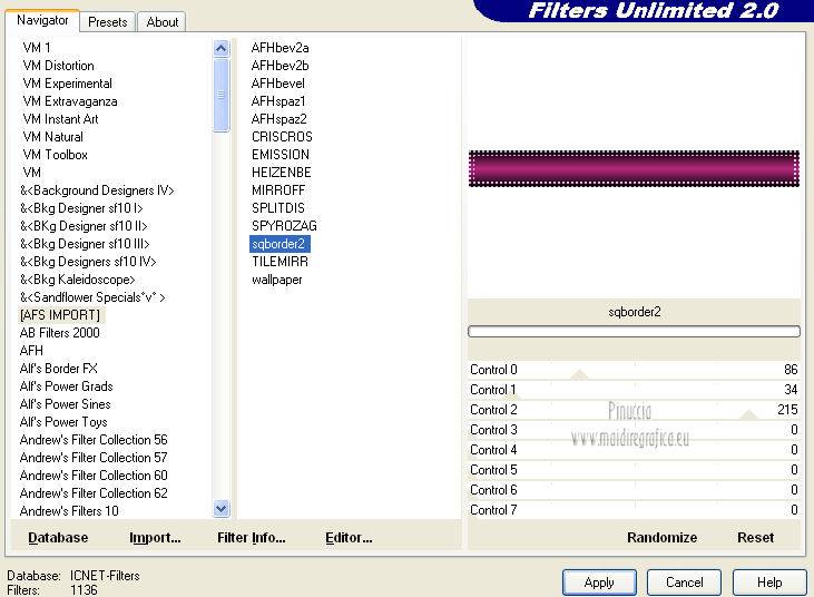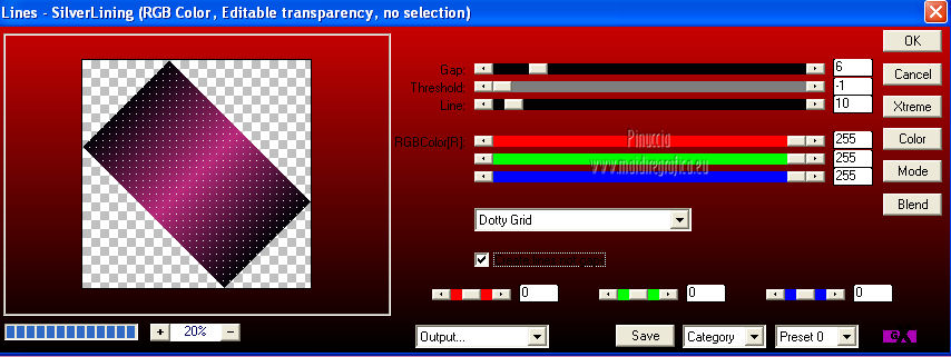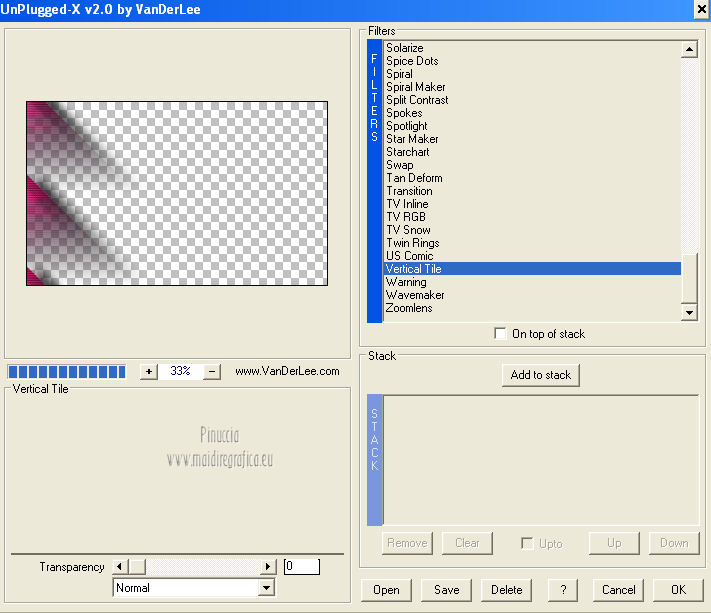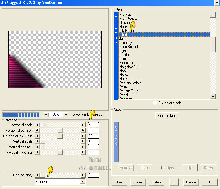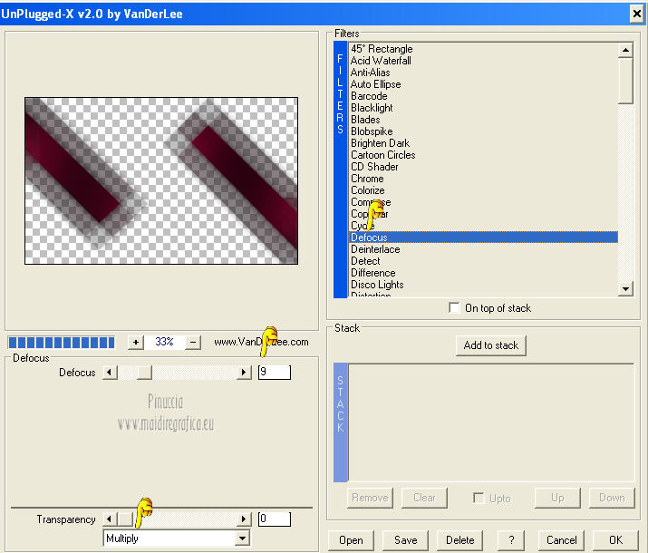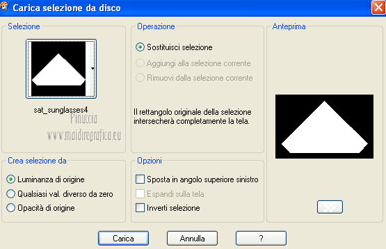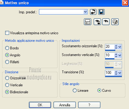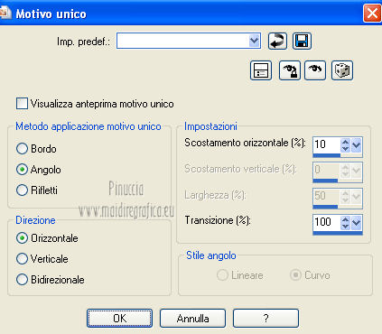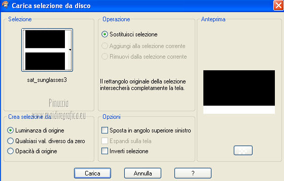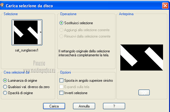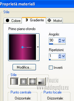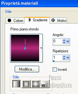 qui puoi trovare qualche risposta ai tuoi dubbi. Se l'argomento che ti interessa non è presente, ti prego di segnalarmelo. Questo tutorial è una creazione di Saturnella e non può essere copiato su altri siti nè essere offerto per il download. Lo stesso vale per la mia traduzione. E' anche proibito togliere il watermark dal materiale; rispettiamo il lavoro dei creatori di tubes, senza i quali non potremmo creare tutorials. Questo tutorial è stato creato con PSP 12, ma può essere eseguito anche con le altre versioni di PSP. Per tradurlo ho usato PSP X. Occorrente: Materiale qui I tubes sono di Syl e CorinneVicaire. Grazie a tutti per il vostro magnifico lavoro. (in questa pagina trovi i links ai loro siti). Filtri in caso di dubbi, ricorda di consultare la mia sezione filtri qui AP01 [Innovations] - Mirror Reflections qui AFS Import qui Simple qui VanDerLee - Unplugged X qui ![]() non esitare a cambiare modalità di miscelatura e opacità secondo i colori utilizzati. Metti le selezioni nella cartella Selezioni. 1. Imposta il colore di primo piano con #000006, e il colore di sfondo con #b8297b. ![]() Passa il colore di primo piano a Gradiente, stile Lineare. ![]() Apri una nuova immagine trasparente 900 x 550 pixels, e riempila con il gradiente.2. Livelli>Duplica. Immagine>Ruota per gradi - 45 gradi a destra. ![]() 3. Effetti>Plugins>AP01 [Innovations] - Lines SilverLining. ![]() 4. Effetti>Effetti di immagine>Motivo unico. ![]() 5. Effetti>Effetti 3D>Sfalsa ombra. ![]() 6. Livelli>Duplica. Immagine>Rifletti. Immagine>Capovolgi. Cambia la modalità di miscelatura di questo livello in Luce netta (o secondo i tuoi colori), e abbassa l'opacità al 50%. Livelli>Unisci>Unisci visibile. 7. Selezione>Carica/Salva selezione>Carica selezione da disco. Cerca e carica la selezione sat_sunglasses1. ![]() Selezione>Innalza selezione a livello. Selezione>Deseleziona. Effetti>Effetti 3D>Sfalsa ombra. ![]() 8. Effetti>Plugins>VanDerLee Unplugged X - Defocus. ![]() Cambia la modalità di miscelatura di questo livello in Moltiplica, e abbassa l'opacità al 50%. Livelli>Unisci>Unisci visibile. 9. Selezione>Carica/Salva selezione>Carica selezione da disco. Cerca e carica la selezione sat_sunglasses2. ![]() Selezione>Innalza selezione a livello. Selezione>Deseleziona. Effetti>Effetti 3D>Sfalsa ombra. ![]() 10. Effetti>Plugins>VanDerLee - Unplugged X - Interlace. ![]() 11. Effetti>Plugins>VanDerLee - Unplugged X - Vertical Tile. ![]() 12. Livelli>Duplica. Immagine>Rifletti. Livelli>Unisci>Unisci giù. Abbassa l'opacità di questo livello al 70%. Livelli>Unisci>Unisci visibile. 13. Livelli>Duplica. 14. Effetti>Plugins>Simple - Blintz. Modifica>Ripeti Blintz. 15. Selezione>Carica/Salva selezione>Carica selezione da disco. Cerca e carica la selezione sat_sunglasses3. ![]() 16. Livelli>Nuovo livello raster. Cambia i settaggi del gradiente. ![]() Riempi la selezione con il gradiente.17. Effetti>Plugins>Filters Unlimited 2.0 - AFS Import - sqborder2. ![]() Selezione>Deseleziona. 18. Effetti>Effetti di immagine>Motivo unico. ![]() Cambia la modalità di miscelatura di questo livello in Indebolisci, e abbassa l'opacità all'85%. Livelli>Unisci>Unisci visibile. Modifica>Copia. 19. Immagine>Aggiungi bordatura, 2 pixels, simmetriche, con il colore chiaro. Immagine>Aggiungi bordatura, 2 pixels, simmetriche, con il colore scuro. Immagine>Aggiungi bordatura, 50 pixels, simmetriche, con il colore chiaro. 20. Seleziona il bordo da 50 pixels con la bacchetta magica ![]() 21. Livelli>Nuovo livello raster. Modifica>Incolla nella selezione. Selezione>Deseleziona. 22. Effetti>Plugins>Simple - 4Way average. Livelli>Unisci>Unisci visibile. 23. Selezione>Seleziona tutto. Selezione>Modifica>Contrai - 50 pixels. 24. Effetti>Effetti 3D>Sfalsa ombra. ![]() 25. Immagine>Aggiungi bordatura, 2 pixel, simmetriche, con il colore chiaro. Immagine>Aggiungi bordatura, 2 pixels, simmetriche, con il colore scuro. 26. Selezione>Carica/Salva selezione>Carica selezione da disco. Cerca e carica la selezione sat_sunglasses4. ![]() 27. Livelli>Nuovo livello raster. 28. Apri il tube del paesaggio di CorinneVicaire e vai a Modifica>Copia. Torna al tuo lavoro e vai a Modifica>Incolla nella selezione. Cambia la modalità di miscelatura di questo livello in Luminanza (esistente). Selezione>Deseleziona. 29. Apri il tube di Syl e vai a Modifica>Copia. Torna al tuo lavoro e vai a Modifica>Incolla come nuovo livello. Sposta il tube a sinistra.30. Effetti>Effetti 3D>Sfalsa ombra. ![]() 31. Apri il tube "texte" e vai a Modifica>Copia. Torna al tuo lavoro e vai a Modifica>Incolla come nuovo livello. Sposta il testo come nel mio esempio.32. Aggiungi il tuo nome e/o il tuo watermark su un nuovo livello. 33. Immagine>Aggiungi bordatura, 2 pixels, simmetriche, con il colore chiaro. Immagine>Aggiungi bordatura, 1 pixel, simmetriche, con il colore scuro. Immagine>Ridimensiona, a 900 pixels di larghezza, tutti i livelli selezionato. Salva in formato jpg. Per questo esempio ho tubes di Maryse e Luna. ![]() Per questo esempio ho usato tubes di Anna.br. ![]() ![]() Se hai problemi o dubbi, o trovi un link non funzionante, o anche soltanto per dirmi che ti è piaciuto, scrivimi. 1 Agosto 2012 |