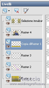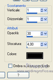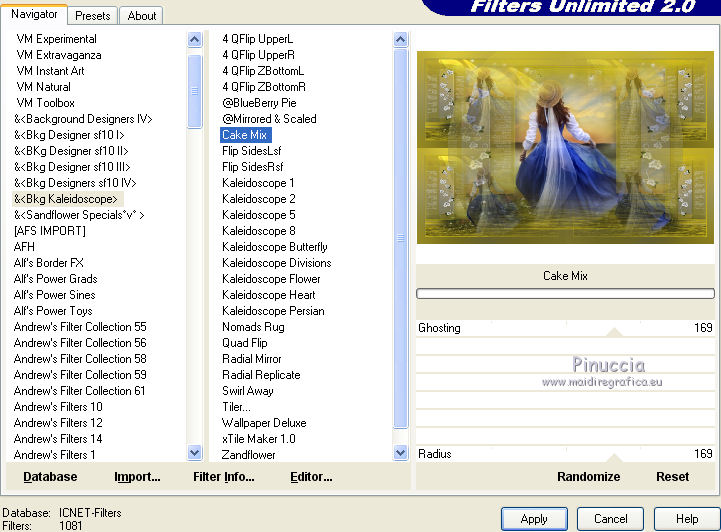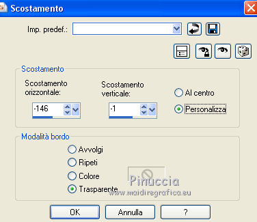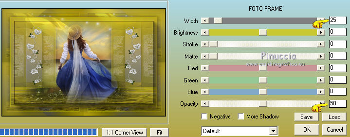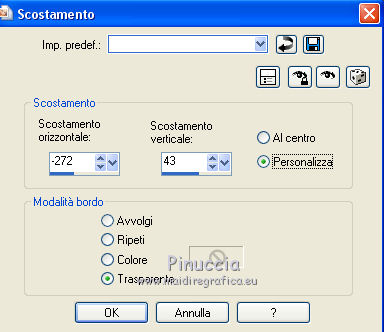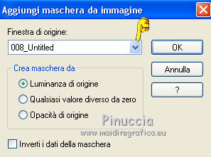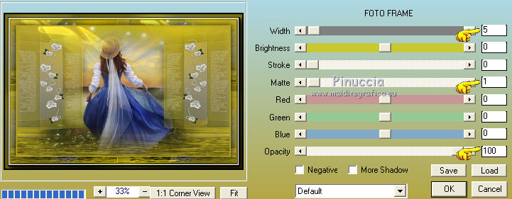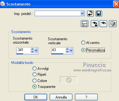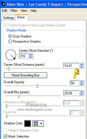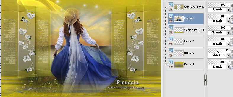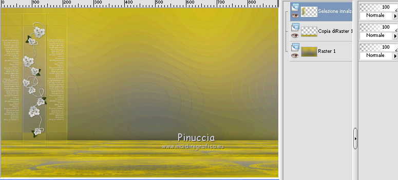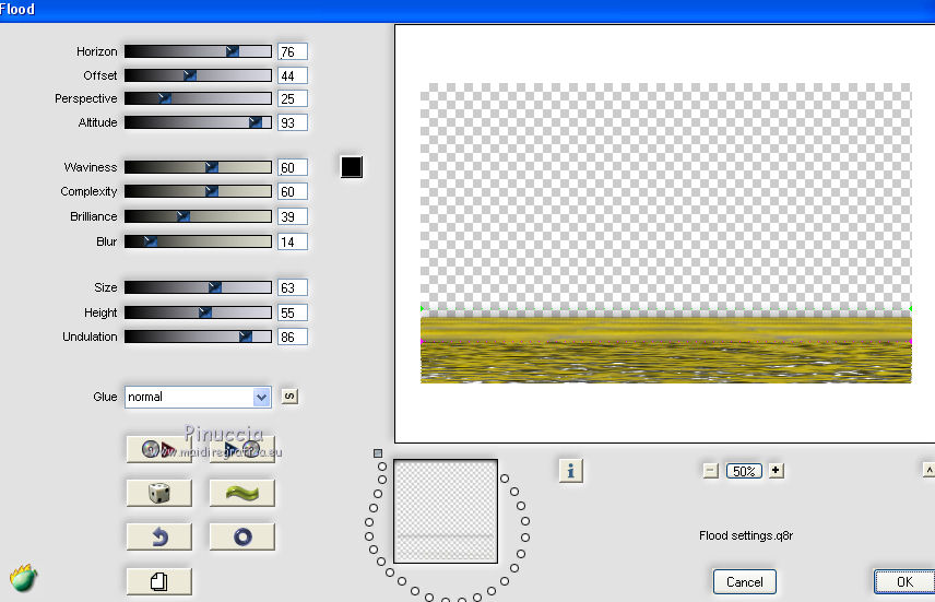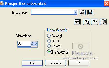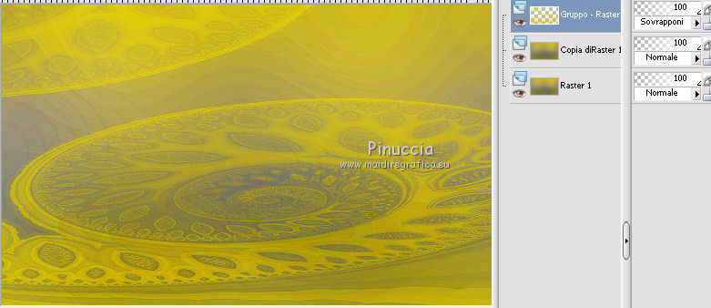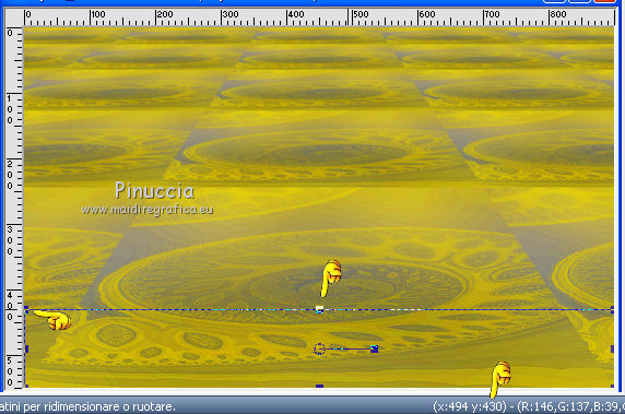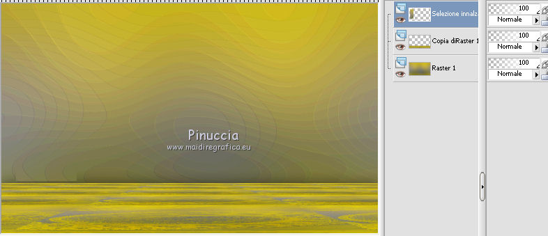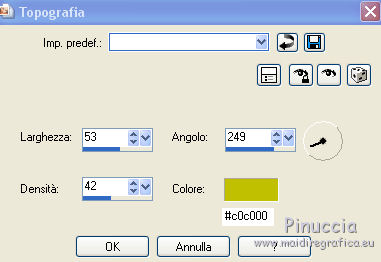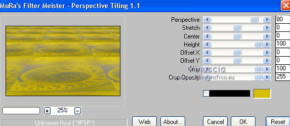 qui puoi trovare qualche risposta ai tuoi dubbi. Se l'argomento che ti interessa non è presente, ti prego di segnalarmelo. Questo tutorial è una creazione di Saturnella e non può essere copiato su altri siti nè essere offerto per il download. Lo stesso vale per la mia traduzione. E' anche proibito togliere il watermark dal materiale; rispettiamo il lavoro dei creatori di tubes, senza i quali non potremmo creare tutorials. Per tradurre questo tutorial, creato con X15, ho usato CorelX, ma può essere eseguito anche con le altre versioni di PSP. Dalla versione X4, il comando Immagine>Rifletti è stato sostituito con Immagine>Capovolgi in orizzontale, e il comando Immagine>Capovolgi con Immagine>Capovolgi in verticale. Nelle versioni X5 e X6, le funzioni sono state migliorate rendendo disponibile il menu Oggetti. Vedi la scheda sull'argomento qui Occorrente: Materiale qui Il tube del personaggio è di Montana Kate. (in questa pagina trovi i links ai loro siti). Filtri in caso di dubbi, ricorda di consultare la mia sezione filtri qui Filters Unlimited 2.0 qui Toadies - What are you qui Mura's Meister - Perspective Tiling qui Mura's Seamless - Emboss at alpha qui Alien Skin Eye Candy 5 Impact - Perspective Shadow qui Xero - Improver qui Flaming Pear - Flood qui &<Bkg Kaleidoscope - Cake Mix (da importare in Unlimited qui AAA Frames - Foto Frame qui I filtri Toadies e Mura's Seamless si possono usare da soli o importati in Filters Unlimited (come fare vedi qui) Se un filtro fornito appare con questa icona ![]() non esitare a cambiare modalità di miscelatura e opacità secondo i colori utilizzati. Apri la maschera in PSP e minimizzala con il resto del materiale. 1. Imposta il colore di primo piano con #78764c, e il colore di sfondo con #d4be06. ![]() Apri alpha_sunshine. Finestra>Duplica, o sulla tastiera maiuscola+D, per fare una copia. Chiudi l'originale. La copia, che sarà la base del tuo lavoro, non è vuota, ma contiene una selezione salvata sul canale alfa. Rinomina il livello Raster 1. 2. Riempi il livello con il colore di sfondo.3. Selezione>Seleziona tutto. Apri il tube del personaggio e vai a Modifica>Copia. non chiuderlo perchè ti servirà ancora Torna al tuo lavoro e vai a Modifica>Incolla nella selezione. Selezione>Deseleziona. 4. Effetti>Effetti di immagine>Motivo unico, Fianco a fianco. ![]() 5. Regola>Sfocatura>Sfocatura gaussiana - raggio 100. ![]() 6. Effetti>Effetti artistici>Topografia - colore #c0c000. ![]() 7. Livelli>Duplica. 8. Livelli>Nuovo livello raster. Riempi con il colore di sfondo.Livelli>Nuovo livello maschera>Da immagine. Apri il menu sotto la finestra di origine e vedrai la lista dei files aperti. Carica la maschera 008_untitled, con i seguenti settaggi. ![]() Effetti>Effetti di bordo>Aumenta. Livelli>Unisci>Unisci gruppo. 9. Immagine>Capovolgi. Cambia la modalità di miscelatura di questo livello in Sovrapponi, o secondo i tuoi colori. ![]() Livelli>Unisci>Unisci giù. 10. Effetti>Plugins>Mura's Meister - Perspective Tiling. ![]() 11. Premi il tasto K per attivare lo strumento Puntatore ![]() se stai usando PSP 9 il tasto D per attivare lo strumento Deformazione ![]() in modalità Scala , spingi il nodo superiore centrale verso il basso fino a 430 pixels,nella barra inferiore puoi controllare la posizione. (se non visualizzi i Righelli, vai a Visualizza>Righelli) ![]() Premi il tasto M per deselezionare lo strumento. 12. Effetti>Effetti 3D>Sfalsa ombra. ![]() 13. Attiva il livello di sfondo. Selezione>Carica/Salva selezione>Carica selezione da canale alfa. La selezione sélection#1 è subito disponibile. Devi soltanto cliccare Carica. ![]() Selezione>Innalza selezione a livello. Selezione>Deseleziona. Livelli>Disponi>Porta in alto. per il momento non vedrai nulla ![]() 14. Effetti>Plugins>Toadies - What are you, con i settaggi standard. ![]() Effetti>Effetti di bordo>Aumenta. 15. Apri il tube fleurette e vai a Modifica>Copia. Torna al tuo lavoro e vai a Modifica>Incolla come nuovo livello. Immagine>Ridimensiona, al 50%, tutti i livelli non selezionato. 16. Effetti>Effetti di immagine>Scostamento. ![]() 17. Effetti>Effetti 3D>Sfalsa ombra. ![]() 18. Apri il tube texte 1 e vai a Modifica>Copia. Torna al tuo lavoro e vai a Modifica>Incolla come nuovo livello. Immagine>Ridimensiona, al 30%, tutti i livelli non selezionato. 19. Effetti>Effetti di immagine>Scostamento. ![]() 20. Livelli>Duplica. Effetti>Effetti di immagine>Scostamento. ![]() Livelli>Unisci>Unisci giù. 21. Effetti>Plugins>Mura's Seamless - Emboss at Alpha, con i settaggi standard. ![]() 22. Livelli>Unisci>Unisci giù - 2 volte. ![]() 23. Effetti>Effetti geometrici>Prospettiva orizzontale. ![]() 24. Effetti>Plugins>Alien Skin Eye Candy 5 Impact - Perspective Shadow. Seleziona il preset Drop Shadow Blurry e sotto Basic cambia Overall opacity con 50. ![]() 25. Livelli>Duplica. Immagine>Rifletti. Livelli>Unisci>Unisci giù. 26. Attiva il livello di sfondo. Apri il tube deco sinedot, e vai a Modifica>Copia. Torna al tuo lavoro e vai a Modifica>Incolla come nuovo livello. Posiziona correttamente il tube.Per il mio esempio: Modalità di miscelatura Indebolisci, opacità 42. ![]() 27. Apri il tube deco bulles, e vai a Modifica>Copia. Torna al tuo lavoro e vai a Modifica>Incolla come nuovo livello. 28. Effetti>Effetti di immagine>Scostamento. ![]() 29. Attiva nuovamente il tube di Montana e vai a Modifica>Copia. Torna al tuo lavoro e vai a Modifica>Incolla come nuovo livello. Immagine>Ridimensiona, al 120%, tutti i livelli non selezionato. Spostalo un po' più a sinistra.Livelli>Disponi>Sposta su. ![]() 30. Attiva il livello copia di Raster 1 (il "pavimento"). ![]() Effetti>Plugins>Flaming Pear - Flood. ![]() Livelli>Unisci>Unisci visibile. Modifica>Copia. 31. Immagine>Aggiungi bordatura, 1 pixel, simmetriche, con il colore di primo piano. Immagine>Aggiungi bordatura, 3 pixels, simmetriche, con il colore di sfondo. Immagine>Aggiungi bordatura, 1 pixels, simmetriche, con il colore di primo piano. Immagi