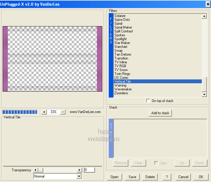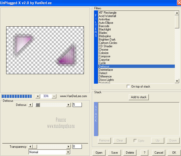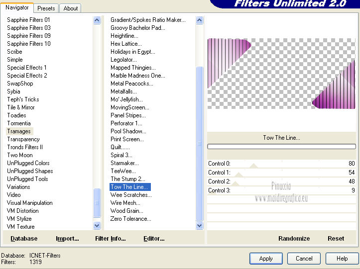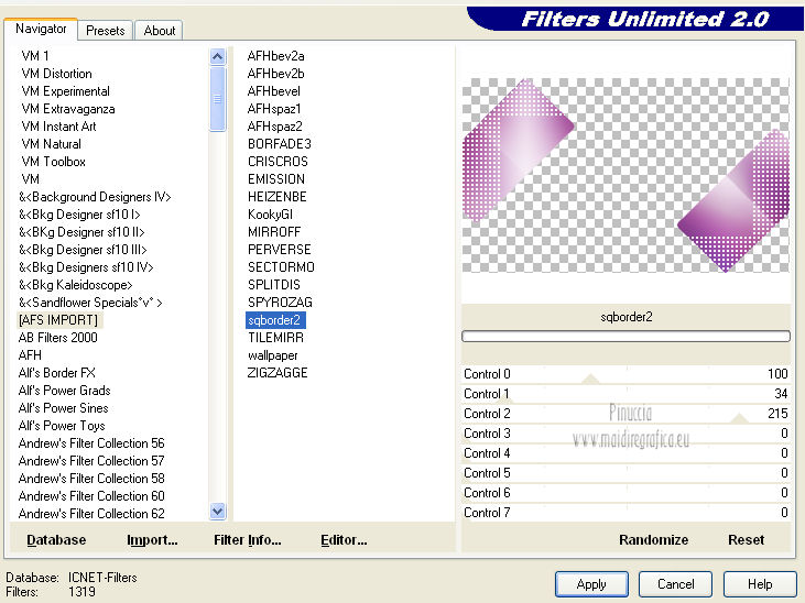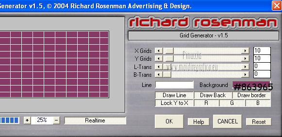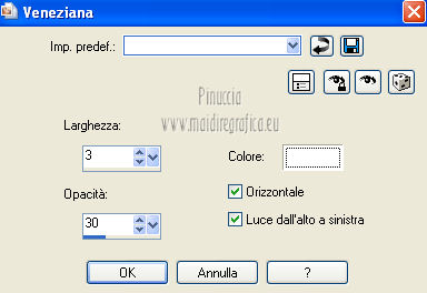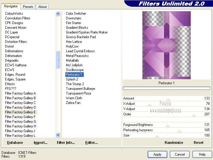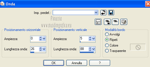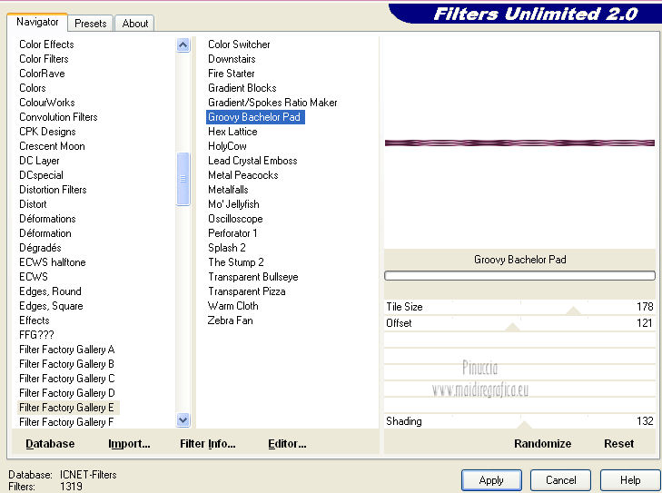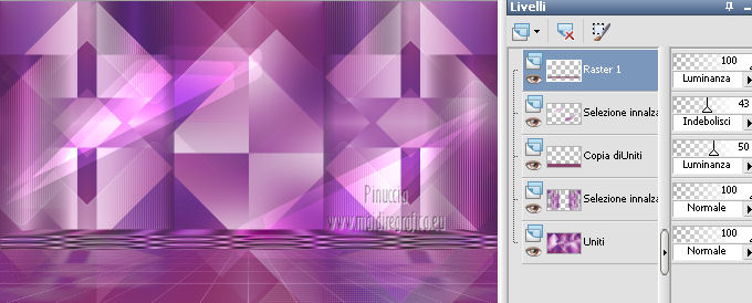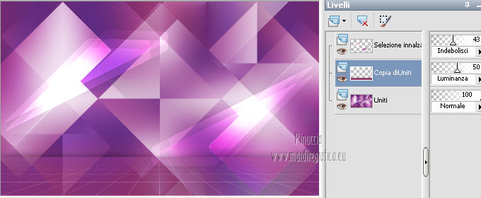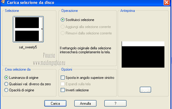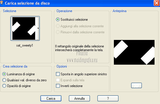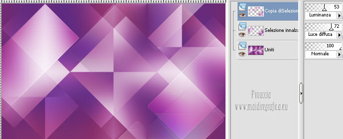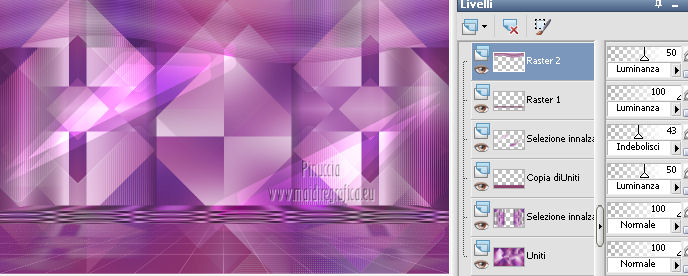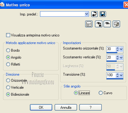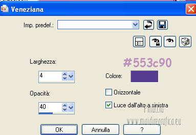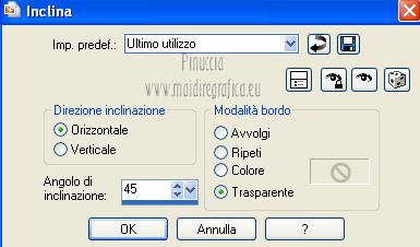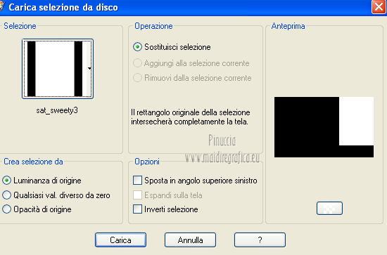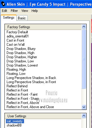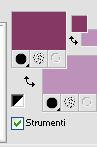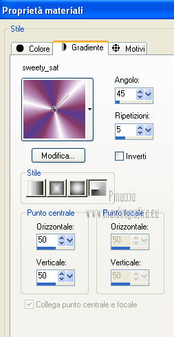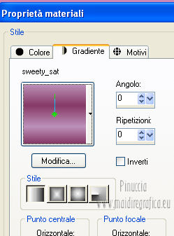 qui puoi trovare qualche risposta ai tuoi dubbi. Se l'argomento che ti interessa non è presente, ti prego di segnalarmelo. Questo tutorial è una creazione di Saturnella e non può essere copiato su altri siti nè essere offerto per il download. Lo stesso vale per la mia traduzione. E' anche proibito togliere il watermark dal materiale; rispettiamo il lavoro dei creatori di tubes, senza i quali non potremmo creare tutorials. Questo tutorial è stato creato con PSP 12, ma può essere eseguito anche con le altre versioni di PSP. Per tradurlo ho usato PSP X. Occorrente: Materiale qui I tubes usati sono di A Psp Devil e Guismo. Grazie a tutti per il vostro magnifico lavoro. (in questa pagina trovi i links ai loro siti). Filtri in caso di dubbi, ricorda di consultare la mia sezione filtri qui Filters Unlimited 2.0 qui Tramages - Tow the line qui Toadies - What are you qui Simple qui AFS Import - sqborder2 qui Filter Factory Gallery E qui Mura's Meister - Perspective Tiling qui Richard Rosenman - Grid Generator qui Alien Skin Eye Candy 5 Impact qui I filtri Factory Gallery per essere usati devono prima essere convertiti. Come fare vedi qui Si usano importandoli in Filters Unlimited (come fare vedi qui) ma possono funzionare anche da soli. Le Factory fornite sono state già convertite. Anche i filtri Tramages, Toadies, Simple e AFS Import si possono usare da soli o importati in Filters Unlimited. ![]() non esitare a cambiare modalità di miscelatura e opacità secondo i colori utilizzati. Metti i preset nelle rispettive cartelle del filtro Alien Skin Eye Candy 5 Impact>Settings>Shadow/Extrude. Cliccando sul file una o due volte (a seconda delle tue impostazioni) automaticamente il preset si installerà nella cartella corretta. Metti il gradiente nella cartella Gradienti. Metti le selezioni nella cartella Selezioni. 1. Imposta il colore di primo piano con il colore bianco #ffffff, e il colore di sfondo con #553c90. i colori impostati nella paletta dei materiali, influenzeranno il risultato del gradiente ![]() Passa il colore di primo piano a Gradiente, seleziona il gradiente sweety_sat, stile Radiale ![]() Apri una nuova immagine trasparente 900 x 550 pixels, e riempila con il gradiente.2. Regola>Sfocatura>Sfocatura gaussiana - raggio 45. ![]() 3. Effetti>Plugins>Simple - Pizza slice mirror. 4. Effetti>Plugins>Simple - Blintz. 5. Livelli>Duplica. Immagine>Rifletti. Immagine>Capovolgi. Cambia la modalità di miscelatura di questo livello in Sovrapponi, e abbassa l'opacità al 50% (o secondo i tuoi colori). Livelli>Unisci>Unisci visibile. 6. Selezione>Carica/Salva selezione>Carica selezione da disco. Cerca e carica la selezione sat_sweety1. ![]() Selezione>Innalza selezione a livello. 7. Effetti>Plugins>Filters Unlimited 2.0 - AFS Import - sqborder2. ![]() Selezione>Deseleziona. Cambia la modalità di miscelatura di questo livello in Luce diffusa, e abbassa l'opacità al 72%. Regola>Messa a fuoco>Accentua messa a fuoco. 8. Livelli>Duplica. Effetti>Effetti di immagine>Motivo unico. ![]() Cambia la modalità di miscelatura di questo livello in Luminanza, e abbassa l'opacità al 53%. ![]() Livelli>Unisci>Unisci visibile. 9. Selezione>Carica/Salva selezione>Carica selezione da disco. Cerca e carica la selezione sat_sweety2. ![]() Selezione>Innalza selezione a livello. 10. Effetti>Plugins>Filters Unlimited 2.0 - Tramage - Tow the line, con i settaggi standard. ![]() Selezione>Deseleziona. 11. Effetti>Plugins>VanDerLee - Unplugged X - Defocus. ![]() 12. Effetti>Effetti geometrici>Inclina. ![]() Cambia la modalità di miscelatura di questo livello in Indebolisci e abbassa l'opacità al 43%. 13. Attiva il livello di sfondo. Livelli>Duplica. 14. Effetti>Plugins>Richard Rosenman - Grid Generator. ![]() 15. Effetti>Plugins>Mura's Meister - Perspective Tiling. ![]() 16. Effetti>Effetti 3D>Sfalsa ombra. ![]() Cambia la modalità di miscelatura di questo livello in Luminanza, e abbassa l'opacità al 50%. ![]() 17. Attiva il livello di sfondo. Selezione>Carica/Salva selezione>Carica selezione da disco. Cerca e carica la selezione sat_sweety3. ![]() Selezione>Innalza selezione a livello. 18. Effetti>Plugins>Simple - Top Left Mirror. ![]() 19. Effetti>Plugins>Filters Unlimited 2.0 - Filter Factory Gallery E - Perforator 1. ![]() Selezione>Deseleziona. 20. Livelli>Duplica. Immagine>Rifletti. Livelli>Unisci>Unisci giù. 21. Effetti>Plugins>Alien Skin Eye Candy 5 Impact - Perspective Shadow. Seleziona il preset sat_sweety e ok. ![]() 22. Selezione>Carica/Salva selezione>Carica selezione da disco. Cerca e carica la selezione sat_sweety4. ![]() Livelli>Nuovo livello raster. Livelli>Disponi>Porta in alto. Riempi con il colore #863965.23. Effetti>Plugins>Filters Unlimited 2.0 - Filter Factory Gallery E - Groovy Bachelor Pad, con i settaggi standard. ![]() 24. Effetti>Plugins>Alien Skin Eye Candy 5 Impact - Extrude. Seleziona il preset sat_sweety_extrude e ok. ![]() Selezione>Deseleziona. Cambia la modalità di miscelatura di questo livello in Luminanza. ![]() 25. Imposta il colore di primo piano con #863965, e il colore di sfondo con #bc91ba. anche in questo caso i colori influenzano l'aspetto del gradiente. ![]() Imposta nuovamente il Gradiente sweety_sat e cambia i settaggi come nella schermata. ![]() Selezione>Carica/Salva selezione>Carica selezione da disco. Cerca e carica la selezione sat_sweety5. ![]() Livelli>Nuovo livello raster. Riempi la selezione con il gradiente.26. Effetti>Effetti di trama>Veneziana. ![]() Selezione>Deseleziona. 27. Effetti>Effetti di distorsione>Onda. ![]() Cambia la modalità di miscelatura di questo livello in Luminanza e abbassa l'opacità al 50%. ![]() 28. Effetti>Effetti 3D>Sfalsa ombra. ![]() 29. Apri il tube della donna Nice_Outfit_tubed by A PSP Devil, e vai a Modifica>Copia. Torna al tuo lavoro e vai a Modifica>Incolla come nuovo livello. Immagine>Ridimensiona, al 70%, tutti i livelli non selezionato. Regola>Messa a fuoco>Metti a fuoco. Sposta il tube a sinistra.30. Effetti>Effett