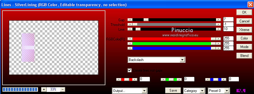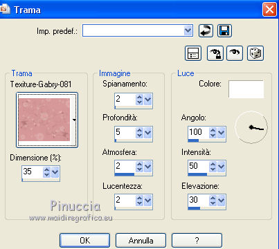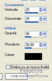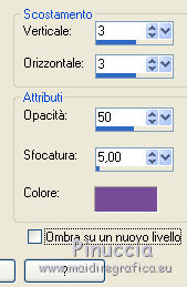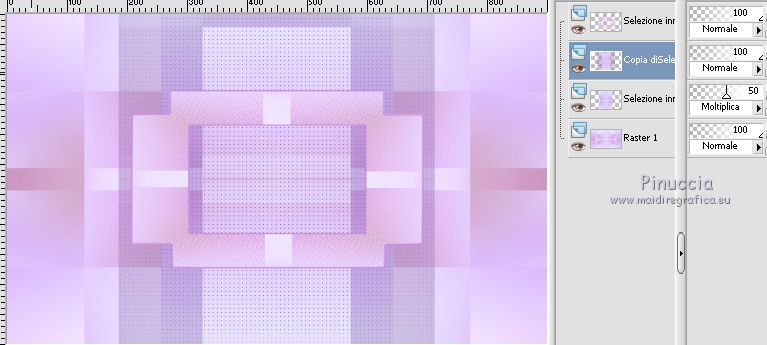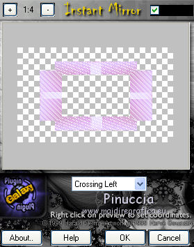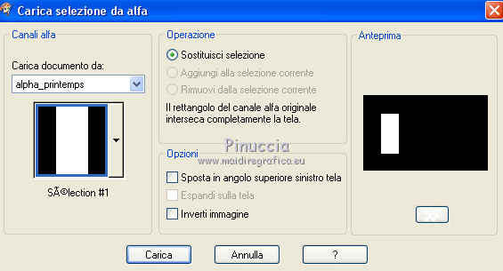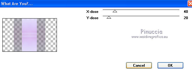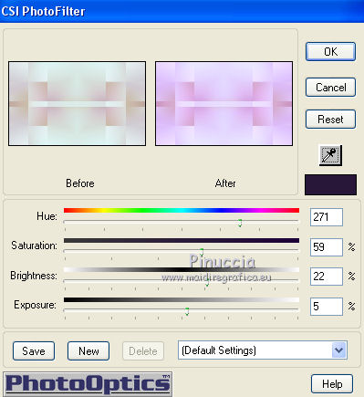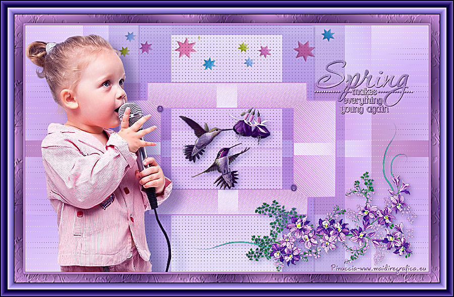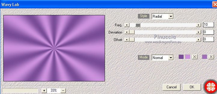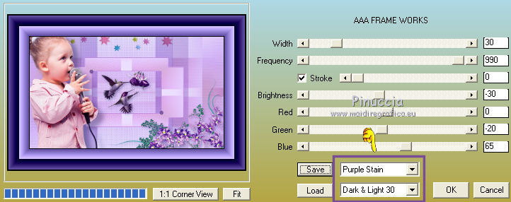 qui puoi trovare qualche risposta ai tuoi dubbi. Se l'argomento che ti interessa non è presente, ti prego di segnalarmelo. Questo tutorial è una creazione di Saturnella e non può essere copiato su altri siti nè essere offerto per il download. Lo stesso vale per la mia traduzione. E' anche proibito togliere il watermark dal materiale; rispettiamo il lavoro dei creatori di tubes, senza i quali non potremmo creare tutorials. Per tradurre questo tutorial, creato con X6, ho usato CorelX, ma può essere eseguito anche con le altre versioni di PSP. Dalla versione X4, il comando Immagine>Rifletti è stato sostituito con Immagine>Capovolgi in orizzontale, e il comando Immagine>Capovolgi con Immagine>Capovolgi in verticale. Nelle versioni X5 e X6, le funzioni sono state migliorate rendendo disponibile il menu Oggetti. Nel nuovo X7 sono tornati i comandi Immagine>Rifletti e Immagine>Capovolgi, ma con nuove funzioni. Vedi la scheda sull'argomento qui Occorrente: Materiale qui Grazie per i tubes TalaNat, Thafs, kTr, Kr, per il wordart Yoka. (in questa pagina trovi i links ai loro siti). Filtri in caso di dubbi, ricorda di consultare la mia sezione filtri qui Filters Unlimited 2.0 qui Mehdi - Sorting Tiles, Wavy Lab qui PhotoOptics - CSI PhotoFilter qui Mirror Rave - Quadrant Flip qui AP 01 [Innovations] - Lines SilverLining qui Plugin Galaxy - Instant Mirror qui Toadies - What are you qui AAA Frames - Texture Frame qui L&K's - L&K's Zitah qui Adjust - Variations qui I filtri Toadies e Mirror Rave si possono usare da soli o importati in Filters Unlimited (come fare vedi qui) Se un filtro fornito appare con questa icona ![]() non esitare a cambiare modalità di miscelatura e opacità secondo i colori utilizzati. Metti la trama nella cartella Trame. 1. Imposta il colore di primo piano con il colore chiaro #cb91dc, e il colore di sfondo con il colore scuro #784c97. ![]() Apri alpha_printemps. Finestra>Duplica, o sulla tastiera maiuscola+D, per fare una copia. Chiudi l'originale. La copia, che sarà la base del tuo lavoro, non è vuota, ma contiene le selezioni salvate sul canale alfa. 2. Selezione>Seleziona tutto. Apri image_printemps e vai a Modifica>Copia. Torna al tuo lavoro e vai a Modifica>Incolla nella selezione. Selezione>Deseleziona. 3. Effetti>Effetti di immagine>Motivo unico, con i settaggi standard. ![]() 4. Regola>Sfocatura>Sfocatura gaussiana - raggio 50. ![]() 5. Effetti>Plugins>Mehdi - Sorting Tiles. ![]() 6. Effetti>Plugins>Mirror Rave - Quadrant Flip, con i settaggi standard. ![]() 7. Effetti>Plugins>PhotoOptics - CSI-Photofilter. ![]() NB. Con lo strumento Contagocce clicca su un colore della tua immagine, e gioca con i differenti parametri dell'effetto. ![]() 8. Selezione>Carica/Salva selezione>Carica selezione da canale alfa. La selezione sélection#1 è subito disponibile. Devi soltanto cliccare Carica. ![]() Selezione>Innalza selezione a livello. Selezione>Deseleziona. 9. Effetti>Plugins>AP 01 [Innovations] Lines SilverLining. ![]() 10. Livelli>Duplica. Immagine>Rifletti. Livelli>Unisci>Unisci giù. 11. Effetti>Plugins>The Plugin Site - Instant Mirror il filtro Galaxy si posiziona nella lista dei filtri sotto The Plugin Site ![]() 12. Immagine>Ridimensiona, al 75%, tutti i livelli non selezionato. 13. Selezione>Seleziona tutto. Selezione>Mobile. Selezione>Immobilizza. Selezione>Modifica>Seleziona bordature selezione. ![]() Riempi la selezione con il colore chiaro.Selezione>Deseleziona. 14. Attiva il livello di sfondo. Selezione>Carica/Salva selezione>Carica selezione da canale alfa. Apri il menu delle selezioni e carica Sélection#2. ![]() Selezione>Innalza selezione a livello. Selezione>Deseleziona. 15. Effetti>Plugins>AP 01 [Innovations] Lines SilverLining. ![]() Cambia la modalità di miscelatura di questo livello in Moltiplica, e abbassa l'opacità al 50%. ![]() 16. Livelli>Duplica. Effetti>Plugins>Toadies - What are you. ![]() Riporta la modalità di miscelatura a Normale, opacità 100. ![]() 17. Attiva il livello sottostante. Effetti>Effetti 3D>Sfalsa ombra, colore #784c97. ![]() Ripeti l'Effetto Sfalsa ombra, cambiando verticale e orizzontale con -3. 18. Attiva il livello superiore. Apri il tube deco_printemps, e vai a Modifica>Copia. Torna al tuo lavoro e vai a Modifica>Incolla come nuovo livello. Lascialo come sta. E' al suo posto. 19. Apri il tube kr_bird4, e vai a Modifica>Copia. Torna al tuo lavoro e vai a Modifica>Incolla come nuovo livello. Immagine>Ridimensiona, al 55%, tutti i livelli non selezionato. Regola>Messa a fuoco>Metti a fuoco. 20. Effetti>Effetti 3D>Sfalsa ombra. ![]() 21. Apri il tube angle fleurs mauves tubed by thafs, e vai a Modifica>Copia. Torna al tuo lavoro e vai a Modifica>Incolla come nuovo livello. Immagine>Ridimensiona, al 75%, tutti i livelli non selezionato. Regola>Messa a fuoco>Metti a fuoco. Spostalo in basso a destra.22. Effetti>Effetti 3D>Sfalsa ombra, con i settaggi precedenti. 23. Apri il tube kTs Good Luck03modifie, e vai a Modifica>Copia. Torna al tuo lavoro e vai a Modifica>Incolla come nuovo livello. Effetti>Effetti di immagine>Scostamento. ![]() 24. Apri il tube TalaNat_childrens 006-12012014, e vai a Modifica>Copia. Torna al tuo lavoro e vai a Modifica>Incolla come nuovo livello. cancella la firma. Immagine>Rifletti. Spostalo a sinistra.25. Effetti>Effetti 3D>Sfalsa ombra. ![]() 26. Attiva il livello di sfondo. Effetti>Plugins>L&K's - L&K's Zitah. ![]() Livelli>Unisci>Unisci visibile. 27. Effetti>Plugins>Adjust - Variations - adatta ai tuoi colori. Per l'esempio: un clic su Original per annullare eventuali precedenti settaggi memorizzati dal filtro, un clic su More Blue e ok. 28. Immagine>Aggiungi bordatura, 1 pixel, simmetriche, colore scuro. Immagine>Aggiungi bordatura, 3 pixels, simmetriche, colore chiaro. Immagine>Aggiungi bordatura, 1 pixel, simmetriche, colore scuro. Immagine>Aggiungi bordatura, 50 pixels, simmetriche, colore bianco. 29. Attiva lo strumento Bacchetta magica ![]() e clicca nel bordo bianco per selezionarlo.