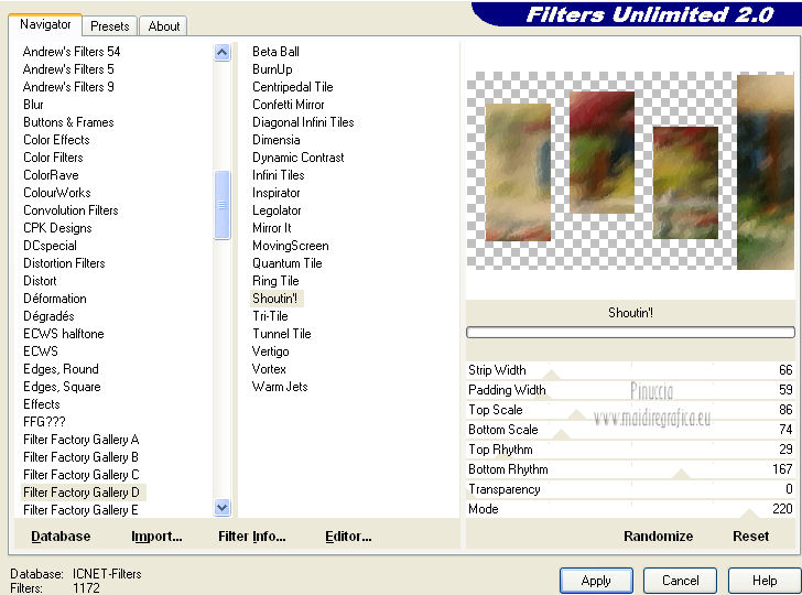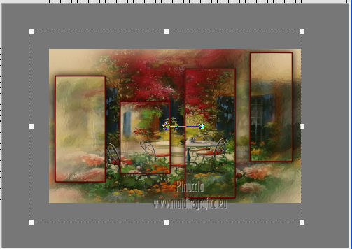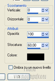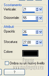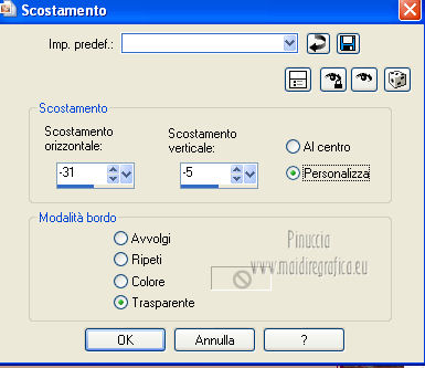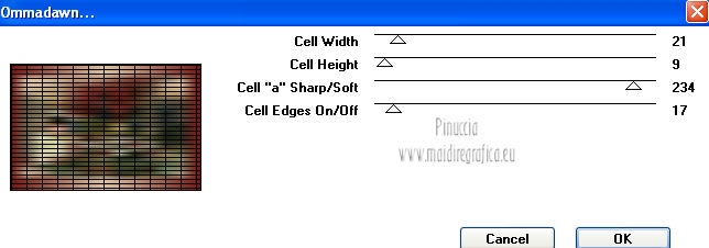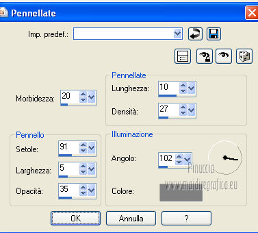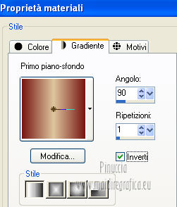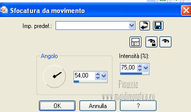 qui puoi trovare qualche risposta ai tuoi dubbi. Se l'argomento che ti interessa non è presente, ti prego di segnalarmelo. Questo tutorial è una creazione di Saturnella e non può essere copiato su altri siti nè essere offerto per il download. Lo stesso vale per la mia traduzione. E' anche proibito togliere il watermark dal materiale; rispettiamo il lavoro dei creatori di tubes, senza i quali non potremmo creare tutorials. Questo tutorial è stato creato con PSP 12, ma può essere eseguito anche con le altre versioni di PSP. Per tradurlo ho usato PSP X. Occorrente: Materiale qui I tubes sono di Nikita, Kikirou, Martine. Grazie a tutti per il vostro magnifico lavoro. (in questa pagina trovi i links ai loro siti). Filtri in caso di dubbi, ricorda di consultare la mia sezione filtri qui Filters Unlimited 2.0 qui Filter Factory Gallery D qui Toadies qui ![]() non esitare a cambiare modalità di miscelatura e opacità secondo i colori utilizzati. 1. Imposta il colore di primo piano con #dec69e, e il colore di sfondo con #771612. ![]() 2. Apri una nuova immagine trasparente 900 x 550 pixels. Selezione>Seleziona tutto. Apri il tube del paesaggio di Nikita e vai a Modifica>Copia. Torna al tuo lavoro e vai a Modifica>Incolla nella selezione. Selezione>Deseleziona. per il mio esempio ho ridimensionato al 140% 3. Livelli>Nuovo livello raster. Riempi con il colore chiaro.Livelli>Disponi>Porta sotto. Livelli>Unisci>Unisci visibile. 4. Regola>Sfocatura>Sfocatura da movimento. ![]() 5. Effetti>Effetti tecniche da disegno>Pennellate (con un colore chiaro o medio scelto dalla tua immagine). ![]() 6. Livelli>Duplica. 7. Effetti>Plugins>Filters Unlimited 2.0 - Filter Factory Gallery D - Shoutin' ![]() 8. Selezione>Seleziona tutto. Selezione>Mobile. Selezione>Immobilizza. 9. Modifica>Incolla nella selezione (il tube del paesaggio di Nikita è ancora in memoria). 10. Selezione>Modifica>Seleziona bordature selezione. ![]() 11. Livelli>Nuovo livello raster. Riempi con il colore di sfondo.12. Effetti>Effetti 3D>Smusso a incasso. ![]() Selezione>Deseleziona. Livelli>Unisci>Unisci giù. 13. Effetti>Effetti di immagine>Scostamento. ![]() 14. Effetti>Effetti 3D>Sfalsa ombra. ![]() 15. Modifica>Incolla come nuovo livello (il tube di Nikita è sempre in memoria). Livelli>Disponi>Sposta giù. Immagine>Rifletti. 16. Premi il tasto K per attivare lo strumento Puntatore ![]() se stai usando PSP 9 il tasto D per lo strumento Deformazione ![]() In modalità Scala tira i nodi centrali a destra e a sinistra per riempire la tag (se usi un altro tube, non sceglierlo troppo grande). ![]() Abbassa l'opacità di questo livello a tuo gusto; per il mio esempio ho abbassato al 57%. 17. Apri il tube di Martine e vai a Modifica>Copia. Torna al tuo lavoro e vai a Modifica>Incolla come nuovo livello. Immagine>Ridimensiona, al 50%, tutti i livelli non selezionato. Regola>Messa a fuoco>Metti a fuoco. Spostalo nel rettangolo a sinistra.18. Effetti>Effetti 3D>Sfalsa ombra, con i settaggi precedenti. 19. Livelli>Unisci>Unisci visibile. 20. Immagine>Aggiungi bordatura, 2 pixels, simmetriche, con il colore scuro. Immagine>Aggiungi bordatura, 4 pixels, simmetriche, con il colore chiaro. Immagine>Aggiungi bordatura, 2 pixels, simmetriche, con il colore scuro. Immagine>Aggiungi bordatura, 60 pixels, simmetriche, con il colore chiaro. 21. Seleziona il bordo da 60 pixels con la bacchetta magica ![]() Passa il colore di primo piano a Gradiente. ![]() Riempi la selezione con il gradiente.22. Effetti>Plugins>Toadies - Ommadawn. ![]() 23. Effetti>Plugins>Toadies - What are you. ![]() 24. Selezione>Inverti. Effetti>Effetti 3D>Sfalsa ombra. ![]() Selezione>Deseleziona. 25. Apri il tube di Kikirou e vai a Modifica>Copia. Torna al tuo lavoro e vai a Modifica>Incolla come nuovo livello. Immagine>Rifletti. Immagine>Ridimensiona, al 90%, tutti i livelli non selezionato. Regola>Messa a fuoco>Metti a fuoco. 26. Effetti>Effetti 3D>Sfalsa ombra. ![]() 27. Apri il tube "texte" e vai a Modifica>Copia. Torna al tuo lavoro e vai a Modifica>Incolla come nuovo livello. Posizionalo come nel mio esempio.Firma il tuo lavoro. 28. Immagine>Aggiungi bordatura, 2 pixels, simmetriche, con il colore scuro. Immagine>Ridimensiona, a 900 pixels di larghezza, e salva in formato jpg. ![]() Se hai problemi o dubbi, o trovi un link non funzionante, o anche soltanto per dirmi che ti è piaciuto, scrivimi. 23 Agosto 2012 |