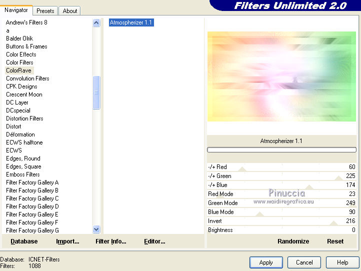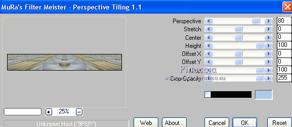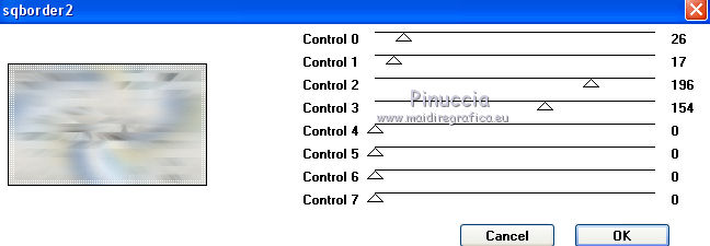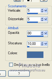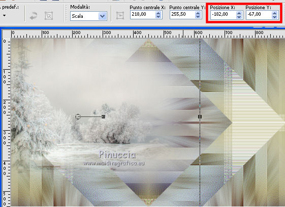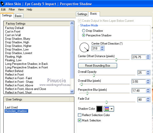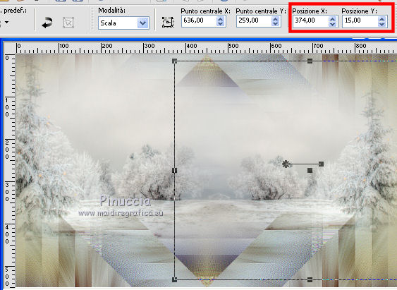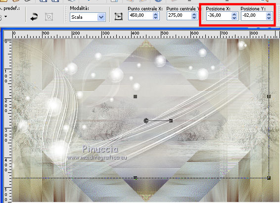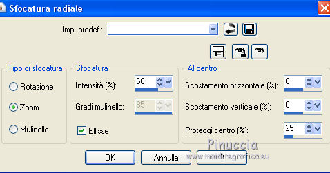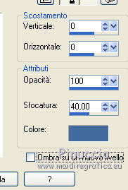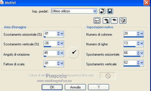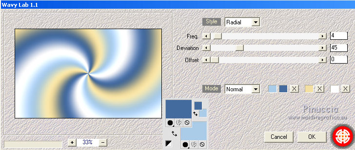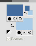 qui puoi trovare qualche risposta ai tuoi dubbi. Se l'argomento che ti interessa non è presente, ti prego di segnalarmelo. Questo tutorial è una creazione di Saturnella e non può essere copiato su altri siti nè essere offerto per il download. Lo stesso vale per la mia traduzione. E' anche proibito togliere il watermark dal materiale; rispettiamo il lavoro dei creatori di tubes, senza i quali non potremmo creare tutorials. Per tradurre questo tutorial, creato con Corel2018, ho usato CorelX, ma può essere eseguito anche con le altre versioni di PSP. Dalla versione X4, il comando Immagine>Rifletti è stato sostituito con Immagine>Capovolgi in orizzontale, e il comando Immagine>Capovolgi con Immagine>Capovolgi in verticale. Nelle versioni X5 e X6, le funzioni sono state migliorate rendendo disponibile il menu Oggetti. Nel nuovo X7 sono tornati i comandi Immagine>Rifletti e Immagine>Capovolgi, ma con nuove funzioni. Vedi la scheda sull'argomento qui Occorrente: Materiale qui Grazie per le maschere Narah e Franiemargot. Il resto del materiale è di Saturnella. (in questa pagina trovi i links ai loro siti). Filtri in caso di dubbi, ricorda di consultare la mia sezione filtri qui Filters Unlimited 2.0 qui Mehdi - Wavy Lab 1.1 qui Carolaine and Sensibility - CS-Linear-H qui AFS IMPORT - sqborder2 qui Alien Skin Eye Candy 5 Impact - Perspective Shadow qui Color Rave - Atmospherizer qui Simple - 4Way Average qui Graphics Plus - Vertical mirror, Quick Tile I qui I filtri AFS IMPORT, Color Rave, Simple e Graphics Plus si possono usare da soli o importati in Filters Unlimited (come fare vedi qui) Se un filtro fornito appare con questa icona ![]() non esitare a cambiare modalità di miscelatura e opacità secondo i colori utilizzati. Metti il preset Cliccando sul file una o due volte (a seconda delle tue impostazioni), automaticamente il preset si installerà nella cartella corretta. perchè uno o due clic vedi qui Se preferisci, puoi importare direttamente il preset nel corso del tutorial Come fare vedi la scheda del filtro Eye Candy qui Apri le maschere in PSP e minimizzale con il resto del materiale. Colori utilizzati ![]() 1. Imposta il colore di primo piano con il colore scuro #456b9e, e il colore di sfondo con il colore chiaro #aacce9. ![]() Apri alpha_thonolan. Finestra>Duplica, o sulla tastiera tasto della maiuscola+D per fare una copia. ![]() Chiudi l'originale. La copia, che sarà la base del tuo lavoro, non è vuota, ma contiene una selezione salvata sul canale alfa. 2. Effetti>Plugins>Mehdi - Wavy Lab 1.1 Questo filtro crea gradienti con i colori della tua paletta: il primo è il colore di sfondo, il secondo quello di primo piano; degli ultimi due colori creati dal filtro cambia il terzo colore con il colore 3 #f3dfa1 e il quarto con il colore bianco #ffffff. ![]() 3. Regola>Sfocatura>Sfocatura radiale. ![]() 4. Effetti>Effetti di bordo>Aumenta di più - 2 volte. 5. Livelli>Nuovo livello raster. Selezione>Seleziona tutto. Apri il tube paysage sat_hiver_11 e vai a Modifica>Copia. Torna al tuo lavoro e vai a Modifica>Incolla nella selezione. Selezione>Deseleziona. 6. Effetti>Effetti di immagine>Motivo unico, con i settaggi standard. ![]() 7. Regola>Sfocatura>Sfocatura radiale. ![]() 8. Effetti>Plugins>Carolaine and Sensibility - CS-Linear-H, con i settaggi standard ![]() Effetti>Effetti di bordo>Aumenta. Livelli>Unisci>Unisci giù. 9. Effetti>Plugins>Filters Unlimited 2.0 - AFS IMPORT - sqborder2. ![]() 10. Livelli>Duplica. Effetti>Plugins>Color Rave - Atmospherizer, con i settaggi standard. ![]() Io ho cambiato la modalità di miscelatura di questo livello in Rafforza. Livelli>Unisci>Unisci visibile. 11. Effetti>Plugins>Simple - Blintz. Modifica>Ripeti Blintz. 12. Effetti>Effetti di riflesso>Specchio rotante. ![]() 13. Effetti>Plugins>Graphics Plus - Vertical Mirror, con i settaggi standard. ![]() 14. Livelli>Duplica. Cambia la modalità di miscelatura di questo livello in Moltiplica. Livelli>Unisci>Unisci visibile. 15. Apri il tube sat_hiver_11 e vai a Modifica>Copia. Torna al tuo lavoro e vai a Modifica>Incolla come nuovo livello. Attiva lo strumento Puntatore ![]() e imposta Posizione X: -182,00 e Posizione Y: -67.00. ![]() 16. Livelli>Duplica. Immagine>Ridimensiona, all'80%, tutti i livelli non selezionato. Immagine>Rifletti. strumento Puntatore ![]() e imposta Posizione X: 374,00 e Posizione Y: 15.00. ![]() Tasto M per deselezionare lo strumento. Livelli>Unisci>Unisci giù. Abbassa l'opacità di questo livello al 65%. Effetti>Effetti di bordo>Aumenta. 17. Livelli>Nuovo livello raster. Imposta il colore di primo piano con il colore bianco #ffffff. Riempi il livello con il colore bianco.Livelli>Nuovo livello maschera>Da immagine. Apri il menu sotto la finestra di origine e vedrai la lista dei files aperti. Seleziona la maschera Narah_Mask_1197. ![]() Effetti>Effetti di bordo>Aumenta di più. Livelli>Unisci>Unisci gruppo. Cambia la modalità di miscelatura di questo livello in Luminanza (esistente). 18. Effetti>Effetti 3D>Sfalsa ombra, colore scuro di primo piano #456b9e ![]() 19. Livelli>Nuovo livello raster. Riempi il livello con il colore bianco.Livelli>Nuovo livello maschera>Da immagine. Apri il menu sotto la finestra di origine e seleziona la maschera masque_103_franiemargot. ![]() Regola>Messa a fuoco>Metti a fuoco. Livelli>Unisci>Unisci gruppo. Strumento Puntatore ![]() e imposta Posizione X: -36,00 e Posizione Y: -82,00. ![]() Tasto M per deselezionare lo strumento. 20. Effetti>Effetti 3D>Sfalsa ombra, con i settaggi precedenti. ![]() 21. Attiva il livello di sfondo. Selezione>Carica/Salva selezione>Carica selezione da canale alfa. La selezione sélection#1 è subito disponibile. Devi soltanto cliccare Carica. ![]() Selezione>Innalza selezione a livello. Livelli>Disponi>Porta in alto. Effetti>Plugins>Mura's Meister - Perspective Tiling, con i settaggi standard. ![]() Selezione>Deseleziona. 22. Effetti>Effetti 3D>Sfalsa ombra, colore nero. ![]() 23. Apri il tube sat_ani14 e vai