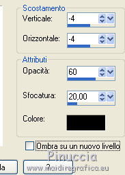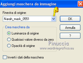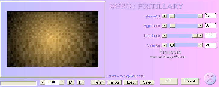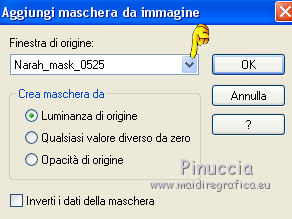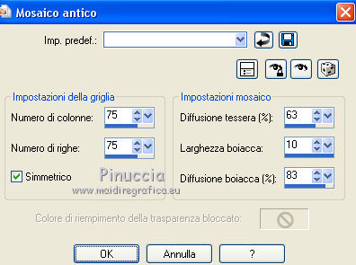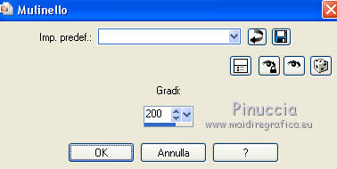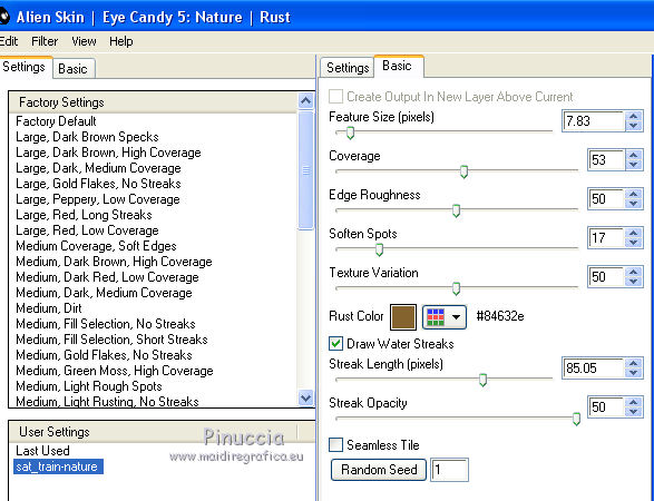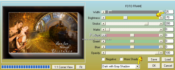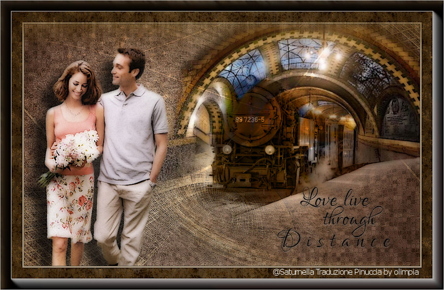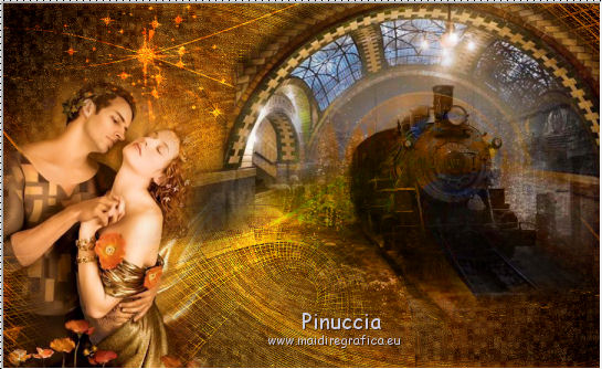 qui puoi trovare qualche risposta ai tuoi dubbi. Se l'argomento che ti interessa non è presente, ti prego di segnalarmelo. Questo tutorial è una creazione di Saturnella e non può essere copiato su altri siti nè essere offerto per il download. Lo stesso vale per la mia traduzione. E' anche proibito togliere il watermark dal materiale; rispettiamo il lavoro dei creatori di tubes, senza i quali non potremmo creare tutorials. Il tutorial è stato scritto con CorelX16, ma può essere eseguito anche con le altre versioni di PSP. Secondo la versione utilizzata (anteriore a PSP X) potresti ottenere dei risultati differenti. Vedi la mia scheda riguardante le funzioni Rifletti>Capovolgi nelle nuove versioni di PSP qui Per tradurre questo tutorial ho usato PSP X. Occorrente: Materiale qui Per i tubes grazie Nikita, LuzCristina, TReagen e Aimelle. Per la maschera grazie Narah. (in questa pagina trovi i links ai loro siti). Filtri in caso di dubbi, ricorda di consultare la mia sezione filtri qui Alien Skin Eye Candy 5 Nature - Rust qui Xero - Fritillary qui AAA Frames - Foto Frame qui ![]() non esitare a cambiare modalità di miscelatura e opacità secondo i colori utilizzati. Metti il preset Cliccando sul file una o due volte (a seconda delle tue impostazioni), automaticamente il preset si installerà nella cartella corretta. perchè uno o due clic vedi qui Apri le maschere in PSP e minimizzale con il resto del materiale. 1. Imposta il colore di primo piano con #e6b963, e il colore di sfondo con il colore nero #000000. ![]() Passa il colore di primo piano a Gradiente di primo piano/sfondo, stile Sprazzo di luce. ![]() Apri una nuova immagine trasparente 900 x 550 pixels, e riempila con il gradiente.2. Effetti>Plugins>Xero - Fritillary. ![]() 3. Effetti>Effetti di distorsione>Mulinello. ![]() 4. Livelli>Nuovo livello raster. Riporta il colore di primo piano al colore chiaro #e6b963, e riempi il livello con il colore di primo piano.5. Livelli>Nuovo livello maschera>Da immagine. Apri il menu sotto la finestra di origine e vedrai la lista dei files aperti. Seleziona la maschera Narah_mask_0525, con i seguenti settaggi. ![]() Effetti>Effetti di bordo>Aumenta. Livelli>Unisci>Unisci gruppo. 6. Effetti>Effetti 3D>Sfalsa ombra. ![]() Cambia la modalità di miscelatura di questo livello in Luce netta. 7. Livelli>Duplica. Immagine>Rifletti. Immagine>Capovolgi. Abbassa l'opacità di questo livello all'80%. Livelli>Unisci>Unisci visibile. 8. Apri il tube del paesaggio di Nikita e vai a Modifica>Copia. Torna al tuo lavoro e vai a Modifica>Incolla come nuovo livello. Immagine>Rifletti. Sposta il tube in alto a destra.9. Apri il tube del treno di Tyna Reagen, e vai a Modifica>Copia. Torna al tuo lavoro e vai a Modifica>Incolla come nuovo livello. Immagine>Ridimensiona, all'80%, tutti i livelli non selezionato. Posiziona correttamente il tube.Cambia la modalità di miscelatura di questo livello in Luminanza (esistente). ![]() 10. Attiva il livello di sfondo. Livelli>Duplica. 11. Effetti>Plugins>Alien Skin Eye Candy 5 Nature - Rust. Seleziona il preset sat_train-nature e ok. Se stai usando altri colori, imposta il tuo colore sotto Basic. ![]() Cambia la modalità di miscelatura di questo livello in Luce diffusa. Effetti>Effetti di bordo>Aumenta. 12. Livelli>Nuovo livello raster. Riempi il livello con il colore chiaro di primo piano.13. Livelli>Nuovo livello maschera>Da immagine. Apri il menu sotto la finestra di origine e seleziona la maschera Narah_mask_0551, con i seguenti settaggi. ![]() Regola>Messa a fuoco>Accentua messa a fuoco. Livelli>Unisci>Unisci gruppo. 14. Effetti>Effetti di immagine>Scostamento. ![]() Cambia la modalità di miscelatura di questo livello in Indebolisci, e abbassa l'opacità all'85%. 15. Effetti>Effetti 3D>Sfalsa ombra, con i settaggi precedenti. 16. Attiva il livello superiore. Apri il tube della coppia di Luzcristina, e vai a Modifica>Copia. Torna al tuo lavoro e vai a Modifica>Incolla come nuovo livello. Sposta il tube in basso a sinistra.![]() 17. Livelli>Duplica. Livelli>Disponi>Sposta giù. 18. Effetti>Effetti di trama>Mosaico antico. ![]() Cambia la modalità di miscelatura di questo livello in Filtra, e abbassa l'opacità al 50%, o secondo i tuoi colori. 19. Attiva il livello superiore. Effetti>Effetti 3D>Sfalsa ombra. ![]() 20. Apri il wordart di Aimelle e vai a Modifica>Copia. Torna al tuo lavoro e vai a Modifica>Incolla come nuovo livello. Immagine>Immagine negativa. se stai usando PSP 9: Regola>Bilanciamento colore>Immagine negativa Sposta il testo in basso a destra.21. Effetti>Effetti 3D>Sfalsa ombra. ![]() 22. Attiva il livello di sfondo e vai a Modifica>Copia. 23. Immagine>Aggiungi bordatura, 1 pixel, simmetriche, con il colore nero. Immagine>Aggiungi bordatura, 3 pixels, simmetriche, con il colore chiaro. Immagine>Aggiungi bordatura, 1 pixel, simmetriche, con il colore nero. 24. Immagine>Aggiungi bordatura, 50 pixels, simmetriche, con il colore bianco. Attiva lo strumento Bacchetta magica ![]() e clicca nel bordo bianco per selezionarlo. 25. Modifica>Incolla nella selezione. 26. Regola>Sfocatura>Sfocatura gaussiana - raggio 25. ![]() 27. Effetti>Plugins>Alien Skin Eye Candy 5 Nature - Rust, con i settaggi precedenti. 28. Selezione>Innalza selezione a livello. Cambia la modalità di miscelatura di questo livello in Moltiplica. Livelli>Unisci>Unisci giù. 29. Effetti>Plugins>AAA Frames - Foto frame. Prima seleziona Dark with Gray Shadow, e poi cambia width con 25. ![]() Selezione>Deseleziona. 30. Aggiungi il tuo nome e/o il tuo watermark su un nuovo livello. Immagine>Aggiungi bordatura, 1 pixel, simmetriche, con il colore nero. 31. Immagine>Ridimensiona, a 900 pixels di larghezza, tutti i livelli selezionato. Regola>Messa a fuoco>Maschera di contrasto. ![]() ![]() Le vostre versioni. Grazie ![]() Rossella ![]() Lina ![]() Olimpia ![]() Shanty ![]() Se hai problemi o dubbi, o trovi un link non funzionante, o anche soltanto per dirmi che ti è piaciuto, scrivimi. 30 Gennaio
