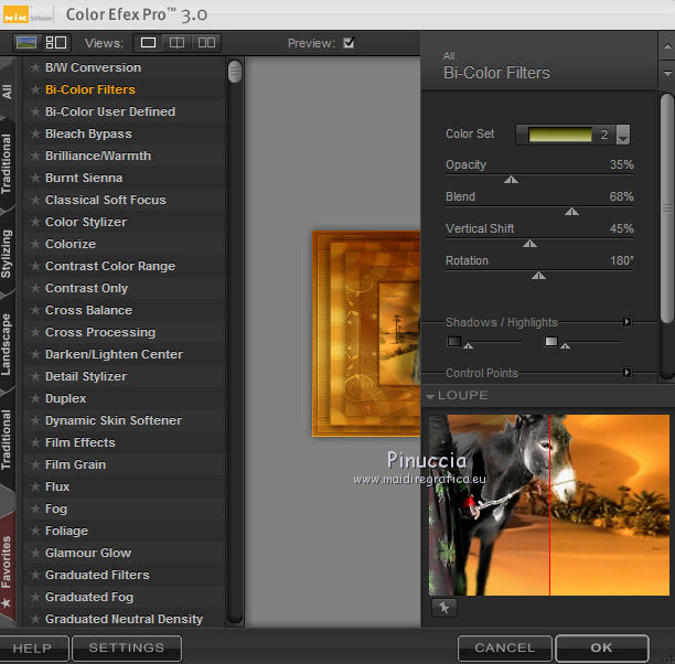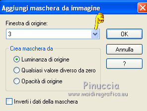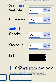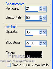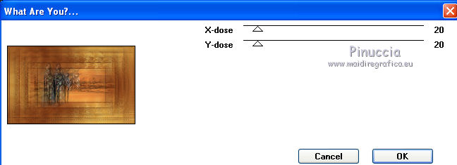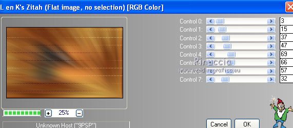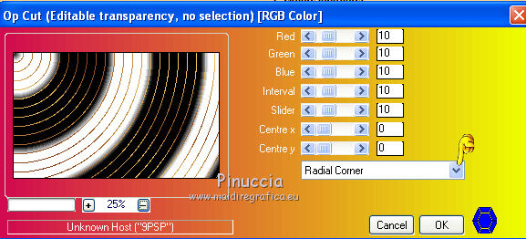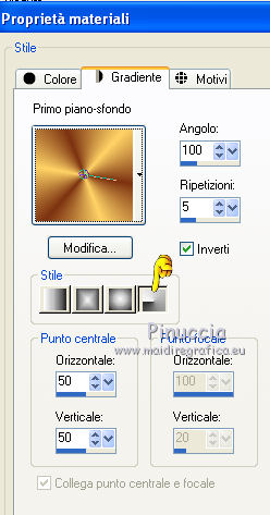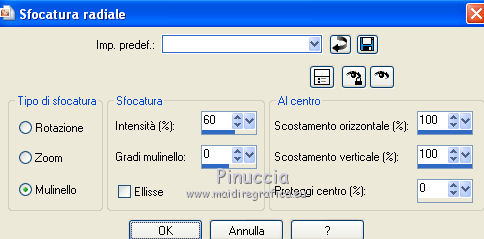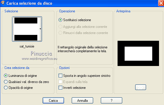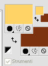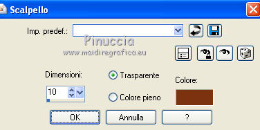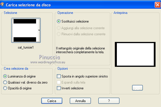 qui puoi trovare qualche risposta ai tuoi dubbi. Se l'argomento che ti interessa non è presente, ti prego di segnalarmelo. Questo tutorial è una creazione di Saturnella e non può essere copiato su altri siti nè essere offerto per il download. Lo stesso vale per la mia traduzione. E' anche proibito togliere il watermark dal materiale; rispettiamo il lavoro dei creatori di tubes, senza i quali non potremmo creare tutorials. Il tutorial è stato creato con PSP12, ma può essere eseguito anche con le altre versioni. Per tradurlo, ho usato PSP X. Occorrente: Materiale qui I tubes sono di Gina, Denise Worisch e Ket. Grazie a tutti per il vostro magnifico lavoro. (in questa pagina trovi i links ai loro siti). Filtri in caso di dubbi, ricorda di consultare la mia sezione filtri qui Innovations 1.5 - Op cut qui L&K - L&K Zitah qui Toadies - What are you qui Nik Software - Color Efex Pro qui ![]() non esitare a cambiare modalità di miscelatura e opacità secondo i colori utilizzati. Metti le selezioni nella cartella Selezioni. Apri la maschera in PSP e minimizzala con il resto del materiale. 1. Imposta il colore di primo piano con #fd366, e il colore di sfondo con #7c3211. ![]() Passa il colore di primo piano a Gradiente, stile Radiale. ![]() 2. Apri una nuova immagine trasparente 900 x 550 pixels, e riempila con il gradiente.3. Regola>Sfocatura>Sfocatura gaussiana - raggio 50. ![]() 4. Livelli>Duplica. Effetti>Plugins>Innovations 1.5 - Op Cut. ![]() Cambia la modalità di miscelatura di questo livello in Sovrapponi, e abbassa l'opacità al 25% (secondo i tuoi colori). 5. Livelli>Unisci>Unisci visibile. 6. Livelli>Duplica. Immagine>Capovolgi. Abbassa l'opacità di questo livello al 50%. Livelli>Unisci>Unisci giù. 7. Livelli>Duplica. Immagine>Ridimensiona, al 90%, tutti i livelli non selezionato. 8. Selezione>Seleziona tutto. Selezione>Mobile. Selezione>Immobilizza. 9. Livelli>Nuovo livello raster. Riempi con il colore scuro.10. Livelli>Nuovo livello maschera>Da immagine. Apri il menu sotto la finestra di origine e vedrai la lista dei files aperti. Seleziona la maschera 3.jpg, con i seguenti settaggi: ![]() Effetti>Effetti di bordo>Aumenta. Livelli>Unisci>Unisci gruppo. 11. Effetti>Effetti 3D>Sfalsa ombra. ![]() Selezione>Deseleziona. 12. Effetti>Effetti 3D>Sfalsa ombra. ![]() 13. Selezione>Carica/Salva selezione>Carica selezione da disco. Cerca e carica la selezione sat_tunisie. ![]() 14. Livelli>nuovo livello raster. Apri il tube del paesaggio ketlandscape167 e vai a Modifica>Copia. Torna al tuo lavoro e vai a Modifica>Incolla nella selezione. Immagine>Ridimensiona, al 120%, tutti i livelli non selezionato. 15. Selezione>Inverti. Premi sulla tastiera il tasto CANC. 16. Di nuovo Selezione>Inverti. Livelli>Nuovo livello raster. Effetti>Effetti 3D>Scalpello, con il tuo colore di sfondo. ![]() Selezione>Deseleziona. Livelli>Unisci>Unisci giù - 2 volte. 17. Apri il tube della donna 5241dwtubes e vai a Modifica>Copia. Torna al tuo lavoro e vai a Modifica>Incolla come nuovo livello. Immagine>Ridimensiona, al 60%, tutti i livelli non selezionato. Sposta il tube nel rettangolo in basso a sinistra.![]() Regola>Messa a fuoco>Metti a fuoco. 18. Effetti>Effetti 3D>Sfalsa ombra. ![]() 19. Livelli>Unisci>Unisci tutto. 20. Immagine>Aggiungi bordatura, 2 pixels, simmetriche, con il colore scuro. 21. Livelli>Duplica. Immagine>Ridimensiona, al 90%, tutti i livelli non selezionato. 22. Attiva il livello di sfondo. Regola>Sfocatura>Sfocatura radiale. ![]() 23. Effetti>Plugins>L&K - L&K Zitah. ![]() 24. Livelli>Unisci>Unisci visibile. 25. Selezione>Carica/Salva selezione>Carica selezione da disco. Cerca e carica la selezione sat_tunisie1. ![]() Selezione>Inverti. 26. Effetti>Plugins>Toadies - What are you. ![]() 27. Effetti>Effetti di bordo>Aumenta di più. Selezione>Inverti. 28. Effetti>Effetti 3D>Sfalsa ombra. ![]() Selezione>Deseleziona. 29. Apri il tube dell'uomo "ginatube homme 164" e vai a Modifica>Copia. Torna al tuo lavoro e vai a Modifica>Incolla come nuovo livello. Immagine>Ridimensiona, all'80%, tutti i livelli non selezionato. 30. Immagine>Rifletti. Regola>Messa a fuoco>Metti a fuoco. Sposta il tube a destra.31. Effetti>Effetti 3D>Sfalsa ombra. ![]() 32. Immagine>Aggiungi bordatura, 2 pixels, simmetriche, con il colore scuro. Immagine>Aggiungi bordatura, 1 pixel, simmetriche, con il colore chiaro. 33. Effetti>Plugins>Nik Software - Color Efex Pro. Bi-color Filters - Color Set Brown 2, con i seguenti settaggi. ![]() 34. Firma il tuo lavoro. Livelli>Unisci>Unisci tutto. 35. Immagine>Ridimensiona, a 900 pixels di larghezza, tutti i livelli selezionato. Salva in formato jpg. ![]() Se hai problemi o dubbi, o trovi un link non funzionante, o anche soltanto per dirmi che ti è piaciuto, scrivimi. 1 Giugno 2012 |