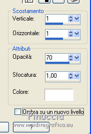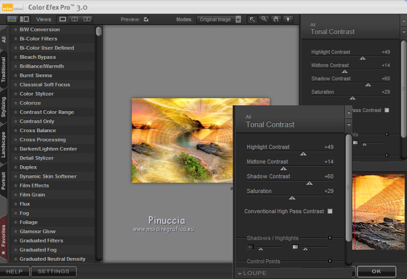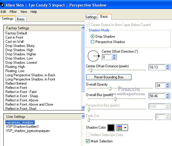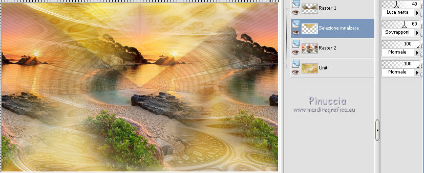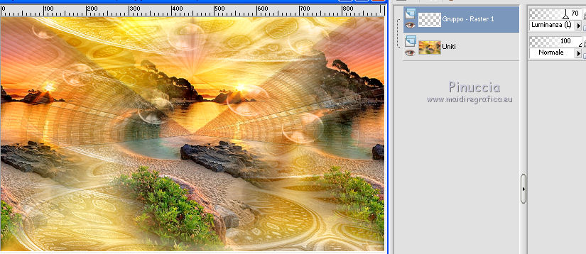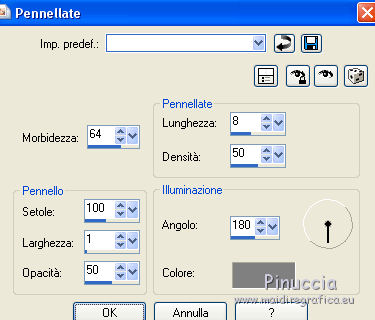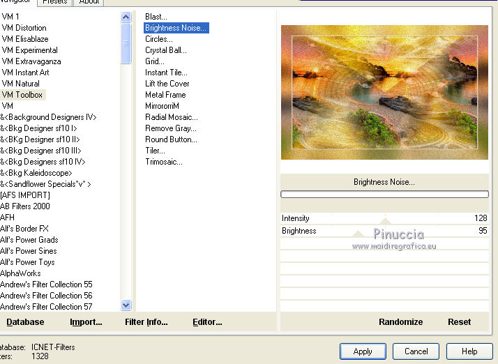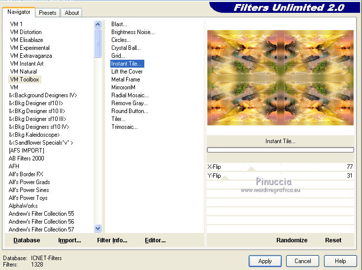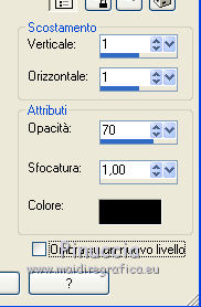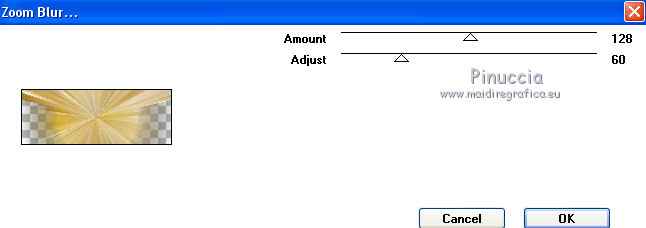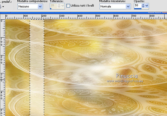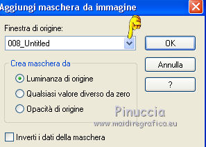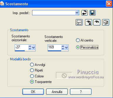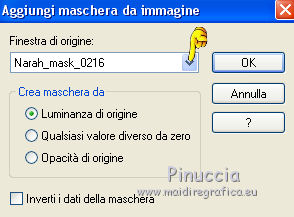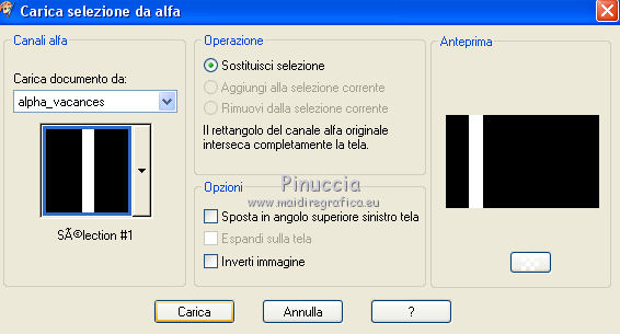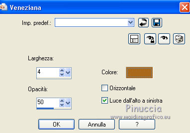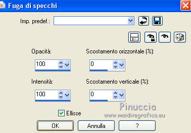 qui puoi trovare qualche risposta ai tuoi dubbi. Se l'argomento che ti interessa non è presente, ti prego di segnalarmelo. Questo tutorial è una creazione di Saturnella e non può essere copiato su altri siti nè essere offerto per il download. Lo stesso vale per la mia traduzione. E' anche proibito togliere il watermark dal materiale; rispettiamo il lavoro dei creatori di tubes, senza i quali non potremmo creare tutorials. Per tradurre questo tutorial, creato con PSP17, ho usato CorelX, ma può essere eseguito anche con le altre versioni di PSP. Dalla versione X4, il comando Immagine>Rifletti è stato sostituito con Immagine>Capovolgi in orizzontale, e il comando Immagine>Capovolgi con Immagine>Capovolgi in verticale. Nelle versioni X5 e X6, le funzioni sono state migliorate rendendo disponibile il menu Oggetti. Nel nuovo X7 sono tornati i comandi Immagine>Rifletti e Immagine>Capovolgi, ma con nuove funzioni. Vedi la scheda sull'argomento qui Occorrente: Materiale qui Grazie per i tubes Nicole e Syl, per la maschera Narah. (in questa pagina trovi i links ai loro siti). Filtri in caso di dubbi, ricorda di consultare la mia sezione filtri qui Filters Unlimited 2.0 qui Nik Software - Color Efex qui Toadies - What are you qui VM Toolbox - Zoom blur, Brightness noise, Instant Tile qui I filtri VM Toolbox e Toadies si possono usare da soli o importati in Filters Unlimited (come fare vedi qui) Se un filtro fornito appare con questa icona ![]() non esitare a cambiare modalità di miscelatura e opacità secondo i colori utilizzati. Nelle ultime versioni di PSP non c'è il gradiente di primo piano/sfondo (Corel_06_029) Trovi i gradienti delle versioni precedenti qui Metti il preset Cliccando sul file una o due volte (a seconda delle tue impostazioni), automaticamente il preset si installerà nella cartella corretta. perchè uno o due clic vedi qui Apri la maschera in PSP e minimizzala con il resto del materiale. 1. Imposta il colore di primo piano con #ffffff, e il colore di sfondo con il colore scuro #aa691b. ![]() 2. Apri alpha_vacances. Finestra>Duplica, o sulla tastiera maiuscola+D, per fare una copia. ![]() Chiudi l'originale. La copia, che sarà la base del tuo lavoro, non è vuota, ma contiene le selezioni salvate sul canale alfa. 3. Selezione>Seleziona tutto. Apri l'immagine JHanna_020 bground.jpg e vai a Modifica>Copia. Torna al tuo lavoro e vai a Modifica>Incolla nella selezione. Selezione>Deseleziona. Puoi colorizzare l'immagine in base ai tuoi colori. 4. Effetti>Effetti tecniche di disegno>Pennellate - colore #808080. ![]() 5. Livelli>Nuovo livello raster. Riempi con il colore bianco.Livelli>Nuovo livello maschera>Da immagine. Apri il menu sotto la finestra di origine e vedrai la lista dei files aperti. Seleziona la maschera 008_untitled. ![]() Regola>Messa a fuoco>Accentua messa a fuoco. Livelli>Unisci>Unisci gruppo. 6. Effetti>Effetti di immagine>Motivo unico. ![]() 7. Effetti>Effetti 3D>Sfalsa ombra. ![]() Livelli>Unisci>unisci visibile. 8. Selezione>Carica/Salva selezione>Carica selezione da canale alfa. La selezione sélection#1 è subito disponibile. Devi soltanto cliccare Carica. ![]() Livelli>Nuovo livello raster. Abbassa l'opacità dello strumento Riempimento a 50 e riempi la selezione con il colore bianco.![]() 9. Effetti>Effetti di trama>Veneziana - colore di sfondo. ![]() Selezione>Deseleziona. 10. Effetti>Pugins>Toadies - What are you, con i settaggi standard. ![]() Effetti>Effetti di bordo>Aumenta. 11. Effetti>Effetti di distorsione>Coordinate polari. ![]() 12. Effetti>Effetti 3D>Sfalsa ombra. ![]() Livelli>Duplica. Immagine>Rifletti. Livelli>Unisci>Unisci giù. Cambia la modalità di miscelatura di questo livello in Luce netta, e abbassa l'opacità al 40%. ![]() 13. Effetti>Effetti di riflesso>Fuga di specchi. ![]() 14. Apri il tube del paesaggio di Syl, elimina il watermark, e vai a Modifica>Copia. Torna al tuo lavoro e vai a Modifica>Incolla come nuovo livello. 15. Effetti>Effetti di immagine>Motivo unico. ![]() Livelli>Disponi>Sposta giù. 16. Attiva il livello di sfondo. Selezione>Carica/Salva selezione>Carica selezione da canale alfa. Apri il menu delle selezioni e carica sélection#2. ![]() Selezione>Innalza selezione a livello. 17. Livelli>Disponi>Porta in alto. Effetti>Plugins>VM Toolbox - Zoom blur. ![]() Selezione>Deseleziona. Livelli>Disponi>Sposta giù. Cambia la modalità di miscelatura di questo livello in Sovrapponi, o secondo i tuoi colori, e abbassa l'opacità al 60%. ![]() Livelli>Unisci>Unisci visibile. 18. Effetti>Plugins>Nik Software - Color Efex Pro - Tonal contrast. ![]() 19. Livelli>Nuovo livello raster. Riporta l'opacità dello strumento Riempimento a 100 e riempi la selezione con il colore bianco.Livelli>Nuovo livello maschera>Da immagine. Apri il menu sotto la finestra di origine e vedrai la lista dei files aperti. Seleziona la maschera Narah_mask_0216. ![]() Effetti>Effetti di bordo>Aumenta. Livelli>Unisci>Unisci gruppo. 20. Immagine>Ridimensiona, all'80%, tutti i livelli non selezionato. 21. Effetti>Effetti di immagine>Scostamento. ![]() Cambia la modalità di miscelatura di questo livello in Luminanza (esistente), o secondo i tuoi colori, e abbassa l'opacità al 70%. ![]() Livelli>Unisci>Unisci visibile. Modifica>Copia. 22. Immagine>Aggiungi bordatura, 1 pixel, simmetriche, colore scuro. Immagine>Aggiungi bordatura, 3 pixels, simmetriche, colore bianco. Immagine>Aggiungi bordatura, 1 pixel, simmetriche, colore scuro. Immagine>Aggiungi bordatura, 50 pixels, simmetriche, colore bianco. 23. Attiva lo strumento Bacchetta magica ![]() e clicca nel bordo bianco da 50 pixels per selezionarlo. Modifica>Incolla nella selezione. 24. Regola>Sfocatura>Sfocatura gaussiana - raggio 25. ![]() 25. Effetti>Plugins>Filters Unlimited 2.0 - VM Toolbox - Brightness Noise. ![]() 26. Effetti>Plugins>Filters Unlimited - VM Toolbox - Instant Tile, con i settaggi standard. ![]() 27. Selezione>Inverti. Effetti>Effetti 3D>Sfalsa ombra. ![]() Selezione>Deseleziona. 2