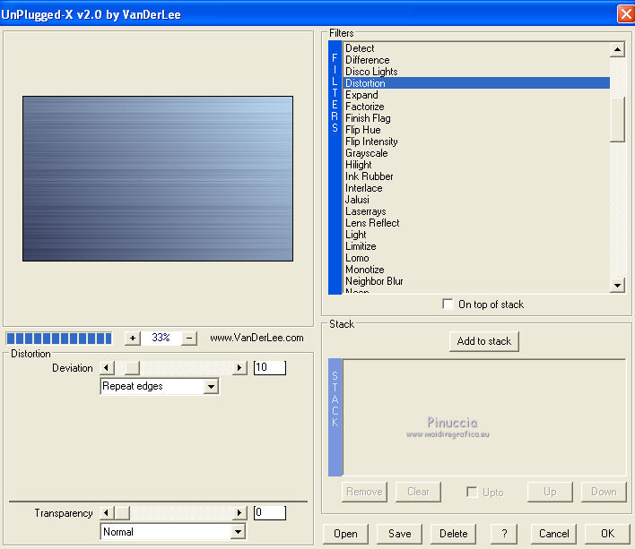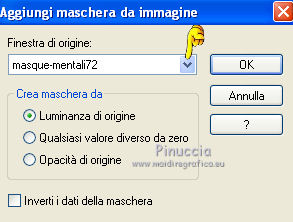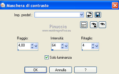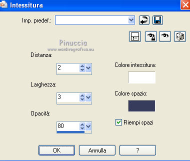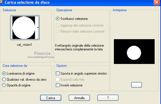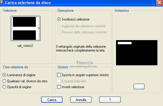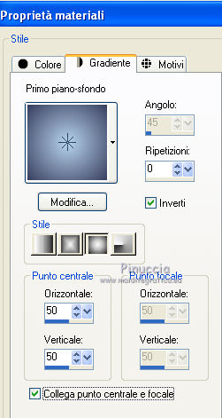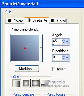 qui puoi trovare qualche risposta ai tuoi dubbi. Se l'argomento che ti interessa non è presente, ti prego di segnalarmelo. Questo tutorial è una creazione di Saturnella e non può essere copiato su altri siti nè essere offerto per il download. Lo stesso vale per la mia traduzione. E' anche proibito togliere il watermark dal materiale; rispettiamo il lavoro dei creatori di tubes, senza i quali non potremmo creare tutorials. Il tutorial è stato creato con PSP12, ma può essere eseguito anche con le altre versioni. Per tradurlo, ho usato PSP X. Occorrente: Materiale qui Il tube della donna è di Gina. Il tube dell'occhio è di Maryse. La maschera è di Mentali. (in questa pagina trovi i links ai loro siti). Filtri in caso di dubbi, ricorda di consultare la mia sezione filtri qui Flaming Pear - Ornament qui Vanderlee Unplugged X - Distortion qui Alien Skin Eye Candy 5 Impact qui FM Tile Tools - Blend Emboss qui ![]() non esitare a cambiare modalità di miscelatura e opacità secondo i colori utilizzati. Apri il font e minimizzalo. Lo troverai nella lista dei font disponibili quando ti servirà. Metti le selezioni nella cartella Selezioni. Apri la maschera in PSP e minimizzala con il resto del materiale. 1. Imposta il colore di primo piano con #373d5d, e il colore di sfondo con #b7d4ed. ![]() Passa il colore di primo piano a Gradiente lineare. ![]() 2. Apri una nuova immagine trasparente 900 x 550 pixels, e riempila con il gradiente.3. Effetti>Plugins>VanDerLee - Unplugged X - Distortion. ![]() Effetti>Effetti di bordo>Aumenta. 4. Livelli>Nuovo livello raster. Riempi con il colore scuro.5. Livelli>Nuovo livello maschera>Da immagine. Apri il menu sotto la finestra di origine e vedrai la lista dei files aperti. Seleziona la maschera mentali72. ![]() Effetti>Effetti di bordo>Aumenta. Livelli>Unisci>Unisci gruppo. Cambia la modalità di miscelatura di questo livello in Moltiplica. 6. Livelli>Unisci>Unisci giù. 7. Selezione>Carica/Salva selezione>Carica selezione da disco. Cerca e carica la selezione sat_vision1. ![]() 8. Livelli>Nuovo livello raster. Apri il tube MT_TimeEye e vai a Modifica>Copia. Torna al tuo lavoro e vai a Modifica>Incolla nella selezione. Selezione>Deseleziona. Cambia la modalità di miscelatura di questo livello in Luce netta. Posiziona correttamente la pupilla al centro della maschera.![]() 9. Effetti>Plugins>FM Tile Tools - Blend Emboss, con i settaggi standard. ![]() 10. Attiva il livello di sfondo. 11. Selezione>Carica/Salva selezione>Carica selezione da disco. Carica nuovamente la selezione sat_vision1. ![]() 12. Selezione>Inverti. Selezione>Innalza selezione a livello. Selezione>Deseleziona. 13. Immagine>Ruota per gradi - 90 gradi a sinistra. ![]() 14. Effetti>Plugins>Flaming Pear - Ornament. Cambia la modalità di miscelatura di questo livello in Luce netta e abbassa l'opacità al 30%. 15. Attiva lo strumento Bacchetta magica e clicca nell'ovale trasparente a sinistra per selezionarlo. ![]() 16. Modifica>Incolla nella selezione (il tube di Maryse è ancora in memoria). Selezione>Deseleziona. Cambia la modalità di miscelatura di questo livello in luce netta, e abbassa l'opacità al 70%. 17. Attiva il livello superiore. Selezione>Carica/Salva selezione>Carica selezione da disco. Cerca e carica la selezione sat_vision2. ![]() 18. Cambia i settaggi del gradiente. ![]() Livelli>Nuovo livello raster. Riempi con il gradiente.19. Effetti>Effetti di trama>Intessitura. colore intessitura: bianco - colore spazio: il tuo colore scuro. ![]() Effetti>Effetti di bordo>Aumenta. Selezione>Deseleziona. 20. Effetti>Effetti di distorsione>Vento - da sinistra, intensità 100. ![]() Ripeti l'Effetto Vento, questa volta da destra. ![]() 21. Livelli>Duplica. Immagine>Rifletti. Livelli>Unisci>Unisci giù. Livelli>Duplica. Immagine>Capovolgi. Livelli>Unisci>Unisci giù. Cambia la modalità di miscelatura di questo livello in Indebolisci. 22. Immagine>Aggiungi bordatura, 2 pixels, simmetriche, con il colore scuro. Immagine>Aggiungi bordatura, 25 pixels, simmetriche, con il colore bianco. Seleziona il bordo bianco con la bacchetta magica ![]() 23. Effetti>Effetti 3D>Ritaglio. ![]() Selezione>Deseleziona. 24. Immagine>Aggiungi bordatura, 4 pixels, simmetriche, con il colore scuro. Immagine>Aggiungi bordatura, 35 pixels, simmetriche, con il colore bianco. Seleziona il bordo bianco con la bacchetta magica ![]() 25. Effetti>Effetti 3D>Ritaglio, con i settaggi precedenti. Selezione>Deseleziona. 26. Apri il tube della donna di Gina e vai a Modifica>Copia. Torna al tuo lavoro e vai a Modifica>Incolla come nuovo livello. Immagine>Rifletti. Sposta il tube a destra.27. Effetti>Effetti 3D>Sfalsa ombra. ![]() 28. Imposta il colore di sfondo con il colore bianco e chiudi il colore di primo piano. Attiva lo strumento Testo , font An Creondovrai regolare i settaggi in base al testo e alla versione di PSP che stai usando ![]() Scrivi la parola "Vision". Livelli>Converti in livello raster. 29. Effetti>Effetti 3D>Sfalsa ombra. ![]() 30. Effetti>Plugins>Alien skin Eye Candy 5 Impact - Perspective Shadow. Seleziona il preset Reflet in front, Sharp e ok. ![]() Sposta il testo in basso,vedi l'esempio finale. 31. Firma il tuo lavoro. Livelli>Unisci>Unisci tutto. 32. Immagine>Aggiungi bordatura, 1 pixel, simmetriche, con il colore nero. 33. Immagine>Ridimensiona, a 900 pixels di larghezza. Regola>Messa a fuoco>Maschera di contrasto. ![]() Salva in formato jpg. ![]() Se hai problemi o dubbi, o trovi un link non funzionante, o anche soltanto per dirmi che ti è piaciuto, scrivimi. 12 Maggio 2012 |