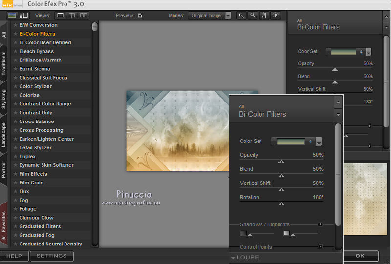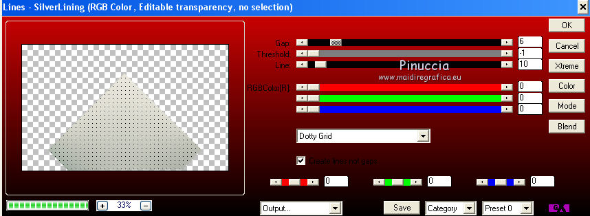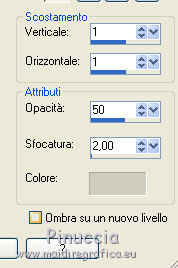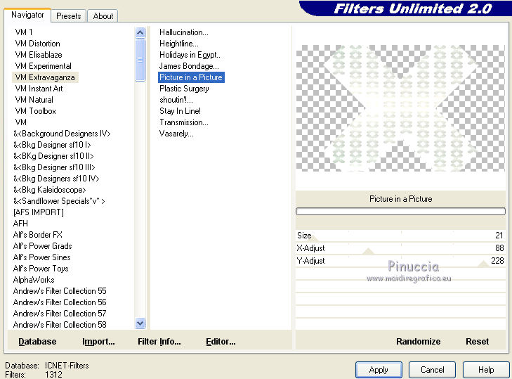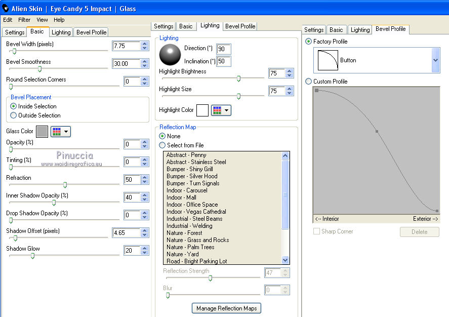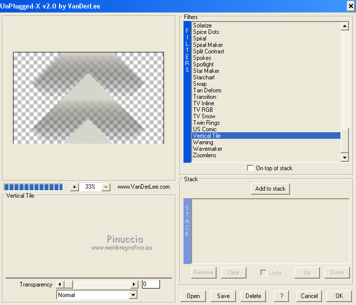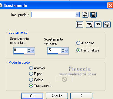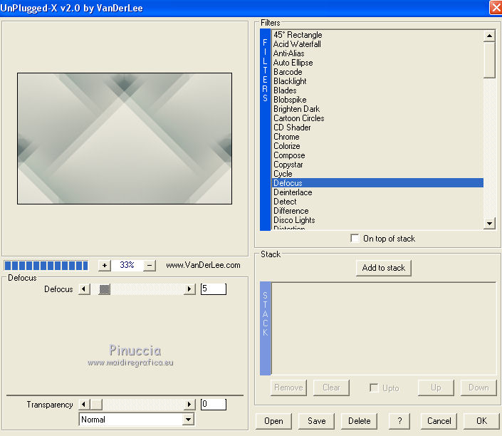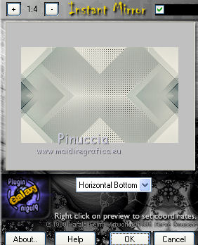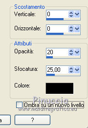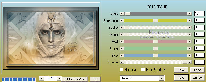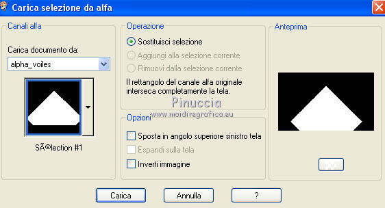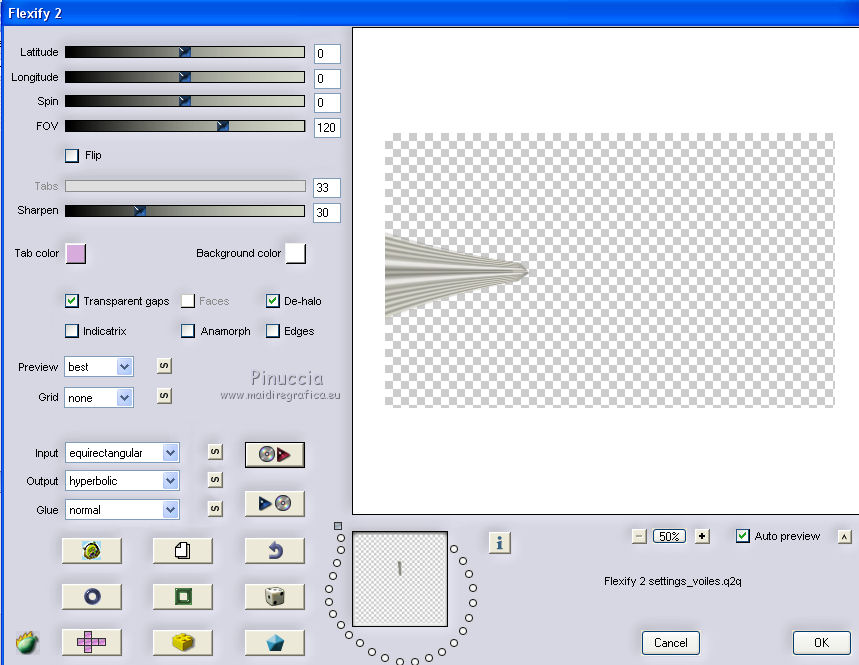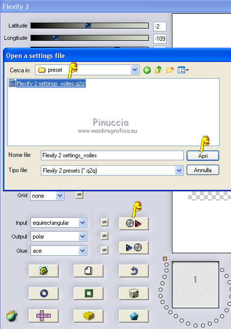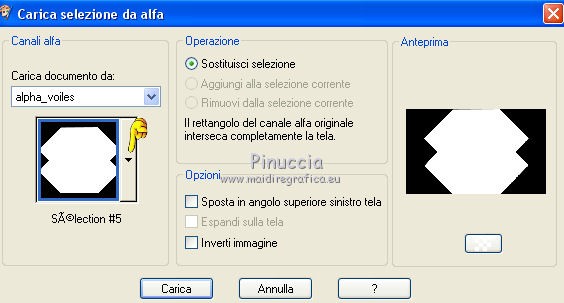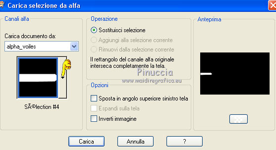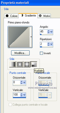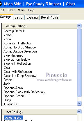 qui puoi trovare qualche risposta ai tuoi dubbi. Se l'argomento che ti interessa non è presente, ti prego di segnalarmelo. Questo tutorial è una creazione di Saturnella e non può essere copiato su altri siti nè essere offerto per il download. Lo stesso vale per la mia traduzione. E' anche proibito togliere il watermark dal materiale; rispettiamo il lavoro dei creatori di tubes, senza i quali non potremmo creare tutorials. Per tradurre questo tutorial, creato con PSP17, ho usato CorelX, ma può essere eseguito anche con le altre versioni di PSP. Dalla versione X4, il comando Immagine>Rifletti è stato sostituito con Immagine>Capovolgi in orizzontale, e il comando Immagine>Capovolgi con Immagine>Capovolgi in verticale. Nelle versioni X5 e X6, le funzioni sono state migliorate rendendo disponibile il menu Oggetti. Nel nuovo X7 sono tornati i comandi Immagine>Rifletti e Immagine>Capovolgi, ma con nuove funzioni. Vedi la scheda sull'argomento qui Occorrente: Materiale qui Grazie per i tubes Radyga e Guismo (in questa pagina trovi i links ai loro siti). Filtri in caso di dubbi, ricorda di consultare la mia sezione filtri qui Filters Unlimited 2.0 qui VanDerLee - Unplugged-X qui AP 01 [Innovations] - Lines SilverLining qui Plugin Galaxy - Instant Mirror qui Alien Skin Eye Candy 5 Impact - Glass qui VM Extravaganza - Picture in a picture qui Flaming Pear - Flexify 2 qui Nik Software - Color Efex 3 qui Toadies - What are you qui AAA Frames - Foto Frame qui I filtri VM Extravaganza e Toadies si possono usare da soli o importati in Filters Unlimited (come fare vedi qui) Se un filtro fornito appare con questa icona ![]() non esitare a cambiare modalità di miscelatura e opacità secondo i colori utilizzati. Nelle ultime versioni di PSP non c'è il gradiente di primo piano/sfondo (Corel_06_029) Trovi i gradienti delle versioni precedenti qui Metti il preset Cliccando sul file una o due volte (a seconda delle tue impostazioni), automaticamente il preset si installerà nella cartella corretta. perchè uno o due clic vedi qui Metti il preset per Flexify in una cartella a scelta. Da questa cartella lo importerai quando ti servirà. 1. Imposta il colore di primo piano con il colore chiaro #cfccc0, e il colore di sfondo con il colore scuro #717978. ![]() Passa il colore di primo piano a Gradiente di primo piano/sfondo, stile Radiale. ![]() Apri alpha_voiles. Finestra>Duplica, o sulla tastiera maiuscola+D, per fare una copia. ![]() Chiudi l'originale. La copia, che sarà la base del tuo lavoro, non è vuota, ma contiene le selezioni salvate sul canale alfa. 2. Riempi l'immagine trasparente con il gradiente.3. Effetti>Effetti di immagine>Motivo unico, con i settaggi standard. ![]() 4. Livelli>Duplica. Immagine>Rifletti. se stai usando Corel X17: Immagine>Rifletti>Rifletti orizzontalmente. Cambia la modalità di miscelatura di questo livello in Luce netta, o secondo i tuoi colori. Livelli>Unisci>Unisci giù. 5. Effetti>Plugins>VanDerLee - Unplugged-X - Defocus ![]() Effetti>Effetti di bordo>Aumenta. 6. Selezione>Carica/Salva selezione>Carica selezione da canale alfa. La selezione sélection#1 è subito disponibile. Devi soltanto cliccare Carica. ![]() Selezione>Innalza selezione a livello. Selezione>Deseleziona. 7. Effetti>Plugins>AP01 [Innovations] - Lines SilverLining. ![]() 8. Effetti>Plugins>VanDerLee - Unplugged-X - Vertical Tile. ![]() Livelli>Unisci>Unisci visibile. 9. Effetti>Plugins>The Plugin Site - Instant Mirror. il filtro Plugin Galaxy nella lista dei filtri si presenta sotto The Plugin Site ![]() 10. Selezione>Carica/Salva selezione>Carica selezione da canale alfa. Apri il menu delle selezioni e carica sélection#2. ![]() Selezione>Innalza selezione a livello. Selezione>Deseleziona. 11. Effetti>Plugins>Filters Unlimited 2.0 - VM Extravaganza - Picture in a picture, con i settaggi standard. ![]() Cambia la modalità di miscelatura di questo livello in Luce diffusa, o secondo i tuoi colori. 12. Attiva il livello di sfondo. Selezione>Carica/Salva selezione>Carica selezione da canale alfa. Apri il menu delle selezioni e carica sélection#3. ![]() Selezione>Innalza selezione a livello. Selezione>Deseleziona. 13. Effetti>Effetti di trama>Veneziana. ![]() 14. Effetti>Plugins>Alien Skin Eye Candy 5 Impact - Glass. Seleziona il preset voiles_glass e ok. ![]() Questi i settaggi che puoi copiare in caso di problemi con il preset. ![]() Livelli>Unisci>Unisci visibile. 15. Effetti>Plugins>The Plugins Site (Galaxy) - Instant Mirror. ![]() 16. Selezione>Carica/Salva selezione>Carica selezione da canale alfa. Apri il menu delle selezioni e carica sélection#4. ![]() Selezione>Innalza selezione a livello. Selezione>Deseleziona. 17. Effetti>Plugins>Flaming Pear - Flexify 2. Clicca sull'icona con la freccia rossa e cerca, nella cartella in cui lo hai copiato, il preset settings_voiles.q2q ![]() In caso di problemi con il preset, copia i settaggi della schermata. ![]() 18. Immagine>Ridimensiona, al 50%, tutti i livelli non selezionato. 19. Effetti>Effetti di immagine>Scostamento. ![]() Regola>Messa a fuoco>Metti a fuoco. 20. Livelli>Duplica. Immagine>Rifletti. con corel17: Immagine>Rifletti>Rifletti orizzontalmente. Livelli>Unisci>Unisci giù. 21. Effetti>Effetti 3D>Sfalsa ombra. ![]() 22. Attiva il livello di sfondo. Selezione>Carica/Salva selezione>Carica selezione da canale alfa. Apri il menu delle selezioni e carica sélection#5. ![]() Selezione>Innalza selezione a livello. Mantieni selezionato. 23. Livelli>Nuovo livello raster. Apri il tube del paesaggio di Guismo e vai a Modifica>Copia. Torna al tuo lavoro e vai a Modifica>Incolla nella selezione. Cambia la modalità di miscelatura di questo livello in Luminanza (o secondo i tuoi colori) e abbassa l'opacità al 75%. Livelli>Unisci>Unisci giù. Selezione>Deseleziona. 24. Effetti>Effetti 3D>Sfalsa ombra, con i settaggi precedenti. 25. Attiva il livello superiore. Apri il tube deco_voiles e vai a Modifica>Copia. Torna al tuo lavoro e vai a Modifica>Incolla c