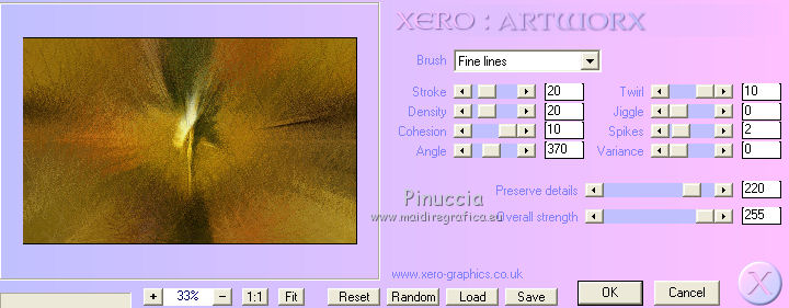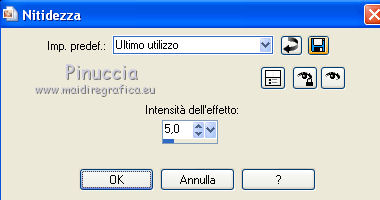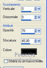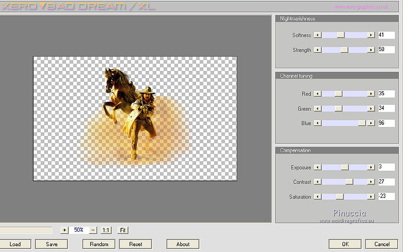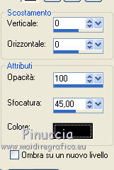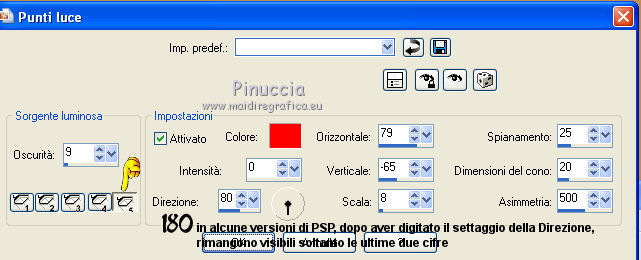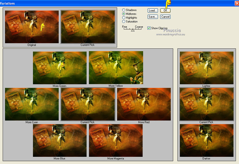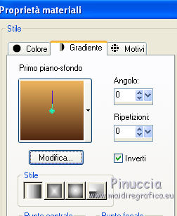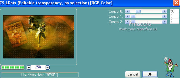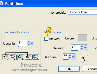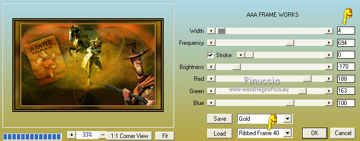 qui puoi trovare qualche risposta ai tuoi dubbi. Se l'argomento che ti interessa non è presente, ti prego di segnalarmelo. Questo tutorial è una creazione di Saturnella e non può essere copiato su altri siti nè essere offerto per il download. Lo stesso vale per la mia traduzione. E' anche proibito togliere il watermark dal materiale; rispettiamo il lavoro dei creatori di tubes, senza i quali non potremmo creare tutorials. Il tutorial è stato creato con PSP12, ma può essere eseguito anche con le altre versioni. Per tradurlo, ho usato PSP X. Occorrente: Materiale qui Il tube del cowboy è di Niaga. I tubes "western" sono di Purple folie (in questa pagina trovi i links ai loro siti). Filtri in caso di dubbi, ricorda di consultare la mia sezione filtri qui FM Tile Tools - Blend Emboss qui Xero - Bad Dream XL qui Xero - Artworx qui Carolaine&Sensibility qui AAA Frames - Frame works qui Adjust - Variations qui ![]() non esitare a cambiare modalità di miscelatura e opacità secondo i colori utilizzati. 1. Imposta il colore di primo piano con #eeb55f, e il colore di sfondo con #512912. ![]() Passa il colore di primo piano a Gradiente, stile Lineare. ![]() 2. Apri una nuova immagine trasparente 900 x 550 pixels, e riempila con il gradiente.3. Livelli>Nuovo livello raster. Selezione>Seleziona tutto. 4. Apri l'immagine di sfondo "background 141" e vai a Modifica>Copia. Torna al tuo lavoro e vai a Modifica>Incolla nella selezione. Selezione>Deseleziona. Cambia la modalità di miscelatura di questo livello in Luce netta, e abbassa l'opacità all'80%. 5. Effetti>Effetti di immagine>Motivo unico. ![]() 6. Livelli>Unisci>Unisci visibile. 7. Livelli>Nuovo livello raster. Selezione>Seleziona tutto. 8. Apri l'immagine di sfondo "3d_116" e vai a Modifica>Copia. Torna al tuo lavoro e vai a Modifica>Incolla nella selezione. Selezione>Deseleziona. Cambia la modalità di miscelatura di questo livello in Luce diffusa (opacità 100). 9. Effetti>Plugins>FM Tile Tools - Blend Emboss, con i settaggi standard. ![]() 10. Livelli>Nuovo livello raster. Selezione>Seleziona tutto. 11. Apri il tube del carro "hslbwxzqpurplefolie" e vai a Modifica>Copia. Torna al tuo lavoro e vai a Modifica>Incolla nella selezione. Cambia la modalità di miscelatura di questo livello in Luminanza, e abbassa l'opacità al 21%. Selezione>Deseleziona. 12. Apri il tube del manifesto ecg9n8grpurplefolie e vai a Modifica>Copia. Torna al tuo lavoro e vai a Modifica>Incolla come nuovo livello. 13. Apri il tube dell'uomo con i baffi kxh0865mpurplefolie e vai a Modifica>Copia. Torna al tuo lavoro e vai a Modifica>Incolla come nuovo livello. Immagine>Ridimensiona, all'80%, tutti i livelli non selezionato. Posiziona il tube sul manifesto.Effetti>Effetti 3D>Sfalsa ombra. ![]() 14. Livelli>Unisci>Unisci giù. 15. Immagine>Ridimensiona, al 70%, tutti i livelli non selezionato. 16. Immagine>Ruota per gradi - 20 gradi a sinistra. ![]() Posiziona correttamente il manifesto,come nel mio esempio. 17. Effetti>Effetti 3D>Sfalsa ombra, con i settaggi precedenti. Cambia la modalità di miscelatura di questo livello a tuo piacimento. Per il mio esempio Luce netta, opacità 80%. 18. Apri il tube dell'uomo col cavallo vlgtyoz0purplefolie e vai a Modifica>Copia. Torna al tuo lavoro e vai a Modifica>Incolla come nuovo livello. Spostalo al centro.19. Effetti>Plugins>Xero - Bad Dream XL. ![]() 20. Livelli>Unisci>Unisci visibile. 21. Effetti>Plugins>Adjust - Variations Attenzione! questi settaggi valgono per i colori dell'esempio, se stai usando altri colori dovrai adattare i settaggi ai tuoi colori: 1 clic su Original per annullare eventuali precedenti settaggi memorizzati dal filtro. 1 clic su More Green e ok. ![]() 22. Apri il tube del cowboy "homm6_niaga" e vai a Modifica>Copia. Torna al tuo lavoro e vai a Modifica>Incolla come nuovo livello. 23. Immagine>Ridimensiona, al 120%, tutti i livelli non selezionato. Regola>Messa a fuoco>Metti a fuoco. 24. Regola>Luminosità e contrasto>Nitidezza ![]() Sposta il tube in basso a destra.25. Effetti>Effetti di illuminazione>Punti luce. Assicurati che siano disattivati i punti luce da 1 a 4: per fare questo clicca su ogni punto luce e togli la selezione dalla casellina Attivato. ![]() Fatto questo, clicca sul punto luce 5 e imposta i seguenti settaggi. ![]() 26. Attiva il livello inferiore di sfondo. 27. Effetti>Plugins>Carolaine and Sensibility - CS-LDots. ![]() 28. Immagine>Aggiungi bordatura, 2 pixels, simmetriche, con il colore scuro. Immagine>Aggiungi bordatura, 4 pixels, simmetriche, con il colore chiaro. 29. Livelli>Duplica. 30. Immagine>Ridimensiona, al 90%, tutti i livelli non selezionato. 31. Attiva il livello inferiore. 32. Effetti>Effetti di immagine>Motivo unico, con i settaggi standard. ![]() 33. Regola>Sfocatura>Sfocatura radiale. ![]() 34. Effetti>Effetti di bordo>Aumenta di più. 35. Effetti>Plugins>Xero - Artworx. ![]() 36. Attiva nuovamente il livello superiore. 37. Effetti>Effetti 3D>Sfalsa ombra. ![]() 38. Immagine>Aggiungi bordatura, 1 pixels, simmetriche, con il colore nero. 39. Effetti>Plugins>AAA Frames - Frame works. Prima seleziona Ribbed Frame 40, e poi cambia la larghezza (width) a 4. ![]() 40. Apri il tube "texte" e vai a Modifica>Copia. Torna al tuo lavoro e vai a Modifica>Incolla come nuovo livello. (Se preferisci, usa un tuo testo). Posiziona il testo dove preferisci.41. Firma il tuo lavoro. Livelli>Unisci>Unisci tutto. Immagine>Ridimensiona, a 900 pixels di larghezza. Salva in formato jpg. ![]() Se hai problemi o dubbi, o trovi un link non funzionante, o anche soltanto per dirmi che ti è piaciuto, scrivimi. 5 Maggio 2012 |