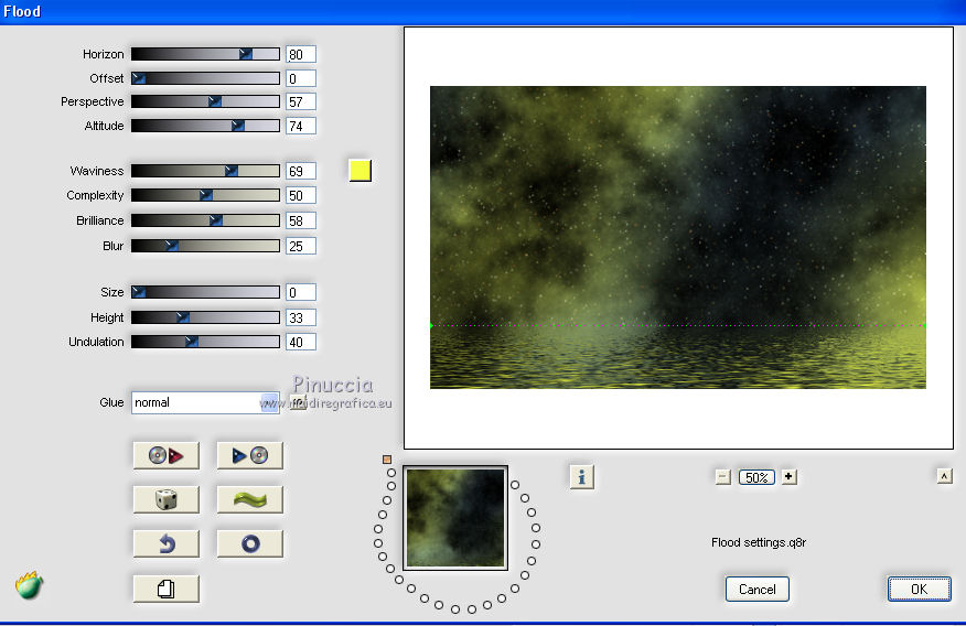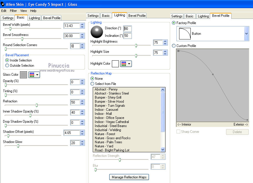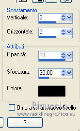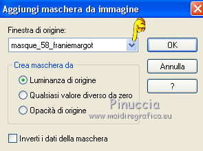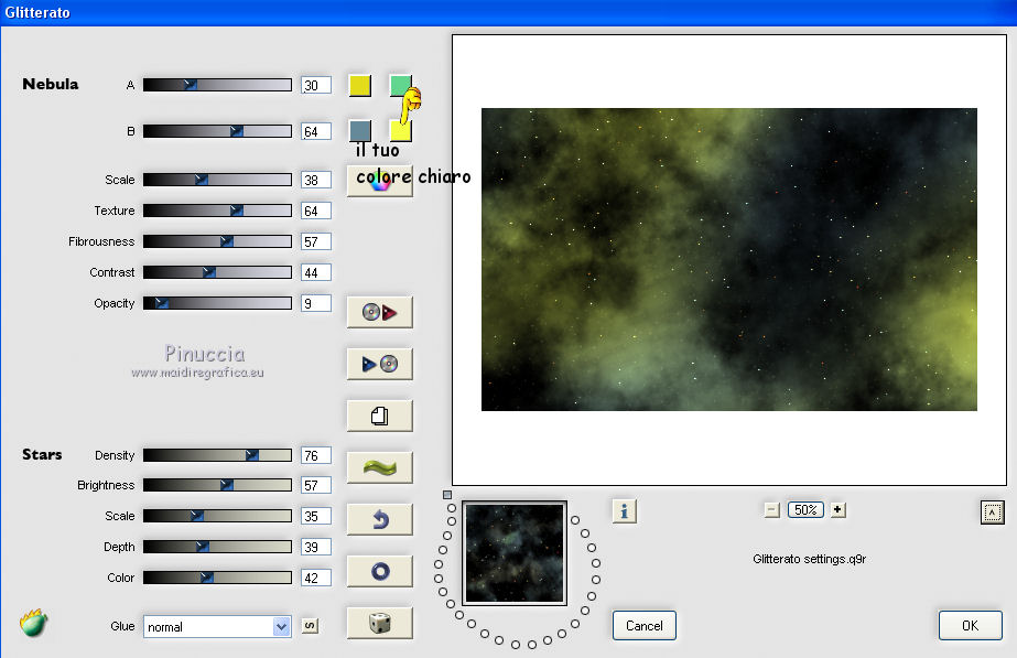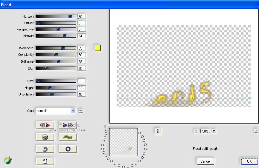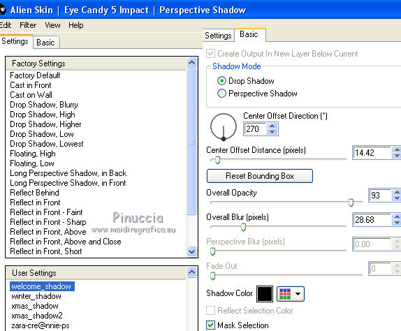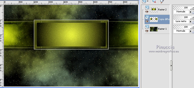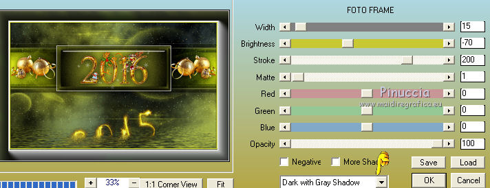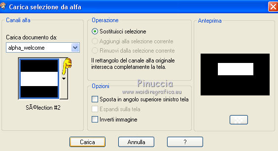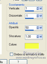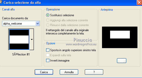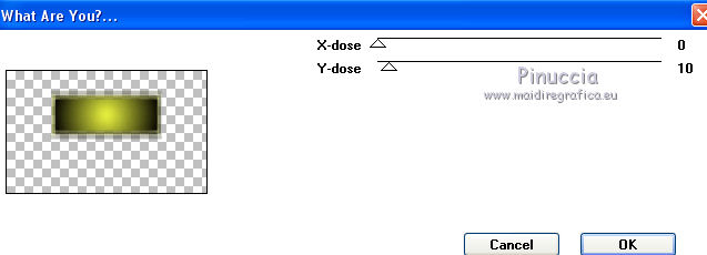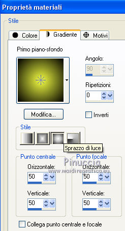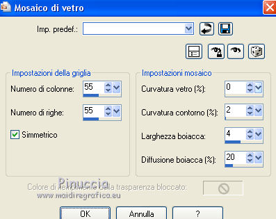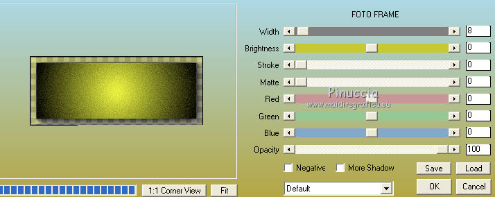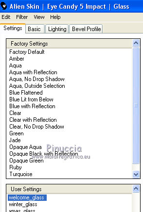 qui puoi trovare qualche risposta ai tuoi dubbi. Se l'argomento che ti interessa non è presente, ti prego di segnalarmelo. Questo tutorial è una creazione di Saturnella e non può essere copiato su altri siti nè essere offerto per il download. Lo stesso vale per la mia traduzione. E' anche proibito togliere il watermark dal materiale; rispettiamo il lavoro dei creatori di tubes, senza i quali non potremmo creare tutorials. Per tradurre questo tutorial, creato con PSP18, ho usato CorelX, ma può essere eseguito anche con le altre versioni di PSP. Dalla versione X4, il comando Immagine>Rifletti è stato sostituito con Immagine>Capovolgi in orizzontale, e il comando Immagine>Capovolgi con Immagine>Capovolgi in verticale. Nelle versioni X5 e X6, le funzioni sono state migliorate rendendo disponibile il menu Oggetti. Nel nuovo X7 sono tornati i comandi Immagine>Rifletti e Immagine>Capovolgi, ma con nuove funzioni. Vedi la scheda sull'argomento qui Occorrente: Materiale qui Grazie per i tubes CibiBijoux, Linda Ferdinand e LisaT; per la maschera Franiemargot. (in questa pagina trovi i links ai loro siti). Filtri in caso di dubbi, ricorda di consultare la mia sezione filtri qui Filters Unlimited 2.0 qui Simple - 4Way Average qui Flaming Pear - Flood qui Flaming Pear - Glitterato qui AAA Frames - Foto Frame qui Alien Skin Eye Candy 5 Impact - Perspective Shadow, Glass qui Teph's Tricks - Slide X 50% qui Toadies - What are you qui I filtri Simple, Teph's Tricks e Toadies si possono usare da soli o importati in Filters Unlimited (come fare vedi qui) Se un filtro fornito appare con questa icona ![]() non esitare a cambiare modalità di miscelatura e opacità secondo i colori utilizzati. Nelle ultime versioni di PSP non c'è il gradiente di primo piano/sfondo (Corel_06_029) Trovi i gradienti delle versioni precedenti qui Metti i preset Cliccando sul file una o due volte (a seconda delle tue impostazioni), automaticamente il preset si installerà nella cartella corretta. perchè uno o due clic vedi qui Apri la maschera in PSP e minimizzala con il resto del materiale. 1. Imposta il colore di primo piano con il colore chiaro #f5ff43, e il colore di sfondo con il colore nero #000000. ![]() Apri alpha_welcome. Finestra>Duplica o sulla tastiera maiuscola+D per fare una copia. ![]() Chiudi l'originale. La copia, che sarà la base del tuo lavoro, non è vuota, ma contiene le selezioni salvate sul canale alfa. 2. Effetti>Plugins>Flaming Pear - Glitterato. ![]() 3. Livelli>Nuovo livello raster. Selezione>Carica/Salva selezione>Carica selezione da canale alfa. La selezione sélection#1 è subito disponibile. Devi soltanto cliccare Carica. ![]() Abbassa l'opacità dello strumento Riempimento a 50 ![]() e riempi la selezione con il colore chiaro.4. Effetti>Effetti di trama>Veneziana, colore nero. ![]() 5. Selezione>Modifica>Contrai - 20 pixels. ![]() Passa il colore di primo piano a Gradiente di primo piano/sfondo, stile Sprazzo di luce. ![]() Riporta l'opacità dello strumento Riempimento a 100, e riempi la selezione con il gradiente.6. Effetti>Effetti di trama>Mosaico di vetro. ![]() 7. Effetti>Effetti 3D>Sfalsa ombra. ![]() Selezione>Deseleziona. 8. Selezione>Carica/Salva selezione>Carica selezione da canale alfa. Carica nuovamente la selezione sélection#1. ![]() Livelli>Nuovo livello raster. Imposta il colore di primo piano con il colore bianco, e riempi la selezione con questo colore.9. Selezione>Modifica>Contrai - 2 pixels. ![]() Premi sulla tastiera il tasto CANC ![]() Livelli>Unisci>Unisci giù. Mantieni selezionato. 10. Effetti>Plugins>AAA Frames - Foto Frame. ![]() Selezione>Deseleziona. 11. Livelli>Duplica. Effetti>Plugins>Toadies - What are you. ![]() Regola>Messa a fuoco>Metti a fuoco. 12. Effetti>Plugins>Teph’s Tricks,Slide X 50%. Livelli>Disponi>Sposta giù. Cambia la modalità di miscelatura di questo livello in Luce netta o altro. 13. Attiva il livello superiore. Effetti>Plugins>Alien Skin Eye Candy 5 Impact - Perspective Shadow. Seleziona il preset welcome_shadow e ok. Questi i settaggi, in caso di problemi con il preset. ![]() 14. Apri il tube 2016 de CibiBijoux, cancella la firma, e vai a Modifica>Copia. Torna al tuo lavoro e vai a Modifica>Incolla come nuovo livello. Immagine>Ridimensiona, al 55%, tutti i livelli non selezionato. Regola>Messa a fuoco>Accentua messa a fuoco. Posiziona correttamente il tube nel rettangolo centrale.15. Effetti>Effetti 3D>Sfalsa ombra, con i settaggi precedenti. Livelli>Unisci>Unisci giù. 16. Selezione>Carica/Salva selezione>Carica selezione da canale alfa. Cerca e carica la selezione sélection#2. ![]() Effetti>Plugins>Alien Skin Eye Candy 5 Impact - Glass. Seleziona il preset welcome_glass e ok. ![]() Questi i settaggi: ![]() 17. Effetti>Effetti 3D>Sfalsa ombra, con i settaggi precedenti. ![]() Selezione>Deseleziona. 18. Attiva il livello di sfondo. Apri il tube 2015 de Linda Ferdinand, cancella la firma, e vai a Modifica>Copia. Torna al tuo lavoro e vai a Modifica>Incolla come nuovo livello. Immagine>Ridimensiona, al 70%, tutti i livelli non selezionato. 19. Immagine>Ruota per gradi - 15 gradi a sinistra. ![]() 20. Effetti>Effetti di immagine>Scostamento. ![]() Regola>Tonalità e saturazione>Tonalità/Saturazione/Luminosità. Adatta al tuo colore chiaro. Per l'esempio: ![]() 21. Effetti>Plugins>Flaming Pear - Flood, con il tuo colore chiaro. ![]() 22. Attiva il livello di sfondo. Effetti>Plugins>Flaming Pear - Flood, cambia soltanto Horizon con 80. ![]() 23. Rimani sul livello di sfondo. Livelli>Nuovo livello raster. Abbassa nuovamente l'opacità dello strumento Riempimento a 50, e riempi con il tuo colore chiaro.24. Livelli>Nuovo livello maschera>Da immagine. Apri il menu sotto la finestra di origine e vedrai la lista dei files aperti. Seleziona la maschera masque-58_franiemargot, con i seguenti settaggi. ![]() Regola>Messa a fuoco>Accentua messa a fuoco. Livelli>Unisci>Unisci gruppo. 25. Effetti>Effetti 3D>Sfalsa ombra, colore chiaro. ![]() 26. Livell