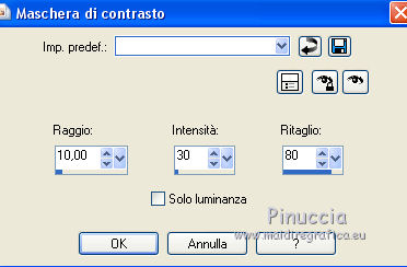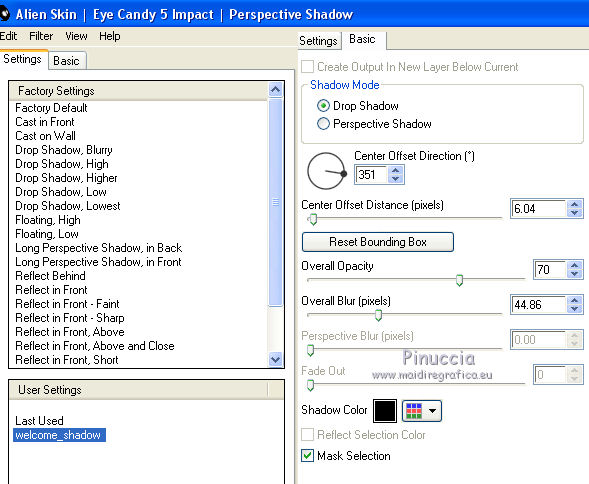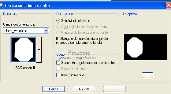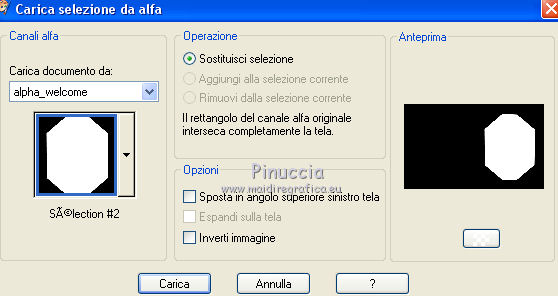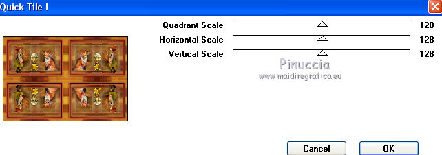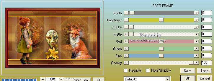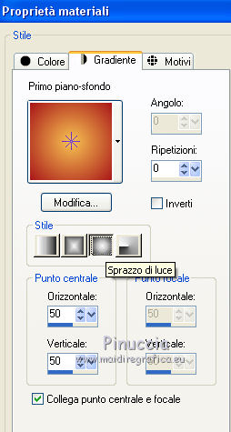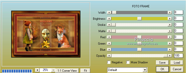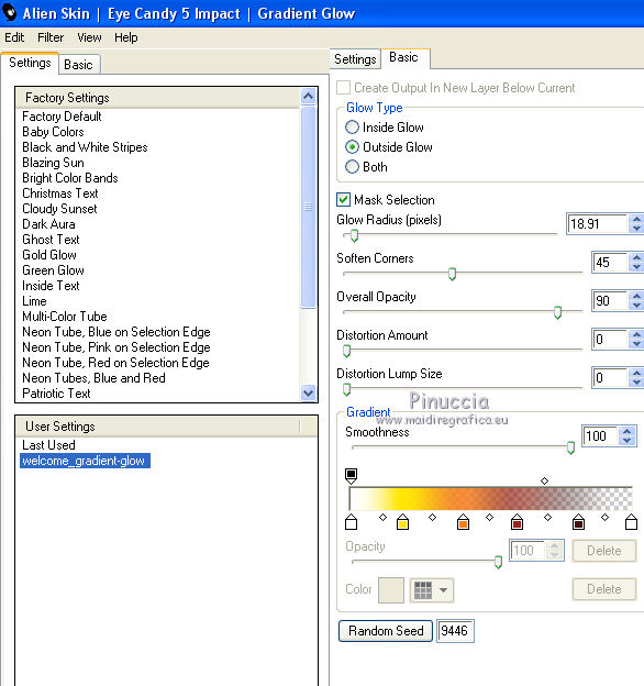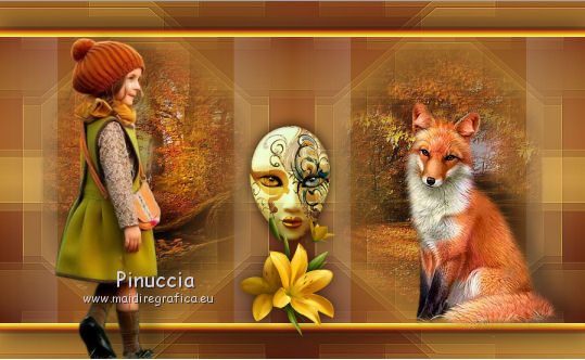 qui puoi trovare qualche risposta ai tuoi dubbi. Se l'argomento che ti interessa non è presente, ti prego di segnalarmelo. Questo tutorial è una creazione di Saturnella e non può essere copiato su altri siti nè essere offerto per il download. Lo stesso vale per la mia traduzione. E' anche proibito togliere il watermark dal materiale; rispettiamo il lavoro dei creatori di tubes, senza i quali non potremmo creare tutorials. Per tradurre questo tutorial, creato con Corel2018, ho usato CorelX, ma può essere eseguito anche con le altre versioni di PSP. Dalla versione X4, il comando Immagine>Rifletti è stato sostituito con Immagine>Capovolgi in orizzontale, e il comando Immagine>Capovolgi con Immagine>Capovolgi in verticale. Nelle versioni X5 e X6, le funzioni sono state migliorate rendendo disponibile il menu Oggetti. Nel nuovo X7 sono tornati i comandi Immagine>Rifletti e Immagine>Capovolgi, ma con nuove funzioni. Vedi la scheda sull'argomento qui Occorrente: Materiale qui Tutto il materiale è di Saturnella. (in questa pagina trovi i links ai loro siti). Filtri in caso di dubbi, ricorda di consultare la mia sezione filtri qui Filters Unlimited 2.0 qui Graphics Plus - Quick Tile I qui FM Tile Tools - Blend Emboss qui AAA Frames - Foto Frame qui Alien Skin Eye Candy 5 Impact - Perspective Shadow, Gradient Glow qui I filtri Graphics Plus si possono usare da soli o importati in Filters Unlimited (come fare vedi qui) Se un filtro fornito appare con questa icona ![]() non esitare a cambiare modalità di miscelatura e opacità secondo i colori utilizzati. Nelle ultime versioni di PSP non c'è il gradiente di primo piano/sfondo (Corel_06_029) Puoi usare i gradienti delle versioni precedenti. Trovi qui i gradienti Corel X. Metti i preset Cliccando sul file una o due volte (a seconda delle tue impostazioni), automaticamente il preset si installerà nella cartella corretta. perchè uno o due clic vedi qui Se preferisci, puoi importare direttamente il preset nel corso del tutorial Come fare vedi la scheda del filtro Eye Candy qui Apri la maschera in PSP e minimizzala con il resto del materiale. 1. Imposta il colore di primo piano con il colore chiaro #f7c252, e il colore di sfondo con il colore scuro #a81619. ![]() Apri alpha_welcome. Finestra>Duplica, o sulla tastiera tasto della maiuscola+D per fare una copia. Chiudi l'originale. La copia, che sarà la base del tuo lavoro, non è vuota, ma contiene due selezioni salvate sul canale alfa. Selezione>Seleziona tutto. Apri l'immagine image_1 e vai a Modifica>Copia. Torna al tuo lavoro e vai a Modifica>Incolla nella selezione. Selezione>Deseleziona. 2. Effetti>Effetti di immagine>Motivo unico. ![]() 3. Regola>Sfocatura>Sfocatura gaussiana - raggio 100. ![]() 4. Livelli>Nuovo livello raster. Riempi con il colore chiaro.Livelli>Nuovo livello maschera>Da immagine Apri il menu sotto la finestra di origine e vedrai la lista dei files aperti. Seleziona la maschera Saturnella_Mask_Abstract019 ![]() Regola>Messa a fuoco>Accentua messa a fuoco. Livelli>Unisci>Unisci gruppo. 5. Effetti>Effetti 3D>Sfalsa ombra. ![]() Livelli>Unisci>Unisci visibile. 6. Livelli>Duplica. Immagine>Ridimensiona, all'80%, tutti i livelli non selezionato. Effetti>Effetti di immagine>Motivo unico. ![]() 7. Selezione>Carica/Salva selezione>Carica selezione da canale alfa. La selezione sélection#1 è subito disponibile. Devi soltanto cliccare Carica. ![]() Livelli>Nuovo livello raster. Apri il tube paysage_1 e vai a Modifica>Copia. Torna al tuo lavoro e vai a Modifica>Incolla nella selezione. Selezione>Deseleziona. 8. Effetti>Plugins>FM Tile Tools - Blend Emboss, con i settaggi standard. ![]() 9. Selezione>Carica/Salva selezione>Carica selezione da canale alfa. Apri il menu delle selezioni e carica la selezione sélection#2. ![]() Livelli>Nuovo livello raster. Apri il tube paysage 2. Immagine>Rifletti. Modifica>Copia. Torna al tuo lavoro e vai a Modifica>Incolla nella selezione. Selezione>Deseleziona. 10. Effetti>Plugins>FM Tile Tools - Blend Emboss, con i settaggi precedenti. Livelli>Unisci>Unisci giù - 2 volte. 11. Effetti>Plugins>Alien Skin Eye Candy 5 Impact - Gradient Glow seleziona il preset welcome_gradient-glow e ok ![]() 12. Effetti>Plugins>Alien Skin Eye Candy 5 Impact - Perspective Shadow Seleziona il preset welcome_shadow e ok ![]() 13. Apri il tube della volpe sat_ren01 e vai a Modifica>Copia. Torna al tuo lavoro e vai a Modifica>Incolla come nuovo livello. Immagine>Ridimensiona, al 60%, tutti i livelli non selezionato. Regola>Messa a fuoco>Metti a fuoco. Spostalo a destra.Effetti>Effetti 3D>Sfalsa ombra. ![]() 14. Apri il tube della bambina sat enf09 e vai a Modifica>Copia. Torna al tuo lavoro e vai a Modifica>Incolla come nuovo livello. Immagine>Ridimensiona, all'80%, tutti i livelli non selezionato. Regola>Messa a fuoco>Metti a fuoco. Spostalo a sinistra.15. Effetti>Effetti 3D>Sfalsa ombra, con i settaggi precedenti. ![]() 16. Apri il tube fant_10 e vai a Modifica>Copia. Torna al tuo lavoro e vai a Modifica>Incolla come nuovo livello. Immagine>Ridimensiona, al 30%, tutti i livelli non selezionato. Regola>Messa a fuoco>Metti a fuoco. Spostalo al centro.Cambia la modalità di miscelatura di questo livello in Luce netta. 17. Effetti>Effetti 3D>Sfalsa ombra. ![]() 18. Apri il tube del fiore "floral4" e vai a Modifica>Copia. Torna al tuo lavoro e vai a Modifica>Incolla come nuovo livello. Immagine>Ridimensiona, al 30%, tutti i livelli non selezionato. Regola>Messa a fuoco>Metti a fuoco. Spostalo in basso al centro.Effetti>Effetti 3D>Sfalsa ombra, con i settaggi precedenti. ![]() 19. Attiva il livello di sfondo. Modifica>Copia. 20. Immagine>Aggiungi bordatura, 2 pixels, simmetriche, colore chiaro. Immagine>Aggiungi bordatura, 4 pixels, simmetriche, colore scuro. Immagine>Aggiungi bordatura, 2 pixels, simmetriche, colore chiaro. Selezione>Seleziona tutto. Immagine>Aggiungi bordatura, 25 pixels, simmetriche, colore bianco. Selezione>Inverti. Passa il colore di primo piano a Gra