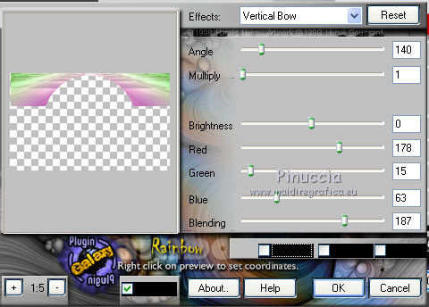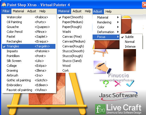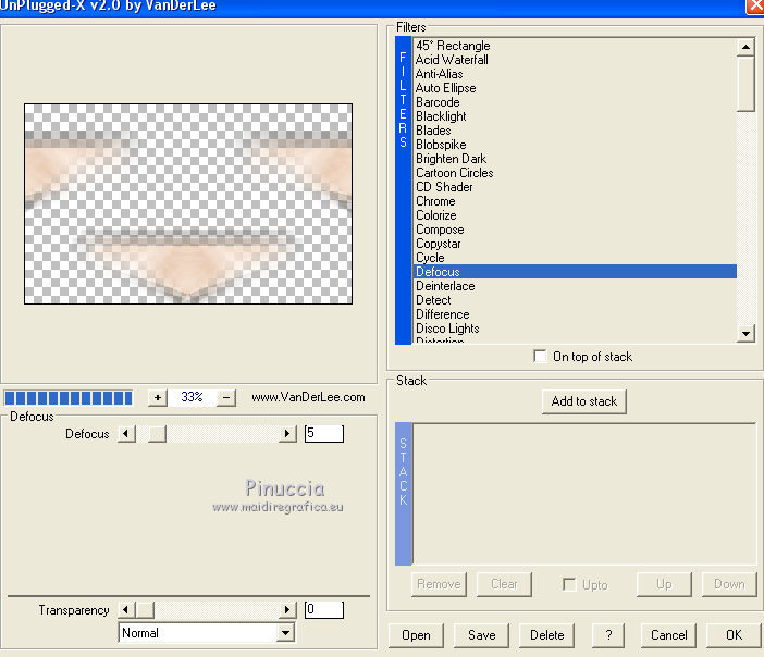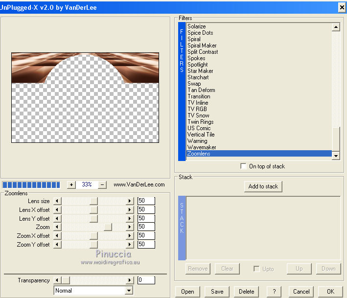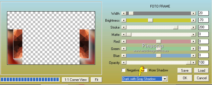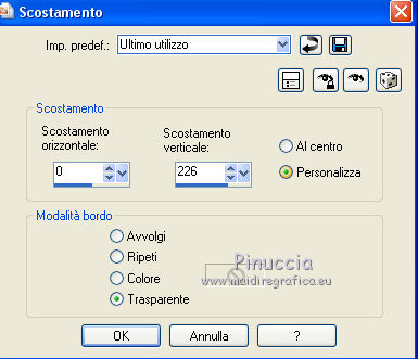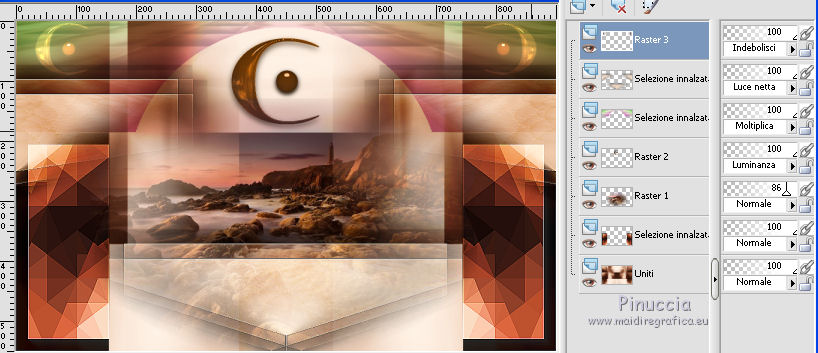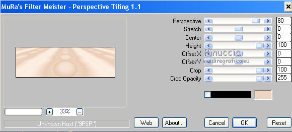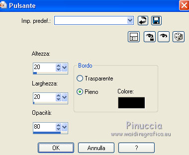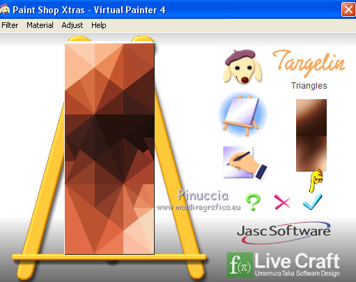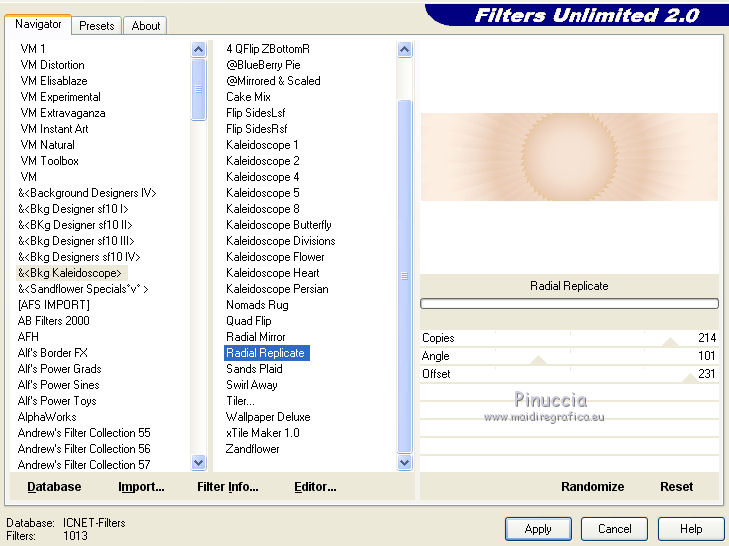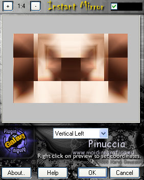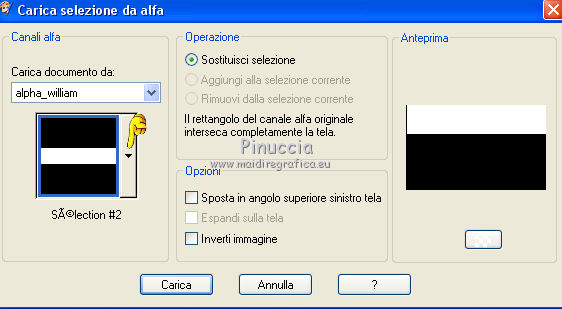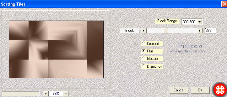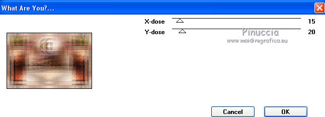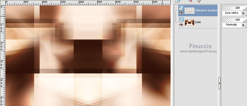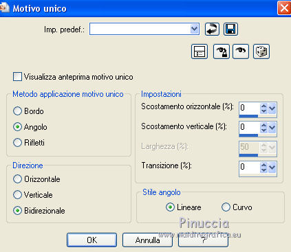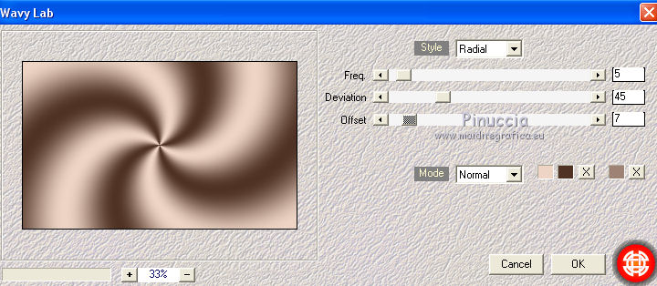 qui puoi trovare qualche risposta ai tuoi dubbi. Se l'argomento che ti interessa non è presente, ti prego di segnalarmelo. Questo tutorial è una creazione di Saturnella e non può essere copiato su altri siti nè essere offerto per il download. Lo stesso vale per la mia traduzione. E' anche proibito togliere il watermark dal materiale; rispettiamo il lavoro dei creatori di tubes, senza i quali non potremmo creare tutorials. Per tradurre questo tutorial, creato con PSP17, ho usato CorelX, ma può essere eseguito anche con le altre versioni di PSP. Dalla versione X4, il comando Immagine>Rifletti è stato sostituito con Immagine>Capovolgi in orizzontale, e il comando Immagine>Capovolgi con Immagine>Capovolgi in verticale. Nelle versioni X5 e X6, le funzioni sono state migliorate rendendo disponibile il menu Oggetti. Nel nuovo X7 sono tornati i comandi Immagine>Rifletti e Immagine>Capovolgi, ma con nuove funzioni. Vedi la scheda sull'argomento qui Occorrente: Materiale qui Grazie per il tube Betsie e per il wordart Yoka. (in questa pagina trovi i links ai loro siti). Filtri in caso di dubbi, ricorda di consultare la mia sezione filtri qui Filters Unlimited 2.0 qui &<Bkg Kaleidoscope> - Radial Replicate (da importare in Unlimited) qui VanDerLee - Unplugged-X qui Mura's Meister - Perspective Tiling qui Simple - Blintz, 4way average qui Mehdi - Wavy Lab, Sorting Tiles qui Plugin Galaxy - Rainbow, Instant Mirror qui Toadies - What are you qui Virtual Painter - Virtual Painter 5 qui AAA Frames - Foto Frame qui I filtri Simple e Toadies si possono usare da soli o importati in Filters Unlimited (come fare vedi qui) Se un filtro fornito appare con questa icona ![]() non esitare a cambiare modalità di miscelatura e opacità secondo i colori utilizzati. 1. Imposta il colore di primo piano con #4f3224. e il colore di sfondo con #eed4c5. ![]() Apri Alpha_william. Finestra>Duplica o sulla tastiera maiuscola+D per fare una copia. ![]() Chiudi l'originale. La copia, che sarà la base del tuo lavoro, non è vuota, ma contiene le selezioni salvate sul canale alfa. 2. Effetti>Plugins>Mehdi - Wavy Lab. questo filtro lavora con i colori della paletta: il primo è il colore di sfondo, il secondo quello di primo piano, mantieni l'ultimo colore creato dal filtro. ![]() 3. Effetti>Plugins>Mehdi - Sorting Tiles. ![]() 4. Livelli>Duplica. Immagine>Rifletti (con Corel17 Immagine>Rifletti>Rifletti orizzontalmente). Cambia la modalità di miscelatura di questo livello in Sovrapponi, o secondo i tuoi colori. Livelli>Unisci>Unisci visibile. 5. Selezione>Carica/salva selezione>Carica selezione da canale alfa. La selezione sélection#1 è subito disponibile. Devi soltanto cliccare Carica. ![]() Selezione>Innalza selezione a livello. Effetti>Plugins>Filters Unlimited 2.0 - &<Bkg Kaléïdoscope> - Radial Replicate. ![]() 6. Effetti>Plugins>Mura's Meister - Perspective Tiling. ![]() Selezione>Deseleziona. 7. Effetti>Effetti di immagine>Motivo unico. ![]() 8. Effetti>Plugins>VanDerLee - Unplugged-X - Defocus. ![]() Cambia la modalità di miscelatura di questo livello in Luce netta, o altro. ![]() 9. Effetti>Effetti 3D>Sfalsa ombra. ![]() Effetti>Effetti di bordo>Aumenta. 10. Attiva il livello inferiore. Selezione>Carica/salva selezione>Carica selezione da canale alfa. Apri il menu delle selezioni e carica sélection#2. ![]() Selezione>Innalza selezione a livello. 11. Effetti>Plugins>Mura's Meister - Perspective Tiling, con i settaggi precedenti. Selezione>Deseleziona. 12. Effetti>Plugins>VanDerLee - Unplugged-X - Zoomlens. ![]() Cambia la modalità di miscelatura di questo livello in Moltiplica, o altro. 13. Effetti>Plugins>Plugin Galaxy - Rainbow. ![]() attenzione, anche il filtro Andromeda ha un effetto con questo nome; se è stato inserito nei Percorsi Files in precedenza, non vedrai Rainbow nella lista del filtro Galaxy. Per visualizzare Rainbow di Galaxy, devi prima rimuovere Rainbow di Andromeda dai Percorsi 14. Attiva nuovamente il livello di sfondo. Selezione>Carica/salva selezione>Carica selezione da canale alfa. Apri il menu delle selezioni e carica sélection#3. ![]() Selezione>Innalza selezione a livello. 15. Effetti>Plugins>Virtual Painter - Virtual Painter Filter: Triangles; Material: Paper (Smooth); Adjust tutto Normal, tranne Focus Subtle. ![]() Clicca sul segno di spunta per chiudere ![]() Selezione>Deseleziona. 16. Livelli>Duplica. Immagine>Rifletti. Livelli>Unisci>Unisci giù. 17. Effetti>Plugins>AAA Frames - Foto Frame - Dark with Gray Shadow. ![]() 18. Selezione>Seleziona tutto. Seleziona>Mobile. Selezione>Immobilizza. Effetti>Effetti 3D>Pulsante. ![]() Selezione>Deseleziona. Effetti>Effetti di bordo>Aumenta. 19. Apri il tube del paesaggio e vai a Modifica>Copia. Torna al tuo lavoro e vai a Modifica>Incolla come nuovo livello. Immagine>Ridimensiona, all'80%, tutti i livelli non selezionato. Regola>Messa a fuoco>Metti a fuoco. Posiziona correttamente il tube.20. Apri il tube deco1_William e vai a Modifica>Copia. Torna al tuo lavoro e vai a Modifica>Incolla come nuovo livello. Effetti>Effetti di immagine>Scostamento. ![]() Cambia la modalità di miscelatura di questo livello in Luminanza o altro. 21. Attiva il livello superiore. Apri il tube deco2_william e vai a Modifica>Copia. Torna al tuo lavoro e vai a Modifica>Incolla come nuovo livello. Effetti>Effetti di immagine>Scostamento. ![]() Cambia la modalità di miscelatura di questo livello in Indebolisci, o altro. ![]() 22. Attiva il livello di sfondo. Effetti>Plugins>Plugin Galaxy - Instant Mirror. ![]() MODIFICA>COPIA. Livelli>Unisci>Unisci visibile. 23. Immagine>Aggiungi bordatura, 1 pixel, simmetriche, colore scuro. Immagine>Aggiungi bordatura, 3 pixels, simmetriche, colore chiaro. Immagine>Aggiungi bordatura, 1 pixel, simmetriche, colore scuro. Immagine>Aggiungi bordatura, 50 pixels, simmetriche, colore bianco. 24. Attiva lo strumento Bacchetta magica ![]() e clicca nel bordo bianco per selezionarlo. Modifica>Incolla nella selezione. 25. Effetti>Plug