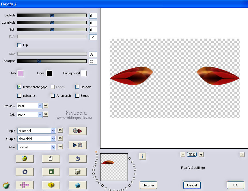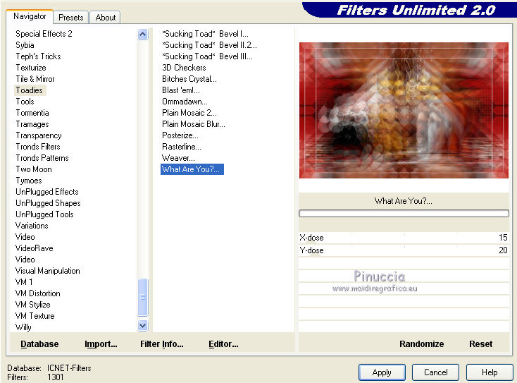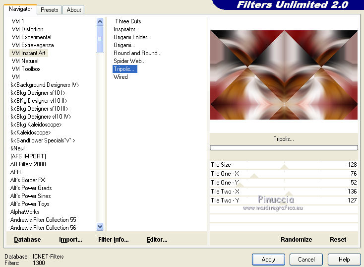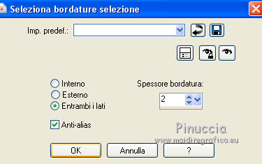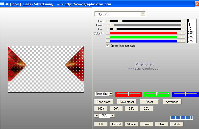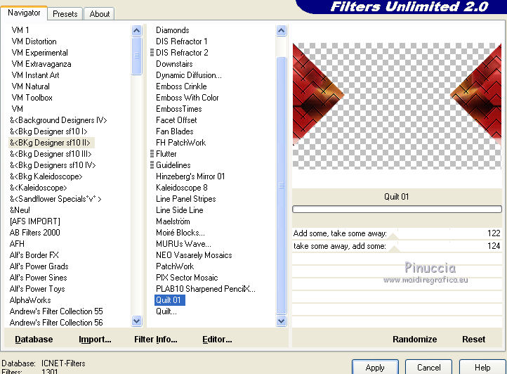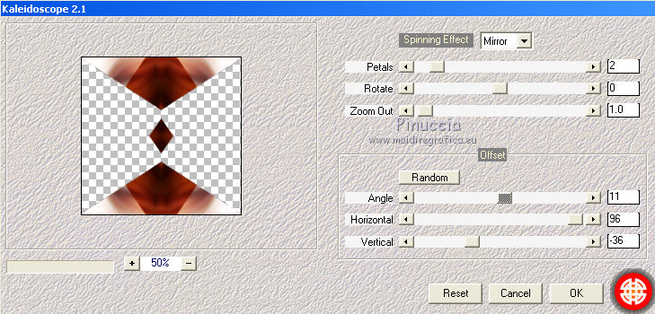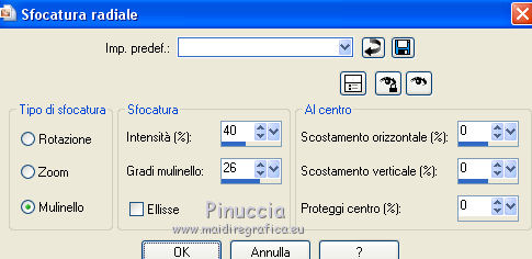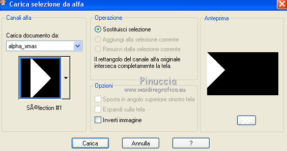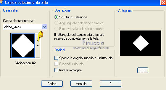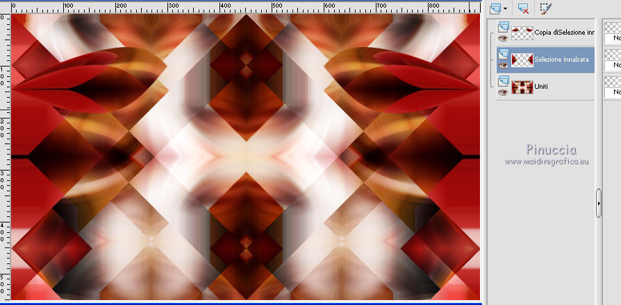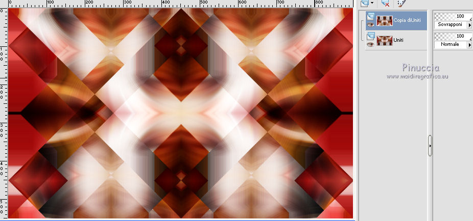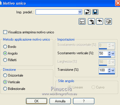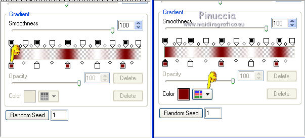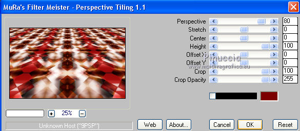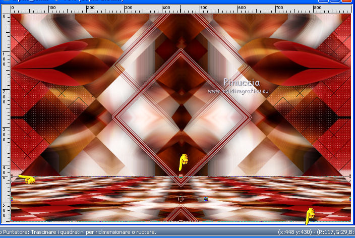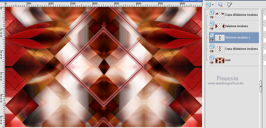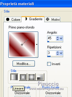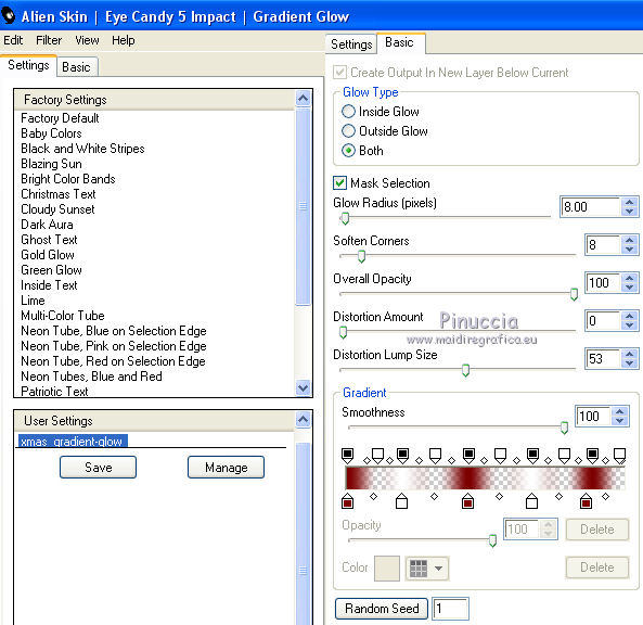 qui puoi trovare qualche risposta ai tuoi dubbi. Se l'argomento che ti interessa non è presente, ti prego di segnalarmelo. Questo tutorial è una creazione di Saturnella e non può essere copiato su altri siti nè essere offerto per il download. Lo stesso vale per la mia traduzione. E' anche proibito togliere il watermark dal materiale; rispettiamo il lavoro dei creatori di tubes, senza i quali non potremmo creare tutorials. Per tradurre questo tutorial, creato con PSP16, ho usato CorelX, ma può essere eseguito anche con le altre versioni di PSP. Dalla versione X4, il comando Immagine>Rifletti è stato sostituito con Immagine>Capovolgi in orizzontale, e il comando Immagine>Capovolgi con Immagine>Capovolgi in verticale. Nelle versioni X5 e X6, le funzioni sono state migliorate rendendo disponibile il menu Oggetti. Nel nuovo X7 sono tornati i comandi Immagine>Rifletti e Immagine>Capovolgi, ma con nuove funzioni. Vedi la scheda sull'argomento qui ![]() Le vostre versioni/Vos versions qui Occorrente: Materiale qui Per i tubes grazie Maryse, Thafs e Karine. (in questa pagina trovi i links ai loro siti). Filtri in caso di dubbi, ricorda di consultare la mia sezione filtri qui Filters Unlimited 2.0 qui VM Instant Art - Tripolis qui Flaming Pear - Flexify 2 qui Ap 01 [Lines] Lines SilverLining qui Mura's Meister - Perspective Tiling qui &<Bkg Designer sf10II> - Quilt 01 (da importare in Unlimited) qui Mehdi - Kaleidoscope 2.1 qui Alien Skin Eye Candy 5 Impact - Gradient Glow qui Simple - 4 way Average qui Toadies - What are you qui I filtri VM Instant Art, Simple e Toadies si possono usare da soli o importati in Filters Unlimited (come fare vedi qui) Se un filtro fornito appare con questa icona ![]() non esitare a cambiare modalità di miscelatura e opacità secondo i colori utilizzati. Nelle ultime versioni di PSP non c'è il gradiente di primo piano/sfondo (Corel_06_029) Puoi usare i gradienti delle versioni precedenti. Trovi qui i gradienti Corel X. Metti il preset Cliccando sul file una o due volte (a seconda delle tue impostazioni), automaticamente il preset si installerà nella cartella corretta. perchè uno o due clic vedi qui 1. Imposta il colore di primo piano con il colore bianco #ffffff, e il colore di sfondo con #7c0000. ![]() Passa il colore di primo piano a Gradiente di primo piano/sfondo, stile Lineare. ![]() 2. Apri alpha_xmas. Finestra>Duplica o sulla tastiera maiuscola+D per fare una copia. ![]() Chiudi l'originale. La copia, che sarà la base del tuo lavoro, non è vuota, ma contiene le selezioni salvate sul canale alfa. Riempi l'immagine trasparente con il gradiente.3. Livelli>Nuovo livello raster. Selezione>Seleziona tutto. Apri il tube del bambino di Maryse e vai a Modifica>Copia. Torna al tuo lavoro e vai a Modifica>Incolla nella selezione. Selezione>Deseleziona. 4. Effetti>Effetti di immagine>Motivo unico, con i settaggi standard. ![]() Livelli>Unisci>Unisci visibile. 5. Regola>Sfocatura>Sfocatura radiale. ![]() Effetti>Effetti di bordo>Aumenta. 6. Effetti>Plugins>Filters Unlimited 2.0 - VM Instant Art - Tripolis, con i settaggi standard. ![]() Ripeti l'Effetto una seconda volta. 7. Livelli>Duplica. Immagine>Capovolgi. Cambia la modalità di miscelatura di questo livello in Sovrapponi, o secondo i tuoi colori. ![]() Livelli>Unisci>Unisci giù. 8. Selezione>Carica/Salva selezione>Carica selezione da canale alfa. la selezione sélection1 è subito disponibile. Devi soltanto cliccare Carica. ![]() Selezione>Innalza selezione a livello. Selezione>Deseleziona. 9. Livelli>Duplica. Immagine>Rifletti. Livelli>Unisci>Unisci giù. 10. Livelli>Duplica. Effetti>Plugins>Flaming Pear - Flexify 2. ![]() 11. Effetti>Effetti di immagine>Scostamento. ![]() 12. Attiva il livello sottostante - Selezione innalzata. ![]() Effetti>Plugins>AP 01 [Lines] - Lines SilverLining. ![]() 13. Effetti>Plugins>Filters Unlimited 2.0 - &<Bkg Designer sf10II> - Quilt 01, con i settaggi standard. ![]() 14. Effetti>Effetti 3D>Sfalsa ombra. ![]() Attiva il livello superiore. Modifica>Ripeti Sfalsa ombra. 15. Attiva il livello di sfondo. Selezione>Carica/Salva selezione>Carica selezione da canale alfa. Apri il menu delle selezioni e carica sélection2. ![]() Selezione>Innalza selezione a livello. 16. Effetti>Plugins>Mehdi - Kaleidoscope 2.1. ![]() 17. Selezione>Modifica>Seleziona bordature selezione. ![]() Riempi la selezione con il colore di sfondo.Mantieni selezionato. 18. Effetti>Plugins>Alien Skin Eye Candy 5 Impact - Gradient Glow. Seleziona il preset xmas_gradient-glow e ok. Questi i settaggi, in caso di problemi con il preset. ![]() Per cambiare il colore clicca sull'icona del "calamaio" per attivare il menu dei colori, e imposta il tuo colore di sfondo. ![]() Selezione>Deseleziona. 19. Livelli>Duplica. Effetti>Effetti di immagine>Motivo unico. ![]() Livelli>Disponi>Sposta giù. Attiva il livello soprastante dell'originale. ![]() Effetti>Effetti 3D>Sfalsa ombra, con i settaggi precedenti ancora in memoria. ![]() 20. Attiva il livello di sfondo. Livelli>Duplica. Effetti>Plugins>Mura's Meister - Perspective Tiling, con i settaggi standard. ![]() 21. Premi il tasto K per attivare lo strumento Puntatore ![]() se stai usando PSP 9 il tasto D per attivare lo strumento Deformazione ![]() in modalità Scala ,spingi il nodo superiore centrale verso il basso fino a 430 pixels, (se non visualizzi i Righelli, vai a Visualizza>Righelli) ![]() Tasto M per deselezionare lo strumento. 22. Attiva il livello superiore. Apri il tube delle palline di Thafs e vai a Modifica>Copia. Torna al tuo lavoro e vai a Modifica>Incolla come nuovo livello. Immagine>Ridimensiona, al 50%, tutti i livelli non selezionato. Regola>Messa a fuoco>Metti a fuoco. Spostalo in alto, contro il bordo.Effetti>Effetti 3D>Sfalsa ombra, con i settaggi precedenti. 23. Attiva nuovamente il tube del bambino di Maryse e vai a Modifica>Copia. Torna al tuo lavoro e vai a Modifica>Incolla come nuovo livello. Immagine>Ridimensiona, all'85%, tutti i livelli non