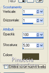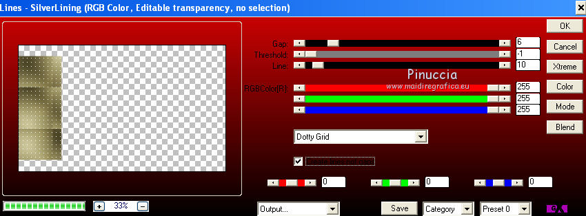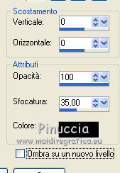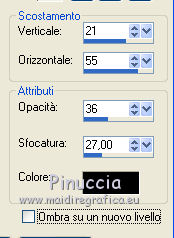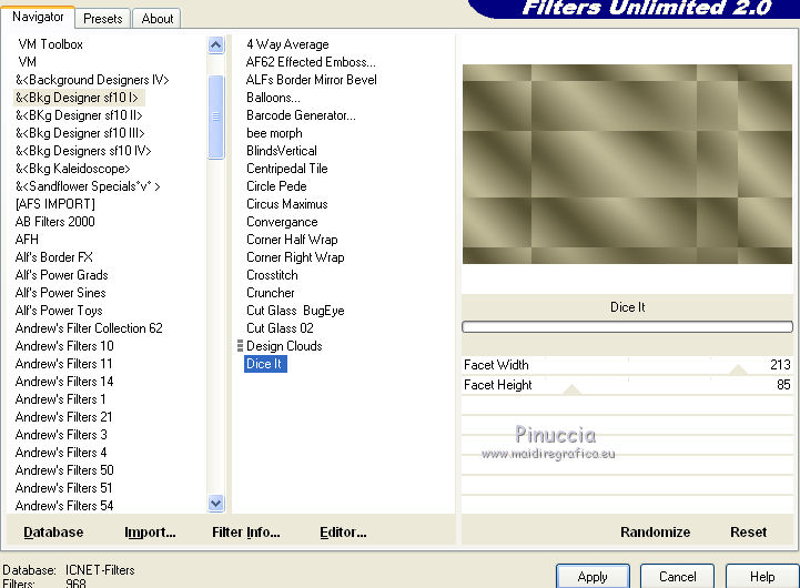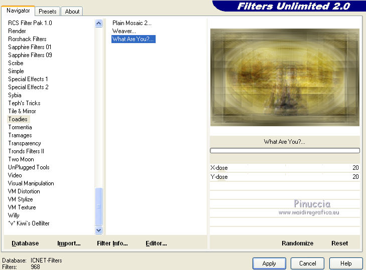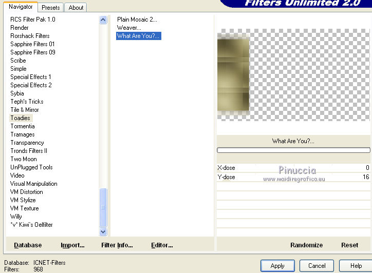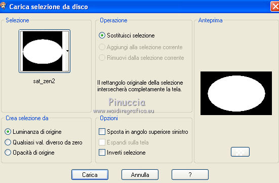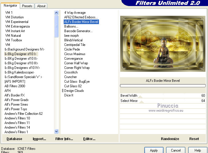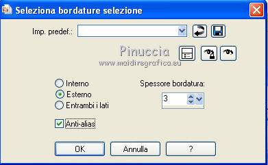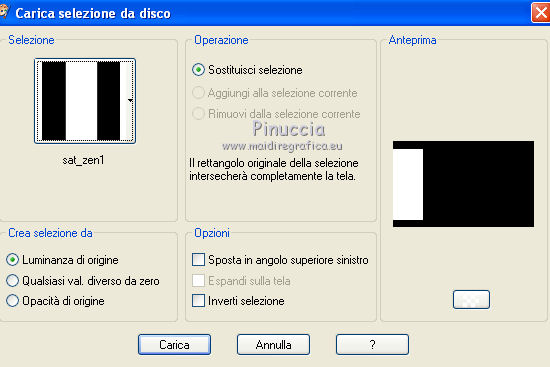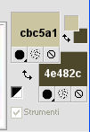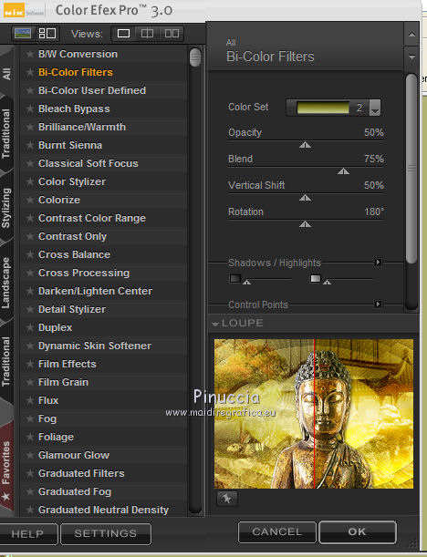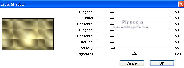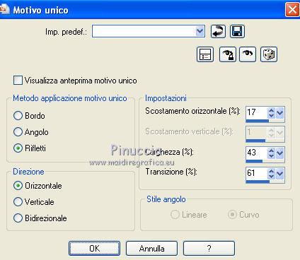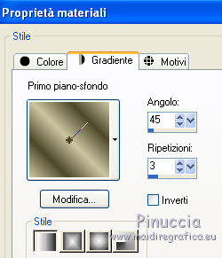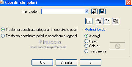 qui puoi trovare qualche risposta ai tuoi dubbi. Se l'argomento che ti interessa non è presente, ti prego di segnalarmelo. Questo tutorial è una creazione di Saturnella e non può essere copiato su altri siti nè essere offerto per il download. Lo stesso vale per la mia traduzione. E' anche proibito togliere il watermark dal materiale; rispettiamo il lavoro dei creatori di tubes, senza i quali non potremmo creare tutorials. Il tutorial è stato creato con PSP12, ma può essere eseguito anche con le altre versioni. Per tradurlo, ho usato PSP X. Occorrente: Materiale qui Il tube del paesaggio è di Leny. Il tube del personaggio è di JHanna. Il tube déco è di Kikirou. (in questa pagina trovi i links ai loro siti). Filtri in caso di dubbi, ricorda di consultare la mia sezione filtri qui Filters Unlimited 2.0 qui &<Bkg Designer sf10I> (da importare in Unlimited) qui Toadies - What are you qui Graphics Plus - Cross Shadow qui Nik Software - Color Efex Pro qui AP 01 Innovations - Lines Silverlining qui I filtri Toadies si possono usare da soli e anche importati in Filters Unlimited ![]() non esitare a cambiare modalità di miscelatura e opacità secondo i colori utilizzati. Metti le selezioni nella cartella Selezioni. 1. Imposta il colore di primo piano con #eeb55f, e il colore di sfondo con #512912. ![]() Passa il colore di primo piano a Gradiente, stile Lineare. ![]() 2. Apri una nuova immagine trasparente 900 x 550 pixels, e riempila con il gradiente.3. Regola>Sfocatura>Sfocatura gaussiana - raggio 30. ![]() 4. Effetti>Plugins>Filters Unlimited 2.0 - &<Bkg Designer sf10I> - Dice it. ![]() 5. Effetti>Effetti di immagine>Motivo unico. ![]() 6. Effetti>Effetti di bordo>Aumenta. 7. Livelli>Duplica. Immagine>Rifletti. Cambia la modalità di miscelatura di questo livello in Sovrapponi, e abbassa l'opacità al 50%. 8. Livelli>Unisci>Unisci visibile. 9. Selezione>Carica/Salva selezione>Carica selezione da disco. Cerca e carica la selezione sat_zen1. ![]() 10. Selezione>Innalza selezione a livello. Selezione>Deseleziona. 11. Effetti>Plugins>AP 01 Innovations - Lines SilverLining. ![]() 12. Effetti>Effetti 3D>Sfalsa ombra. ![]() 13. Effetti>Plugins>Filters Unlimited 2.0 - Toadies - What are you. ![]() 14. Livelli>Duplica. Immagine>Ridimensiona, all'80%, tutti i livelli non selezionato. 15. Livelli>Unisci>Unisci giù. 16. Livelli>Duplica. Immagine>Rifletti. 17. Livelli>Unisci>Unisci giù. Cambia la modalità di miscelatura di questo livello in Luce netta, e abbassa l'opacità all'80%. 18. Effetti>Effetti di distorsione>Coordinate polari. ![]() 19. Livelli>Duplica. Immagine>Capovolgi. 20. Livelli>Unisci>Unisci giù. 21. Selezione>Carica/Salva selezione>Carica selezione da disco. Cerca e carica la selezione sat_zen2. ![]() 22. Livelli>Nuovo livello raster. 23. Apri il tube del paesaggio "Leny-misted_114" e vai a Modifica>Copia. Torna al tuo lavoro e vai a Modifica>Incolla nella selezione. 24. Selezione>Modifica>Seleziona bordature selezione. ![]() 25. Livelli>Nuovo livello raster. Riempi la selezione con il colore scuro.Selezione>Deseleziona. Cambia la modalità di miscelatura del livello del tube in Sovrapponi, e abbassa l'opacità al 95%. Assicurati di essere posizionato sul livello superiore del bordo. ![]() 26. Livelli>Unisci>Unisci giù. 27. Effetti>Effetti 3D>Sfalsa ombra, con il colore di sfondo. ![]() Modifica>Ripeti Sfalsa ombra. 28. Attiva il livello inferiore di sfondo. 29. Effetti>Plugins>Graphics Plus - Cross Shadow. ![]() 30. Livelli>Unisci>Unisci visibile. 31. Apri il tube di "Kikirou1491_bouddha" e vai a Modifica>Copia. Torna al tuo lavoro e vai a Modifica>Incolla come nuovo livello. 32. Immagine>Ridimensiona, al 70%, tutti i livelli non selezionato. Regola>Messa a fuoco>Metti a fuoco. Posiziona correttamente il tube,vedi il mio esempio. 33. Effetti>Effetti 3D>Sfalsa ombra. ![]() 34. Immagine>Aggiungi bordatura, 2 pixels, simmetriche, con il colore scuro. Immagine>Aggiungi bordatura, 25 pixels, simmetriche, con il colore chiaro. 35. Seleziona il bordo da 25 pixels con la bacchetta magica ![]() 36. Riempi con il gradiente iniziale.![]() 37. Effetti>Plugins>Filters Unlimited 2.0 - &<Bkg Designer sf10I> - Alf's Border mirror Bevel. ![]() 38. Effetti>Effetti di bordo>Aumenta. 39. Selezione>Inverti. Effetti>Effetti 3D>Sfalsa ombra. ![]() Selezione>Deseleziona. 40. Immagine>Aggiungi bordatura, 2 pixels, simmetriche, con il colore scuro. Immagine>Aggiungi bordatura, 35 pixels, simmetriche, con il colore chiaro. 41. Seleziona il bordo da 35 pixels con la bacchetta magica ![]() e riempilo con il gradiente.42. Effetti>Plugins>Filters Unlimited 2.0 - Toadies - What are you, con i settaggi standard. ![]() 43. Effetti>Effetti di bordo>Aumenta di più. 44. Selezione>Inverti. Effetti>Effetti 3D>Sfalsa ombra, con i settaggi precedenti. Selezione>Deseleziona. 45. Livelli>Duplica. Immagine>Ridimensiona, al 90%, tutti i livelli non selezionato. 46. Effetti>Effetti 3D>Sfalsa ombra, con i settaggi precedenti. 47. Immagine>Aggiungi bordatura, 2 pixels, simmetriche, con il colore scuro. 48. Effetti>Plugins>Nik Software - Color Efex Pro - Bi-Color Filter. Color set: Brown 2. ![]() 49. Apri il tube JHanna_509©Sichuan Zigong e vai a Modifica>Copia. Torna al tuo lavoro e vai a Modifica>Incolla come nuovo livello. Immagine>Ridimensiona, al 90%, tutti i livelli non selezionato. Spostalo a destra o dove preferisci.Effetti>Plugins>Nik Software - Color Efex Pro, con i settaggi precedenti. 50. Effetti>Effetti 3D>Sfalsa ombra, con il colore nero. ![]() Regola>Messa a fuoco>Metti a fuoco. 51. Apri il tube "texte" e vai a Modifica>Copia. Torna al tuo lavoro e vai a Modifica>Incolla come nuovo livello. Spostalo dove preferisci o vedi il mio esempio.52. Firma il tuo lavoro. Livelli>Unisci>Unisci tutto. Immagine>Ridimensiona, a 900 pixels di larghezza. Salva in formato jpg. ![]() Se hai problemi o dubbi, o trovi un link non funzionante, o anche soltanto per dirmi che ti è piaciuto, scrivimi. 5 Maggio 2012 |