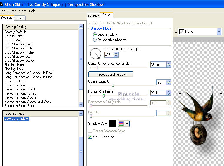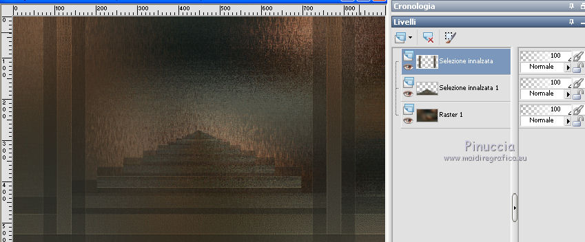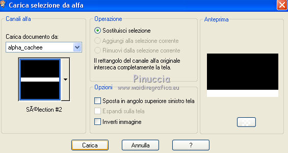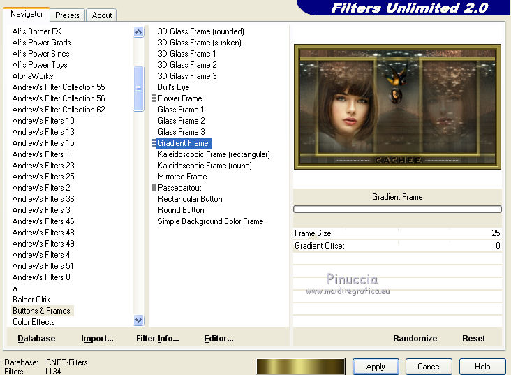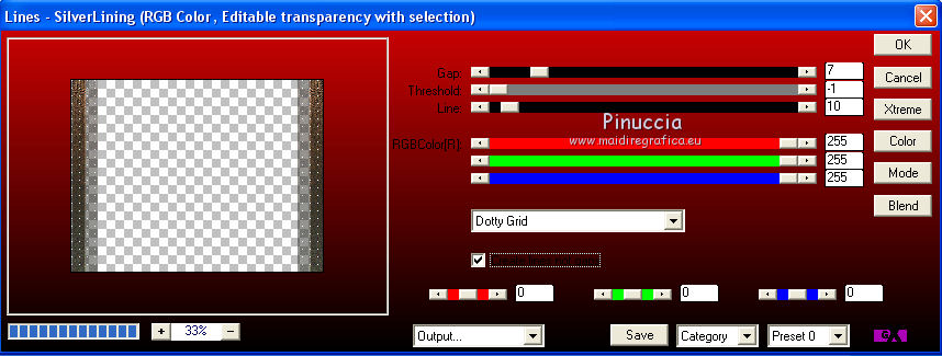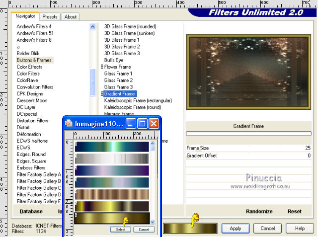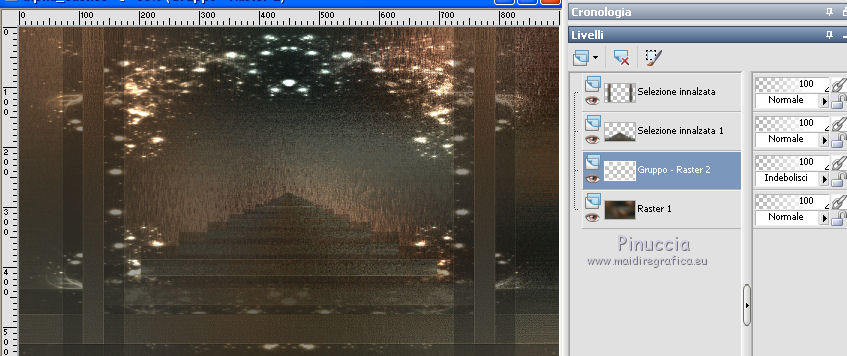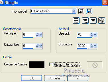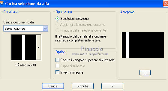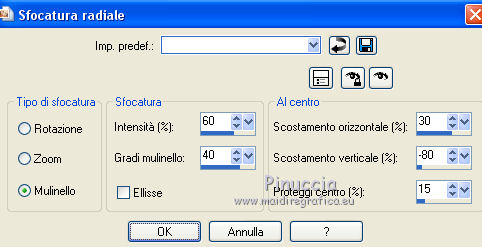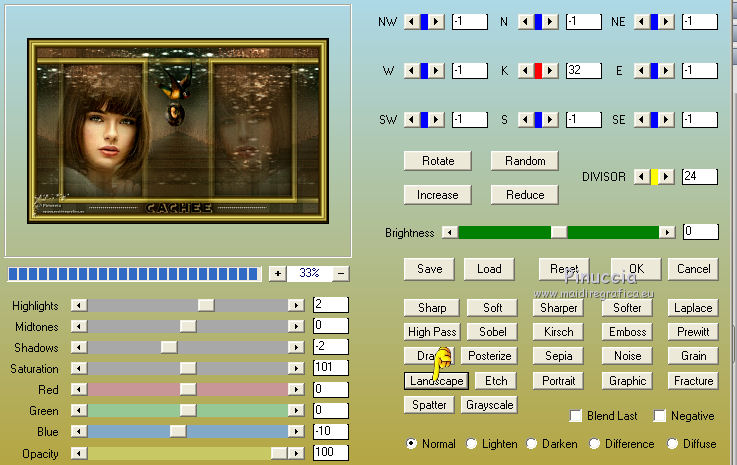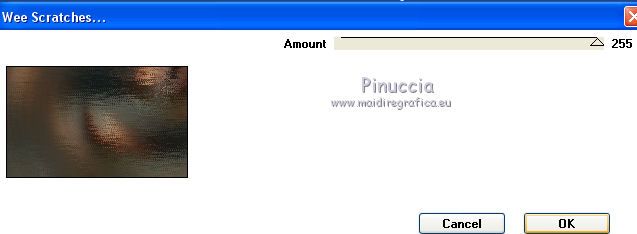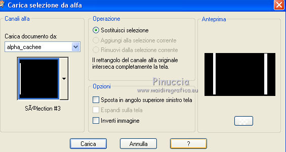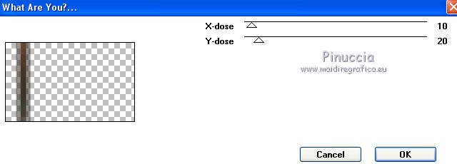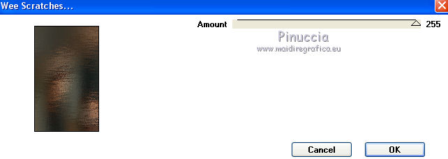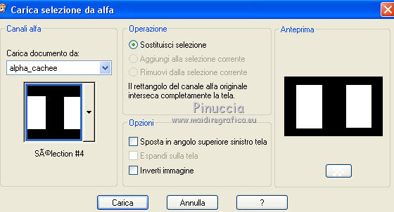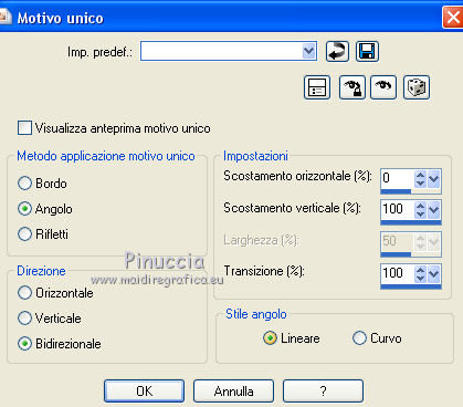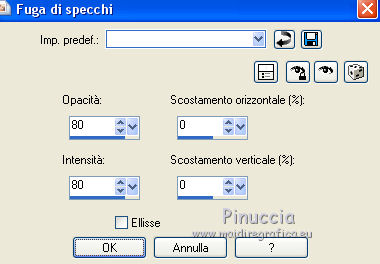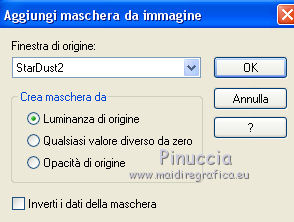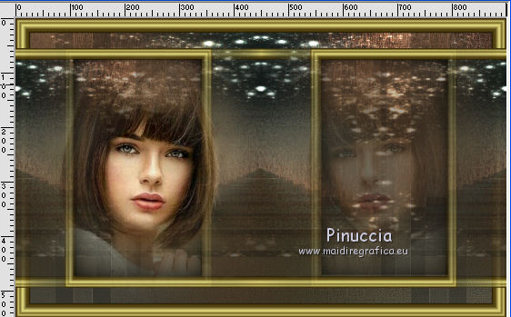 Occorrente: Materiale qui Per la maschera, grazie all'autore che non conosco. Il resto del materiale è di Saturnella. (in questa pagina trovi i links ai siti dei creatori di tubes) Filtri in caso di dubbi, ricorda di consultare la mia sezione filtri qui Filters Unlimited 2.0 qui Tramages - Wee Scratches qui Toadies - What are you qui AP 01 Innovations - Lines SilverLining qui AAA Filters - Custom qui Alien Skin Eye Candy 5 Impact - Perspective Shadow qui I filtri Tramages e Toadies si possono usare da soli o importati in Filters Unlimited (come fare vedi qui) Se un filtro fornito appare con questa icona ![]() non esitare a cambiare modalità di miscelatura e opacità secondo i colori utilizzati. Metti il preset Cliccando sul file una o due volte (a seconda delle tue impostazioni), automaticamente il preset si installerà nella cartella corretta. perchè uno o due clic vedi qui Se preferisci, puoi importare direttamente il preset nel corso del tutorial Come fare vedi la scheda del filtro Eye Candy qui Apri la maschera in PSP e minimizzala con il resto del materiale. Attenzione: non dimenticare di togliere la firma prima di copiare i tubes. 1. Imposta il colore di primo piano con il colore chiaro #565749, e il colore di sfondo con il colore chiaro #121513. ![]() Apri alpha_cachee. Finestra>Duplica, o sulla tastiera tasto della maiuscola+D per fare una copia. ![]() Chiudi l'originale. La copia, che sarà la base del tuo lavoro, non è vuota, ma contiene le selezioni salvate sul canale alfa. Rinomina il livello "Raster 1". Selezione>Seleziona tutto. Apri l'immagine di sfondo image-cachee e vai a Modifica>Copia. Torna al tuo lavoro e vai a Modifica>Incolla nella selezione. Selezione>Deseleziona. 2. Effetti>Effetti di immagine>Motivo unico, con i settaggi standard. ![]() 3. Regola>Sfocatura>Sfocatura radiale. ![]() Effetti>Effetti di bordo>Aumenta di più. 4. Effetti>Plugins>Tramages - Wee Scratches, con i settaggi standard. ![]() 5. Immagine>Ruota a destra Ripeti l'Effetto Wee Scratches con gli stessi settaggi. ![]() 6. Immagine>Ruota a sinistra. 7. Selezione>Carica/Salva selezione>Carica selezione da canale alfa. La selezione sélection#1 è subito disponibile. Devi soltanto cliccare Carica. ![]() Selezione>Innalza selezione a livello. Selezione>Deseleziona. 8. Effetti>Plugins>Toadies - What are you. ![]() Effetti>Effetti di bordo>Aumenta. 9. Livelli>Duplica. Immagine>Rifletti. Livelli>Unisci>Unisci giù. 10. Attiva il livello di sfondo. Selezione>Carica/Salva selezione>Carica selezione da canale alfa. Apri il menu delle selezioni e carica sélection#2. ![]() Selezione>Innalza selezione a livello. Selezione>Deseleziona. 11. Effetti>Plugins>Toadies - What are you, con i settaggi precedenti. ![]() Effetti>Effetti di bordo>Aumenta. 12. Effetti>Effetti di riflesso>Fuga di specchi. ![]() 13. Attiva il livello superiore, Selezione innalzata. ![]() Selezione>Carica/Salva selezione>Carica selezione da canale alfa. Apri il menu delle selezioni e carica sélection#3. ![]() Effetti>Plugins>AP 01 Innovations - Lines SilverLining. ![]() Selezione>Deseleziona. 14. Imposta il colore di primo piano con il colore bianco #ffffff. Attiva il livello di sfondo. Livelli>Nuovo livello raster. Riempi il livello con il colore bianco.Livelli>Nuovo livello maschera>Da immagine. Apri il menu sotto la finestra di origine e vedrai la lista dei files aperti. Seleziona la maschera StarDust2. ![]() Regola>Messa a fuoco>Metti a fuoco. Livelli>Unisci>Unisci giù. 15. Livelli>Duplica. Immagine>Rifletti. Livelli>Unisci>Unisci giù. 16. Attiva lo strumento Puntatore ![]() in modalità Scala ![]() spingi il nodo superiore centrale fino a 270 pixels. ![]() 17. Livelli>Duplica. Immagine>Capovolgi. Livelli>Unisci>Unisci giù. Cambia la modalità di miscelatura di questo livello in Indebolisci, o altro. ![]() Livelli>Unisci>Unisci visibile. 18. Effetti>Plugins>Filters Unlimited 2.0 - Buttons & Frames - Gradient frames apri il menu dei gradienti e scegli il gradiente in armonia con i tuoi colori, quindi clicca su Select e imposta i settaggi. ![]() 19. Livelli>Duplica. Immagine>Ridimensiona, all'80%, tutti i livelli non selezionato. 20. Effetti>Effetti di immagine>Motivo unico. ![]() 21. Selezione>Carica/Salva selezione>Carica selezione da canale alfa. Apri il menu delle selezioni e carica sélection#4. ![]() Livelli>Nuovo livello raster. Effetti>Effetti 3D>Ritaglio. ![]() Selezione>Deseleziona. 22. Livelli>Unisci>Unisci giù. 23. Apri il tube del viso sat_femme_08 e vai a Modifica>Copia. Torna al tuo lavoro e vai a Modifica>Incolla come nuovo livello. Spostalo a sinistra.24. Livelli>Duplica. Immagine>Rifletti. Abbassa l'opacità di questo livello al 25%. ![]() 25. Apri il tube insolite_16 e vai a Modifica>Copia. Torna al tuo lavoro e vai a Modifica>Incolla come nuovo livello. Immagine>Ridimensiona, al 30%, tutti i livelli non selezionato. 26. Effetti>Plugins>Alien Skin Eye Candy 5 Impact - Perspective Shadow. seleziona il preset cachee_shadow e ok. ![]() Sposta il tube tra i due visi.27. Apri il tube titre e vai a Modifica>Copia. Torna al tuo lavoro e vai a Modifica>Incolla come nuovo livello. Strumento Puntatore ![]() e imposta Posizione X: 352,00 e Posizione Y: 493,00. ![]() Cambia la modalità di miscelatura di questo livello in Sovrapponi. 28. Effetti>Effetti 3D>Sfalsa ombra. ![]() 29. Apri il tube deco e vai a Modifica>Copia. Torna al tuo lavoro e vai a Modifica>Incolla come nuovo livello. Strumento Puntatore ![]() e imposta Posizione X: 183,00 e Posizione Y: 506,00. ![]() 30. Effetti>Effetti 3D>Sfalsa ombra. ![]() 31. Livelli>Unisci>Unisci tutto. 32. Effetti>Plugins>Filters Unlimited 2.0 - Gradient Frame, con i settaggi precedenti. ![]() 33. Firma il tuo lavoro su un nuovo livello. Immagine>Aggiungi bordatura, 1 pixel, simmetriche, colore scuro. 34. Effetti>Plugins>AAA Filters - Custom, clicca su Landscape e ok. ![]() Salva in formato jpg. Il tube di questo esempio sono di Thafs ![]() Le vostre versioni ![]() Olimpia ![]() Gian