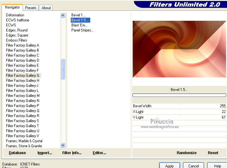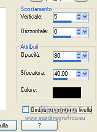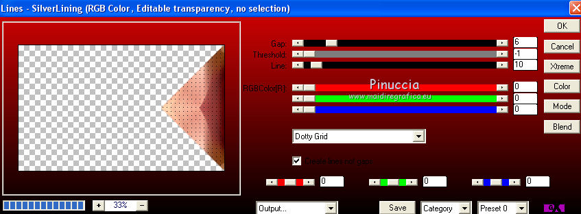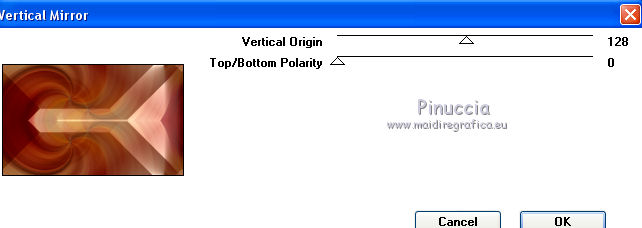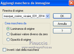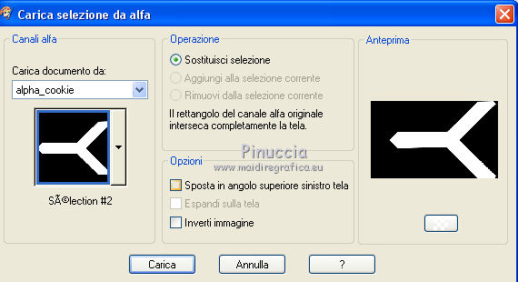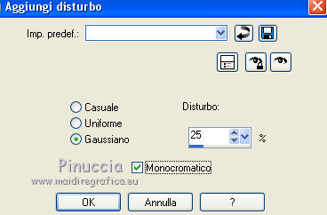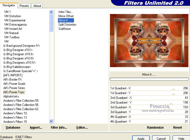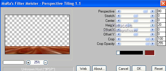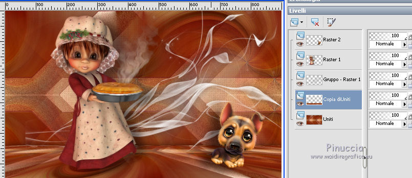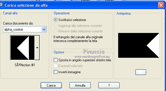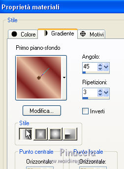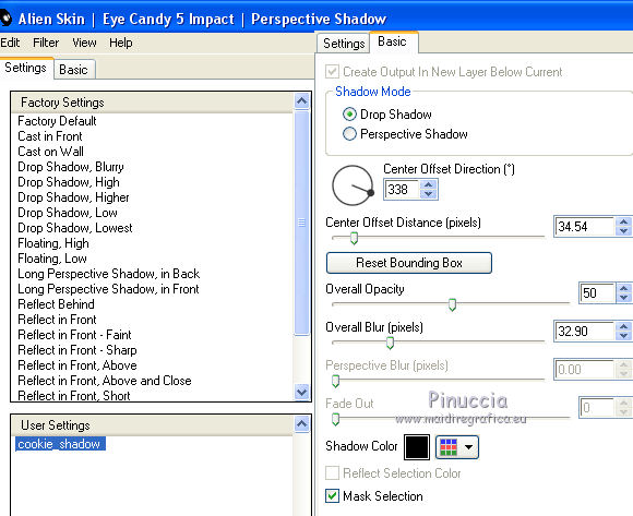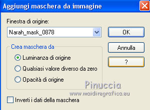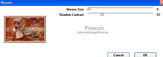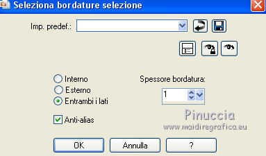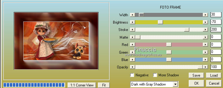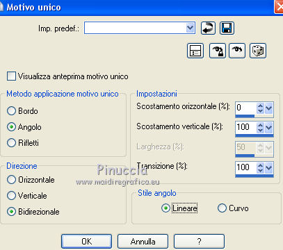 Occorrente: Materiale qui Per le maschere grazie Narah e Corinne Vicaire. Il resto del materiale è di Saturnella. (in questa pagina trovi i links ai siti dei creatori di tubes) Filtri in caso di dubbi, ricorda di consultare la mia sezione filtri qui Filters Unlimited 2.0 qui Filter Factory Gallery G - Bevel 1.5 qui Graphics Plus - Vertical Mirror, Weaver, Cross Shadow qui AP 01 Innovations - Lines SilverLining qui Mura's Meister - Perspective Tiling qui Alf's Power Toys - Mirror it qui Alien Skin Eye Candy 5 Impact - Perspective Shadow qui AAA Frames - Foto Frame qui I filtri Graphics Plus e Alf's Power Toy si possono usare da soli o importati in Filters Unlimited (come fare vedi qui) Se un filtro fornito appare con questa icona ![]() non esitare a cambiare modalità di miscelatura e opacità secondo i colori utilizzati. Metti il preset Cliccando sul file una o due volte (a seconda delle tue impostazioni), automaticamente il preset si installerà nella cartella corretta. perchè uno o due clic vedi qui Se preferisci, puoi importare direttamente il preset nel corso del tutorial Come fare vedi la scheda del filtro Eye Candy qui Apri le maschere in PSP e minimizzale con il resto del materiale. Attenzione: non dimenticare di togliere la firma prima di copiare i tubes. 1. Imposta il colore di primo piano con il colore chiaro #e6bda0, e il colore di sfondo con il colore scuro #7e1e1d. ![]() Passa il colore di primo piano a Gradiente di primo piano/sfondo, stile Lineare. ![]() Apri alpha_cookie. Finestra>Duplica, o sulla tastiera tasto della maiuscola+D per fare una copia. ![]() Chiudi l'originale. La copia, che sarà la base del tuo lavoro, non è vuota, ma contiene le selezioni salvate sul canale alfa. Rinomina il livello "Raster 1". Riempi l'immagine trasparente con il gradiente.2. Livelli>Nuovo livello raster. Selezione>Seleziona tutto. Apri il tube sat_doll09, cancella la firma, e vai a Modifica>Copia. Minimizza il tube, perchè ti servirà ancora. Torna al tuo lavoro e vai a Modifica>Incolla nella selezione. Selezione>Deseleziona. 3. Effetti>Effetti di immagine>Motivo unico, con i settaggi standard. ![]() 4. Regola>Sfocatura>Sfocatura radiale. ![]() Effetti>Effetti di bordo>Aumenta di più. 5. Livelli>Duplica. Cambia la modalità di miscelatura di questo livello in Luce netta. Livelli>Unisci>Unisci visibile. 6. Effetti>Plugins>Filters Unlimited 2.0 - Filter Factory Gallery G - Bevel 1.5. ![]() 7. Effetti>Effetti di immagine>Motivo unico - Intermittente diagonale. ![]() 8. Effetti>Plugins>Graphics Plus - Vertical Mirror. ![]() 9. Selezione>Carica/Salva selezione>Carica selezione da canale alfa. La selezione sélection#1 è subito disponibile. Devi soltanto cliccare Carica. ![]() Selezione>Innalza selezione a livello. Selezione>Deseleziona Effetti>Plugins>AP 01 Innovations - Lines SilverLining. ![]() 10. Attiva il livello di sfondo. Selezione>Carica/Salva selezione>Carica selezione da canale alpha. Apri il menu delle selezioni e Carica sélection#2. ![]() Selezione>Innalza selezione a livello. 11. Regola>Aggiungi/Rimuovi disturbo>Aggiungi disturbo. ![]() 12. Selezione>Modifica>Seleziona bordature selezione. ![]() Riempi la selezione con il colore di sfondo.Selezione>Deseleziona. Livelli>Unisci>Unisci visibile. 13. Effetti>Effetti di immagine>Motivo unico. ![]() 14. Livelli>Nuovo livello raster. Imposta il colore di primo piano con il colore bianco. Riempi il livello con il colore bianco.Livelli>Nuovo livello maschera>Da immagine. Apri il menu sotto la finestra di origine e vedrai la lista dei files aperti. Seleziona la maschera masque_corinn_vicaire_031. ![]() Regola>Messa a fuoco>Metti a fuoco. Livelli>Unisci>Unisci gruppo. Tasto K per attivare lo strumento Puntatore ![]() e imposta Posizione X: 66,00 e Posizione Y: -54,00. ![]() 15. Effetti>Effetti 3D>Sfalsa ombra ![]() 16. Attiva il livello di sfondo. Livelli>Duplica. Effetti>Plugins>Mura's Meitser - Perspective Tiling. ![]() 17. Effetti>Effetti 3D>Sfalsa ombra. ![]() Attiva il livello superiore. Attiva nuovamente il tube sat_doll09 e vai a Modifica>Copia. Torna al tuo lavoro e vai a Modifica>Incolla come nuovo livello. Immagine>Ridimensiona, una volta al 75% e una volta all'85%, tutti i livelli non selezionato. Regola>Messa a fuoco>Metti a fuoco. 18. Effetti>Plugins>Alien Skin Eye Candy 5 Impact - Perspective Shadow. seleziona il preset cookie_shadow e ok. ![]() 19. Apri il tube sat_chien01 e vai a Modifica>Copia. Torna al tuo lavoro e vai a Modifica>Incolla come nuovo livello. Immagine>Ridimensiona, al 30%, tutti i livelli non selezionato. Regola>Messa a fuoco>Metti a fuoco. 20. Effetti>Plugins>Alien Skin Eye Candy 5 Impact - Perspective Shadow, con i settaggi precedenti. Immagine>Rifletti. 21. Attiva il livello Copia di Uniti. ![]() 22. Livelli>Nuovo livello raster. Riempi il livello con il colore bianco.Livelli>Nuovo livello maschera>Da immagine. Apri il menu sotto la finestra di origine e vedrai la lista dei files aperti. Seleziona la maschera Narah_mask_0878. ![]() Immagine>Rifletti. Regola>Messa a fuoco>Metti a fuoco. Livelli>Unisci>Unisci gruppo. Cambia la modalità di miscelatura di questo livello in Sovrapponi 22. Attiva il livello di sfondo. Modifica>Copia. 23. Per i bordi, imposta nuovamente il colore di primo piano con il chiaro #e6bda0 ![]() Immagine>Aggiungi bordatura, 1 pixel, simmetriche, colore di sfondo. Immagine>Aggiungi bordatura, 3 pixels, simmetriche, colore di primo piano. Immagine>Aggiungi bordatura, 1 pixel, simmetriche, colore di sfondo. Selezione>Seleziona tutto. Immagine>Aggiungi bordatura, 30 pixels, simmetriche, colore di primo piano. Selezione>Inverti. 24. Effetti>Plugins>Graphics Plus - Weaver. ![]() 25. Effetti>Plugins>Graphics Plus - Cross Shadow, con i settaggi standard. ![]() Selezione>Inverti. Effetti>Effetti 3D>Sfalsa ombra. ![]() Selezione>Deseleziona. 26. Immagine>Aggiungi bordatura, 1 pixel, simmetriche, colore di sfondo. Immagine>Aggiungi bordatura, 3 pixels, simmetriche, colore di primo piano.