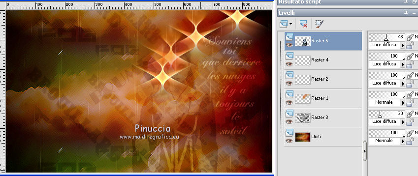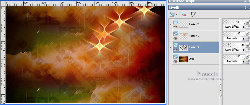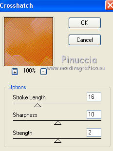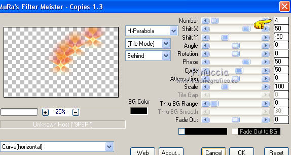 Occorrente: Materiale qui Tutto il materiale è di Saturnella. (in questa pagina trovi i links ai siti dei creatori di tubes) Filtri in caso di dubbi, ricorda di consultare la mia sezione filtri qui Mura's Meister - Copies qui Brush Strokes - o Contours - Cross Hatch qui ![]() non esitare a cambiare modalità di miscelatura e opacità secondo i colori utilizzati. Nelle ultime versioni di PSP non c'è il gradiente di primo piano/sfondo (Corel_06_029) Puoi usare i gradienti delle versioni precedenti. Trovi qui i gradienti Corel X. Attenzione: non dimenticare di togliere la firma prima di copiare i tubes. 1. Imposta il colore di primo piano con il colore #ad191d, e il colore di sfondo con il colore #000000 ![]() Passa il colore di primo piano a Gradiente di primo piano/sfondo, stile Sprazzo di luce. ![]() Apri una nuova immagine trasparente 900 x 550 pixels, e riempila con il gradiente.2. Regola>Sfocatura>Sfocatura gaussiana - raggio 30. ![]() 3. Livelli>Nuovo livello raster. Selezione>Seleziona tutto. Apri il tube sat_ciel02 e vai a Modifica>Copia. Torna al tuo lavoro e vai a Modifica>Incolla nella selezione. Immagine>Ridimensiona, al 120%, tutti i livelli non selezionato. Selezione>Deseleziona. 5. Effetti>Effetti di immagine>Motivo unico. ![]() Cambia la modalità di miscelatura di questo livello in Luce netta, e abbassa l'opacità al 60% Livelli>Unisci>Unisci visibile. 6. Effetti>Plugins>Brush Strokes - Cross Hatch ![]() 7. Apri il tube deco1 e vai a Modifica>Copia. Torna al tuo lavoro e vai a Modifica>Incolla come nuovo livello. Effetti>Plugins>Mura's Meister - Copies. ![]() Tasto K sulla tastiera per attivare lo strumento Puntatore ![]() e imposta Posizione X: 408,00 e Posizione Y: -74,00. ![]() Tasto M per deselezionare lo strumento. 8. Effetti>Effetti 3D>Sfalsa ombra. ![]() 9. Apri il tube deco2 e vai a Modifica>Copia. Torna al tuo lavoro e vai a Modifica>Incolla come nuovo livello. Effetti>Effetti di immagine>Motivo unico, con i settaggi standard. ![]() Cambia la modalità di miscelatura di questo livello in Luce diffusa. 10. Attiva il livello di sfondo. Apri il tube deco3 e vai a Modifica>Copia. Torna al tuo lavoro e vai a Modifica>Incolla come nuovo livello. Cambia la modalità di miscelatura di questo livello in Luce diffusa, e abbassa l'opacità al 30%. ![]() 11. Attiva il livello superiore. Apri il tube texte e vai a Modifica>Copia. Torna al tuo lavoro e vai a Modifica>Incolla come nuovo livello. Attiva lo strumento Puntatore ![]() e imposta Posizione X: 666,00 e Posizione Y: 86,00. ![]() 12. Effetti>Effetti 3D>Sfalsa ombra, con i settaggi precedenti. ![]() Cambia la modalità di miscelatura di questo livello in Luce diffusa. 13. Apri il tube sat_got01 e vai a Modifica>Copia. Torna al tuo lavoro e vai a Modifica>Incolla come nuovo livello. Immagine>Ridimensiona, al 60%, tutti i livelli non selezionato. Spostalo a sinistra del testo.Cambia la modalità di miscelatura di questo livello in Luce diffusa, e abbassa l'opacità al 48%. ![]() 14. Apri il tube fem_03 e vai a Modifica>Copia. Torna al tuo lavoro e vai a Modifica>Incolla come nuovo livello. Immagine>Ridimensiona, all'85%, tutti i livelli non selezionato. Spostalo a sinistra.15. Apri il tube titre e vai a Modifica>Copia. Torna al tuo lavoro e vai a Modifica>Incolla come nuovo livello. Spostalo in alto a sinistra.16. Effetti>Effetti 3D>Sfalsa ombra. ![]() Cambia la modalità di miscelatura di questo livello in Luce diffusa. ![]() 17. Immagine>Aggiungi bordatura 1 pixel, simmetriche, colore di sfondo. Immagine>Aggiungi bordatura, 30 pixels, simmetriche, colore bianco di primo piano. Immagine>Aggiungi bordatura, 1 pixel, simmetriche, colore di sfondo. Immagine>Aggiungi bordatura, 45 pixels, simmetriche, colore bianco. 18. Selezione>Seleziona tutto. Immagine>Aggiungi bordatura 1 pixel, simmetriche, colore di sfondo. Immagine>Aggiungi bordatura, 60 pixels, simmetriche, colore bianco. 19. Effetti>Effetti 3D>Sfalsa ombra. ![]() 20. Apri il tube deco4 e vai a Modifica>Copia. Torna al tuo lavoro e vai a Modifica>Incolla come nuovo livello. E' al suo posto: Posizione X: 18,00 e Posizione Y: 30,00. ![]() 21. Firma il tuo lavoro su un nuovo livello. Immagine>Aggiungi bordatura, 1 pixel, simmetriche, colore di sfondo. Immagine>Ridimensiona, 900 pixels di larghezza, tutti i livelli selezionato. Regola>Messa a fuoco>Maschera di contrasto. ![]() I tubes di questo esempio sono di A PSP Devil ![]() Le vostre versioni ![]() Olimpia ![]() ![]() Gloria ![]() Puoi scrivermi per qualsiasi problema, o dubbio, se trovi un link che non funziona, o anche soltanto per un saluto. 29 Marzo 2019 |