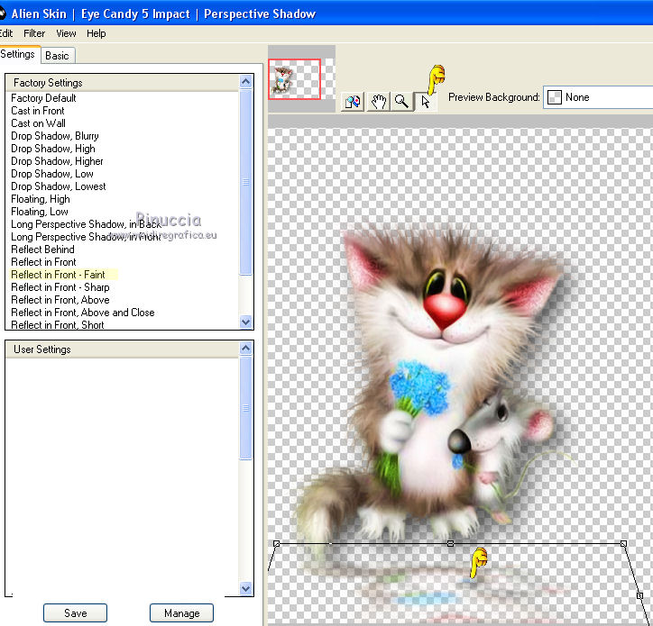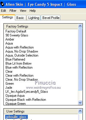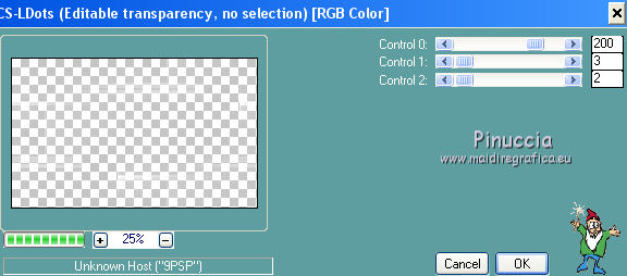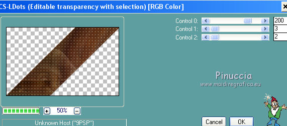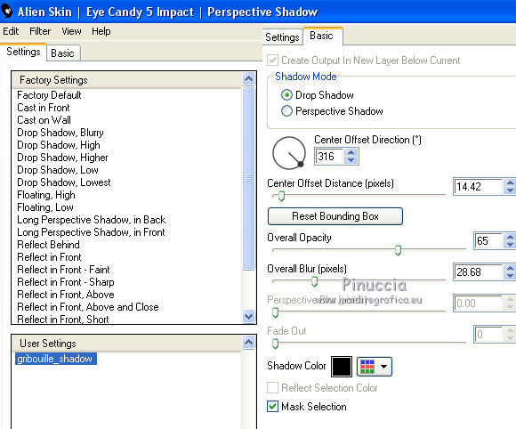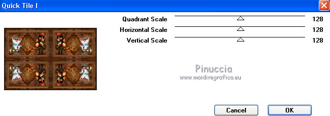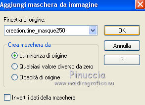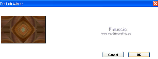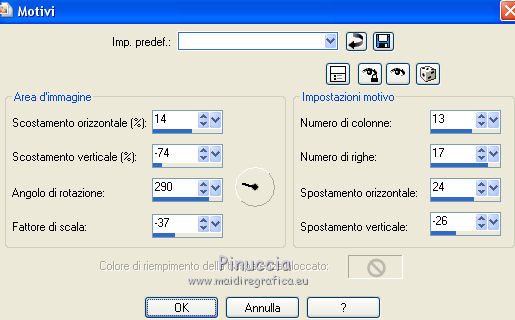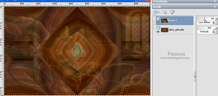 Occorrente: Materiale qui Per le maschere grazie Tine e SMart. Il resto del materiale è di Saturnella. (in questa pagina trovi i links ai siti dei creatori di tubes) Filtri in caso di dubbi, ricorda di consultare la mia sezione filtri qui Filters Unlimited 2.0 qui FM Tile Tools - Saturation Emboss qui Graphics Plus - Quick Tile I qui Carolaine and Sensibility - CS-LDots qui L&K's - L&K's Zitah qui Alien Skin Eye Candy 5 Impact - Perspective Shadow, Glass qui Simple - Blintz - Top Left Mirror qui I filtri Graphics Plus e Simple si possono usare da soli o importati in Filters Unlimited (come fare vedi qui) Se un filtro fornito appare con questa icona ![]() non esitare a cambiare modalità di miscelatura e opacità secondo i colori utilizzati. Metti i presets Cliccando sul file una o due volte (a seconda delle tue impostazioni), automaticamente il preset si installerà nella cartella corretta. perchè uno o due clic vedi qui Se preferisci, puoi importare direttamente il preset nel corso del tutorial Come fare vedi la scheda del filtro Eye Candy qui Apri le maschere in PSP e minimizzale con il resto del materiale. Attenzione: non dimenticare di togliere la firma prima di copiare i tubes. 1. Imposta il colore di primo piano con il colore chiaro #e3984c, e il colore di sfondo con il colore chiaro #391a0d. ![]() Apri alpha_gribouille. Finestra>Duplica, o sulla tastiera tasto della maiuscola+D per fare una copia. ![]() Chiudi l'originale. La copia, che sarà la base del tuo lavoro, non è vuota, ma contiene una selezione salvata sul canale alfa. Rinomina il livello "Raster 1". Selezione>Seleziona tutto. Apri l'immagine di sfondo image-fond e vai a Modifica>Copia. Torna al tuo lavoro e vai a Modifica>Incolla nella selezione. Selezione>Deseleziona. 2. Regola>Sfocatura>Sfocatura radiale. ![]() Effetti>Effetti di bordo>Aumenta di più. 3. Effetti>Plugins>FM Tile Tools - Saturation Emboss, con i settaggi standard. ![]() 4. Effetti>Plugins>Simple - Blintz Modifica>Ripeti Blintz. 5. Effetti>Plugins>Simple - Top Left Mirror ![]() 6. Livelli>Nuovo livello raster. Selezione>Seleziona tutto. Modifica>Incolla nella selezione (l'immagine di sfondo è sempre in memoria). Cambia la modalità di miscelatura di questo livello in Luce diffusa, o altro, e abbassa l'opacità al 44%. ![]() Livelli>Unisci>Unisci giù. Selezione>Deseleziona. 7. Livelli>Nuovo livello raster. Riempi con il colore chiaro di primo piano.Livelli>Nuovo livello maschera>Da immagine. Apri il menu sotto la finestra di origine e vedrai la lista dei files aperti. Seleziona la maschera smArt_maszk_58. ![]() Regola>Messa a fuoco>Metti a fuoco. Livelli>Unisci>Unisci gruppo. 8. Tasto K sulla tastiera per attivare lo strumento Puntatore ![]() e imposta Posizione X: -538,00 e Posizione Y: 80,00 ![]() Tasto M per deselezionare lo strumento. 9. Effetti>Effetti 3D>Sfalsa ombra. ![]() 10. Attiva il livello di sfondo. Selezione>Carica/Salva selezione>Carica selezione da canale alfa. La selezione sélection#1 è subito disponibile. Devi soltanto cliccare Carica. ![]() Selezione>Innalza selezione a livello. Effetti>Plugins>Carolaine and Sensibility - CS-LDots ![]() Selezione>Deseleziona. 11. Effetti>Effetti di immagine>Motivo unico, con i settaggi standard. ![]() Cambia la modalità di miscelatura di questo livello in Indebolisci. 12. Effetti>Effetti 3D>Sfalsa ombra, con i settaggi precedenti. ![]() Livelli>Unisci>Unisci giù. 13. Rimani posizionato sul livello di sfondo. Effetti>Plugins>L&K's - L&K's Zitah ![]() 14. Sempre sul livello di sfondo: Livelli>Nuovo livello raster. Imposta il colore di primo piano con il colore bianco #ffffff. Riempi il livello con il colore bianco.Livelli>Nuovo livello maschera>Da immagine Apri il menu sotto la finestra di origine e seleziona la maschera creation.tine_masque250 ![]() Effetti>Effetti di bordo>Aumenta Livelli>Unisci>Unisci gruppo. 15. Effetti>Plugins>Carolaine and Sensibility - CS-LDots, con i settaggi precedenti. ![]() 16. Effetti>Effetti di immagine>Motivo unico. ![]() Cambia la modalità di miscelatura di questo livello in Sovrapponi. 17. Effetti>Effetti 3D>Sfalsa ombra, con i settaggi standard. ![]() 18. Attiva il livello di sfondo. Apri il tube sat_chat09 e vai a Modifica>Copia. Torna al tuo lavoro e vai a Modifica>Incolla come nuovo livello. Immagine>Ridimensiona, al 75%, tutti i livelli non selezionato. Posiziona il tube nel cilindro![]() 19. Effetti>Plugins>Alien Skin Eye Candy 5 Impact - Perspective Shadow. Seleziona il preset gribouille_shadow e ok Questi i settaggi, in caso di problemi con il preset. ![]() 20. Effetti>Plugins>Alien Skin Eye Candy 5 Impact - Perspective Shadow. Seleziona il preset Reflect in front,faint e ok. se l'ombra è troppo lontana dal tube, puoi adattarla alla posizione del tube ![]() 21. Apri il tube sat_enf11 e vai a Modifica>Copia. Torna al tuo lavoro e vai a Modifica>Incolla come nuovo livello. Immagine>Ridimensiona, al 75%, tutti i livelli non selezionato. Immagine>Rifletti. Posiziona correttamente il tube.22. Effetti>Plugins>Alien Skin Eye Candy 5 Impact - Perspective Shadow. Seleziona il preset gribouille_shadow e ok 23. Apri il tube souris e vai a Modifica>Copia. Torna al tuo lavoro e vai a Modifica>Incolla come nuovo livello. Posiziona correttamente il tube.Effetti>Effetti 3D>Sfalsa ombra, con i settaggi standard. ![]() 24. Apri il tube titre e vai a Modifica>Copia. Torna al tuo lavoro e vai a Modifica>Incolla come nuovo livello. Posiziona correttamente il tube.Effetti>Effetti 3D>Sfalsa ombra. ![]() 25. Attiva il livello di sfondo. Modifica>Copia. Livelli>Unisci>Unisci tutto. 26. Per i bordi, imposta nuovamente il colore di primo piano con il colore iniziale #e3984c. ![]() Immagine>Aggiungi bordatura, 1 pixel, simmetriche, colore di sfondo. Immagine>Aggiungi bordatura, 3 pixels, simmetriche, colore di primo piano. Immagine>Aggiungi bordatura, 1 pixel, simmetriche, colore di sfondo. Selezione>Seleziona tutto. Immagine>Aggiungi bordatura, 30 pixels, simmetriche, colore bian