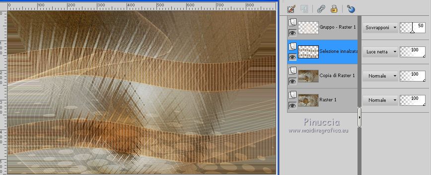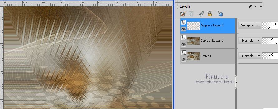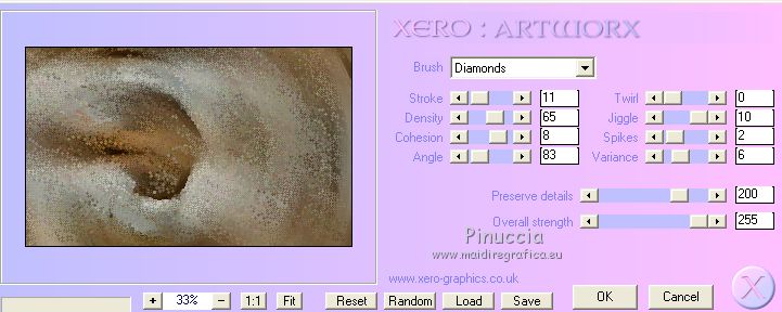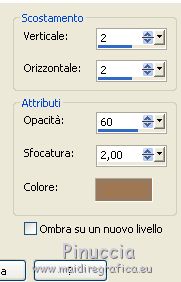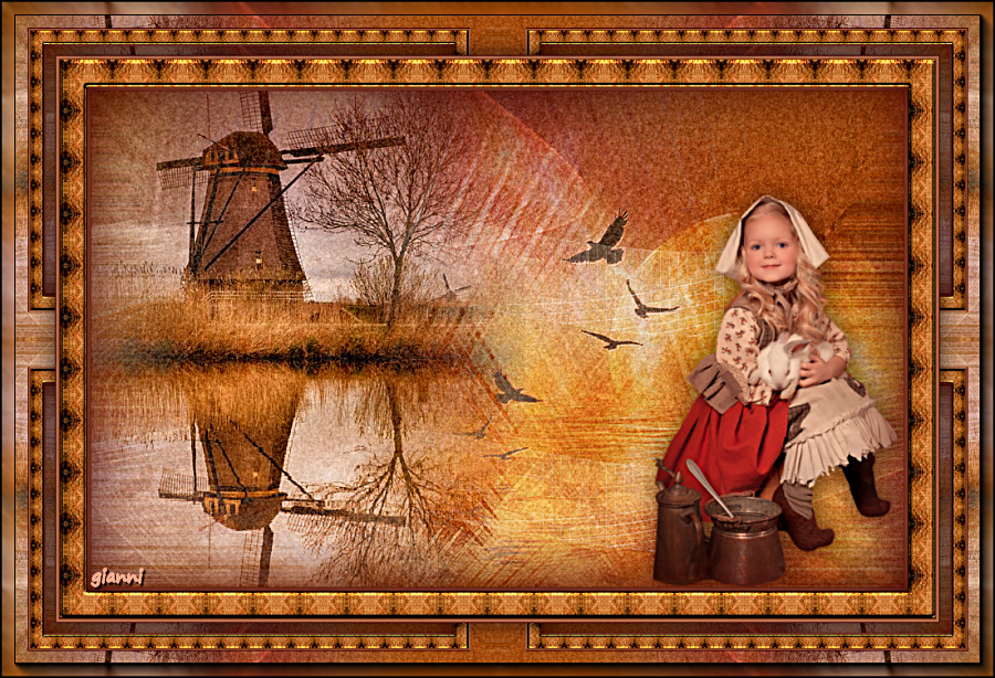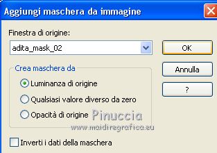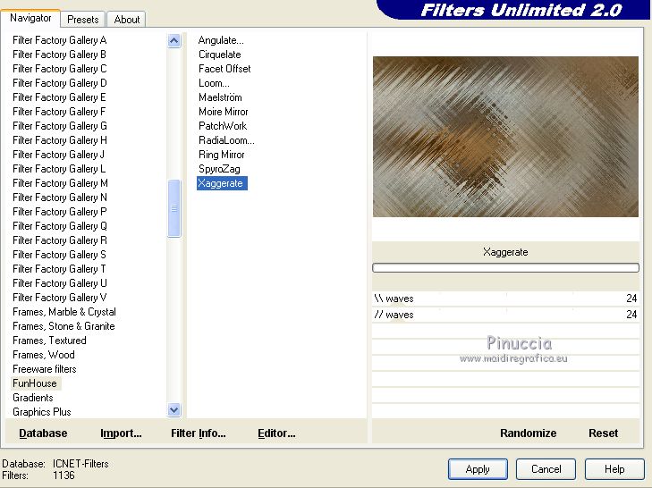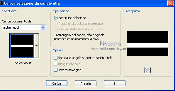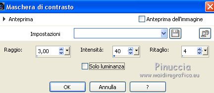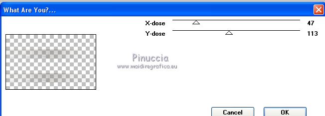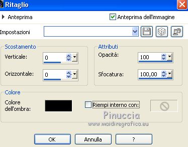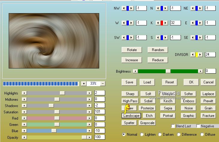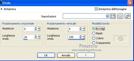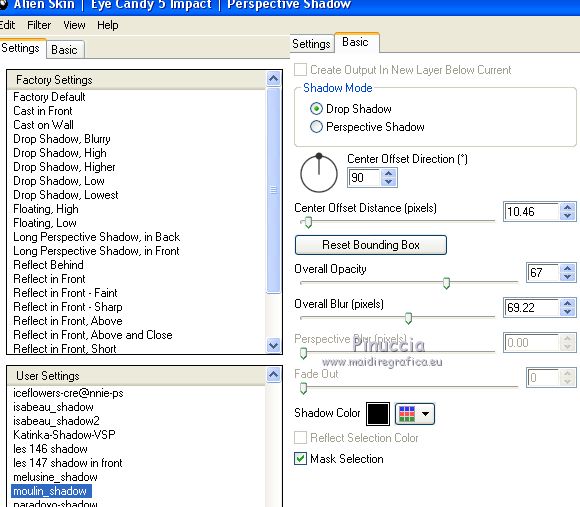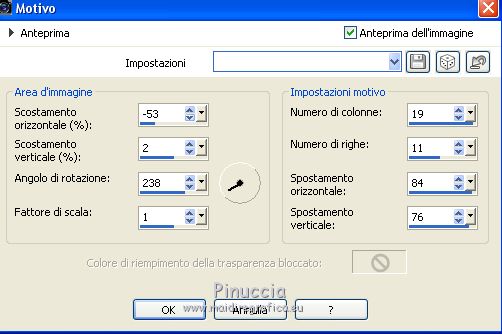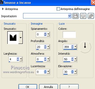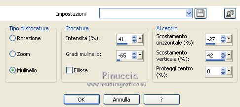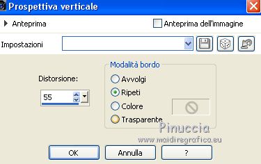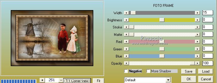 Occorrente: Materiale qui Per la maschera, grazie Adita. Il resto del materiale è di Saturnella. (in questa pagina trovi i links ai siti dei creatori di tubes) Filtri in caso di dubbi, ricorda di consultare la mia sezione filtri qui Filters Unlimited 2.0 qui Xero - Artworks qui Funhouse - Xaggerate qui Toadies - What are you qui AP 01 Innovations - Lines SilverLining qui AAA Filters - Custom / AAA Frames - Foto Frame qui Alien Skin Eye Candy 5 Impact - Perspective Shadow qui FM Tile Tools - Saturation Emboss qui Graphics Plus - Quick Tile I qui I filtri Tramages, Funhouse, Graphics Plus e Toadies si possono usare da soli o importati in Filters Unlimited (come fare vedi qui) Se un filtro fornito appare con questa icona ![]() non esitare a cambiare modalità di miscelatura e opacità secondo i colori utilizzati. Metti il preset Cliccando sul file una o due volte (a seconda delle tue impostazioni), automaticamente il preset si installerà nella cartella corretta. perchè uno o due clic vedi qui Se preferisci, puoi importare direttamente il preset nel corso del tutorial Come fare vedi la scheda del filtro Eye Candy qui Apri la maschera in PSP e minimizzala con il resto del materiale. Attenzione: non dimenticare di togliere la firma prima di copiare i tubes. 1. Imposta il colore di primo piano con il colore chiaro #a27852, e il colore di sfondo con il colore scuro #412913. ![]() Apri alpha_moulin. Finestra>Duplica, o sulla tastiera tasto della maiuscola+D per fare una copia. ![]() Chiudi l'originale. La copia, che sarà la base del tuo lavoro, non è vuota, ma contiene una selezione salvata sul canale alfa. Rinomina il livello "Raster 1". 2. Selezione>Seleziona tutto. Apri l'immagine image-moulin e vai a Modifica>Copia. Torna al tuo lavoro e vai a Modifica>Incolla nella selezione. Selezione>Deseleziona. 3. Effetti>Effetti di immagine>Motivo unico, con i settaggi standard. ![]() 4. Regola>Sfocatura>Sfocatura radiale. ![]() Effetti>Effetti di bordo>Aumenta di più. 5. Effetti>Plugins>AAA Filters - Custom - clicca su Landscape e ok. ![]() 6. Effetti>Plugins>Xero - Artworks. ![]() 7. Effetti>Plugins>Filters Unlimited 2.0 - Funhouse - Xaggerate, con i settaggi standard. ![]() 8. Livelli>Duplica. Effetti>Effetti geometrici>Prospettiva verticale. ![]() 9. Imposta il colore di primo piano con il colore bianco. Livelli>Nuovo livello raster. Riempi il livello con il colore bianco.Livelli>Nuovo livello maschera>Da immagine. Apri il menu sotto la finestra di origine e vedrai la lista dei files aperti. Seleziona la maschera adita_mask_02 ![]() Effetti>Effetti di bordo>Aumenta. Livelli>Unisci>Unisci gruppo. 10. Effetti>Effetti 3D>Sfalsa ombra, colore chiaro. ![]() Cambia la modalità di miscelatura di questo livello in Sovrapponi, e abbassa l'opacità al 50%. ![]() 11. Attiva il livello copia di Raster 1. Selezione>Carica/Salva selezione>Carica selezione da canale alfa. La selezione sélection#1 è subito disponibile. Devi soltanto cliccare Carica. ![]() Selezione>Innalza selezione a livello. Selezione>Deseleziona. 12. Effetti>Plugins>Toadies - What are you. ![]() Effetti>Effetti di bordo>Aumenta. 13. Effetti>Plugins>AP 01 Innovations - Lines SilverLining. ![]() 14. Effetti>Effetti di distorsione>Onda. ![]() 15. Effetti>Effetti 3D>Sfalsa ombra, colore nero. ![]() Cambia la modalità di miscelatura di questo livello in Luce netta, o altro ![]() 16. Attiva il livello copia di Raster 1. Apri il tube camp_15 e vai a Modifica>Copia. Torna al tuo lavoro e vai a Modifica>Incolla come nuovo livello. Spostalo a destra.Cambia la modalità di miscelatura di questo livello in Luce diffusa, e abbassa l'opacità al 50%. 17. Effetti>Plugins>FM Tile Tools - Saturation Emboss, con i settaggi standard. ![]() 18. Attiva il livello superiore. Apri il tube moulin02 e vai a Modifica>Copia. Torna al tuo lavoro e vai a Modifica>Incolla come nuovo livello. Spostalo a sinistra.19. Apri il tube sat_enf23 e vai a Modifica>Copia. Torna al tuo lavoro e vai a Modifica>Incolla come nuovo livello. Immagine>Rifletti. Immagine>Ridimensiona, al 60%, tutti i livelli non selezionato. Regola>Messa a fuoco>Metti a fuoco. Spostalo a destra.20. Effetti>Plugins>Alien Skin Eye Candy 5 Impact - Perspective Shadow. Seleziona il preset moulin_shadow e ok. Questi i settaggi, in caso di problemi con il preset. ![]() 21. Attiva il livello di sfondo. Modifica>Copia. 22. Per i bordi: imposta nuovamente il colore di primo piano con il colore chiaro ![]() Immagine>Aggiungi bordatura, 1 pixel, simmetriche, colore di sfondo. Immagine>Aggiungi bordatura, 3 pixels, simmetriche, colore di primo piano. Immagine>Aggiungi bordatura, 1 pixel, simmetriche, colore di sfondo. 23. Selezione>Seleziona tutto. Immagine>Aggiungi bordatura, 30 pixels, simmetriche, colore bianco. Selezione>Inverti. Effetti>Effetti di riflesso>Motivi. ![]() 24. Effetti>Effetti 3D>Smusso a incasso. ![]() 25. Selezione>Inverti. Effetti>Effetti 3D>Ritaglio, colore scuro. ![]() Selezione>Deseleziona. 26. Immagine>Aggiungi bordatura, 1 pixel, simmetriche, colore di sfondo. Immagine>Aggiungi bordatura, 3 pixels, simmetriche, colore di primo piano. Immagine>Aggiungi bordatura, 1 pixel, simmetriche, colore di sfondo. 27. Selezione>Seleziona tutto. Immagine>Aggiungi bordatura, 60 pixels, simmetriche, colore bianco. 28. Selezione>Inverti. Modifica>Incolla nella selezione (il vostro livello di sfondo in memoria). 29. Effetti>Plugins>Graphics Plus - Quick Tile I. ![]() 30. Effetti>Plugins>AAA Frames - Foto Frame. ![]() 31. Selezione>Inverti. Effetti>Effetti 3D>Sfalsa ombra. ![]() Selezione>Deseleziona. 32. Firma il tuo lavoro su un nuovo livello. Immagine>Aggiungi bordatura, 1 pixel, simmetriche, colore nero. Immagine>Ridimensiona, 900 pixels di larghezza, tutti i livelli selezionato. Regola>Messa a fuoco>Maschera di contrasto. ![]() Salva in formato jpg. Il tube di questo esempio è di Tigre Blanc ![]() Le vostre versioni ![]() Tosca dei gatti ![]() Gianni ![]() Puoi scrivermi per qualsiasi problema, o du