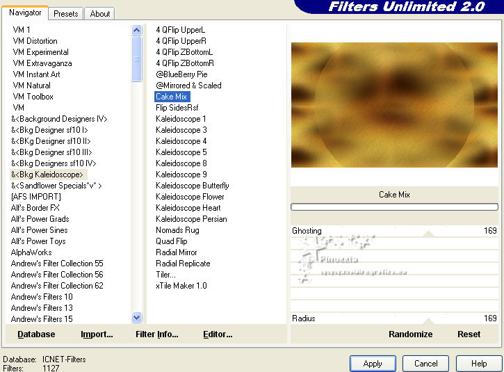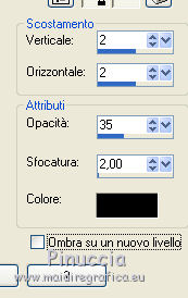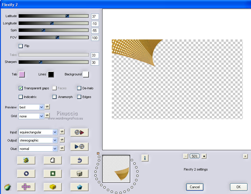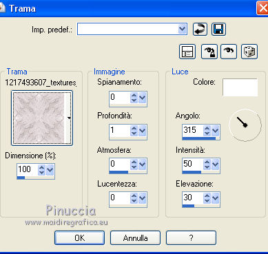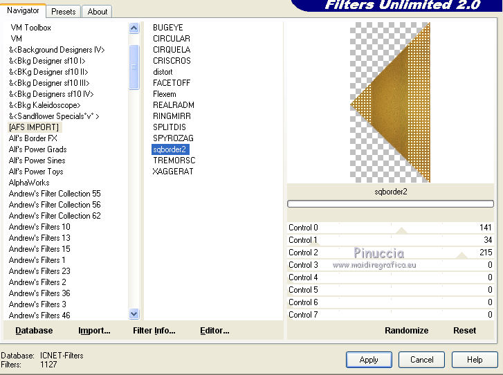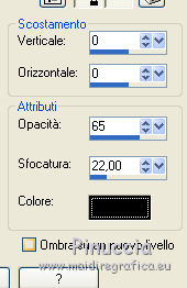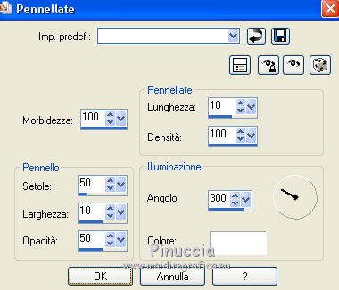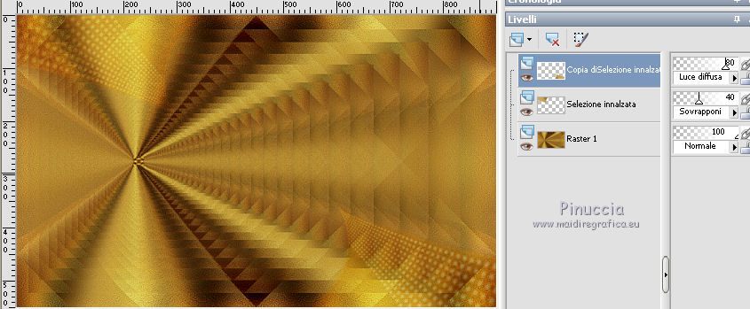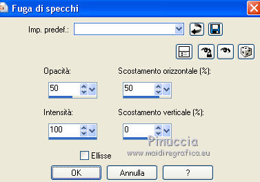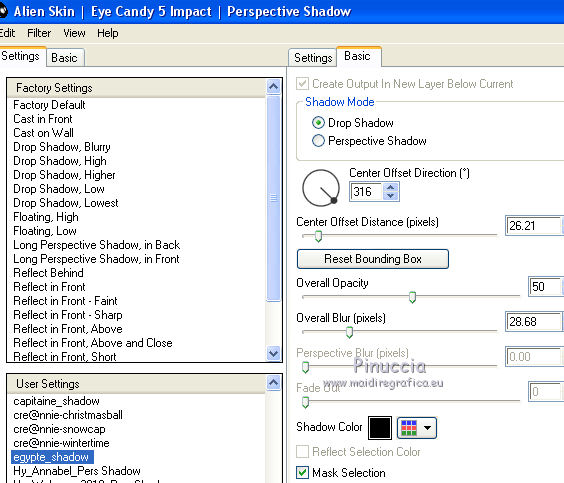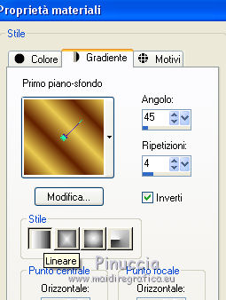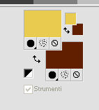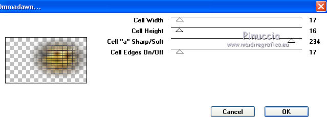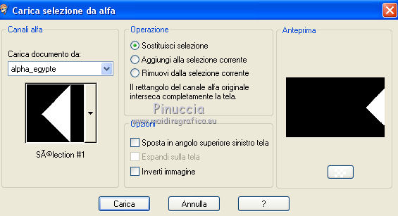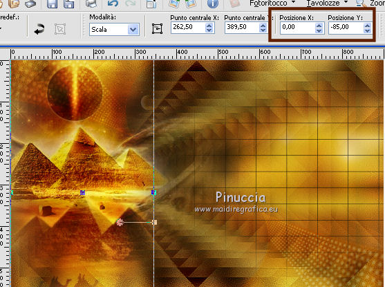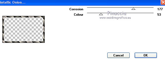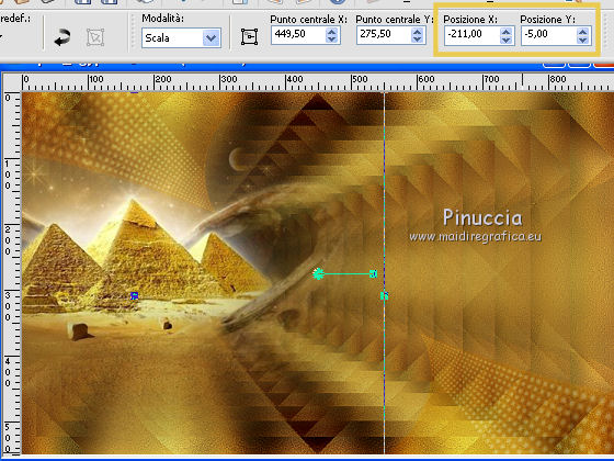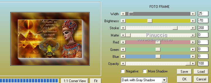 Occorrente: Materiale qui La trama è di Nikita. Il resto del materiale è di Saturnella. (in questa pagina trovi i links ai siti dei creatori di tubes) Filtri in caso di dubbi, ricorda di consultare la mia sezione filtri qui Filters Unlimited 2.0 qui &<Bkg Kaleidoscope - Cake Mix (da importare in Unlimited) qui Simple - Blintz, 4Way Average qui AFS IMPORT - sqborder2 qui Flaming Pear - Flexify 2 qui Toadies - Ommadawn, Metallic onions qui Alien Skin Eye Candy 5 Impact - Perspective Shadow qui AAA Frames - Foto Frame qui I filtri AFS IMPORT e Toadies si possono usare da soli o importati in Filters Unlimited (come fare vedi qui) Se un filtro fornito appare con questa icona ![]() non esitare a cambiare modalità di miscelatura e opacità secondo i colori utilizzati. Metti il preset Cliccando sul file una o due volte (a seconda delle tue impostazioni), automaticamente il preset si installerà nella cartella corretta. perchè uno o due clic vedi qui Se preferisci, puoi importare direttamente il preset nel corso del tutorial Come fare vedi la scheda del filtro Eye Candy qui Attenzione: non dimenticare di togliere la firma prima di copiare i tubes. 1. Imposta il colore di primo piano con il colore chiaro #e9cb50, e il colore di sfondo con il colore scuro #612000. ![]() Apri alpha_egypte. Finestra>Duplica, o sulla tastiera tasto della maiuscola+D per fare una copia. ![]() Chiudi l'originale. La copia, che sarà la base del tuo lavoro, non è vuota, ma contiene una selezione salvata sul canale alfa. Rinomina il livello "Raster 1". Riempi l'immagine trasparente con il colore chiaro di primo piano.2. Selezione>Seleziona tutto. Apri il tube sat_egy02 e vai a Modifica>Copia. Minimizza il tube, perchè ti servirà ancora. Torna al tuo lavoro e vai a Modifica>Incolla nella selezione. Selezione>Deseleziona. 3. Effetti>Effetti di immagine>Motivo unico, con i settaggi standard. ![]() 4. Regola>Sfocatura>Sfocatura gaussiana - raggio 30 ![]() 5. Effetti>Effetti di trama>Trama - seleziona la trama di Nikita ![]() 6. Effetti>Plugins>Filters Unlimited 2.0 - &<Bkg Kaleidoscope - Cake Mix, con i settaggi standard. ![]() 7. Effetti>Plugins>Simple - Blintz. Effetti>Plugins>Simple - 4Way Average ![]() 8. Effetti>Effetti di riflesso>Fuga di specchi. ![]() Regola>Messa a fuoco>Accentua messa a fuoco. 9. Immagine>Rifletti. 10. Selezione>Carica/Salva selezione>Carica selezione da canale alfa. La selezione sélection#1 è subito disponibile. Devi soltanto cliccare Carica. ![]() Selezione>Innalza selezione a livello. 11. Effetti>Plugins>Filters Unlimted 2.0 - AFS IMPORT - sqborder2, con i settaggi standard. ![]() Selezione>Deseleziona. 12. Effetti>Plugins>Flaming Pear - Flexify 2. ![]() Cambia la modalità di miscelatura di questo livello in Sovrapponi, e abbassa l'opacità al 40%. 13. Livelli>Duplica. Immagine>Rifletti. Immagine>Capovolgi. Cambia la modalità di miscelatura di questo livello in Luce diffusa, e abbassa l'opacità all'80%. ![]() 14. Attiva il livello di sfondo. Apri il tube sat_egy03 e vai a Modifica>Copia. Torna al tuo lavoro e vai a Modifica>Incolla come nuovo livello. Sulla tastiera premi il tasto K per attivare lo strumento Puntatore ![]() e imposta Posizione X: -211,00 e Posizione Y: -5,00. ![]() Tasto M per deselezionare lo strumento. Abbassa l'opacità di questo livello all'80% 15. Livelli>Duplica. Immagine>Rifletti. Cambia la modalità di miscelatura di questo livello in Luce netta. 16. Effetti>Plugins>Toadies - Ommadawn, con i settaggi standard. ![]() 17. Attiva nuovamente il tube sat_egy02 e vai a Modifica>Copia. Torna al tuo lavoro e vai a Modifica>Incolla come nuovo livello. Immagine>Ridimensiona, all'80%, tutti i livelli non selezionato. Tasto K per attivare lo strumento Puntatore ![]() e imposta Posizione X: 00,00 e Posizione Y: -85,00. ![]() Tasto M per deselezionare lo strumento. Cambia la modalità di miscelatura di questo livello in Sovrapponi. 18. Apri il tube sat_egy04 e vai a Modifica>Copia. Torna al tuo lavoro e vai a Modifica>Incolla come nuovo livello. Spostalo contro il bordo superiore.Cambia la modalità di miscelatura di questo livello in Sovrapponi, e abbassa l'opacità al 30%. 19. Apri il tube texte e vai a Modifica>Copia. Torna al tuo lavoro e vai a Modifica>Incolla come nuovo livello. Tasto K per attivare lo strumento Puntatore ![]() e imposta Posizione X: 333,00 e Posizione Y: 0,00. ![]() Cambia la modalità di miscelatura di questeo livello in Luminanza (esistente) e abbassa l'opacità all'85%. 20. Effetti>Effetti 3D>Sfalsa ombra. ![]() 21. Apri il tube deco01 e vai a Modifica>Copia. Torna al tuo lavoro e vai a Modifica>Incolla come nuovo livello. Immagine>Ridimensiona, al 60%, tutti i livelli non selezionato. Regola>Messa a fuoco>Metti a fuoco. Sposta il tube sotto il testo.22. Effetti>Effetti 3D>Sfalsa ombra. ![]() 23. Apri il tube del personaggio e vai a Modifica>Copia. Torna al tuo lavoro e vai a Modifica>Incolla come nuovo livello. Immagine>Ridimensiona, al 70%, tutti i livelli non selezionato. Sposta il tube a destra.24. Livelli>Duplica. Attiva il livello sottostante dell'originale. Regola>Sfocatura>Sfocatura gaussiana - raggio 30 ![]() Cambia la modalità di miscelatura di questo livello in Moltiplica. 25. Attiva il livello superiore. Effetti>Plugins>Alien Skin Eye Candy 5 Impact - Perspective Shadow. Seleziona il preset egypte_shadow e ok Questi i settaggi, in caso di problemi con il preset ![]() 26. Attiva il livello di sfondo. Modifica>Copia. 27. Passa il colore di primo piano a Gradiente di primo piano/sfondo, stile Lineare. ![]() Immagine>Aggiungi bordatura, 1 pixel, simmetriche, colore di sfondo. Immagine>Aggiungi bordatura, 3 pixels, simmetriche, colore di primo piano. Immagine>Aggiungi bordatura, 1 pixel, simmetriche, colore di sfondo. 28. Selezione>Seleziona tutto. Immagine>Aggiungi bordatura, 30 pixels, simmetriche, colore bianco. Selezione>Inverti. Riempi la selezione con il gradiente.29. Selezione>Innalza selezione a livello. Effetti>Plugins>Toadies - M