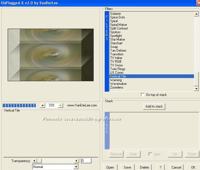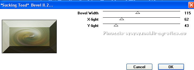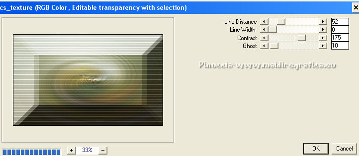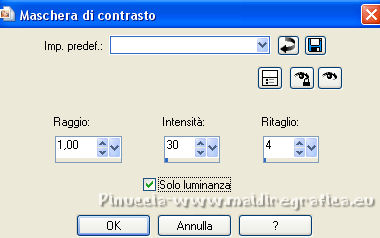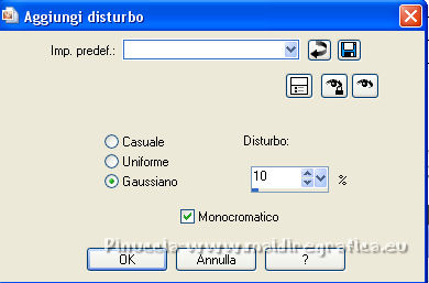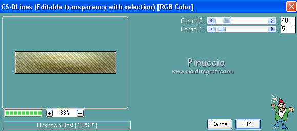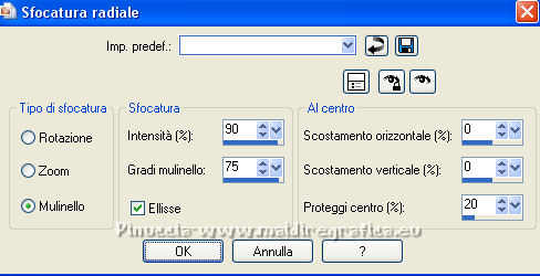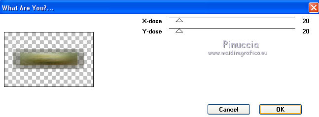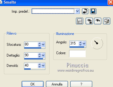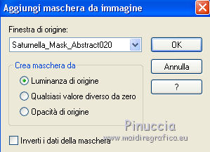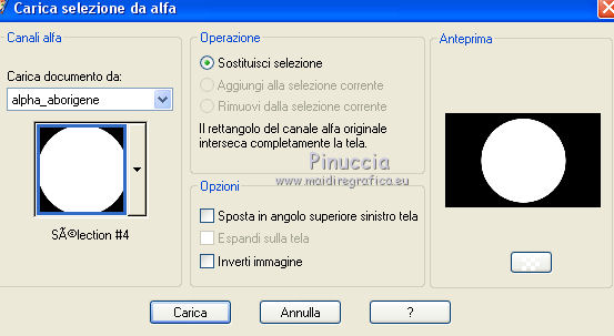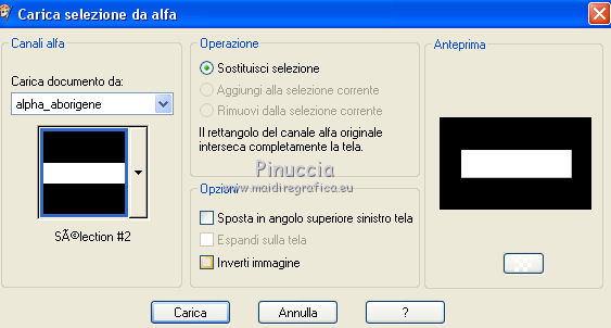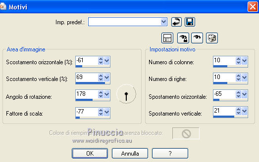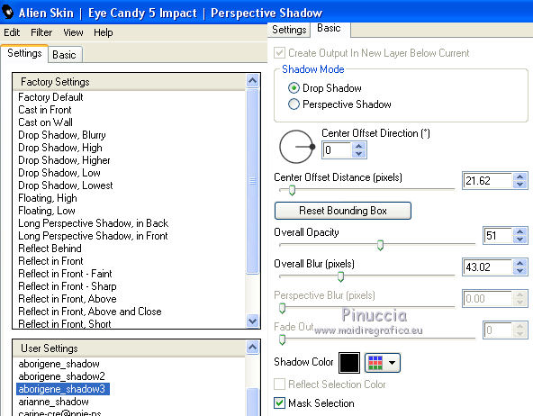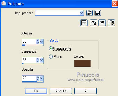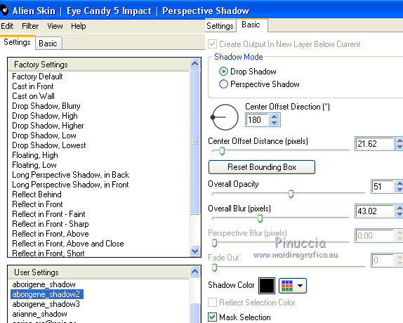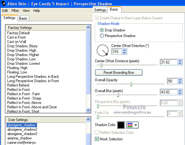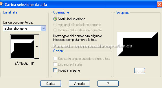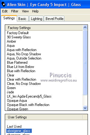 Occorrente: Materiale qui Per i tubes grazie Joanie e Thafs. Il resto del materiale è di Saturnella. (in questa pagina trovi i links ai siti dei creatori di tubes) Filtri in caso di dubbi, ricorda di consultare la mia sezione filtri qui Filters Unlimited 2.0 qui Carolaine and Sensibility - CS-DLines, CS-Texture qui Graphics Plus - Vertical Mirror qui Toadies - What are you, Sucking Toad Bevel II.2 qui VanDerLee - Unplugged-X qui Alien Skin Eye Candy 5 Impact - Perspective Shadow, Glass qui Simple - Left Right Wrap (bonus) qui I filtri Toadies si possono usare da soli o importati in Filters Unlimited (come fare vedi qui) Se un filtro fornito appare con questa icona ![]() non esitare a cambiare modalità di miscelatura e opacità secondo i colori utilizzati. Nelle ultime versioni di PSP non c'è il gradiente di primo piano/sfondo (Corel_06_029) Puoi usare i gradienti delle versioni precedenti. Trovi qui i gradienti Corel X. Metti i preset Cliccando sul file una o due volte (a seconda delle tue impostazioni), automaticamente il preset si installerà nella cartella corretta. perchè uno o due clic vedi qui Apri la maschera in PSP e minimizzala con il resto del materiale Imposta il colore di primo piano con #dbdb5f, e il colore di sfondo con il colore #593621. ![]() 1. Apri alpha_aborigene. Finestra>Duplica, o sulla tastiera tasto della maiuscola+D per fare una copia. ![]() Chiudi l'originale. La copia, che sarà la base del tuo lavoro, non è vuota, ma contiene le selezioni salvate sul canale alfa. Rinomina il livello Raster 1. Selezione>Seleziona tutto. Apri l'immagine image_aborigene e vai a Modifica>Copia. Torna al tuo lavoro e vai a Modifica>Incolla come nuovo livello. Selezione>Deseleziona. 2. Regola>Sfocatura>Sfocatura radiale. ![]() Effetti>Effetti di bordo>Aumenta di più. 3. Regola>Aggiungi/Rimuovi disturbo>Aggiungi disturbo. ![]() 4. Effetti>Plugins>Toadies - Sucking Toad Bevel II.2, con i settaggi standard. ![]() 5. Selezione>Carica/Salva selezione>Carica selezione da canale alfa La selezione sélection 1 è subito disponibile. Devi soltanto cliccare Carica. ![]() Effetti>Plugins>Carolaine and Sensibility - CS-Texture, con i settaggi standard. ![]() Selezione>Deseleziona. 6. Effetti>Plugins>VanDerLee Unplugged-X - Vertical Tile. ![]() 7. Effetti>Effetti di riflesso>Specchio rotante, con i settaggi standard. ![]() 8. Livelli>Nuovo livello raster. Riempi con il colore di primo piano.Livelli>Nuovo livello maschera>Da immagine. Apri il menu sotto la finestra di origine e vedrai la lista dei files aperti. Seleziona la maschera Saturnella_Mask_Abstract020 ![]() Effetti>Effetti di bordo>Aumenta. Livelli>Unisci>Unisci gruppo. 9. Effetti>Effetti 3D>Sfalsa ombra. ![]() Livelli>Unisci>Unisci giù. 10. Selezione>Carica/Salva selezione>Carica selezione da canale alfa Apri il menu delle selezioni e carica la selezione #2. ![]() Livelli>Nuovo livello raster. Modifica>Incolla nella selezione (l'immagine image_aborigene è sempre in memoria). 11. Regola>Sfocatura>Sfocatura radiale, con i settaggi precedenti. ![]() Livelli>Nuovo livello raster. Apri il tube foret9 e vai a Modifica>Copia. Torna al tuo lavoro e vai a Modifica>Incolla nella selezione. Cambia la modalità di miscelatura di questo livello in Luce diffusa. ![]() Selezione>Deseleziona. Livelli>Unisci>Unisci giù. 12. Prima di applicare il prossimo filtro, imposta il colore di sfondo con il colore chiaro con PSPX non c'è differenza, ma con alcune versioni di PSP il risultato potrebbe essere diverso Effetti>Plugins>Toadies - What are you, con i settaggi standard. ![]() 13. Selezione>Carica/Salva selezione>Carica selezione da canale alfa Apri il menu delle selezioni e carica la selezione #3. ![]() Selezione>Modifica>Seleziona bordature selezione. ![]() 14. Effetti>Plugins>Carolaine and Sensibility - CS-DLines, con i settaggi standard. ![]() 15. Effetti>Effetti 3D>Sfalsa ombra. ![]() Selezione>Deseleziona. 16. Effetti>Plugins>Alien Skin Eye Candy 5 Impact - Perspective Shadow. Seleziona il preset aborigene_shadow e ok. ![]() 17. Attiva il livello di sfondo. Selezione>Carica/Salva selezione>Carica selezione da canale alfa Apri il menu delle selezioni e carica la selezione #4. ![]() Selezione>Innalza selezione a livello. 18. Effetti>Effetti artistici>Smalto. ![]() 19. Selezione>Modifica>Seleziona bordature selezione. ![]() Riempi con il colore chiaro.20. Effetti>Effetti 3D>Smusso a incasso. ![]() Selezione>Deseleziona. 21. Selezione>Carica/Salva selezione>Carica selezione da canale alfa Apri il menu delle selezioni e carica nuovamente la selezione #4. ![]() Livelli>Nuovo livello raster. Apri il tube foret10 e vai a Modifica>Copia. Torna al tuo lavoro e vai a Modifica>Incolla nella selezione. Cambia la modalità di miscelatura di questo livello in Luce netta. Mantieni selezionato. Effetti>Plugins>Alien Skin Eye Candy 5 Impact - Glass. Seleziona il preset aborigene_glass e ok. ![]() Questi i settaggi, in caso di problemi con il preset. ![]() Selezione>Deseleziona. 22. Effetti>Plugins>Alien skin Eye Candy 5 Impact - Perspective Shadow. Seleziona il preset aborigene_shadow2 e ok. ![]() Di nuovo Effetti>Plugins>Alien skin Eye Candy 5 Impact - Perspective Shadow. Seleziona il preset aborigene_shadow3 e ok. ![]() 23. Attiva il livello di sfondo. Apri il tube texte e vai a Modifica>Copia. Torna al tuo lavoro e vai a Modifica>Incolla come nuovo livello. Effetti>Effetti 3D>Sfalsa ombra. ![]() Cambia la modalità di miscelatura di questo livello in Indebolisci, e abbassa l'opacità al 60%. Spostalo a destra![]() 24. Attiva il livello superiore. Apri il tube kangourou e vai a Modifica>Copia. Torna al tuo lavoro e vai a Modifica>Incolla come nuovo livello. Immagine>Ridimensiona, al 50%, tutti i livelli non selezionato. Regola>Messa a fuoco>Metti a fuoco. Sposta il tube in basso a destra.25. Effetti>Plugins>Alien Skin Eye Candy 5 Impact - Perspective Shadow. Seleziona il preset Drop Shadow Blurry e ok. ![]() 26. Apri il tube della donna di Joanie e vai a M