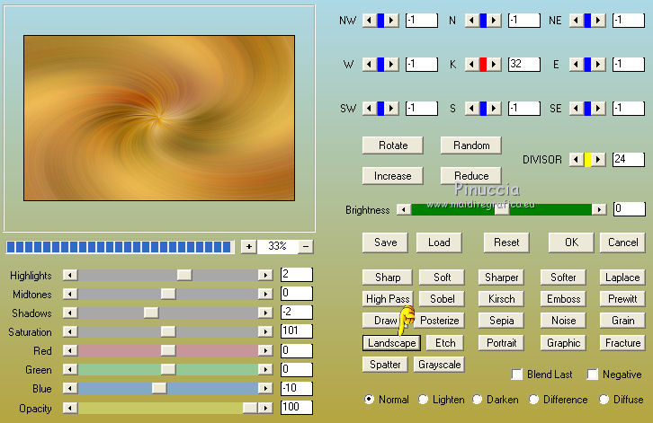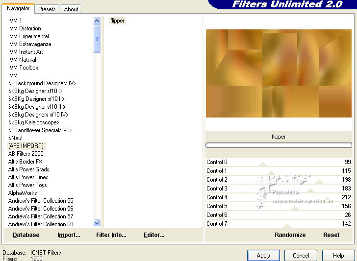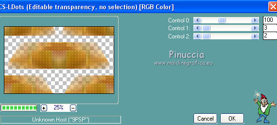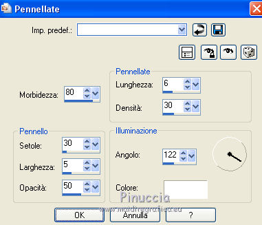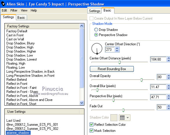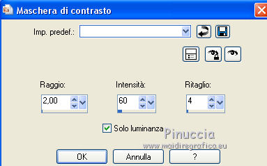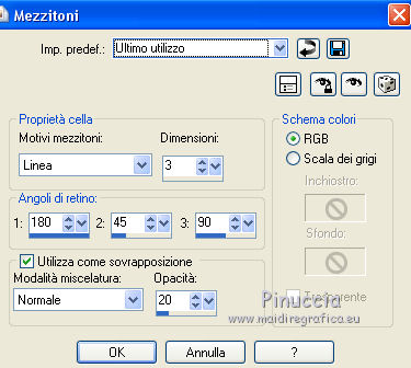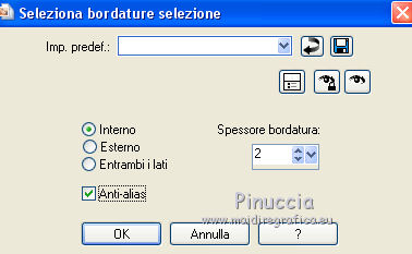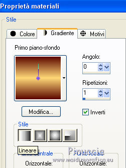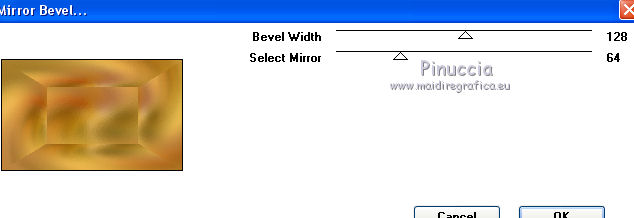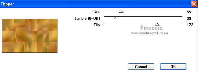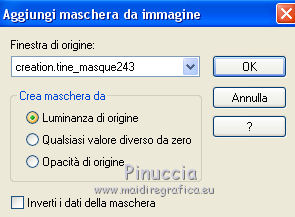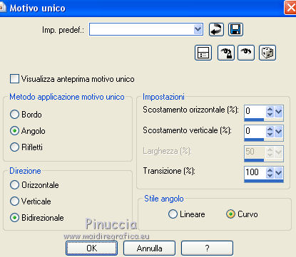 Occorrente: Materiale qui Grazie Tine per la maschera. Il resto del materiale è di Saturnella. (in questa pagina trovi i links ai siti dei creatori di tubes) Filtri in caso di dubbi, ricorda di consultare la mia sezione filtri qui Filters Unlimited 2.0 qui Alf's Border FX - Mirror Bevel qui AFS IMPORT - Flipper qui i Filtri AFS IMPORT sono una serie di effetti raccolti e diffusi in rete sotto questa denominazione. In tutta la rete non ho avuto la fortuna di trovare questo effetto. Un effetto con lo stesso nome si trova nel filtro VM Distortion e nelle Factory Gallery N. Per la mia traduzione ho usato il filtro contenuto in VM Distortion aggiornamento: un'amica nei gruppi ha trovato l'effetto, l'ho aggiunto al materiale Filter Factory Gallery N qui VM Distortion qui AP 01 Innovations - Lines SilverLining qui Carolaine and Sensibility - CS-LDots qui Alien Skin Eye Candy 5 Impact - Perspective Shadow qui AAA Filters - Custom qui I filtri Alf's Border FX e AFS IMPORT si possono usare da soli o importati in Filters Unlimited (come fare vedi qui) Se un filtro fornito appare con questa icona ![]() non esitare a cambiare modalità di miscelatura e opacità secondo i colori utilizzati. Nelle ultime versioni di PSP non c'è il gradiente di primo piano/sfondo (Corel_06_029) Puoi usare i gradienti delle versioni precedenti. Trovi qui i gradienti Corel X. Apri la maschera in PSP e minimizzala con il resto del materiale Imposta il colore di primo piano con il colore chiaro #ffd877, e il colore di sfondo con il colore scuro #5c0700. ![]() 1. Apri alpha_arianne. Finestra>Duplica, o sulla tastiera tasto della maiuscola+D per fare una copia. ![]() Chiudi l'originale. La copia, che sarà la base del tuo lavoro, non è vuota, ma contiene una selezione salvata sul canale alfa. Rinomina il livello Raster 1. Riempi l'immagine trasparente con il colore chiaro di primo piano.2. Selezione>Seleziona tutto. Apri il tube del paesaggio e vai a Modifica>Copia. Torn aal tuo lavoro e vai a Modifica>Incolla nella selezione. Selezione>Deseleziona. 3. Effetti>Effetti di immagine>Motivo unico, con i settaggi standard. ![]() 4. Regola>Sfocatura>Sfocatura radiale. ![]() Effetti>Effetti di bordo>Aumenta di più. 5. Effetti>Plugins>AAA Filters - Custom - clicca su Landscape e ok. ![]() 6. Effetti>Effetti tecniche di disegno>Pennellate. ![]() 7. Effetti>Plugins>Alf's Border FX - Mirror Bevel, con i settaggi standard. ![]() 8. Effetti>Plugins>AFS IMPORT - Flipper. come ho scritto nella presentazione del tutorial, ho usato l'Effetto Flipper contenuto nel filtro VM Distortion. ![]() aggiornamento successivo alla messa in linea della traduzione: un'amica nei gruppi ha trovato l'effetto: l'ho aggiunto al materiale (è un file in formato ffx, pertanto va importato in Unlimited) ![]() Vedi la tag finale in fondo al tutorial Effetti>Effetti di riflesso>Specchio rotante ![]() 9. Selezione>Carica/Salva selezione>Carica selezione da canale alfa. La selezione sélection#1 è subito disponibile. Devi soltanto cliccare Carica. ![]() Selezione>Innalza selezione a livello. Selezione>Modifica>Seleziona bordature selezione. ![]() Imposta il colore di primo piano con il colore bianco #ffffff. Riempi la selezione con il colore bianco.Selezione>Deseleziona. 10. Livelli>Duplica. Effetti>Effetti di immagine>Motivo unico ![]() Livelli>Disponi>Sposta giù. 11. Effetti>Plugins>Carolaine and Sensibility - CS-LDots ![]() Regola>Messa a fuoco>Metti a fuoco. 12. Effetti>Effetti 3D>Sfalsa ombra ![]() 13. Attiva il livello superiore. Selezione>Carica/Salva selezione>Carica selezione da canale alfa. Apri il menu delle selezioni e carica sélection#2 . ![]() Livelli>Nuovo livello raster. Modifica>Incolla nella selezione (il tube del paesaggio è sempre in memoria) Selezione>Deseleziona. Livelli>Duplica. Livelli>Unisci>Unisci giù - 2 volte. 14. Effetti>Plugins>Alien Skin Eye Candy 5 Impact - Perspective Shadow. Seleziona il preset arianne_shadow e ok. Questi i settaggi, in caso di problemi con il preset. ![]() 15. Effetti>Effetti 3D>Sfalsa ombra. ![]() 16. Livelli>Nuovo livello raster. Riempi con il colore bianco.Livelli>Nuovo livello maschera>Da immagine. Apri il menu sotto la finestra di origine e vedrai la lista dei files aperti. Seleziona la maschera creation.tine_masque243. ![]() Livelli>Duplica. Livelli>Unisci>Unisci gruppo. Cambia la modalità di miscelatura di questo livello in Sovrapponi o altro. 17. Effetti>Plugins>AP 01 Innovations - Lines SilverLining. ![]() Livelli>Disponi>Sposta giù. 18. Effetti>Effetti 3D>Sfalsa ombra. ![]() 19. Attiva il livello di sfondo. Selezione>Carica/Salva selezione>Carica selezione da canale alfa. Apri il menu delle selezioni e carica sélection#3. ![]() Effetti>Effetti di trama>Nappa. ![]() Selezione>Deseleziona. 20. Imposta il colore di primo piano con il colore chiaro iniziale #ffd877, e passa il colore di primo piano a Gradiente di primo piano/sfondo, stile Lineare. ![]() Immagine>Aggiungi bordatura, 1 pixel, simmetriche, colore di sfondo. Immagine>Aggiungi bordatura, 3 pixels, simmetriche, colore di primo piano. Immagine>Aggiungi bordatura, 1 pixel, simmetriche, colore bianco. 21. Immagine>Aggiungi bordatura, simmetriche non selezionato, colore di primo piano ![]() Attiva lo strumento Bacchetta magica ![]() e clicca nel bordo per selezionarlo. Riempi la selezione con il gradiente.22. Effetti>Effetti artistici>Mezzitoni. ![]() 23. Selezione>Inverti. Effetti>Effetti 3D>Sfalsa ombra. ![]() Selezione>Deseleziona. 24. Apri il tube deco e vai a Modifica>Copia. Torna al tuo lavoro e vai a Modifica>Incolla come nuovo livello. Tasto K per attivare lo strumento Puntatore ![]() e imposta Posizione X: 78,00 e Posizione Y: 12,00 ![]() Effetti>Effetti 3D>Sfalsa ombra, con i settaggi precedenti. 25. Apri il tube della donna sat_femme03 e vai a Modifica>Copia. Torna al tuo lavoro e vai a Modifica>Incolla come nuovo livello. Immagine>Rifletti. Immagine>Ridimensiona, all'80%, tutti i livelli non selezionato. Posiziona correttamente i