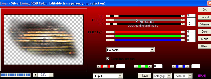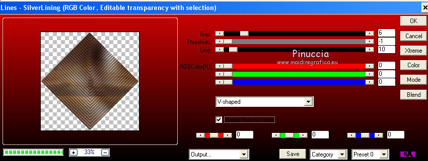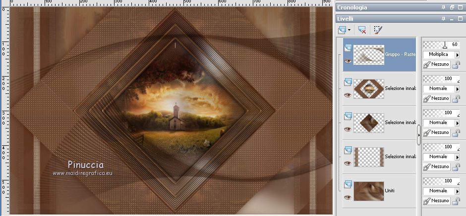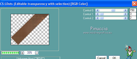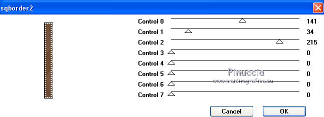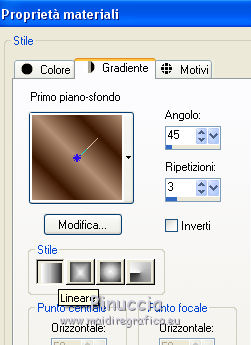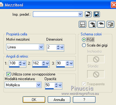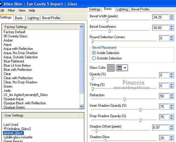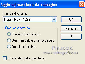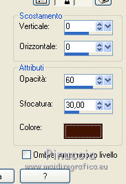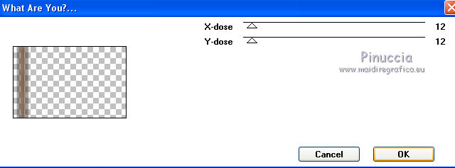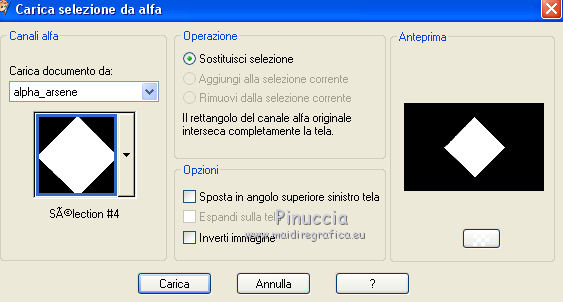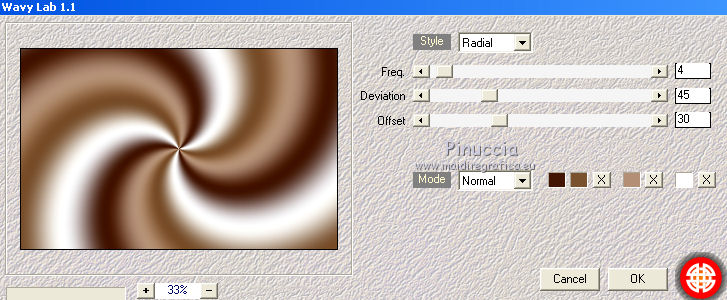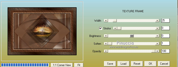 Le vostre versioniOccorrente: Materiale qui Il materiale è di Saturnella. (in questa pagina trovi i links ai siti dei creatori di tubes) Filtri in caso di dubbi, ricorda di consultare la mia sezione filtri qui Filters Unlimited 2.0 qui Adjust - Variations qui Mehdi - Wavy Lab 1.1. qui AP 01 [Innovations] - Lines SilverLining qui Simple - Blintz qui Toadies - What are you qui Carolaine and Sensibility - CS-LDots qui Alien Skin Eye Candy 5 Impact - Glass, Perspective Shadow qui AFS IMPORT - sqborder 2 qui AAA Frames - Texture Frame qui I filtri AFS IMPORT, Toadies e Simple si possono usare da soli o importati in Filters Unlimited (come fare vedi qui) Se un filtro fornito appare con questa icona ![]() non esitare a cambiare modalità di miscelatura e opacità secondo i colori utilizzati. Nelle ultime versioni di PSP non c'è il gradiente di primo piano/sfondo (Corel_06_029) Puoi usare i gradienti delle versioni precedenti. Trovi qui i gradienti Corel X. Metti i preset Cliccando sul file una o due volte (a seconda delle tue impostazioni), automaticamente il preset si installerà nella cartella corretta. perchè uno o due clic vedi qui colori utilizzati ![]() Imposta il colore di primo piano con il colore 2 #7a512a, e il colore di sfondo con il colore 1 #421502. ![]() 1. Apri alpha_arsene. Finestra>Duplica o sulla tastiera maiuscola+D per fare una copia. ![]() Chiudi l'originale. La copia, che sarà la base del tuo lavoro, non è vuota, ma contiene le selezioni salvate sul canale alfa. 2. Effetti>Plugins>Mehdi - Wavy Lab 1.1. Questo filtro crea gradienti con i colori della paletta: il primo è il colore di sfondo, il secondo quello di primo piano. Cambia gli ultimi due colori creati dal filtro: il terzo con il colore 3 #b38f75 e il quarto con il colore 4 #ffffff. ![]() 3. Regola>Sfocatura>Sfocatura radiale. ![]() 4. Effetti>Plugins>Adjust - Variations un clic su Original per annullare eventuali precedenti settaggi memorizzati dal filtro, due clic su Darker e ok. 5. Livelli>Nuovo livello raster. Selezione>Seleziona tutto. Apri il tube camp_24 e vai a Modifica>Copia. Torna al tuo lavoro e vai a Modifica>Incolla nella selezione. Selezione>Deseleziona. Abbassa l'opacità di questo livello al 30%, o secondo il tuo tube. 6. Effetti>Plugins>AP 01 [Innovations] - Lines SilverLining. ![]() Livelli>Unisci>Unisci visibile. 7. Effetti>Plugins>Simple - Blintz Modifica>Ripeti Blintz. L'effetto lavora senza finestra; risultato ![]() 8. Selezione>Carica/Salva selezione>Carica selezione da canale alfa. La selezione #1 è subito disponibile. Devi soltanto cliccare Carica. ![]() Selezione>Innalza selezione a livello. Effetti>Plugins>Carolaine and Sensibility - CS-LDots ![]() Selezione>Deseleziona. 9. Livelli>Duplica. Immagine>Rifletti. Livelli>Unisci>Unisci giù. 10. Livelli>Duplica. Immagine>Capovolgi. Livelli>Unisci>Unisci giù. 11. Attiva il livello di sfondo. Selezione>Carica/Salva selezione>Carica selezione da canale alfa. Apri il menu delle selezioni e carica la selezione #2. ![]() Selezione>Innalza selezione a livello. Effetti>Plugins>AP 01 [Innovations] - Lines SilverLining. ![]() Mantieni selezionato. 12. Selezione>Modifica>Seleziona bordature selezione. ![]() Riempi la selezione con il colore 2 #7a512e (colore di primo piano).13. Effetti>Effetti 3D>Smusso a incasso. ![]() Selezione>Deseleziona. 14. Effetti>Effetti 3D>Sfalsa ombra, colore nero. ![]() 15. Livelli>Duplica. Immagine>Ridimensiona, all'85%, tutti i livelli non selezionato. Di nuovo Livelli>Duplica. Immagine>Ridimensiona, all'85%, tutti i livelli non selezionato. Livelli>Unisci>Unisci giù - 2 volte. 16. Attiva il livello inferiore. Selezione>Carica/Salva selezione>Carica selezione da canale alfa. Apri il menu delle selezioni e carica la selezione #3. ![]() Selezione>Innalza selezione a livello. Effetti>Plugins>AFS IMPORT - sqborder2. ![]() Selezione>Deseleziona. 17. Effetti>Plugins>Toadies - What are you. ![]() 18. Effetti>Effetti 3D>Sfalsa ombra, con i settaggi precedenti ma colore 1 #421502 (colore di sfondo). ![]() 19. Livelli>Duplica. Immagine>Rifletti. Livelli>Unisci>Unisci giù. 19. Attiva il livello superiore. Livelli>Nuovo livello raster. Selezione>Carica/Salva selezione>Carica selezione da canale alfa. Apri il menu delle selezioni e carica la selezione #4. ![]() Livelli>Nuovo livello raster. Modifica>Incolla nella selezione (il tube camp_24 dovrebbe essere ancora in memoria). Livelli>Unisci>Unisci giù. 20. Effetti>Plugins>Alien Skin Eye Candy 5 Impact - Glass. Seleziona il preset arsene_glass e ok. ![]() Selezione>Deseleziona. 21. Attiva il livello superiore. Effetti>Effetti 3D>Sfalsa ombra, con i settaggi precedenti. 22. Livelli>Nuovo livello raster. Riempi con il colore 2 #7a512e (colore di primo piano).Livelli>Nuovo livello maschera>Da immagine. Apri il menu sotto la finestra di origine e vedrai la lista dei files aperti. Seleziona la maschera Narah_Mask_1288 ![]() Effetti>Effetti di bordo>Aumenta. Livelli>Unisci>Unisci gruppo. 23. Effetti>Effetti 3D>Sfalsa ombra, colore nero. ![]() Cambia la modalità di miscelatura di questo livello in Moltiplica, e abbassa l'opacità al 60%. ![]() 24. Immagine>Aggiungi bordatura, 1 pixel, simmetriche, colore 1 #421502 (colore di sfondo). Immagine>Aggiungi bordatura, 3 pixels, simmetriche, colore 2 #7a512e (colore di primo piano). Immagine>Aggiungi bordatura, 1 pixel, simmetriche, colore 1 #421502 (colore di sfondo). 25. Selezione>Seleziona tutto. Immagine>Aggiungi bordatura, 15 pixels, simmetriche, colore 3 #b38f75. Selezione>Inverti. Effetti>Effetti di trama>Intessitura colore intessitura: colore 1 #421502 colore spazio: colore 3 #b38f75 ![]() Regola>Messa a fuoco>Accentua messa a fuoco. Effetti>Effetti 3D>Sfalsa ombra, colore nero. ![]() Selezione>Deseleziona. 26. Immagine>Aggiungi bordatura, 1 pixel, simmetriche, colore 1 #421502 (colore di sfondo). Immagine>Aggiungi bordatura, 3 pixels, simmetriche, colore 2 #7a512e (colore di primo piano). Immagine>Aggiungi bordatura, 1 pixel, simmetri